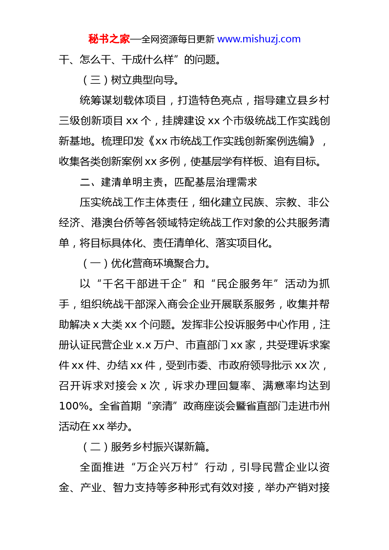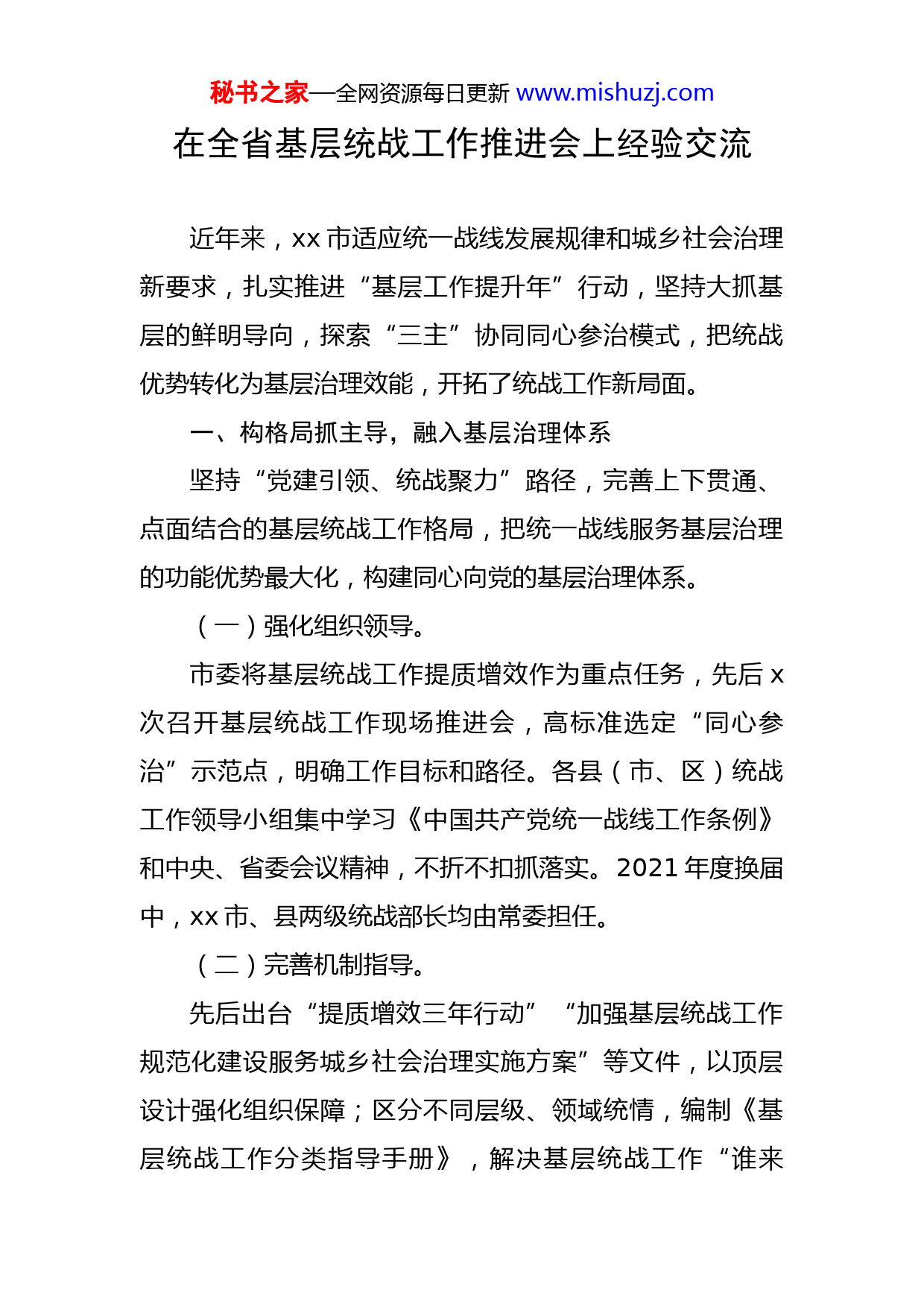 秘书之家—全网资源每日更新www.mishuzj.com在全省基层统战工作推进会上经验交流近年来,xx市适应统一战线发展规律和城乡社会治理新要求,扎实推进“基层工作提升年”行动,坚持大抓基层的鲜明导向,探索“三主”协同同心参治模式,把统战优势转化为基层治理效能,开拓了统战工作新局面。一、构格局抓主导,融入基层治理体系坚持“党建引领、统战聚力”路径,完善上下贯通、点面结合的基层统战工作格局,把统一战线服务基层治理的功能优势最大化,构建同心向党的基层治理体系。(一)强化组织领导。市委将基层统战工作提质增效作为重点任务,先后x次召开基层统战工作现场推进会,高标准选定“同心参治”示范点,明确工作目标和路径。各县(市、区)统战工作领导小组集中学习《中国共产党统一战线工作条例》和中央、省委会议精神,不折不扣抓落实。2021年度换届中,xx市、县两级统战部长均由常委担任。(二)完善机制指导。先后出台“提质增效三年行动”“加强基层统战工作规范化建设服务城乡社会治理实施方案”等文件,以顶层设计强化组织保障;区分不同层级、领域统情,编制《基层统战工作分类指导手册》,解决基层统战工作“谁来秘书之家—全网资源每日更新www.mishuzj.com干、怎么干、干成什么样”的问题。(三)树立典型向导。统筹谋划载体项目,打造特色亮点,指导建立县乡村三级创新项目xx个,挂牌建设xx个市级统战工作实践创新基地。梳理印发《xx市统战工作实践创新案例选编》,收集各类创新案例xx多例,使基层学有样板、追有目标。二、建清单明主责,匹配基层治理需求压实统战工作主体责任,细化建立民族、宗教、非公经济、港澳台侨等各领域特定统战工作对象的公共服务清单,将目标具体化、责任清单化、落实项目化。(一)优化营商环境聚合力。以“千名干部进千企”和“民企服务年”活动为抓手,组织统战干部深入商会企业开展联系服务,收集并帮助解决x大类xx个问题。发挥非公投诉服务中心作用,注册认证民营企业x.x万户、市直部门xx家,共受理诉求案件xx件、办结xx件,受到市委、市政府领导批示xx次,召开诉求对接会x次,诉求办理回复率、满意率均达到100%。全省首期“亲清”政商座谈会暨省直部门走进市州活动在xx举办。(二)服务乡村振兴谋新篇。全面推进“万企兴万村”行动,引导民营企业以资金、产业、智力支持等多种形式有效对接,举办产销对接秘书之家—全网资源每日更新www.mishuzj.com会,特色农产品电商带货上百场。x家民营企业荣获全省民营企业和商会助力乡村振兴“万企兴万村”行动标兵,x位民营企业家荣获全省“光彩之星”。组织各领域党外专家到乡村、企业进行技术指导和志愿服务,并建立了长期对接帮扶机制。(三)维护和谐稳定出实招。贯彻落实中央和省委民族工作会议精神,深入开展民族团结进步宣传教育活动,全力推进援x援x援x工作,xx个单位(项目)获得省级以上表彰。依法管理宗教事务,将宗教事务管理与疫情防控排查、乡村振兴入户、社区“双报到”工作相结合,实现群防群控、联防联控。三、创示范当主角,提升基层治理能力建立特色“团组”将党外人士组织起来,激发多元主体参与基层治理的积极性,为基层治理添动力。(一)参与议事共商。探索建立协商议事“智囊团”,吸纳党外人士为村(居)民代表或聘请为顾问,发挥咨政建言作用,参与基层公共事务和公益事业议题协商。xx县xx村创建以乡贤为主体的“群乡荟”,坚持每月召开一次全体会员大会,共商共谋村务治理发展良策,成为全国有名的美丽乡村。xx区“五乡工程”、xx县xx社区“四聚四创”等做法入选全省实践创新案例。秘书之家—全网资源每日更新www.mishuzj.com(二)参与服务共建。基层党组织与民主党派、统战社团联建社会服务“志愿团”,发挥党外人士专业特长优势,共建美好家园。xx区xx社区立足统战资源分别设立“法律服务站”“创业服务室”“侨之家书香室”;xx区红光社区在党员服务中心设立党外知识分子“名家服务工作站”。据不完全统计,全市基层党组织已建立统战工作阵地xx余个。(三)参与监管共治。组建民主监督“攻坚团”,引导参与基层公共事务和文明建设监管,打通治理“三难”堵点。规范村(居)民代表会议、村(居)务监督委员会运行机制,支持乡贤等各方面代表人士有序参与。村(社区)两委换届中,已有xx名党外人士进入村(居)委会班子。