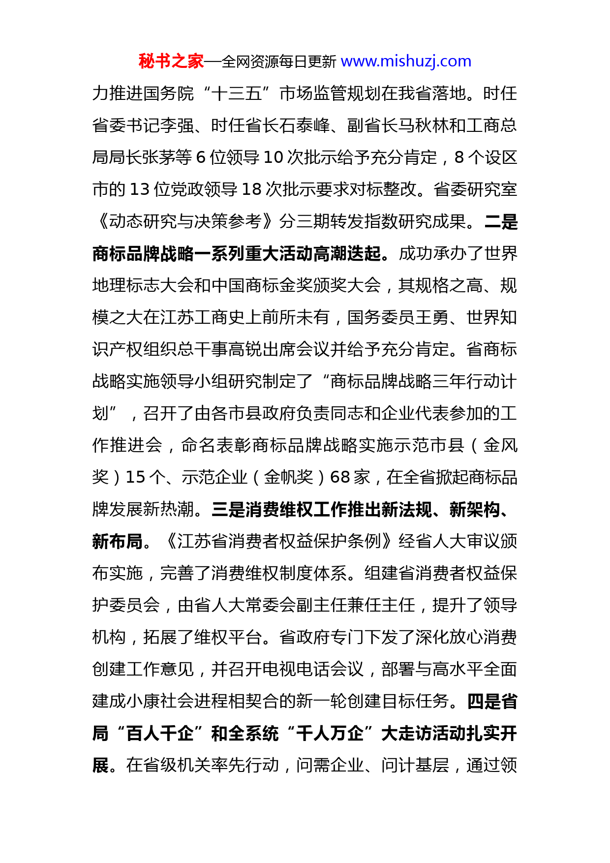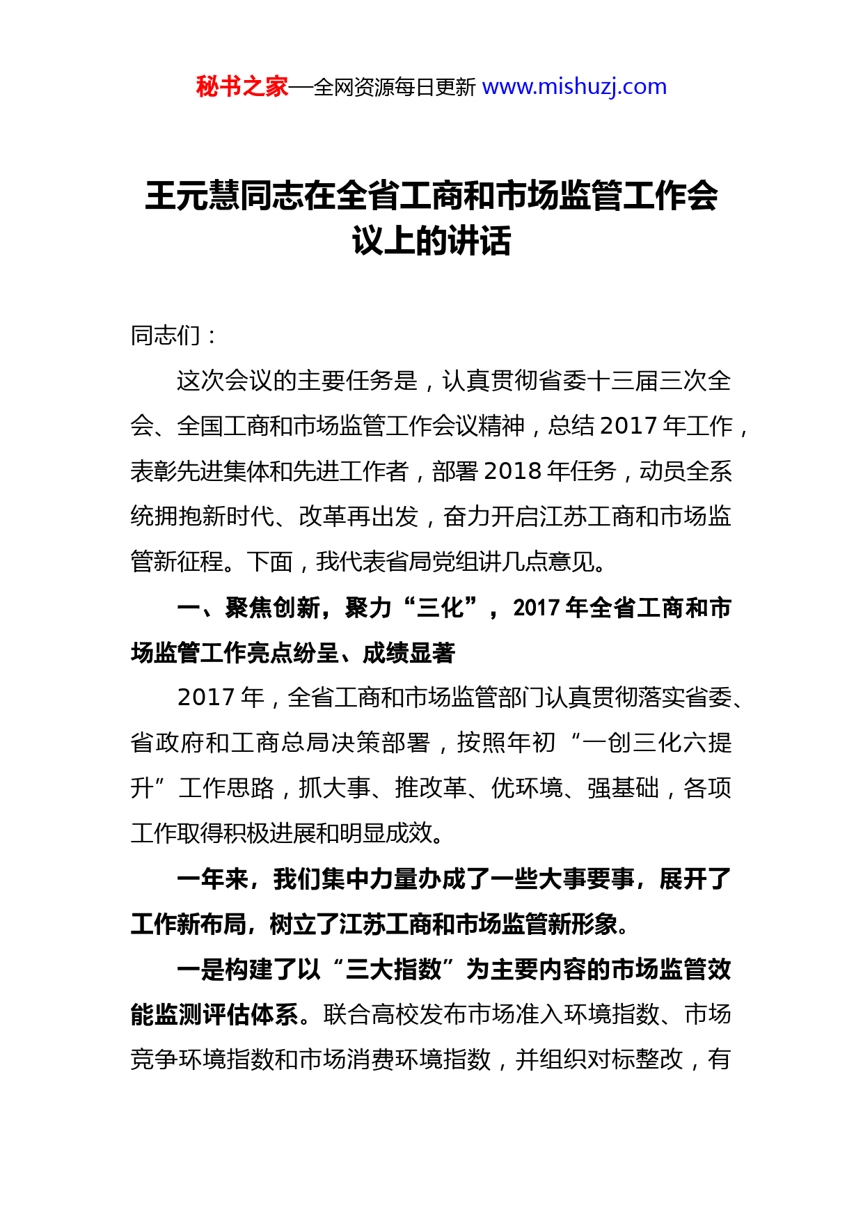 秘书之家—全网资源每日更新www.mishuzj.com王元慧同志在全省工商和市场监管工作会议上的讲话同志们:这次会议的主要任务是,认真贯彻省委十三届三次全会、全国工商和市场监管工作会议精神,总结2017年工作,表彰先进集体和先进工作者,部署2018年任务,动员全系统拥抱新时代、改革再出发,奋力开启江苏工商和市场监管新征程。下面,我代表省局党组讲几点意见。一、聚焦创新,聚力“三化”,2017年全省工商和市场监管工作亮点纷呈、成绩显著2017年,全省工商和市场监管部门认真贯彻落实省委、省政府和工商总局决策部署,按照年初“一创三化六提升”工作思路,抓大事、推改革、优环境、强基础,各项工作取得积极进展和明显成效。一年来,我们集中力量办成了一些大事要事,展开了工作新布局,树立了江苏工商和市场监管新形象。一是构建了以“三大指数”为主要内容的市场监管效能监测评估体系。联合高校发布市场准入环境指数、市场竞争环境指数和市场消费环境指数,并组织对标整改,有秘书之家—全网资源每日更新www.mishuzj.com力推进国务院“十三五”市场监管规划在我省落地。时任省委书记李强、时任省长石泰峰、副省长马秋林和工商总局局长张茅等6位领导10次批示给予充分肯定,8个设区市的13位党政领导18次批示要求对标整改。省委研究室《动态研究与决策参考》分三期转发指数研究成果。二是商标品牌战略一系列重大活动高潮迭起。成功承办了世界地理标志大会和中国商标金奖颁奖大会,其规格之高、规模之大在江苏工商史上前所未有,国务委员王勇、世界知识产权组织总干事高锐出席会议并给予充分肯定。省商标战略实施领导小组研究制定了“商标品牌战略三年行动计划”,召开了由各市县政府负责同志和企业代表参加的工作推进会,命名表彰商标品牌战略实施示范市县(金风奖)15个、示范企业(金帆奖)68家,在全省掀起商标品牌发展新热潮。三是消费维权工作推出新法规、新架构、新布局。《江苏省消费者权益保护条例》经省人大审议颁布实施,完善了消费维权制度体系。组建省消费者权益保护委员会,由省人大常委会副主任兼任主任,提升了领导机构,拓展了维权平台。省政府专门下发了深化放心消费创建工作意见,并召开电视电话会议,部署与高水平全面建成小康社会进程相契合的新一轮创建目标任务。四是省局“百人千企”和全系统“千人万企”大走访活动扎实开展。在省级机关率先行动,问需企业、问计基层,通过领秘书之家—全网资源每日更新www.mishuzj.com导集中访、部门专题访、党员全体访、上下联动访,共走访各类市场主体近6000家,帮助解决问题1300多个。时任省委书记李强同志2次作出批示,要求省级部门学习借鉴我局做法。一年来,我们以商事制度改革为主线,推动“三大环境”建设取得新进展。一是市场准入“方式任你选、三日内办结”稳步推进。按照“3550”改革要求,牵头推进“开办企业3个工作日内完成”,企业名称预先核准和设立登记平均时间压缩到2.19天。全面推广市场主体名称网上自主申报,实现“我的名称我作主”。按照“不见面审批”改革要求,在省政务服务网开设“工商旗舰店”,推出全程电子化登记“手机工商通”、自助式办照和网络平台集群注册等网上登记系统,为市场主体提供多样化服务。“政银合作”签约银行增至12家、代办网点增至1600多个。坚持以“减证”促“简政”,全面推行“二十证合一、一照一码”。积极推动在全省各国家级开发区开展“证照分离”改革试点,复制上海自贸区改革经验。下放省级企业登记管辖权,涉及企业5286户。改革持续激发市场活力,全省日均新登记企业1507户,市场主体总数突破800万户,达810.2万户。二是事中事后监管不断深化。推进“双随机一公开”监管,全面整合工商检查事项并首次完成6.24万户企业的秘书之家—全网资源每日更新www.mishuzj.com“全面体检”,牵头整合基层“三合一”检查事项并在4个基层局开展试点,按照牵头推进“双随机一公开”的要求进行了情况排查。加快构建以信息归集共享为基础、信息公示为手段、信用监管为核心的市场监管制度,全省企业年报率比上年度提高5.2个百分点,企业信用信息公示系统全面建成并通过总局验收,省市县三级使用市场监管信息平台的政府部门占比达72.3%,“黑名单”等信用监管制度得到完善,累计限制失信被执行人办理登记1627人次,有736名企业法定代表人及相关负责人因列入“黑名单”被限制任职资格。三是重点领域监管执法继续加强。加大竞争执法力度,立案查处公用企业限制竞争案件86件,罚没款9564.46万元,其中总局授权查处垄断案件5件,列全国第一。扎实开展打假保优“锲石”行动,与130家重点企业共建打假保优协作网,查处假冒侵权案件4350件,捣毁制假售假窝点114个。加强打击传销规范直销工作,捣毁传销窝点2678个,教育遣返传销人员8467人。调整省属媒体广告监管体制,完成广告发布集中登记,实行广告发布信用评价管理,围绕导向管理和重点领域加大广告执法力度,查处广告违法案件2138件,江苏广告监测良好率综合排名进入全国前列。加强农资市场精准化监管,查处不合格农资商品案件271件。加强合同监管,纠正违法合同格式条款3212条,制订推广合同示范文本68类,新秘书之家—全网资源每日更新www