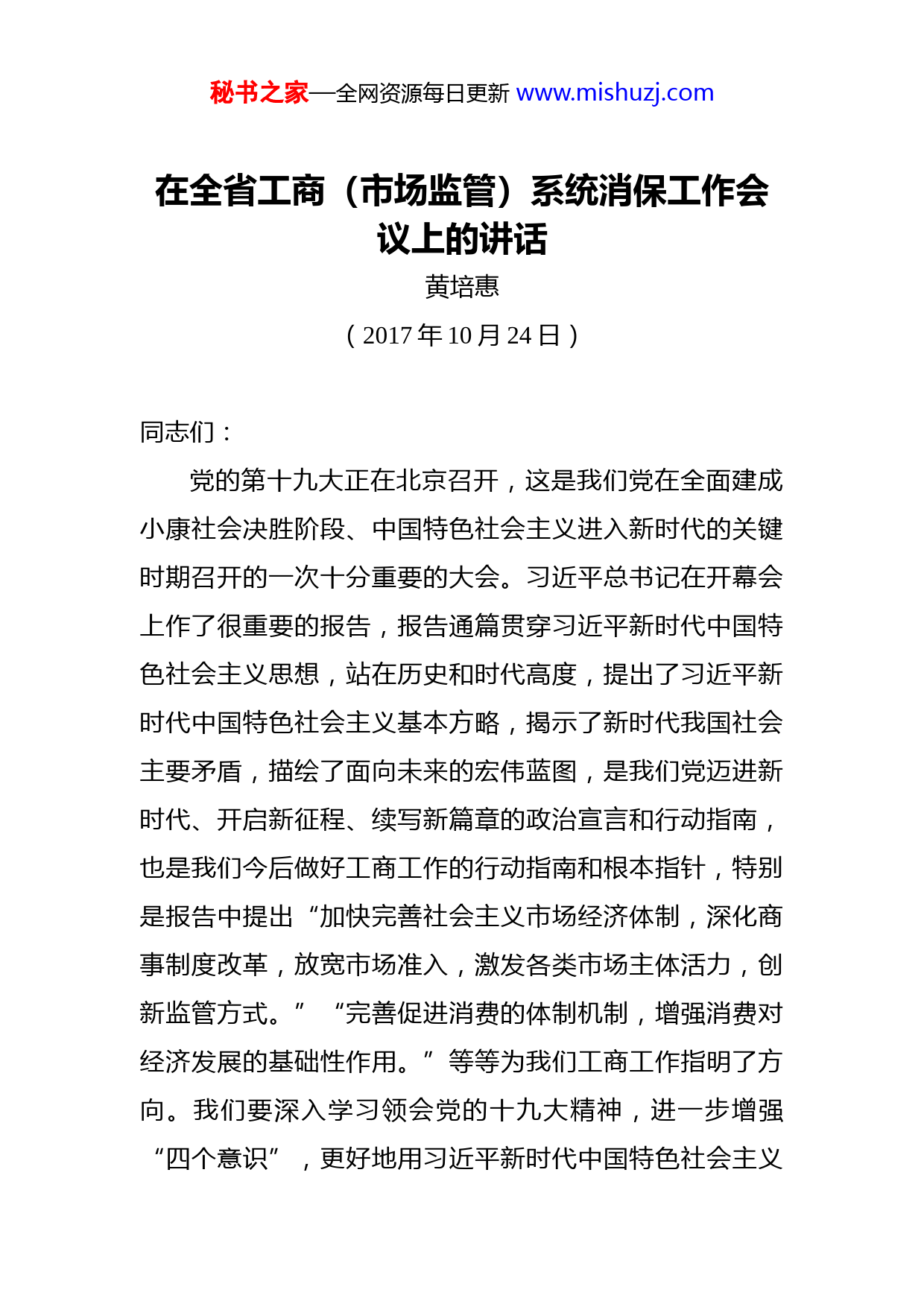 秘书之家—全网资源每日更新www.mishuzj.com在全省工商(市场监管)系统消保工作会议上的讲话黄培惠(2017年10月24日)同志们:党的第十九大正在北京召开,这是我们党在全面建成小康社会决胜阶段、中国特色社会主义进入新时代的关键时期召开的一次十分重要的大会。习近平总书记在开幕会上作了很重要的报告,报告通篇贯穿习近平新时代中国特色社会主义思想,站在历史和时代高度,提出了习近平新时代中国特色社会主义基本方略,揭示了新时代我国社会主要矛盾,描绘了面向未来的宏伟蓝图,是我们党迈进新时代、开启新征程、续写新篇章的政治宣言和行动指南,也是我们今后做好工商工作的行动指南和根本指针,特别是报告中提出“加快完善社会主义市场经济体制,深化商事制度改革,放宽市场准入,激发各类市场主体活力,创新监管方式。”“完善促进消费的体制机制,增强消费对经济发展的基础性作用。”等等为我们工商工作指明了方向。我们要深入学习领会党的十九大精神,进一步增强“四个意识”,更好地用习近平新时代中国特色社会主义秘书之家—全网资源每日更新www.mishuzj.com思想武装头脑,指导实践,紧密结合工商实际,认真贯彻落实十九大提出的各项部署。在党的十九大胜利召开之际,今天我们在漳州召开全省消费者权益保护工作会议,大家一起面对面讨论研究今后一段时期消费者权益保护工作,很有必要,而且我们选择在12315的发源地漳州召开也很有意义。这次会议也是我们认真学习贯彻党的十九大精神的一个实际行动,是一个很好的学习开端。漳州市政府对这次会议很重视,吴卫红副市长莅临会议指导并作了热情洋溢的致辞。刚才福州、漳州、莆田三地市分别交流了各自消保工作经验,他们的做法值得大家学习借鉴,其他地市也用书面形式交流了经验,都各有亮点,李升同志通报了消保工作的有关情况,许瑞察副局长代表省局总结回顾了近年来消保工作成效,部署了下一阶段重点工作,讲得很好,很全面,我都同意希望大家抓好落实。会前,许瑞察副局长跟我商量,希望我能到会讲个话,我欣然接受,我认为消费维权工作很重要,是工商工作的重要组成部分。下面我讲三点意见:一、以学习贯彻党的十九大精神为主线,把握维权监管的新形势和新要求习近平总书记在十九大报告中明确提出要“坚持新发展理念,建设现代化经济体系”“完善促进消费的体制机制,增强消费对经济发展的基础性作用”,“深化供给侧秘书之家—全网资源每日更新www.mishuzj.com结构性改革,在中高端消费、创新引领等领域培育新增长点、形成新动能”,“加快建立绿色生产和消费的法律制度和政策导向。”这是习近平新时代中国特色社会主义思想的重要组成部分,也是总书记提出的推动新的改革热点和改革亮点,激发消费市场活力和创造力,打造有国际竞争力经济环境的重要命题。近年来,我国消费保持平稳较快增长,最终消费率已连续五年超过资本形成率,成为拉动经济增长的主要动力消费对宏观经济发展的作用越来越凸显。我国是拥有13亿多人口的大市场,消费需求规模最大,和民生关系最直接不仅是能够保持我国中高速增长的潜力所在,且是经济增长、转型升级的重要引擎和推力。然而,当前在体制机制消费环境、优质消费品的供给等方面仍有待完善,制约了消费潜力的充分释放。消费的需求还很大,但是供给还跟不上,经济发展新常态需要培育消费热点,需要释放消费潜力。因此,如何发挥消费的基础作用,让“消费马车”持续发力,打造多点支撑的消费增长格局,让群众能消费敢消费,已经上升为党中央、国务院的重要决策部署和战略要求。这些对我们工商工作提出了新课题和新要求。消费环境可以反映一个国家、一个地区的形象,是软实力和竞争力的重要体现。在复杂的国际国内经济形势下中央推动改革发展、促进社会和谐、惠及人民群众的各项秘书之家—全网资源每日更新www.mishuzj.com政策措施,很多都要通过市场来实现,都要通过加强市场监管去保障落实,这就对市场监管部门赋予了更新、更重的任务,对消保工作事业提出了新的课题和挑战。今年1月,国务院印发了《“十三五”市场监管规划》,《规划》作为国务院第一部全国市场监管领域的重点专项规划,明确要求把维护消费者权益放在市场监管的核心位置,提高消费环境安全度、经营者诚信度和消费者满意度。这样的专项规划是前所未有的,涉及到下一步市场监管格局和机制因此,我们要认真学习党的十九大精神,深刻领会中央对经济发展形势的判断,顺应改革发展新趋势,把握“放管服”新要求,开拓创新,努力成为推动改革的正能量,让老百姓在改革发展中享受更多的获得感。二、以服务改善民生为宗旨,坚守消费维权履职定位和核心主线不忘初心,方得始终。习总书记在十九大报告中指出:“增进民生福祉是发展的根本目的,必须多谋民生之利、多解民生之忧,在发展中补齐民生短板、促进社会公开正义”。人人都是消费者,广大群众每一天都离不开衣食住行,每一天都要消费商品或接受服务,在消费过程中能够放心,发现问题有人监管,是人民群众对消费维权工作的基本要求。近几年来,我省工商系统在消费者权益保护方面做了大量卓有成效的工作,有些工作甚至位列全国前茅秘书之家—全网资源每日更新www.mishuzj