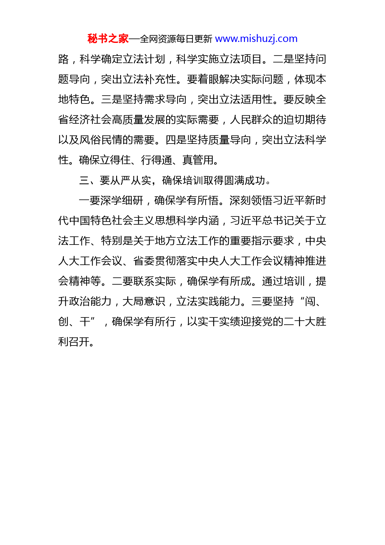 秘书之家—全网资源每日更新www.mishuzj.com在全省市州人大地方立法暨备案审查工作培训班开班式上的讲话本次培训班是根据省人大法制委年度工作要点、机关年度学习培训计划作出的安排,是市州人大换届后举办的第一次培训班。旨在深入学习习近平法治思想,习近平关于立法工作的重要指示批示精神,中央人大工作会议及省委贯彻落实中央人大工作会议精神推进会精神,不断提升全省人大地方立法干部队伍的工作能力和业务水平,更好地服务全省经济社会高质量发展。一、要提高政治站位,切实增强做好地方立法工作的使命感与责任感。一要从坚持全面依法治国,加快完善中国特色社会主义法律体系的高度推动习近平总书记重要指示精神落地落实,以良法促进发展,保障善治。二要从引领和推动全省经济社会发展角度来把握立法,发挥地方立法的引领、规范、推动、保障作用,努力将立法资源转化为改革发展新优势。三要从履行人大职权的维度来看待立法,发挥人大主导作用,把立法资源用好用足。二、要把握四个导向,不断提高我省地方立法工作的能力与水平。一是坚持目标导向,突出立法系统性。要整体谋划思秘书之家—全网资源每日更新www.mishuzj.com路,科学确定立法计划,科学实施立法项目。二是坚持问题导向,突出立法补充性。要着眼解决实际问题,体现本地特色。三是坚持需求导向,突出立法适用性。要反映全省经济社会高质量发展的实际需要,人民群众的迫切期待以及风俗民情的需要。四是坚持质量导向,突出立法科学性。确保立得住、行得通、真管用。三、要从严从实,确保培训取得圆满成功。一要深学细研,确保学有所悟。深刻领悟习近平新时代中国特色社会主义思想科学内涵,习近平总书记关于立法工作、特别是关于地方立法工作的重要指示要求,中央人大工作会议、省委贯彻落实中央人大工作会议精神推进会精神等。二要联系实际,确保学有所成。通过培训,提升政治能力,大局意识,立法实践能力。三要坚持“闯、创、干”,确保学有所行,以实干实绩迎接党的二十大胜利召开。
