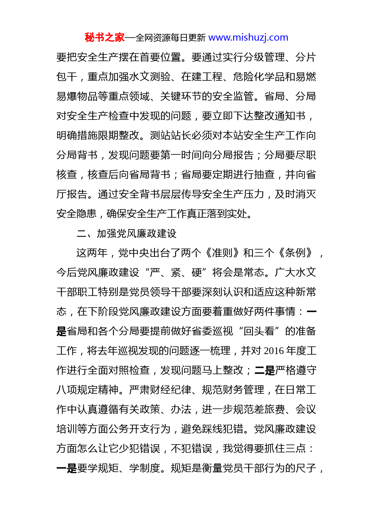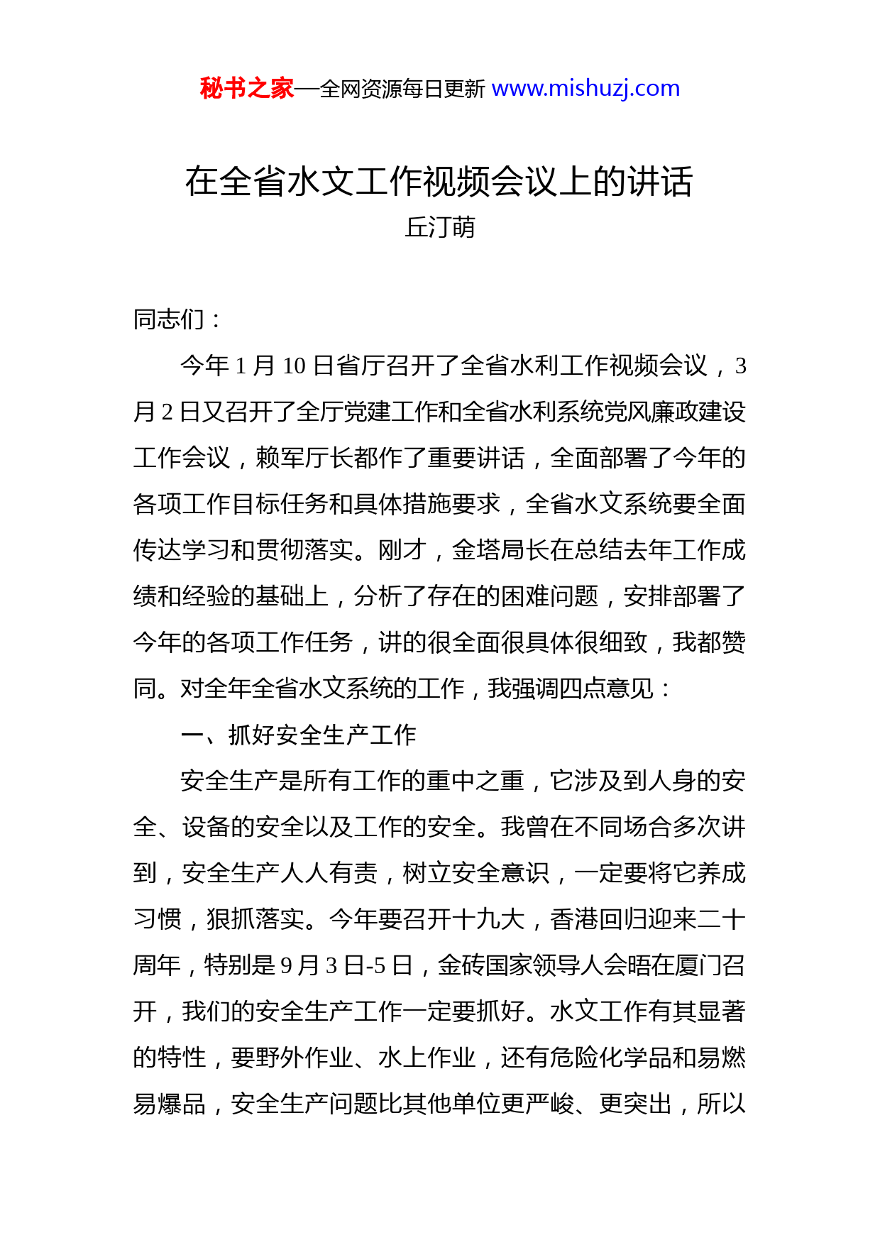秘书之家—全网资源每日更新www.mishuzj.com在全省水文工作视频会议上的讲话丘汀萌同志们:今年1月10日省厅召开了全省水利工作视频会议,3月2日又召开了全厅党建工作和全省水利系统党风廉政建设工作会议,赖军厅长都作了重要讲话,全面部署了今年的各项工作目标任务和具体措施要求,全省水文系统要全面传达学习和贯彻落实。刚才,金塔局长在总结去年工作成绩和经验的基础上,分析了存在的困难问题,安排部署了今年的各项工作任务,讲的很全面很具体很细致,我都赞同。对全年全省水文系统的工作,我强调四点意见:一、抓好安全生产工作安全生产是所有工作的重中之重,它涉及到人身的安全、设备的安全以及工作的安全。我曾在不同场合多次讲到,安全生产人人有责,树立安全意识,一定要将它养成习惯,狠抓落实。今年要召开十九大,香港回归迎来二十周年,特别是9月3日-5日,金砖国家领导人会晤在厦门召开,我们的安全生产工作一定要抓好。水文工作有其显著的特性,要野外作业、水上作业,还有危险化学品和易燃易爆品,安全生产问题比其他单位更严峻、更突出,所以秘书之家—全网资源每日更新www.mishuzj.com要把安全生产摆在首要位置。要通过实行分级管理、分片包干,重点加强水文测验、在建工程、危险化学品和易燃易爆物品等重点领域、关键环节的安全监管。省局、分局对安全生产检查中发现的问题,要立即下达整改通知书,明确措施限期整改。测站站长必须对本站安全生产工作向分局背书,发现问题要第一时间向分局报告;分局要尽职核查,核查后向省局背书;省局要定期进行抽查,并向省厅报告。通过安全背书层层传导安全生产压力,及时消灭安全隐患,确保安全生产工作真正落到实处。二、加强党风廉政建设这两年,党中央出台了两个《准则》和三个《条例》,今后党风廉政建设“严、紧、硬”将会是常态。广大水文干部职工特别是党员领导干部要深刻认识和适应这种新常态,在下阶段党风廉政建设方面要着重做好两件事情:一是省局和各个分局要提前做好省委巡视“回头看”的准备工作,将去年巡视发现的问题逐一梳理,并对2016年度工作进行全面对照检查,发现问题马上整改;二是严格遵守八项规定精神。严肃财经纪律、规范财务管理,在日常工作中认真遵循有关政策、办法,进一步规范差旅费、会议培训等方面公务开支行为,避免踩线犯错。党风廉政建设方面怎么让它少犯错误,不犯错误,我觉得要抓住三点:一是要学规矩、学制度。规矩是衡量党员干部行为的尺子,秘书之家—全网资源每日更新www.mishuzj.com大家一定要学深学透,把规矩融会贯通到工作实际中去。二是集体决策,阳光运作。各级水文领导干部,特别是“一把手”,要坚持执行集体决策制度,要正确对待决策过程中出现的不同意见和建议,通过科学决策,阳光运作把可能存在的风险排除,有效减少犯错误的几率。三是吃透规定,规范运作。对于工作中把握不准、理解不透的制度政策、制度,要及时向上级请示汇报,确保政策理解不走样、制度落实无折扣,规范运作,全面提升工作执行力。三、坚决完成年度目标任务一是抓好测报工作。我们要进一步细化水文预测报方案,强化灾害性天气监视、雨水情监测预报,全力做好金砖会晤期间的水文预测报工作。二是做好水资源保障服务。我们要充分发挥水文行业优势,为实施最严格水资源管理提供水文技术和数据支撑。在“河长制”全面铺开阶段,积极配合各级“河长办”开展河流基本情况摸底,做好河道、水库水情和江河源头、饮用水源地及水功能区水质监测评价等工作,为“河长制”实施做好服务。三是坚决完成今年目标任务。今年上半年一定要全面完成中小河流水文监测项目建设任务;各分局要根据省局下发的项目清单全力做好安全生态水系项目建设对接工作,通过积极与主管部门负责项目的同志、项目业主、设计单位主设人员联系沟通,对涉及水文站点所在河段的安全生态水系项目进秘书之家—全网资源每日更新www.mishuzj.com行及时跟踪,依托项目建设改善水文站点的测验条件以及周边环境,服务水文自身发展;积极探索无人机在水文监测领域的应用,充分利用无人机的优势,尝试完成危险系数比较高、具备一些安全隐患且需要投入大量人力的水文测验工作;要积极探索远程监控技术的应用,对远程异地的雨量、水位、水量、水质、泥沙等水文要素进行实时监测和共享,努力实现智能化,依靠科技力量来释放生产力提升水文生产的安全性,提升水文工作的时效和精准度,提高我们在防汛防台风、水资源优化配置、水质监测等方面的整体应用水平。四、加强干部队伍和精神文明建设省局、分局要积极响应省厅提出的“建设新福建、水利勇担当”主题实践活动及党支部标准化建设活动,充分发挥党支部的战斗堡垒作用和党员的先锋模范作用,提升水文干部职工的精气神,增强水文队伍的凝聚力执行力,推动水文业务和党建工作取得实效。当前,水文系统干部队伍断层比较严重,省局要继续探索水文人才培养的新途径,建立健全以人才资源能力建设为核心的人才培育机制以公开、平等、竞争、择优为导向,创造优秀人才能脱颖而出的优良环境,大胆提拔使用优秀的年青干部和综合能力强的干部,使水文人才在年龄梯度、知识结构方面优化互补,为