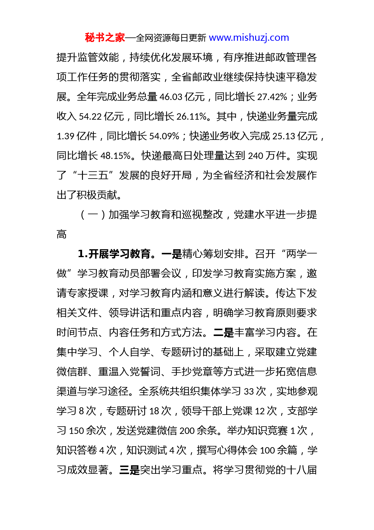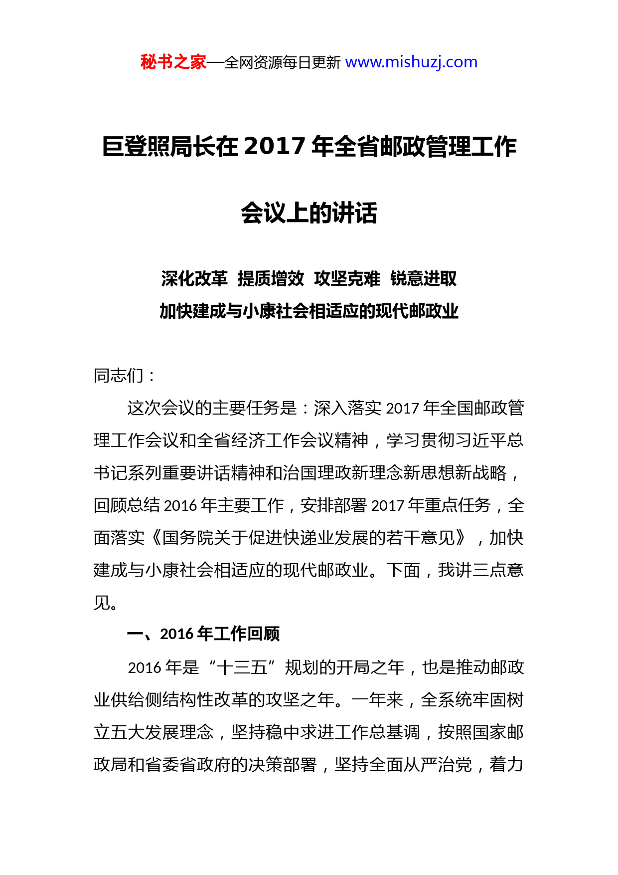 秘书之家—全网资源每日更新www.mishuzj.com巨登照局长在2017年全省邮政管理工作会议上的讲话深化改革提质增效攻坚克难锐意进取加快建成与小康社会相适应的现代邮政业同志们:这次会议的主要任务是:深入落实2017年全国邮政管理工作会议和全省经济工作会议精神,学习贯彻习近平总书记系列重要讲话精神和治国理政新理念新思想新战略,回顾总结2016年主要工作,安排部署2017年重点任务,全面落实《国务院关于促进快递业发展的若干意见》,加快建成与小康社会相适应的现代邮政业。下面,我讲三点意见。一、2016年工作回顾2016年是“十三五”规划的开局之年,也是推动邮政业供给侧结构性改革的攻坚之年。一年来,全系统牢固树立五大发展理念,坚持稳中求进工作总基调,按照国家邮政局和省委省政府的决策部署,坚持全面从严治党,着力秘书之家—全网资源每日更新www.mishuzj.com提升监管效能,持续优化发展环境,有序推进邮政管理各项工作任务的贯彻落实,全省邮政业继续保持快速平稳发展。全年完成业务总量46.03亿元,同比增长27.42%;业务收入54.22亿元,同比增长26.11%。其中,快递业务量完成1.39亿件,同比增长54.09%;快递业务收入完成25.13亿元,同比增长48.15%。快递最高日处理量达到240万件。实现了“十三五”发展的良好开局,为全省经济和社会发展作出了积极贡献。(一)加强学习教育和巡视整改,党建水平进一步提高1.开展学习教育。一是精心筹划安排。召开“两学一做”学习教育动员部署会议,印发学习教育实施方案,邀请专家授课,对学习教育内涵和意义进行解读。传达下发相关文件、领导讲话和重点内容,明确学习教育原则要求时间节点、内容任务和方式方法。二是丰富学习内容。在集中学习、个人自学、专题研讨的基础上,采取建立党建微信群、重温入党誓词、手抄党章等方式进一步拓宽信息渠道与学习途径。全系统共组织集体学习33次,实地参观学习8次,专题研讨18次,领导干部上党课12次,支部学习150余次,发送党建微信200余条。举办知识竞赛1次,知识答卷4次,知识测试4次,撰写心得体会100余篇,学习成效显著。三是突出学习重点。将学习贯彻党的十八届秘书之家—全网资源每日更新www.mishuzj.com六中全会精神纳入“两学一做”学习教育,并作为重点内容进行专题学习。通过专家解读、座谈研讨等形式,举办全系统学习贯彻党的十八届六中全会培训班,原原本本学习《条例》和《准则》,坚持全面从严治党,着力提升全体党员干部党性修养。四是加强基层党组织建设。严格落实“三会一课”和双重组织生活制度,加强对基层党组织和党建工作的管理考核。开展党支部述职述评工作,完成党支部换届工作。加强对非公企业党建工作的指导,摸清企业党员数量及分布情况,通过发放书籍材料、组织学习座谈等形式,指导非公企业党员开展“两学一做”学习教育。松原市局党支部获评“党的阵地建设甲级达标单位”吉林市局党支部获评“先进基层党支部”。2.落实巡视整改。按照国家局党组关于巡视整改的部署要求,局党组切实担当起巡视整改主体责任,深入查摆问题、深刻剖析原因,带头整改问题,发挥示范和表率作用召开专题会议、成立领导小组、制定整改方案,将巡视整改要求落到实处,做到即知即改、立行立改。坚持问题导向,采取台账推进、挂账销号、责任到人的办法对整改措施进行动态管理,有序完成20项整改问题、55项整改任务和100条细化具体措施的落实。各市(州)局均按照省局党组要求制定了整改方案,并完成整改任务落实。3.加强廉政建设。一是落实主体责任。认真履行“一岗秘书之家—全网资源每日更新www.mishuzj.com双责”,深入落实中央八项规定精神,突出各级党组织抓党风廉政建设的主体责任,强化党组主要负责人为第一责任人、负总责,坚持把党风廉政建设和邮政管理工作同部署、同检查、同考核。制定并印发《纪检监察年度工作要点》《党风廉政建设主体责任和监督责任暂行办法》《全面从严治党实施意见》《深化“四风”整治工作方案》《“为官不为”专项整治意见》等5个文件,召开全系统党风廉政建设工作会议,与机关各处室和各市(州)局主要负责人签订党风廉政建设责任书,将党风廉政建设纳入年度考核。二是落实监督责任。充分发挥纪检部门监督执纪问责职能,认真组织开展八项规定精神回头看、办公用房清理检查等工作,抓住中秋、国庆等重要节点,重申纪律要求,坚决反对“四风”。定期通报典型案例,组织观看《永远在路上》《底线》等教育片,以身边人、身边事作为反面教材,在全系统深入开展警示教育,产生强烈反响和震慑作用。举办纪检监察培训班2期,廉政谈话集体1次,个人1人,提醒谈话3人,问责党组织1个,问责领导干部1人。清理规范兼职6人,清退违规取酬8360元。开展党费收缴问题自查自纠,全系统共补缴党费2.65万元。(二)加强政策保障,发展环境进一步优化4.出台相关优惠政策。一是与省发改委联合发布吉林省邮政业发展“十三五”规划,并做好与地方政府总体规划秘书之家—全网资源每日更新www.mishuzj.com纲要以及相关专项规划的有效衔接。全省9个市(州)邮政业发展“十三五”规划,采取联合地方发改委或者以地方政府印发专项规划等形式进行了发布,相关内容均纳入了地方政府总体规划。二是协调出台《吉