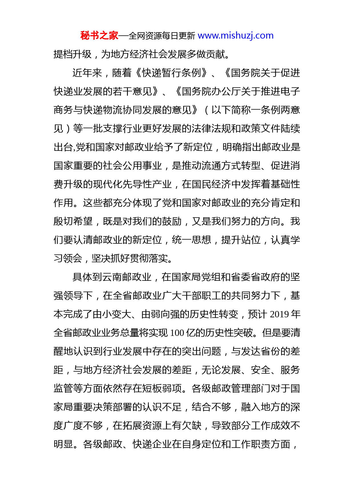 秘书之家—全网资源每日更新www.mishuzj.com在全省邮政行业重点工作推进会上的讲话魏水旺同志们:这次推进会会期只有半天,但是内容很丰富,核心任务就是要以习近平新时代中国特色社会主义思想为指导,认清邮政业的新定位,统一思想,鼓足干劲,不折不扣地落实好国家局部署和省局确定的重点工作任务。我讲三点意见:一、提升政治站位,明确肩负的光荣历史使命党的十八大以来,我国邮政业取得了举世瞩目的历史性成就,2018年业务收入达到7870亿元,快递业务量已连续5年稳居世界第一,在服务经济发展、支撑民生改善方面的基础性作用越发明显。党中央国务院高度关心关怀邮政业发展,习近平总书记在2019年新年贺词中称赞“快递小哥”是美好生活的创造者、守护者,在春节前夕亲自看望快递小哥并通过他们向全国从事快递业的300万人致以新春的祝福。李克强总理肯定快递业是中国经济的“黑马”。刘鹤副总理指出,“邮政体系是国家战略性基础设施和社会组织系统之一,要以政治角度认识其重要性”。马军胜局长对云南邮政业发展寄予厚望,提出要解放思想,勇于担当,融入地方,上下联动,政企合力,推动云南邮政业秘书之家—全网资源每日更新www.mishuzj.com提档升级,为地方经济社会发展多做贡献。近年来,随着《快递暂行条例》、《国务院关于促进快递业发展的若干意见》、《国务院办公厅关于推进电子商务与快递物流协同发展的意见》(以下简称一条例两意见)等一批支撑行业更好发展的法律法规和政策文件陆续出台,党和国家对邮政业给予了新定位,明确指出邮政业是国家重要的社会公用事业,是推动流通方式转型、促进消费升级的现代化先导性产业,在国民经济中发挥着基础性作用。这些都充分体现了党和国家对邮政业的充分肯定和殷切希望,既是对我们的鼓励,又是我们努力的方向。我们要认清邮政业的新定位,统一思想,提升站位,认真学习领会,坚决抓好贯彻落实。具体到云南邮政业,在国家局党组和省委省政府的坚强领导下,在全省邮政业广大干部职工的共同努力下,基本完成了由小变大、由弱向强的历史性转变,预计2019年全省邮政业业务总量将实现100亿的历史性突破。但是要清醒地认识到行业发展中存在的突出问题,与发达省份的差距,与地方经济社会发展的差距,无论发展、安全、服务监管等方面依然存在短板弱项。各级邮政管理部门对于国家局重要决策部署的认识不足,结合不够,融入地方的深度广度不够,在拓展资源上有欠缺,导致部分工作成效不明显。各级邮政、快递企业在自身定位和工作职责方面,秘书之家—全网资源每日更新www.mishuzj.com在落实好各级邮政管理部门的安排部署,贯彻“发展为要安全为基、服务为上”总要求方面,在落实好主体责任,形成政企合力的工作局面方面还存在偏差和不足。为落实好国家局、省委省政府今年的工作部署,省局近日印发了《2019年工作要点》、《党建工作要点》、《党风廉政工作要点》、《更贴近民生七件实事责任分工实施方案》和三大攻坚战实施方案等文件,明确了各单位各部门各企业的职责任务,希望抓好贯彻落实。总之,全省邮政行业需要下力气做好“行业内对标对表,行业外融合融入”这篇文章,在重点工作推进方面,持续发力,久久为功。二、强弱项,补短板,突出抓好十项重点工作任务理清了行业发展和行业监管存在的问题,关键就是要强弱项、补短板,全省邮政业要在2019年着力抓好以下十项重点工作任务。(一)实施党建引领工程全省邮政管理部门要始终坚持党对一切工作的领导,深化思想理论武装,深入学习贯彻习近平新时代中国特色社会主义思想,推进学习常态化制度化,扎实开展“不忘初心、牢记使命”主题教育活动。落实好《中共国家邮政局党组关于推动新时代全面从严治党向纵深发展的意见》精神,按照国家局党组“12365”工作布局,坚持以“党旗引领·大邮可为”为重要引擎,把握党建“服务中心、建设队秘书之家—全网资源每日更新www.mishuzj.com伍”两大核心任务,以省委部署的“基层党建创新提质年”工作为重要抓手,以党的建设引领推动全省邮政业高质量发展。强化党组领导核心作用,各级领导干部要以身作则、率先垂范,要结合实际、因地制宜,更好贯彻落实党的路线方针政策及国家局党组重大决策部署,确保工作实效。要把党的政治建设摆在首位,坚定政治立场,坚决做到“两个维护”,严肃党内政治生活,严守党的政治纪律。加强党风廉政建设,不断提高干部队伍战斗力,树立干事创业的鲜明导向,持之以恒纠正“四风”。完善工作机制,党建工作实现纵向联动、横向协同,着力构建知责尽责、负责的系统党建工作格局。结合行业实际,积极引导推进非公快递企业党建工作全覆盖。扎实做好快递员群体联系服务工作。更好发挥党建领导小组的作用,深化《中国共产党支部工作条例(试行)》学习贯彻,结合党支部规范化建设、互联网+党建等工作的推进,把各级党组织打造成坚强的战斗堡垒,重点加强对党员干部的日常教育管理。(二)实施政策落地工程要以贯彻落实一条例两意见文件精神为主线,加强与省直相关部门的沟通和协调,推动有关政策、机制和措施的落地实施。各州市局要加强汇报沟通,作为一项重点工作任务,尽快推动出台本地区的相关政策文件。目前,还秘书之家