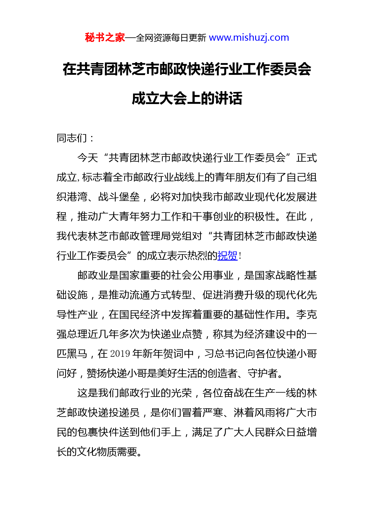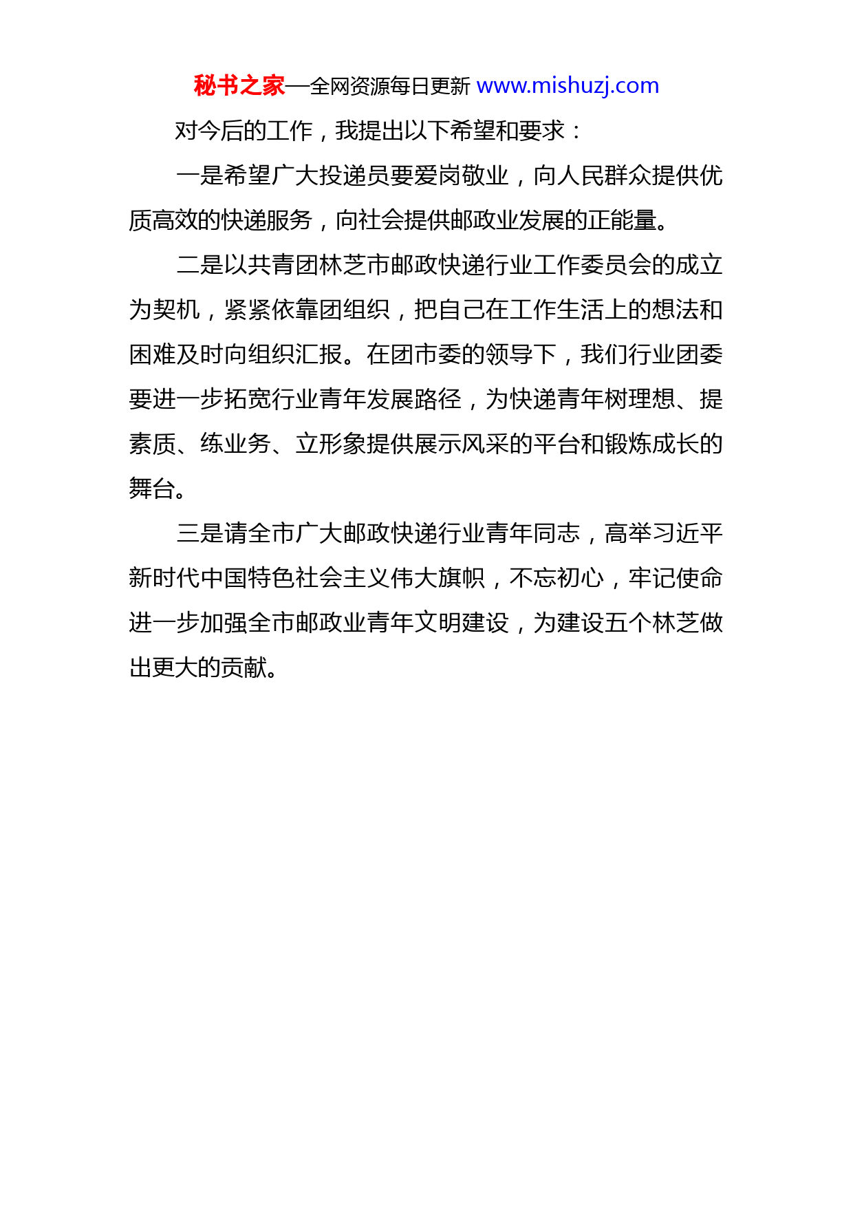 秘书之家—全网资源每日更新www.mishuzj.com在共青团林芝市邮政快递行业工作委员会成立大会上的讲话同志们:今天“共青团林芝市邮政快递行业工作委员会”正式成立,标志着全市邮政行业战线上的青年朋友们有了自己组织港湾、战斗堡垒,必将对加快我市邮政业现代化发展进程,推动广大青年努力工作和干事创业的积极性。在此,我代表林芝市邮政管理局党组对“共青团林芝市邮政快递行业工作委员会”的成立表示热烈的祝贺!邮政业是国家重要的社会公用事业,是国家战略性基础设施,是推动流通方式转型、促进消费升级的现代化先导性产业,在国民经济中发挥着重要的基础性作用。李克强总理近几年多次为快递业点赞,称其为经济建设中的一匹黑马,在2019年新年贺词中,习总书记向各位快递小哥问好,赞扬快递小哥是美好生活的创造者、守护者。这是我们邮政行业的光荣,各位奋战在生产一线的林芝邮政快递投递员,是你们冒着严寒、淋着风雨将广大市民的包裹快件送到他们手上,满足了广大人民群众日益增长的文化物质需要。秘书之家—全网资源每日更新www.mishuzj.com对今后的工作,我提出以下希望和要求:一是希望广大投递员要爱岗敬业,向人民群众提供优质高效的快递服务,向社会提供邮政业发展的正能量。二是以共青团林芝市邮政快递行业工作委员会的成立为契机,紧紧依靠团组织,把自己在工作生活上的想法和困难及时向组织汇报。在团市委的领导下,我们行业团委要进一步拓宽行业青年发展路径,为快递青年树理想、提素质、练业务、立形象提供展示风采的平台和锻炼成长的舞台。三是请全市广大邮政快递行业青年同志,高举习近平新时代中国特色社会主义伟大旗帜,不忘初心,牢记使命进一步加强全市邮政业青年文明建设,为建设五个林芝做出更大的贡献。