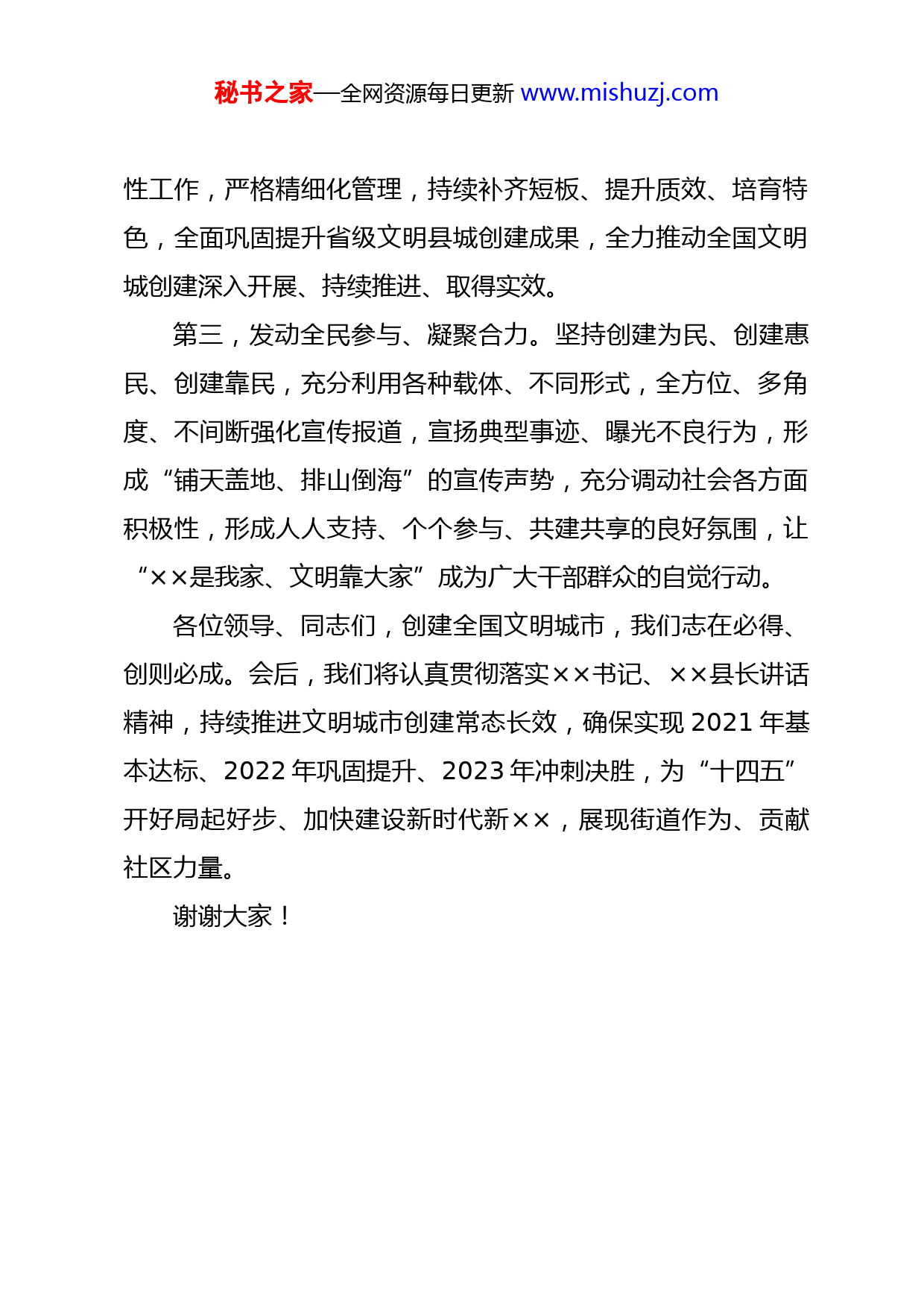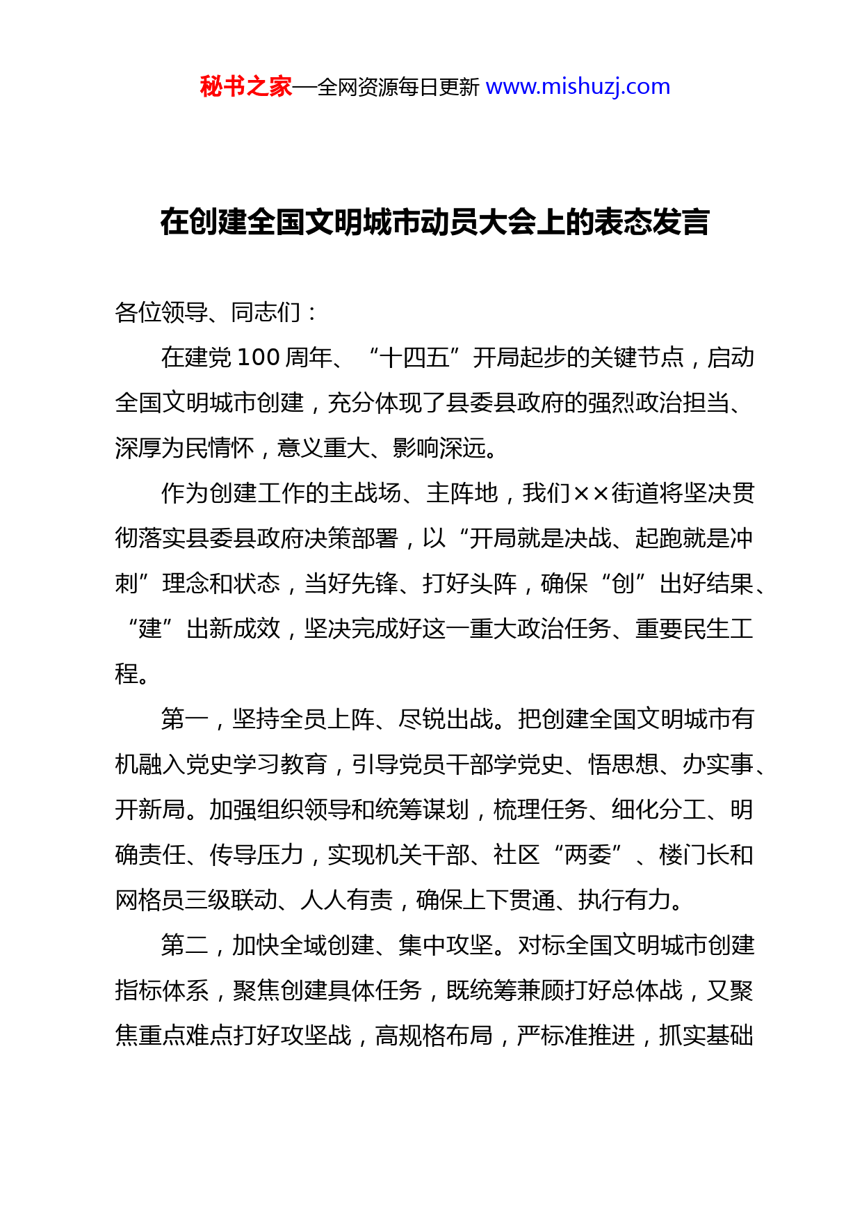 秘书之家—全网资源每日更新www.mishuzj.com在创建全国文明城市动员大会上的表态发言各位领导、同志们:在建党100周年、“十四五”开局起步的关键节点,启动全国文明城市创建,充分体现了县委县政府的强烈政治担当、深厚为民情怀,意义重大、影响深远。作为创建工作的主战场、主阵地,我们××街道将坚决贯彻落实县委县政府决策部署,以“开局就是决战、起跑就是冲刺”理念和状态,当好先锋、打好头阵,确保“创”出好结果、“建”出新成效,坚决完成好这一重大政治任务、重要民生工程。第一,坚持全员上阵、尽锐出战。把创建全国文明城市有机融入党史学习教育,引导党员干部学党史、悟思想、办实事、开新局。加强组织领导和统筹谋划,梳理任务、细化分工、明确责任、传导压力,实现机关干部、社区“两委”、楼门长和网格员三级联动、人人有责,确保上下贯通、执行有力。第二,加快全域创建、集中攻坚。对标全国文明城市创建指标体系,聚焦创建具体任务,既统筹兼顾打好总体战,又聚焦重点难点打好攻坚战,高规格布局,严标准推进,抓实基础秘书之家—全网资源每日更新www.mishuzj.com性工作,严格精细化管理,持续补齐短板、提升质效、培育特色,全面巩固提升省级文明县城创建成果,全力推动全国文明城创建深入开展、持续推进、取得实效。第三,发动全民参与、凝聚合力。坚持创建为民、创建惠民、创建靠民,充分利用各种载体、不同形式,全方位、多角度、不间断强化宣传报道,宣扬典型事迹、曝光不良行为,形成“铺天盖地、排山倒海”的宣传声势,充分调动社会各方面积极性,形成人人支持、个个参与、共建共享的良好氛围,让“××是我家、文明靠大家”成为广大干部群众的自觉行动。各位领导、同志们,创建全国文明城市,我们志在必得、创则必成。会后,我们将认真贯彻落实××书记、××县长讲话精神,持续推进文明城市创建常态长效,确保实现2021年基本达标、2022年巩固提升、2023年冲刺决胜,为“十四五”开好局起好步、加快建设新时代新××,展现街道作为、贡献社区力量。谢谢大家!
