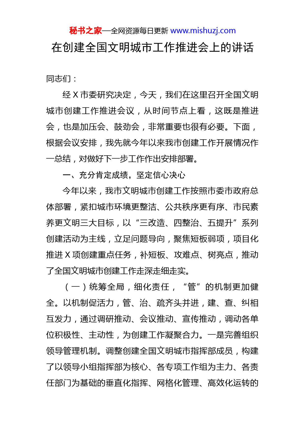 秘书之家—全网资源每日更新www.mishuzj.com在创建全国文明城市工作推进会上的讲话同志们:经X市委研究决定,今天,我们在这里召开全国文明城市创建工作推进会议,从时间节点上看,这既是推进会,也是加压会、鼓劲会,非常重要也很有必要。下面,根据会议安排,我先就今年以来我市创建工作开展情况作一总结,对做好下一步工作作出安排部署。一、充分肯定成绩,坚定信心决心今年以来,我市文明城市创建工作按照市委市政府总体部署,紧扣城市环境更整洁、公共秩序更有序、市民素养更文明三大目标,以“三改造、四整治、五提升”系列创建活动为主线,立足问题导向,聚焦短板弱项,项目化推进X项创建重点任务,补短板、攻难点、树亮点,推动了全国文明城市创建工作走深走细走实。(一)统筹全局,细化责任,“管”的机制更加健全。以机制促活力,管、治、疏齐头并进,建、查、纠相互发力,通过调研推动、会议推动、宣传推动,调动各单位积极性、主动性,为创建工作凝聚合力。一是完善组织领导管理机制。调整创建全国文明城市指挥部成员,构建了以领导小组指挥部为核心、各专项工作组为主力、各责任部门为基础的垂直化指挥、网格化管理、高效化运转的秘书之家—全网资源每日更新www.mishuzj.com组织体系。二是完善年度创建责任机制。从我市创建工作实际出发,制定下发《X市创建全国文明城市重点工作任务清单》、《关于落实薄弱小区包挂整改工作责任制的通知》、《关于在主城区单位自建宿舍楼推行包挂责任制的通知》等系列指导性文件,完善细化职责分工、压实创建责任。三是完善季度考核通报机制。制定出台《X市全国文明城市创建工作考核办法》、《文明城市创建考核实施细则》,强化文明城市创建日常管理和过程考核,坚持日巡查、周调度、月评比、季通报制度,及时发现问题及时督促解决,推动各单位各部门创建工作的常态化长效化。四是完善日常巡查督办机制。坚持和完善创建工作每日例会、巡查交办、跟踪督查、重大交办事项专报等制度,逐步构建起“巡查-交办-整改-督办”工作闭环。(二)立足当前,着眼长远,“改”的力度不断加强。围绕农贸市场、老旧小区、背街小巷“三大改造”工程为重点,消除创建堵点。一是积极推进农贸市场提质改造。实施农贸市场提质工程,累计投入X万元,X农贸市场重点围绕市场负一楼和市场北巷道,X农贸市场重点围绕禽肉和水产区,X农贸市场重点围绕自产自销区,合计整改面积达X平方。二是全面开展老旧小区分类改造。针对主城区范围内的X个不达标小区,根据不同情况按照六种类型进行分类施策(1.有实力的单位包挂一部分;2.原单位宿秘书之家—全网资源每日更新www.mishuzj.com舍的认领一部分;3.有维修积金的房产服务中心兜底一部分;4.无维修基金的老旧小区X街道兜底一部分;5.列入全市老旧小区改造一部分;6.列入X年计划拆迁一部分)。三是加快实施背街小巷达标改造。年初梳理主城区需要改造的背街小巷X条,截止目前,已经改造完成X条。共计铺设沥青路面X万平方米,铺设混凝土路面X万平方米,铺设更换路牙石X米,新建雨水管道X米,污水管道X米,更换人行道板及铺装X平方米,安装路灯X盏。(三)重拳出击,疏堵结合,“乱”的现象基本清除。牵头成立市容环境、交通秩序、停车便利化、野广告、文明养犬五个专项行动组,每周五次开展联合行动,瞄准乱堆乱放、私拉乱扯、乱停乱放、乱闯红灯、乱贴小广告、犬只散养等不文明“乱”象,全员抓、全域抓、全面抓、全天候抓,收到了明显成效。市容环境方面:累计拆除违规门头店招X个,责令整改门头店招X个,拆除大型广告牌X个,清理商户出店经营X家,清理流动摊点X次,清理飞线X处、垃圾X车。交通秩序方面:共查处非机动车逆向行驶X起、非机动车在机动车道内行驶X起、非机动车闯红灯X起、越线停车X起、行人闯红灯X起、现场纠正违法行为X余起,查处违规停放机动车X辆非机动车X辆,张贴机动车违停告知单X起,通知违停车辆驶秘书之家—全网资源每日更新www.mishuzj.com离X余起,清理僵尸车辆X辆。停车便利化方面:结合公共空间治理、老旧小区改造,城区新增停车位X个,小区新建、改造泊位X个;激活资源,利用空闲地块、城市边角和近期无开发计划地块建设临时停车场,释放X个停车泊位。各版块累计增加停车位X个。野广告治理方面:采取清除和打击相结合方式,累计清理野广告X张、清理乱张贴X处、路面喷绘广告X处,共立案处罚违规散发传单X余起,处理个人和单位非法张贴行为X多人次。同时,在各小区组织设立公益广告宣传栏,并责成相关社区做好便民信息张贴的引导工作及宣传栏的日常管理工作。文明养犬方面:先后出动X次在市区重点点位开展集中宣传活动,对不文明养犬行为进行处罚。先后收容犬只X只,对养犬人士思想教育X人次,依法、文明的养犬氛围逐渐形成。(四)借力科技,涵养文明,“好”的秩序逐渐形成。开通“违法随手拍”功能,鼓励社会力量和广大市民监督不文明交通行为。截止目前,已有X人注册使用,共接到举报的交通违法行为X起,审核有效录入处罚X起;启用无人机对城区X个主要交通路口的行人闯红灯、非机动车逆行等违章行为和交警、协警、志愿服务情况进行分时段航拍,制作成小视频反馈给相关单位;在主城区钟吾路与大桥路交叉口等X