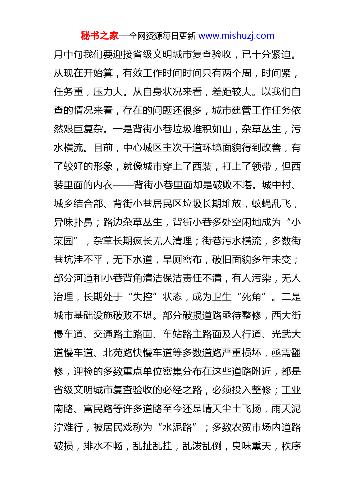 秘书之家—全网资源每日更新www.mishuzj.com在创建省级文明城市工作推进会上的讲话同志们:今天,我们召开全市创建省级文明城市工作推进会,是市委、市政府研究召开的一次非常重要的会议,这既是鼓劲动员会,更是加压誓师会。5月中旬,生考评组将对我市创建省级文明城市工作进行复查验收。这次会议的主要目的就是要进一步把要求明确到位,把责任落实到位,动员全市上下认清形势,提高认识,齐心协力,全力打好创建文明城市攻坚战,确保我市顺利通过省级文明城市复查验收。下面,我讲三点意见:一、要认清文明城市创建工作的紧迫性和艰巨性今年以来,市“三城联创”工作指挥部在城市建管方面主要相继开展了春季绿化、综合环境整治、户外广告整治、饮食摊点整治等活动。城区绿量空前提升,城市基础设施得到改善,广告宣传环境得到治理,饮食市场秩序有了明显改观。在充分肯定成绩的同时,我们对创建工作中存在的问题也必须清醒认识,认真对待。从横向来看,形势逼人。周边县城的创建工作常抓不懈、持之以恒,各项创建工作开展的如火如荼。如果我们不抢抓机遇,扎实细致地做好创建工作,那么,我市将很快落后于其他兄弟县,创建工作艰辛夺得的荣誉也将会失去。从时间上看,8秘书之家—全网资源每日更新www.mishuzj.com月中旬我们要迎接省级文明城市复查验收,已十分紧迫。从现在开始算,有效工作时间时间只有两个周,时间紧,任务重,压力大。从自身状况来看,差距较大。以我们自查的情况来看,存在的问题还很多,城市建管工作任务依然艰巨复杂。一是背街小巷垃圾堆积如山,杂草丛生,污水横流。目前,中心城区主次干道环境面貌得到改善,有了较好的形象,就像城市穿上了西装,打上了领带,但西装里面的内衣——背街小巷里面却是破败不堪。城中村、城乡结合部、背街小巷居民区垃圾长期堆放,蚊蝇乱飞,异味扑鼻;路边杂草丛生,背街小巷多处空闲地成为“小菜园”,杂草长期疯长无人清理;街巷污水横流,多数街巷坑洼不平,无下水道,旱厕密布,破旧面貌多年未变;部分河道和小巷背角清洁保洁责任不清,有人污染,无人治理,长期处于“失控”状态,成为卫生“死角”。二是城市基础设施破败不堪。部分破损道路亟待整修,西大街慢车道、交通路主路面、车站路主路面及人行道、光武大道慢车道、北苑路快慢车道等多数道路严重损坏,亟需翻修,迎检的多数重点单位密集分布在这些道路附近,都是省级文明城市复查验收的必经之路,必须投入整修;工业南路、富民路等许多道路至今还是晴天尘土飞扬,雨天泥泞难行,被居民戏称为“水泥路”;多数农贸市场内道路破损,排水不畅,乱扯乱挂,乱泼乱倒,臭味熏天,秩序秘书之家—全网资源每日更新www.mishuzj.com混乱;城区环卫等基础设施残缺,破败不堪,急需升级改造。三是城区乱象丛生。沿街乱搭乱建、乱扯乱挂、乱停乱放,乱涂乱画屡禁不止,乱象丛生。市区每天有上千个摊点占道经营,主次干道人行道自行车、电动车、三轮车摆放凌乱不堪。大型公益广告所占份额严重不足,商业广告设置管理不规范,泛滥成灾。城区一些商业广告破旧不堪,多数暖气管道上面挂满商业广告和门头招牌,沿街店铺门头招牌参差不齐,色彩不一,宣传车、锣鼓队、发传单等违规宣传严重影响着城市环境,一些单位和个人在城区街道随意粘贴广告,乱写乱画,特别是一些“办证”小广告随处可见,成为“牛皮癣”,难以根除。平安大道物流、修车场、商城路电动车销售点常年店外经营,侵占人行道,无人整治,一些商家公然搭建彩虹门,占道开展促销活动,严重影响着市容环境。四是车辆混杂,交通拥堵。城区主次干道各种车辆随意停放在快慢车道和人行道上,许多大货车杂乱无章地停靠在城区“四门”附近道路,驱赶不走。城区内几条街道节日堵,年关堵,平时也堵,大街堵,小巷也堵,经常堵得水泄不通。三轮车急剧膨胀,经常在快车道抢道行驶,在慢车道逆行,在交通要道口乱停无人管理,造成交通拥堵,市民群众怨声载道。执勤警力严重不足,人车混流、行人乱闯红灯现象严重,行路难已成为城市顽疾。五是乱占绿地、滥毁绿地现象屡秘书之家—全网资源每日更新www.mishuzj.com禁不止。部分路段行道树缺株死亡,城市绿量严重不足。即便如此,仍有未经审批、恣意破坏绿化带乱设广告牌现象,少数临街商户为开阔视野,随意毁坏门前绿化树,人为地破坏了城市绿化环境。六是一些市民的城市意识、文明意识不强。部分市民公德意识淡薄,偷盗破坏公共设施现象时有发生,致使安装好的公共休闲凳子、椅子时常“缺胳膊少腿”,刚刚安装好的果皮箱,就有人拆卸金属配件,刚刚摆放好的鲜花就“不翼而飞”。主次干道、大街小巷中形形色色的垃圾遍地乱窜,乱扔烟头、随意丢弃垃圾、张口吐痰等丑陋现象普遍存在;部分餐馆、门店对市容环境卫生不管不顾、我行我素,乱泼污水、乱倒垃圾、乱倒残汤剩饭的现象十分严重;有的楼群墙面破烂,院落脏乱,垃圾无人清扫,地面污水横流;行人随意横穿马路,车辆随时掉头转向,使得人与车争道,车与车抢道的情况日趋严重等等。这些不文明现象的存在,严重影响着城市容市貌的根本改善和城市品位的快速提升。这些问题需要引起我们的高度重视,并采取实实在在的措施努力加以解决。二、要抓住重点,突破难点,全