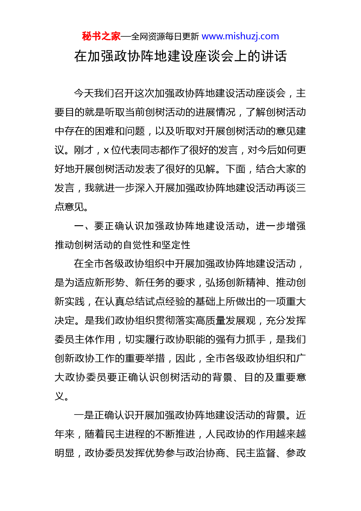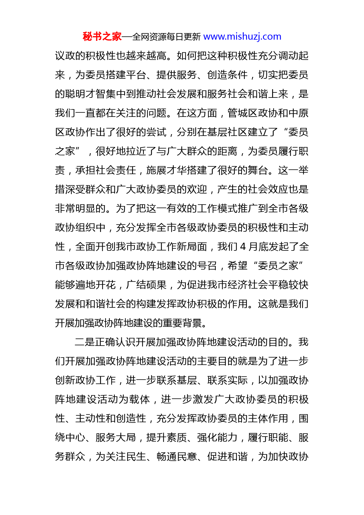 秘书之家—全网资源每日更新www.mishuzj.com在加强政协阵地建设座谈会上的讲话今天我们召开这次加强政协阵地建设活动座谈会,主要目的就是听取当前创树活动的进展情况,了解创树活动中存在的困难和问题,以及听取对开展创树活动的意见建议。刚才,x位代表同志都作了很好的发言,对今后如何更好地开展创树活动发表了很好的见解。下面,结合大家的发言,我就进一步深入开展加强政协阵地建设活动再谈三点意见。一、要正确认识加强政协阵地建设活动,进一步增强推动创树活动的自觉性和坚定性在全市各级政协组织中开展加强政协阵地建设活动,是为适应新形势、新任务的要求,弘扬创新精神、推动创新实践,在认真总结试点经验的基础上所做出的一项重大决定。是我们政协组织贯彻落实高质量发展观,充分发挥委员主体作用,切实履行政协职能的强有力抓手,是我们创新政协工作的重要举措,因此,全市各级政协组织和广大政协委员要正确认识创树活动的背景、目的及重要意义。一是正确认识开展加强政协阵地建设活动的背景。近年来,随着民主进程的不断推进,人民政协的作用越来越明显,政协委员发挥优势参与政治协商、民主监督、参政秘书之家—全网资源每日更新www.mishuzj.com议政的积极性也越来越高。如何把这种积极性充分调动起来,为委员搭建平台、提供服务、创造条件,切实把委员的聪明才智集中到推动社会发展和服务社会和谐上来,是我们一直都在关注的问题。在这方面,管城区政协和中原区政协作出了很好的尝试,分别在基层社区建立了“委员之家”,很好地拉近了与广大群众的距离,为委员履行职责,承担社会责任,施展才华搭建了很好的舞台。这一举措深受群众和广大政协委员的欢迎,产生的社会效应也是非常明显的。为了把这一有效的工作模式推广到全市各级政协组织中,充分发挥全市各级政协委员的积极性和主动性,全面开创我市政协工作新局面,我们4月底发起了全市各级政协加强政协阵地建设的号召,希望“委员之家”能够遍地开花,广结硕果,为促进我市经济社会平稳较快发展和和谐社会的构建发挥政协积极的作用。这就是我们开展加强政协阵地建设的重要背景。二是正确认识开展加强政协阵地建设活动的目的。我们开展加强政协阵地建设活动的主要目的就是为了进一步创新政协工作,进一步联系基层、联系实际,以加强政协阵地建设活动为载体,进一步激发广大政协委员的积极性、主动性和创造性,充分发挥政协委员的主体作用,围绕中心、服务大局,提升素质、强化能力,履行职能、服务群众,为关注民生、畅通民意、促进和谐,为加快政协秘书之家—全网资源每日更新www.mishuzj.com经济社会跨越式发展和建设“三化两型”城市做出新的贡献。三是正确认识开展加强政协阵地建设活动的重要意义。我们当前开展的创树活动对于进一步激发广大政协委员干事创业的热情,进一步发挥广大委员的主体作用,进一步提升政协组织和政协委员在人民群众心目中的形象,具有重要的现实意义。第一,它是学习实践高质量发展观,突出实践特色,适应形势发展的创新之举,是我们在履行职能上迈出新步伐、在自身建设上实现新提升、在工作创新上取得新突破上的具体行动。从当前工作的实践看,这项活动正在产生着广泛的社会影响。第二,它是围绕中心,服务大局,履职为民的具体体现。我们开展的加强政协阵地建设活动,旨在使我们的各级政协组织和广大政协委员可以更加地贴近中心、贴近实际、贴近群众,充分发挥“智囊团”、“人才库”的作用,充分发挥联系面广、信息畅通的优势,多建利民之言、多谋利民之策、多办利民之事,服务发展、服务和谐,使政协工作与党政工作、与人民需要在工作目标上协调,在工作部署上呼应,在工作措施上衔接。第三,它是加强自身建设,激发委员活力,树立政协形象的有力举措。政协委员是政协工作的主体,只有充分调动政协委员的积极性,整个政协工作才能活起来。开展“创建委员之家,树立委员形象”活动,秘书之家—全网资源每日更新www.mishuzj.com就是为了给委员知情出力、施展才华打造平台,进一步激发委员干事创业的潜能和活力,为关注民生、畅通民意、促进和谐,为加快政协经济社会跨越式发展和建设“三化两型”城市做贡献提供用武之地。二、要坚持把“树立委员形象”作为活动的出发点和落脚点,不断推动创树活动的深入开展形象,是一个组织或个人精神面貌、工作作风和综合素质的外在表现。委员树立什么样的形象,直接影响政协履行职能的效果,影响政协工作的全局。因此,广大政协委员要在“创树”活动中,牢固树立勤奋学习、团结民主、求真务实、开拓创新、无私奉献的良好形象,进一步增强政协组织和政协委员的影响力和号召力。那么怎样才能树立这五种良好形象呢?我认为大家要切实从以下五个方面做起:一是要做到勤奋学习。加强学习是提高委员的自身综合素质,树立委员良好形象的需要。每位政协委员特别是新委员,都要牢固树立“时时学习”、“处处学习”、“终身学习”的理念,坚持学习,勤于学习,努力达到学以修德、学以增智、学以致用的目的。要坚持不懈地加强政治理论学习,切实用党的最新理论成果武装头脑,不断提高履职的政策水平。要认真学习中央、省、市