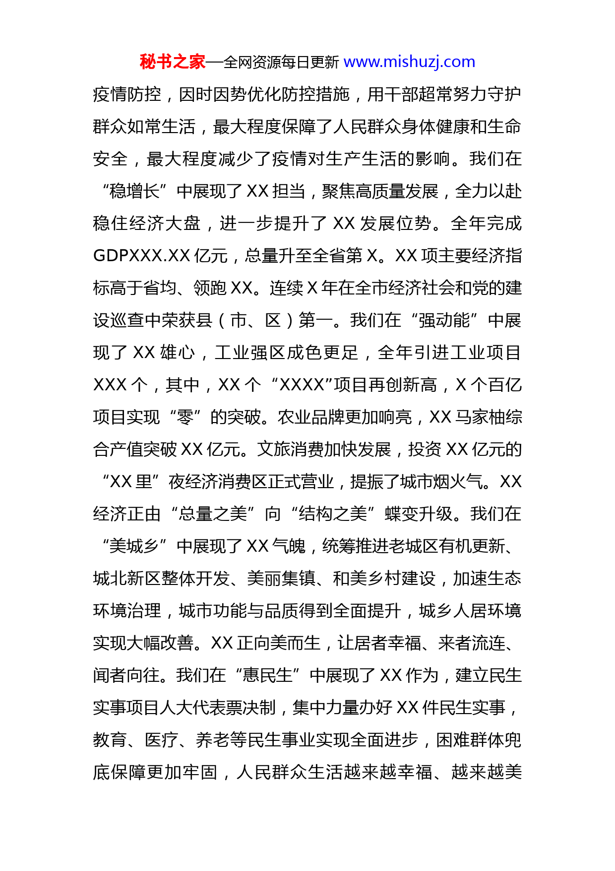 秘书之家—全网资源每日更新www.mishuzj.com在区人大会议闭幕式上的讲话各位代表、同志们:XX市XX区第XX届人民代表大会第X次会议,在全体代表和与会同志的共同努力下,圆满完成各项议程,即将胜利闭幕。会议期间,各位代表以高度的政治责任感,忠实履行宪法赋予的神圣职责,庄严行使民主权利,积极建言献策,共绘发展蓝图。大会审议通过了各项决议,完成了预定选举任务,票决了2023年度民生实事项目,凝聚了集体智慧、反映了人民意愿、契合了XX实际。会议开得很成功,是一次高举旗帜、团结民主、求真务实、鼓舞士气的大会,必将激励和动员全区上下以更加昂扬的斗志、更加饱满的激情投身XX高质量跨越式发展新征程,加快打造全市领先、全省一流的现代化强区!在此,我代表区委,对大会的圆满成功、向新当选的同志表示热烈的祝贺!对全体代表和同志们的辛勤努力表示衷心的感谢!各位代表,同志们!没有等出来的美丽,只有干出来的精彩。刚刚过去的2022年,面对前所未有的困难和挑战,我们坚决贯彻党中央“疫情要防住、经济要稳住、发展要安全”重要要求,顶住了压力、开创了新局、干出了信心。我们在“双统筹”中展现了XX温度,慎终如始抓好秘书之家—全网资源每日更新www.mishuzj.com疫情防控,因时因势优化防控措施,用干部超常努力守护群众如常生活,最大程度保障了人民群众身体健康和生命安全,最大程度减少了疫情对生产生活的影响。我们在“稳增长”中展现了XX担当,聚焦高质量发展,全力以赴稳住经济大盘,进一步提升了XX发展位势。全年完成GDPXXX.XX亿元,总量升至全省第X。XX项主要经济指标高于省均、领跑XX。连续X年在全市经济社会和党的建设巡查中荣获县(市、区)第一。我们在“强动能”中展现了XX雄心,工业强区成色更足,全年引进工业项目XXX个,其中,XX个“XXXX”项目再创新高,X个百亿项目实现“零”的突破。农业品牌更加响亮,XX马家柚综合产值突破XX亿元。文旅消费加快发展,投资XX亿元的“XX里”夜经济消费区正式营业,提振了城市烟火气。XX经济正由“总量之美”向“结构之美”蝶变升级。我们在“美城乡”中展现了XX气魄,统筹推进老城区有机更新、城北新区整体开发、美丽集镇、和美乡村建设,加速生态环境治理,城市功能与品质得到全面提升,城乡人居环境实现大幅改善。XX正向美而生,让居者幸福、来者流连、闻者向往。我们在“惠民生”中展现了XX作为,建立民生实事项目人大代表票决制,集中力量办好XX件民生实事,教育、医疗、养老等民生事业实现全面进步,困难群体兜底保障更加牢固,人民群众生活越来越幸福、越来越美秘书之家—全网资源每日更新www.mishuzj.com好。这些成绩来之不易,根本在于习近平总书记领航掌舵,根本在于习近平新时代中国特色社会主义思想科学指引;这也是全区人民奋力拼搏、团结奋斗的结果,饱含着各级人大和各位代表的辛劳、智慧和汗水。一年来,区人大及其常委会在区委领导下,围绕中心、服务大局,政治站位有高度、助推发展有力度、服务群众有温度、代表履职有热度,为全区经济社会发展作出了重要贡献。对此,区委予以充分肯定。在此,向全体人大代表和人大工作者表示衷心的感谢和崇高的敬意!各位代表、同志们!山水万程、步履不停,历史已经翻开新的一页。党的二十大擘画了以中国式现代化全面推进中华民族伟大复兴的宏伟蓝图,吹响了奋进新征程的时代号角。习近平总书记在学习贯彻党的二十大精神研讨班开班式上进一步深刻阐释了中国式现代化“是什么、干什么、怎么干”等重大问题,为我们更好推进中国式现代化指明了方向、提供了遵循。中国式现代化是我们党领导全国各族人民在长期探索和实践中历经千辛万苦、付出巨大代价取得的重大成果,我们必须倍加珍惜、始终坚持、不断拓展和深化。当前,XX经济社会发展的方位和特征、基础和条件、氛围和态势已经发生明显变化,正处于历史最好的发展时秘书之家—全网资源每日更新www.mishuzj.com期,高质量发展要求深入人心,产业振兴之势、城乡融合之势、区位质变之势、政通人和之势正在加速凸显!面对中国式现代化这张新的历史答卷,我们要坚决落实市委、市政府对XX提出的“四个排头兵”要求,始终坚持“三个事关”的工作方向,以“打头阵、当先锋、作表率”的雄心壮志,提速推进高质量跨越式发展,奋力书写好中国式现代化的XX答卷,努力创造出不负时代、不负人民的崭新业绩!打头阵、当先锋、作表率,必须以更高的站位,捍卫“两个确立”、做到“两个维护”党的二十大取得的所有成果中最重要最根本的是,明确宣示“两个确立”的决定性意义,明确了最大的政治、最大的大局、最大的原则。面向未来,我们要更加深刻领悟“两个确立”的决定性意义,更加坚定捍卫“两个确立”,始终忠诚核心、信赖核心、紧跟核心、维护核心,做到政治上绝对忠诚、思想上高度统一、意志上更加坚韧、行动上坚决有力。要始终坚持以习近平新时代中国特色社会主义思想为科学指引,全面学习、全面把握、全面落实党的二十大精神,深刻认识“三个务必”的谆谆教导和团结奋斗的时代要求,努力在深学细研中加深体悟,在入脑入心基础上坚定遵照执行。要始终胸怀“两个大局”、牢记“国之大者”、善谋“党之大计”,坚持上级秘书之