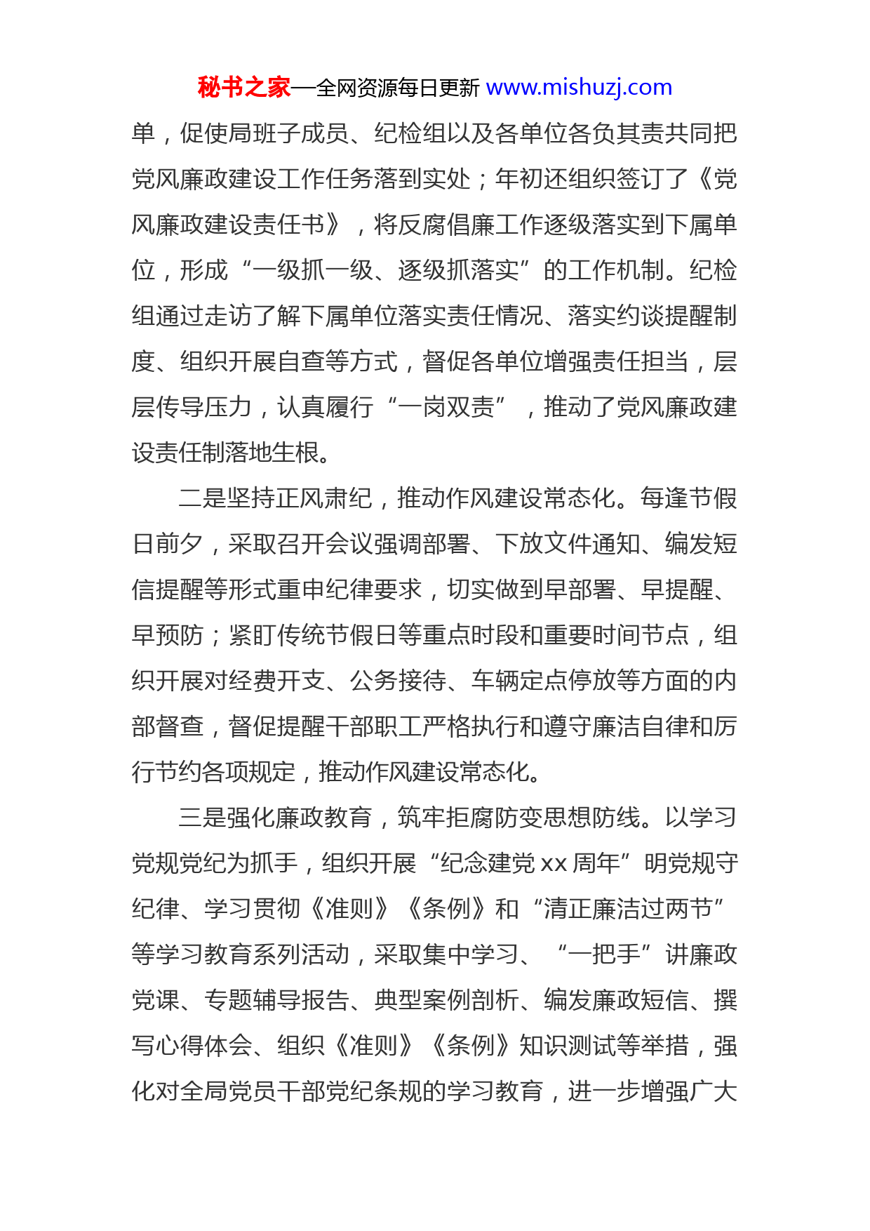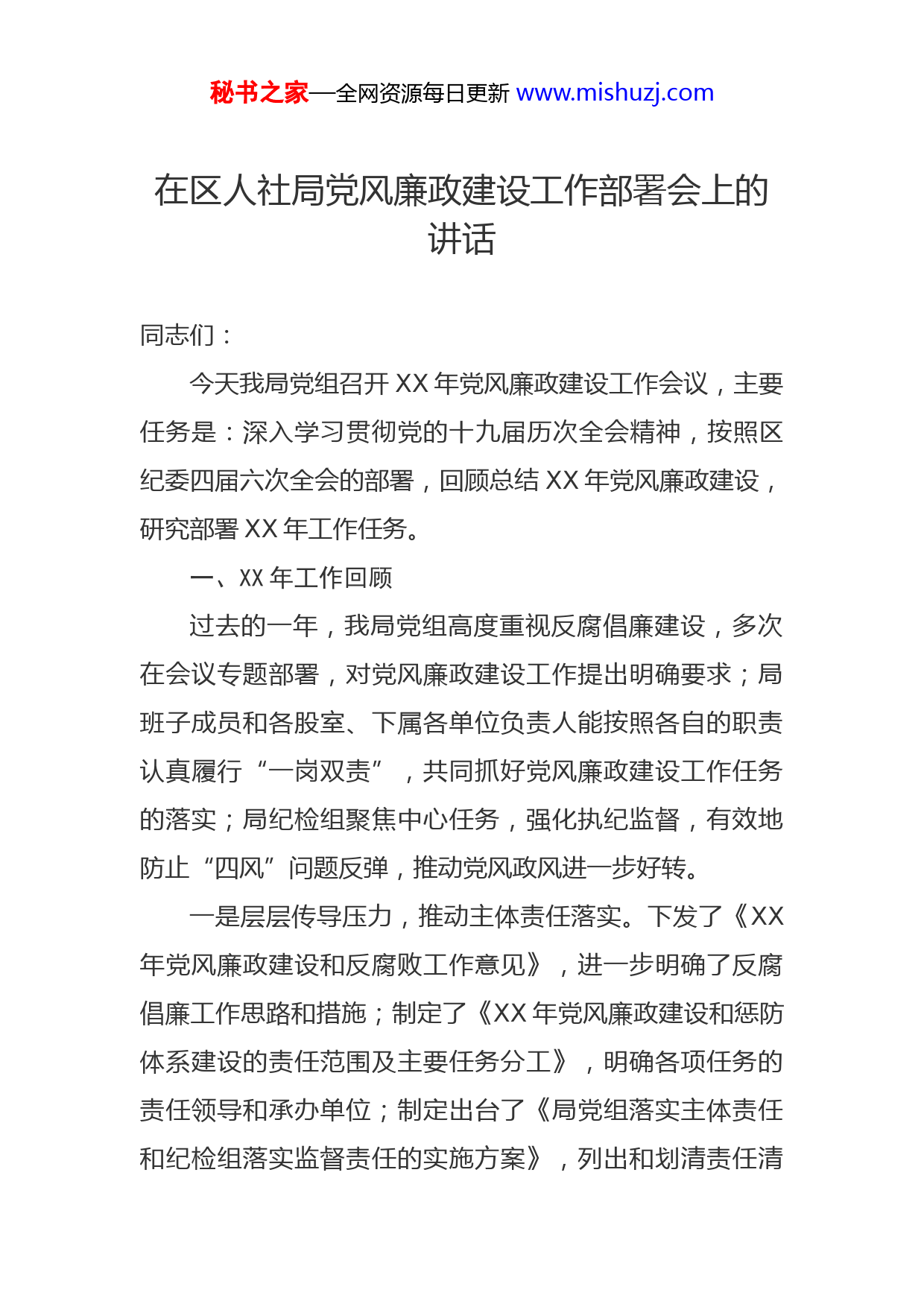 秘书之家—全网资源每日更新www.mishuzj.com在区人社局党风廉政建设工作部署会上的讲话同志们:今天我局党组召开XX年党风廉政建设工作会议,主要任务是:深入学习贯彻党的十九届历次全会精神,按照区纪委四届六次全会的部署,回顾总结XX年党风廉政建设,研究部署XX年工作任务。一、XX年工作回顾过去的一年,我局党组高度重视反腐倡廉建设,多次在会议专题部署,对党风廉政建设工作提出明确要求;局班子成员和各股室、下属各单位负责人能按照各自的职责认真履行“一岗双责”,共同抓好党风廉政建设工作任务的落实;局纪检组聚焦中心任务,强化执纪监督,有效地防止“四风”问题反弹,推动党风政风进一步好转。一是层层传导压力,推动主体责任落实。下发了《XX年党风廉政建设和反腐败工作意见》,进一步明确了反腐倡廉工作思路和措施;制定了《XX年党风廉政建设和惩防体系建设的责任范围及主要任务分工》,明确各项任务的责任领导和承办单位;制定出台了《局党组落实主体责任和纪检组落实监督责任的实施方案》,列出和划清责任清秘书之家—全网资源每日更新www.mishuzj.com单,促使局班子成员、纪检组以及各单位各负其责共同把党风廉政建设工作任务落到实处;年初还组织签订了《党风廉政建设责任书》,将反腐倡廉工作逐级落实到下属单位,形成“一级抓一级、逐级抓落实”的工作机制。纪检组通过走访了解下属单位落实责任情况、落实约谈提醒制度、组织开展自查等方式,督促各单位增强责任担当,层层传导压力,认真履行“一岗双责”,推动了党风廉政建设责任制落地生根。二是坚持正风肃纪,推动作风建设常态化。每逢节假日前夕,采取召开会议强调部署、下放文件通知、编发短信提醒等形式重申纪律要求,切实做到早部署、早提醒、早预防;紧盯传统节假日等重点时段和重要时间节点,组织开展对经费开支、公务接待、车辆定点停放等方面的内部督查,督促提醒干部职工严格执行和遵守廉洁自律和厉行节约各项规定,推动作风建设常态化。三是强化廉政教育,筑牢拒腐防变思想防线。以学习党规党纪为抓手,组织开展“纪念建党xx周年”明党规守纪律、学习贯彻《准则》《条例》和“清正廉洁过两节”等学习教育系列活动,采取集中学习、“一把手”讲廉政党课、专题辅导报告、典型案例剖析、编发廉政短信、撰写心得体会、组织《准则》《条例》知识测试等举措,强化对全局党员干部党纪条规的学习教育,进一步增强广大秘书之家—全网资源每日更新www.mishuzj.com党员干部守纪律讲规矩意识;组织全局党员干部观看《廉政中国》和《作风建设永远在路上》廉政警示电教片,收集整理了各地人社系统近年来15例《违纪违规典型案例选编》并以文件形式印发,利用身边典型案例组织党员干部深入剖析开展警示教育,进一步启示和警醒党员干部时刻紧绷廉洁自律这根弦,筑牢拒腐防变思想防线;向全局科级干部和中层干部赠送《习近平关于党风廉政建设和反腐败斗争论述摘编》廉政书籍,每月向科级干部发送“一文一警”文,开设网络反腐倡廉学习宣传专栏,编发《廉政文化宣传专刊》等,积极营造“以清廉为范、以贪奢为戒”的机关廉政文化浓厚氛围。四是注重制度建设,促进权力规范运行。制定出台局党组《议事工作规则》,进一步修订完善机关公务接待、公车管理、财务管理、考勤制度等19项机关日常管理规章制度,牵头制定了《××区国有企业招用职工管理暂行规定》、《××区机关事业单位编外工作人员招聘管理暂行规定》,完善《社保基金管理使用内控制度》、《职业技能培训管理办法》、《灵活就业困难人员社保补贴管理办法》,认真开展权力清单清理工作并主动把行政权力清单和办事流程晒在网上、挂在墙上进行公开,促进权力规范运行。五是强化执纪监督,注重从源头上预防腐败。认真履秘书之家—全网资源每日更新www.mishuzj.com行监督责任,重点围绕行政审批事项、行政处罚案件、职称评聘、人事考录、专项资金安排使用等重点环节加强对权力运行实施监督,组织开展对就业专项资金和社保基金管理使用情况的再检查,提出书面整改建议5条,并督促职能单位健全完善相关管理制度,堵塞制度漏洞,进一步规范行政行为。重点围绕人、财、物为廉政信息内容,建立廉政信息库并实施动态监督。加强纠风治理,组织开展对定点医疗服务机构专项治理活动,及时纠正和查处违规行为;认真抓好群众反映社会保障卡制发卡慢问题的整改落实工作,在我市率先建立了社会保障卡制发卡信息网络平台和便民窗口,让群众立等可取的便利,有效地破解社会保障卡“办卡难”的问题。一年来,我局在落实党风廉政建设责任制和推进惩防腐败体系建设方面做了一些工作,取得了一定成效,但同时我们也清醒地认识到,在当前反腐倡廉形势下,还存在着一些问题和不足:一是个别党员干部纪律意识淡薄,没有真正把纪律贯穿渗透到日常工作生活的各方面,使严守纪律成为自身的一种习惯,庸懒散的行为仍然不同程度存在;二是个别下属单位对新形势下党风廉政建设的新要求缺乏足够的认识和把握,存在重业务轻党建现象,对党风廉政建设责任制落实还不够到位;三是对机关党员干部教育管理监督还不够严格,工作要求和工作标准还不够高;秘书之家—全网资源