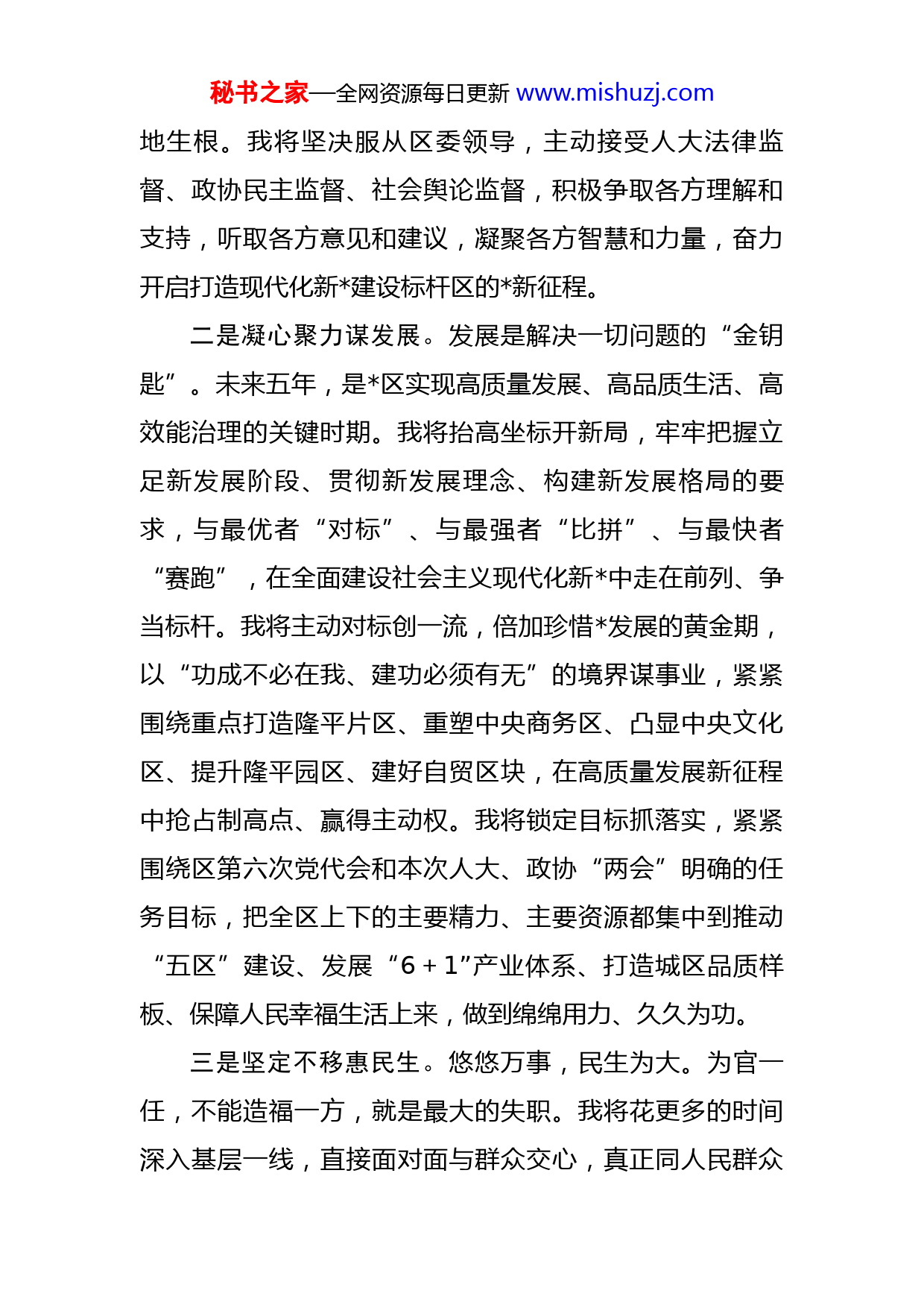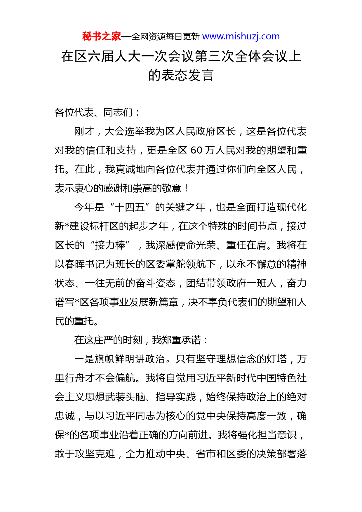 秘书之家—全网资源每日更新www.mishuzj.com在区六届人大一次会议第三次全体会议上的表态发言各位代表、同志们:刚才,大会选举我为区人民政府区长,这是各位代表对我的信任和支持,更是全区60万人民对我的期望和重托。在此,我真诚地向各位代表并通过你们向全区人民,表示衷心的感谢和崇高的敬意!今年是“十四五”的关键之年,也是全面打造现代化新建设标杆区的起步之年,在这个特殊的时间节点,接过区长的“接力棒”,我深感使命光荣、重任在肩。我将在以春晖书记为班长的区委掌舵领航下,以永不懈怠的精神状态、一往无前的奋斗姿态,团结带领政府一班人,奋力谱写区各项事业发展新篇章,决不辜负代表们的期望和人民的重托。在这庄严的时刻,我郑重承诺:一是旗帜鲜明讲政治。只有坚守理想信念的灯塔,万里行舟才不会偏航。我将自觉用习近平新时代中国特色社会主义思想武装头脑、指导实践,始终保持政治上的绝对忠诚,与以习近平同志为核心的党中央保持高度一致,确保的各项事业沿着正确的方向前进。我将强化担当意识,敢于攻坚克难,全力推动中央、省市和区委的决策部署落秘书之家—全网资源每日更新www.mishuzj.com地生根。我将坚决服从区委领导,主动接受人大法律监督、政协民主监督、社会舆论监督,积极争取各方理解和支持,听取各方意见和建议,凝聚各方智慧和力量,奋力开启打造现代化新建设标杆区的新征程。二是凝心聚力谋发展。发展是解决一切问题的“金钥匙”。未来五年,是区实现高质量发展、高品质生活、高效能治理的关键时期。我将抬高坐标开新局,牢牢把握立足新发展阶段、贯彻新发展理念、构建新发展格局的要求,与最优者“对标”、与最强者“比拼”、与最快者“赛跑”,在全面建设社会主义现代化新中走在前列、争当标杆。我将主动对标创一流,倍加珍惜发展的黄金期,以“功成不必在我、建功必须有无”的境界谋事业,紧紧围绕重点打造隆平片区、重塑中央商务区、凸显中央文化区、提升隆平园区、建好自贸区块,在高质量发展新征程中抢占制高点、赢得主动权。我将锁定目标抓落实,紧紧围绕区第六次党代会和本次人大、政协“两会”明确的任务目标,把全区上下的主要精力、主要资源都集中到推动“五区”建设、发展“6+1”产业体系、打造城区品质样板、保障人民幸福生活上来,做到绵绵用力、久久为功。三是坚定不移惠民生。悠悠万事,民生为大。为官一任,不能造福一方,就是最大的失职。我将花更多的时间深入基层一线,直接面对面与群众交心,真正同人民群众秘书之家—全网资源每日更新www.mishuzj.com站在一起、想在一起、干在一起,做到民有所呼必有所应,努力守好“人民的心”。我将用更大的力气发展民生事业,聚焦教育、医疗、文化、养老等领域短板,认真建好一批事关群众切身利益的民生项目,办好一批事关群众未来发展的民生实事,做到民有所需必有所为,努力把经济总量转化为老百姓实实在在的生活质量。我将下更大的功夫抓好民生改善,用心用情用力解决好居民停车、上楼、安全等“急难愁盼”问题,做到民有所难必有所解,努力打造人民的幸福城区、幸福的人民城区。四是清正廉洁做表率。善禁者,先禁其身而后人。我将永葆敬畏之心,严格履行政府系统全面从严治党主体责任,切实加强党风廉政建设,着力打造严守底线、严以用权的政府。我将永葆谨慎之心,从严从实抓班子,以身作则带队伍,坚持依法行政,严格按程序办事,严格按法律办事,做到以身作则、率先垂范。我将永葆淡泊之心,坚持公道正派、与人为善,以德立身、以诚待人,堂堂正正做人,清清白白为官,始终保持清廉、务实、为民的公仆本色。各位代表、同志们。是你我的,你我是的你我。站在新起点、实现新突破、开创新局面,这是时代的呼唤,更是发展的需要。我将视信任为责任,视使命为生命,用担当诠释初心、以实干推动发展,与全区干部群众一起并秘书之家—全网资源每日更新www.mishuzj.com肩作战、风雨同舟,为打造现代化新建设标杆区而努力奋斗!