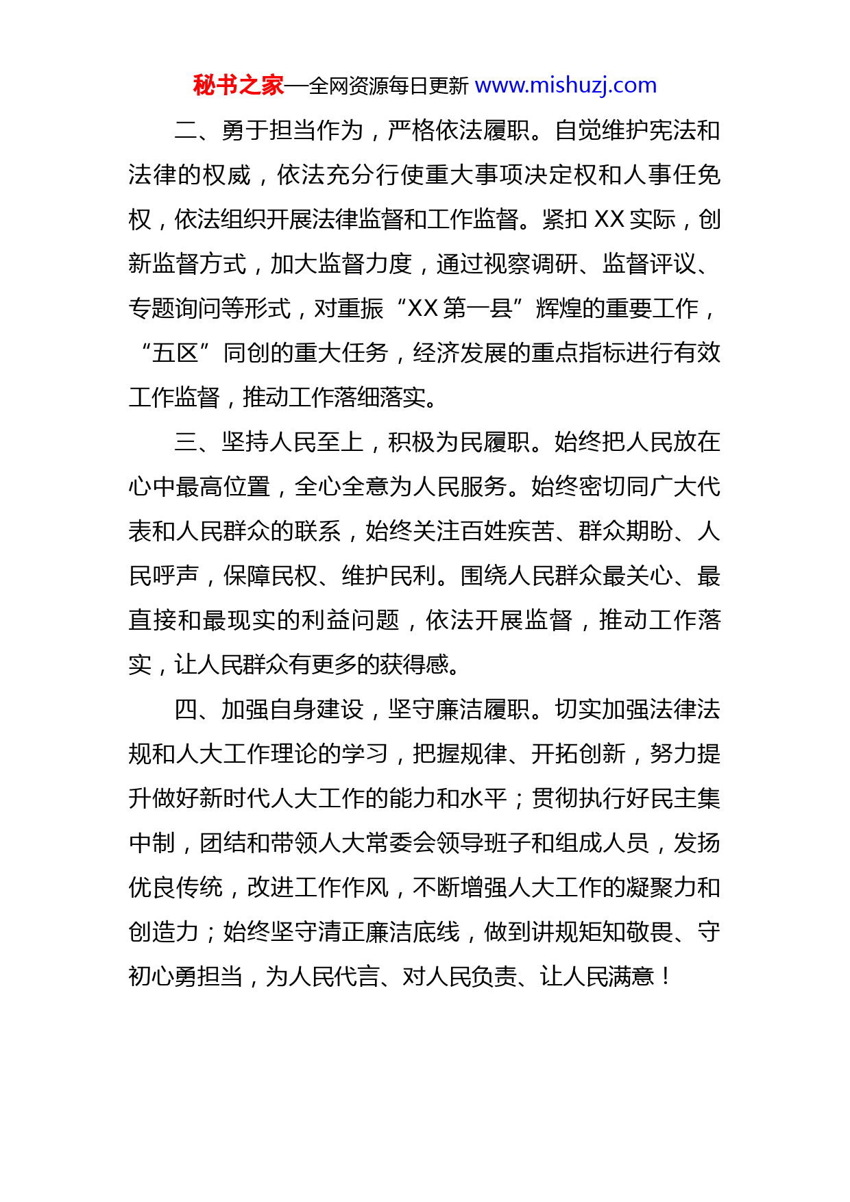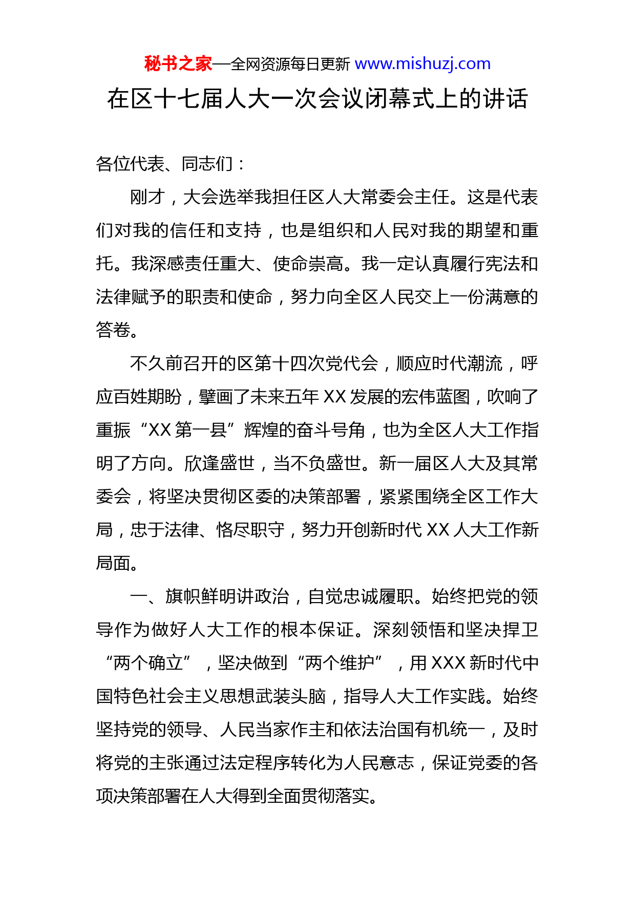 秘书之家—全网资源每日更新www.mishuzj.com在区十七届人大一次会议闭幕式上的讲话各位代表、同志们:刚才,大会选举我担任区人大常委会主任。这是代表们对我的信任和支持,也是组织和人民对我的期望和重托。我深感责任重大、使命崇高。我一定认真履行宪法和法律赋予的职责和使命,努力向全区人民交上一份满意的答卷。不久前召开的区第十四次党代会,顺应时代潮流,呼应百姓期盼,擘画了未来五年XX发展的宏伟蓝图,吹响了重振“XX第一县”辉煌的奋斗号角,也为全区人大工作指明了方向。欣逢盛世,当不负盛世。新一届区人大及其常委会,将坚决贯彻区委的决策部署,紧紧围绕全区工作大局,忠于法律、恪尽职守,努力开创新时代XX人大工作新局面。一、旗帜鲜明讲政治,自觉忠诚履职。始终把党的领导作为做好人大工作的根本保证。深刻领悟和坚决捍卫“两个确立”,坚决做到“两个维护”,用XXX新时代中国特色社会主义思想武装头脑,指导人大工作实践。始终坚持党的领导、人民当家作主和依法治国有机统一,及时将党的主张通过法定程序转化为人民意志,保证党委的各项决策部署在人大得到全面贯彻落实。秘书之家—全网资源每日更新www.mishuzj.com二、勇于担当作为,严格依法履职。自觉维护宪法和法律的权威,依法充分行使重大事项决定权和人事任免权,依法组织开展法律监督和工作监督。紧扣XX实际,创新监督方式,加大监督力度,通过视察调研、监督评议、专题询问等形式,对重振“XX第一县”辉煌的重要工作,“五区”同创的重大任务,经济发展的重点指标进行有效工作监督,推动工作落细落实。三、坚持人民至上,积极为民履职。始终把人民放在心中最高位置,全心全意为人民服务。始终密切同广大代表和人民群众的联系,始终关注百姓疾苦、群众期盼、人民呼声,保障民权、维护民利。围绕人民群众最关心、最直接和最现实的利益问题,依法开展监督,推动工作落实,让人民群众有更多的获得感。四、加强自身建设,坚守廉洁履职。切实加强法律法规和人大工作理论的学习,把握规律、开拓创新,努力提升做好新时代人大工作的能力和水平;贯彻执行好民主集中制,团结和带领人大常委会领导班子和组成人员,发扬优良传统,改进工作作风,不断增强人大工作的凝聚力和创造力;始终坚守清正廉洁底线,做到讲规矩知敬畏、守初心勇担当,为人民代言、对人民负责、让人民满意!