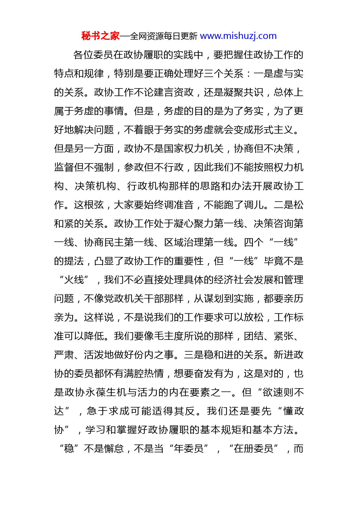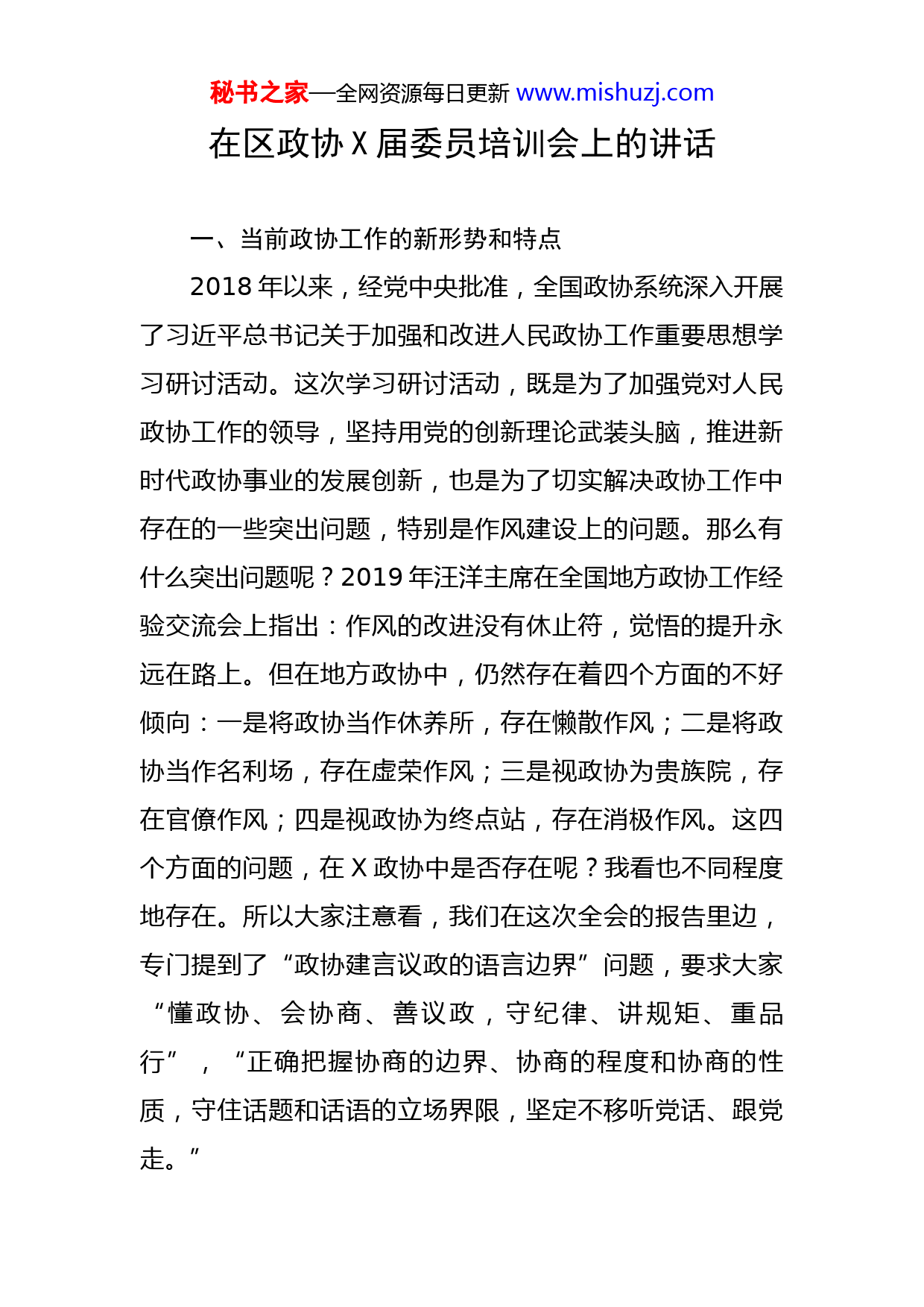 秘书之家—全网资源每日更新www.mishuzj.com在区政协X届委员培训会上的讲话一、当前政协工作的新形势和特点2018年以来,经党中央批准,全国政协系统深入开展了习近平总书记关于加强和改进人民政协工作重要思想学习研讨活动。这次学习研讨活动,既是为了加强党对人民政协工作的领导,坚持用党的创新理论武装头脑,推进新时代政协事业的发展创新,也是为了切实解决政协工作中存在的一些突出问题,特别是作风建设上的问题。那么有什么突出问题呢?2019年汪洋主席在全国地方政协工作经验交流会上指出:作风的改进没有休止符,觉悟的提升永远在路上。但在地方政协中,仍然存在着四个方面的不好倾向:一是将政协当作休养所,存在懒散作风;二是将政协当作名利场,存在虚荣作风;三是视政协为贵族院,存在官僚作风;四是视政协为终点站,存在消极作风。这四个方面的问题,在X政协中是否存在呢?我看也不同程度地存在。所以大家注意看,我们在这次全会的报告里边,专门提到了“政协建言议政的语言边界”问题,要求大家“懂政协、会协商、善议政,守纪律、讲规矩、重品行”,“正确把握协商的边界、协商的程度和协商的性质,守住话题和话语的立场界限,坚定不移听党话、跟党走。”秘书之家—全网资源每日更新www.mishuzj.com各位委员在政协履职的实践中,要把握住政协工作的特点和规律,特别是要正确处理好三个关系:一是虚与实的关系。政协工作不论建言资政,还是凝聚共识,总体上属于务虚的事情。但是,务虚的目的是为了务实,为了更好地解决问题,不着眼于务实的务虚就会变成形式主义。但是另一方面,政协不是国家权力机关,协商但不决策,监督但不强制,参政但不行政,因此我们不能按照权力机构、决策机构、行政机构那样的思路和办法开展政协工作。这根弦,大家要始终调准音,不能跑了调儿。二是松和紧的关系。政协工作处于凝心聚力第一线、决策咨询第一线、协商民主第一线、区域治理第一线。四个“一线”的提法,凸显了政协工作的重要性,但“一线”毕竟不是“火线”,我们不必直接处理具体的经济社会发展和管理问题,不像党政机关干部那样,从谋划到实施,都要亲历亲为。这样说,不是说我们的工作要求可以放松,工作标准可以降低。我们要像毛主度所说的那样,团结、紧张、严肃、活泼地做好份内之事。三是稳和进的关系。新进政协的委员都怀有满腔热情,想要奋发有为,这是对的,也是政协永葆生机与活力的内在要素之一。但“欲速则不达”,急于求成可能适得其反。我们还是要先“懂政协”,学习和掌握好政协履职的基本规矩和基本方法。“稳”不是懈怠,不是当“年委员”,“在册委员”,而秘书之家—全网资源每日更新www.mishuzj.com是要厚积薄发,就是报告中提到的“建言建在需要时、议政议到点子上、监督监在关键处。”二、六点希望一是重品行。政协委员是从各界别人士中推荐出来的优秀代表,我认为这个“优秀”首先就应该是道德、人品方面的,我们在这方面不能出任何的问题。为什么要这么提?因为过去在政协委员中出现过问题,有半路上被除名的。还有的虽然没被除名,但在社会上的口碑也并不好,认可度不高。我们作为政协委员,要十分注意自己在社会上的形象,如果不注意形象,那你本人就会遭到别人的非议,“政协委员”这块牌子也会因你的言行而蒙尘。作为政协委员,“大德”要修,“小善”更要为,心里要时刻绷紧“形象”、“口碑”这些弦,要从点点滴滴注重自己的品行。品行问题重在个人修养、内心修为,这是一个独善其身的事,是一个慎微、慎独的事,是一个人立于社会第一重要的事。二是守纪律。我不知道大家是否有一种既成的概念:政协是个轻松愉快、比较松散的组织,纪律性一向不是很强?按说呢,委员出席会议、参加视察调研、撰写提案、会议发言,都是有要求的,但是,不落实也没大事、也行。确实有的委员把政协当成了“俱乐部”,想来就来、想走就走,加入政协时很积极,等挂上委员的“名签”秘书之家—全网资源每日更新www.mishuzj.com后,却不按要求履行委员的职责。所以,现在我们就要用“矫枉过正”的方法,加强委员队伍的纪律建设,把过去一些不守规矩、不守纪律的思想、观念、做法纠正过来。刚才我们一起观看了警示教育片《警钟长鸣》,大家可能会觉得那些事离自己很远,自己犯不了那样的错误,其实不然,错误有大小,规矩日日多,一不留神可能就犯了错误。普通委员要遵守纪律,候选人、党员干部、各方有影响力的代表人物更应该遵守纪律。我真的不希望我们今天坐在这里看片子的人,将来成了片子里被看的人。为了加强纪律性,明年我们也要制定《加强对委员履职考核的办法》,履职好的加分,履职不好的、违反纪律的扣分,年底总算账。三是勤学习。人民政协历来重视学习。1954年12月,毛主席把学习列为政协的五大任务之一,他要求政协委员“在自愿的基础上学习马列主义,进行思想改造。”《政协章程》也明确规定:学习,是政协委员的一项基本任务。那么作为新委员,我们主要学习什么呢?需要学的东西太多了,在这里我建议大家先紧着三方面内容学:一要学习政治理论。主要包括:习近平新时代中国特色社会主义思想,中共十九大和十九届历次全会精神,习近平总书记在中央政协工作上的讲话,