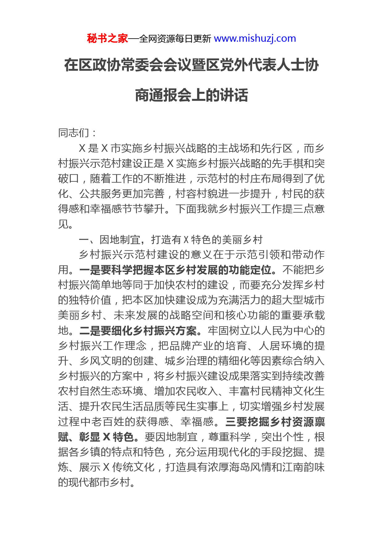 秘书之家—全网资源每日更新www.mishuzj.com在区政协常委会会议暨区党外代表人士协商通报会上的讲话同志们:X是X市实施乡村振兴战略的主战场和先行区,而乡村振兴示范村建设正是X实施乡村振兴战略的先手棋和突破口,随着工作的不断推进,示范村的村庄布局得到了优化、公共服务更加完善,村容村貌进一步提升,村民的获得感和幸福感节节攀升。下面我就乡村振兴工作提三点意见。一、因地制宜,打造有X特色的美丽乡村乡村振兴示范村建设的意义在于示范引领和带动作用。一是要科学把握本区乡村发展的功能定位。不能把乡村振兴简单地等同于加快农村的建设,而要充分发挥乡村的独特价值,把本区加快建设成为充满活力的超大型城市美丽乡村、未来发展的战略空间和核心功能的重要承载地。二是要细化乡村振兴方案。牢固树立以人民为中心的乡村振兴工作理念,把品牌产业的培育、人居环境的提升、乡风文明的创建、城乡治理的精细化等因素综合纳入乡村振兴的方案中,将乡村振兴建设成果落实到持续改善农村自然生态环境、增加农民收入、丰富村民精神文化生活、提升农民生活品质等民生实事上,切实增强乡村发展过程中老百姓的获得感、幸福感。三要挖掘乡村资源禀赋、彰显X特色。要因地制宜,尊重科学,突出个性,根据各乡镇的特点和特色,充分运用现代化的手段挖掘、提炼、展示X传统文化,打造具有浓厚海岛风情和江南韵味的现代都市乡村。秘书之家—全网资源每日更新www.mishuzj.com二、开拓创新,用产业振兴支撑乡村发展通过持续建设,我区农村的环境面貌有了很大的提升,老百姓的人居环境有了相当大的改善,生态岛的招牌也获得了广泛的认可,世界级生态岛的品牌价值无可估量。我们要立足实际,进一步做好产业振兴的文章,打造有造血机制的、有旺盛生命力的现代乡村。一是紧盯问题,创新培育乡村特色产业。要尊重各村的差异和发展趋势,摸清家底,充分发掘自然景观、地域资源、传统文化,创新培育特色产业;要支持合作社企业做专做强,引导生态创业型企业快速发展,加快打造更多知名品牌。二是创新渠道,进一步发展文旅融合产业。要充分利用花博盛会举办的契机和大型会展的溢出效应,创新开展特色活动,充分展示我区优越的区位条件、人文风貌和生态环境质量,积极吸引绿色、生态、创新型外部投资,把我区文旅结合产业做大做强。三是全方位做好各项保障工作。要突出政府部门的管理服务职能,加快补充出台、严格落地落实有关扶持生态岛产业发展的政策;要加强对行业的组织引导,尽快建立契合生态岛品牌和满足超大型城市居民需求的农产品分级标准,加快健全X生态农产品标准化生产、包装体系,严格农产品产销一体化的溯源,严守农产品种源和产品品质、安全,进一步提升生态岛品牌的市场辨识度和知名度;要综合运用线上线下方式,加快建立蔬菜、花卉、文化旅游产品交易市场,为本区民众和企业提供专门的平台服务。三、广泛参与,汇聚合力推进乡村振兴一是发动村民,汇聚乡村发展合力。村民是乡村振兴的基础,要加强村民职业技能培训,引导村民自我教育、自我提高,提升乡村治理能力和参与乡村振兴建设工作的能力;要多让农民发声、多听群众意见,避免“干部干、秘书之家—全网资源每日更新www.mishuzj.com百姓看”,充分吸收群众意见;要在“五棚”整治、美丽庭园建设、乡风文明创建等方面建章立制,把村规民约与奖惩挂钩,建立起一定水平的激励和保障机制,营造自己的家园自己爱、自己建、自己管、自己护,人人争当主人、人人争当主角的浓厚氛围,引导村民广泛参与,把农村建设成X老百姓真正想要的美丽家园、幸福乐园。二是优化人才政策,为乡村振兴提供人才支撑。要积极吸引乡村振兴人才返乡回乡入乡。既要鼓励生于X、长于X,对本区情况熟悉,与家乡群众亲近,怀有浓厚乡土情怀的人才返崇留崇,又要鼓励优秀外来人才入崇。凡是懂得农业技术、了解农民想法、热爱农村工作,能在X扎下根、稳下心的人才,都要积极发挥作用。三是完善基层治理,激发乡村振兴活力。要发挥村级党组织的组织、引领功能,打造有力的乡村振兴基层组织架构,激励乡镇主动担责,抓紧抓实抓细乡村振兴推进工作;要坚持乡村自治、法治与德治相结合,积极推广政协协商与基层协商有效衔接等基层治理经验,充分调动乡贤、群团组织等乡村各群体参与乡村振兴规划、村级事务管理、农村经济发展的积极性和主动性,激发我区农村振兴的活力。各位委员、同志们,希望大家在各自岗位上继续努力、不懈奋斗,不断推进X乡村振兴建设工作,不断推进X世界级生态岛的建设。