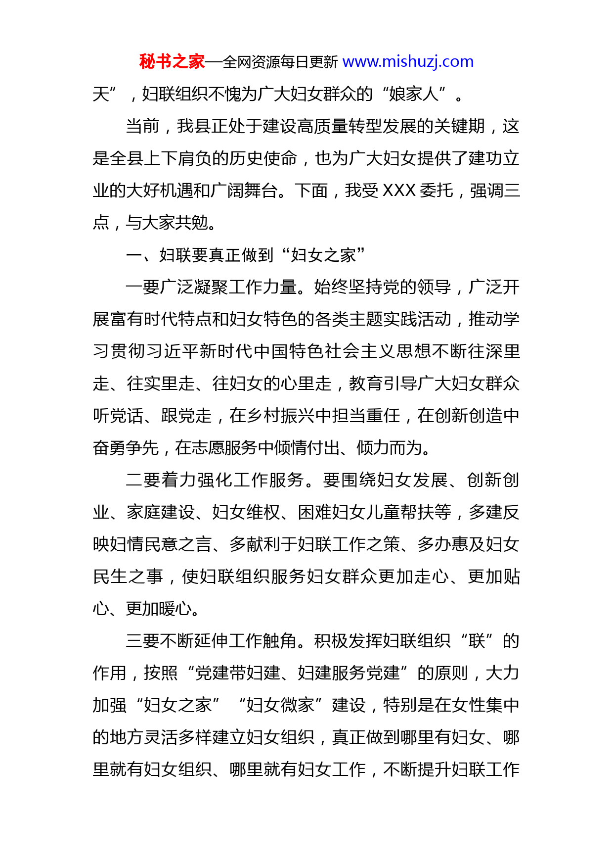 秘书之家—全网资源每日更新www.mishuzj.com在县妇女代表大会上的讲话尊敬的XX主席,各位代表、同志们:今天我们隆重召开XX县第XX次妇女代表大会,这是我县妇女政治生活中的一件大事,也是展现全县妇女新风貌,推动妇女事业新发展的一次盛会。在此,我谨代表中共XX县委,向大会的召开表示热烈的祝贺!向亲临大会指导的市妇联XXX主席表示诚挚的欢迎和衷心的感谢!向出席大会的各位代表,并通过你们向全县各条战线上的广大妇女同志致以亲切的问候和崇高的敬意!刚才,XX主席作了重要讲话,不仅给大会送来了热烈的祝贺和亲切的慰问,也对我县妇联工作给予了高度评价,更对全县妇联组织提出了新的更高的要求。希望大家认真学习领会,坚决贯彻落实。县第XX次妇女代表大会以来,全县各级妇联组织在市妇联的精心指导和县委、县政府的坚强领导下,始终围绕中心、服务大局,在强化妇女思想政治引领、推动妇女创新创业、维护妇女儿童合法权益、深化家庭教育服务和妇联组织的改革等各个方面做了大量的工作。广大妇女始终以奋发向上的姿态、自强不息的精神,积极投身各个领域、各条战线,创造了可喜成绩,作出重要贡献。可以说,全县广大妇女不愧为推动经济社会发展的“半边秘书之家—全网资源每日更新www.mishuzj.com天”,妇联组织不愧为广大妇女群众的“娘家人”。当前,我县正处于建设高质量转型发展的关键期,这是全县上下肩负的历史使命,也为广大妇女提供了建功立业的大好机遇和广阔舞台。下面,我受XXX委托,强调三点,与大家共勉。一、妇联要真正做到“妇女之家”一要广泛凝聚工作力量。始终坚持党的领导,广泛开展富有时代特点和妇女特色的各类主题实践活动,推动学习贯彻习近平新时代中国特色社会主义思想不断往深里走、往实里走、往妇女的心里走,教育引导广大妇女群众听党话、跟党走,在乡村振兴中担当重任,在创新创造中奋勇争先,在志愿服务中倾情付出、倾力而为。二要着力强化工作服务。要围绕妇女发展、创新创业、家庭建设、妇女维权、困难妇女儿童帮扶等,多建反映妇情民意之言、多献利于妇联工作之策、多办惠及妇女民生之事,使妇联组织服务妇女群众更加走心、更加贴心、更加暖心。三要不断延伸工作触角。积极发挥妇联组织“联”的作用,按照“党建带妇建、妇建服务党建”的原则,大力加强“妇女之家”“妇女微家”建设,特别是在女性集中的地方灵活多样建立妇女组织,真正做到哪里有妇女、哪里就有妇女组织、哪里就有妇女工作,不断提升妇联工作秘书之家—全网资源每日更新www.mishuzj.com的吸引力、凝聚力和影响力。二、广大妇女要努力做到“巾帼不让须眉”一要做内外皆美的引领者。新时代的女性之美,不在于颜值高低,也不在于衣着打扮,更在于展现出的才华和从内到外散发出的气质。在座的广大妇女要在提升素养、性格修养、品格涵养上狠下功夫。认识自己,相信自己,提高自己,热爱学习,努力学习,终身学习,真正成为聪慧贤淑、全面发展、秀外慧中的新时代魅力女性。二要做文明风尚的倡导者。广大妇女要从自己做起,从家庭教育做起,从尊老爱幼做起,从力所能及的事情做起,做文明古城的宣传者、保护者,让清风正气、让正能量撒满古城和乡村的角角落落。三、各级党组织要坚决当好坚强后盾一要树导向,营造良好的工作氛围。广泛宣传男女平等的基本国策,大力消除“重男轻女”“男尊女卑”等封建思想和陈旧观念;广泛宣传事关广大妇女群众的法律法规,引导广大妇女切实拿起法律的武器维护自身权益;广泛宣传各行各业涌现出的先进妇女典型,激励更多妇女姐妹们建功立业。二要搭平台,让优秀女干部脱颖而出。广大妇女中蕴藏着极大的聪明才智,我们党委政府有责任、有义务把她们中的佼佼者识别出来、选拔出来,精心培养、大胆使秘书之家—全网资源每日更新www.mishuzj.com用。县委将进一步加强后备干部人才库建设,进一步加大女干部的培养和选拔力度,配齐配强年轻女干部,最大限度地挖掘潜能、发挥作用。三要强保障,积极为妇女工作排忧解难。县委、县政府会一如既往地重视妇女工作,大力支持全县各级妇女组织履行工作职责,及时研究解决妇女工作中的困难问题,努力营造尊重妇女、关心妇女事业、支持妇女工作的良好氛围。各级党组织、各级各部门要把全面推进妇女事业和妇女工作摆在更加突出位置,更加重视妇女工作,更加关心妇女工作,更加支持和推动妇女工作,确保妇女在政治、经济、文化、社会和家庭等方面的权利得到充分实现。各位代表、同志们!伟大的时代激扬巾帼的风采,宏伟的事业成就美好的未来。让我们更加紧密地团结在以习近平同志为核心的党中央周围,凝心聚力、开拓进取,奋力开创全县妇女事业发展新局面,为全方位推进我县高质量转型发展作出新的更大贡献!最后,预祝本次大会取得圆满成功!祝各位代表、广大妇女同志们永远青春靓丽、身体健康、事业顺利、阖家幸福!谢谢大家!