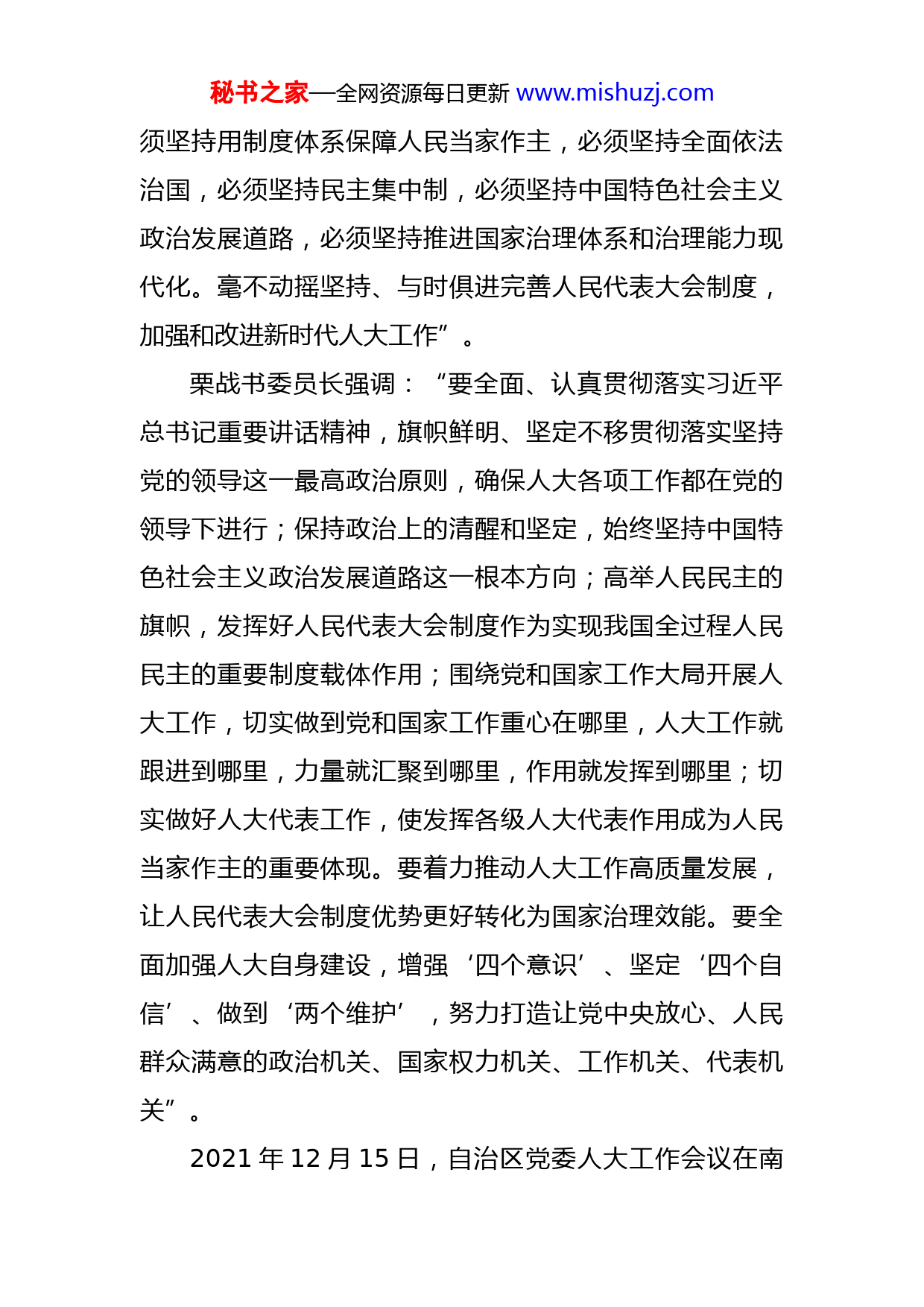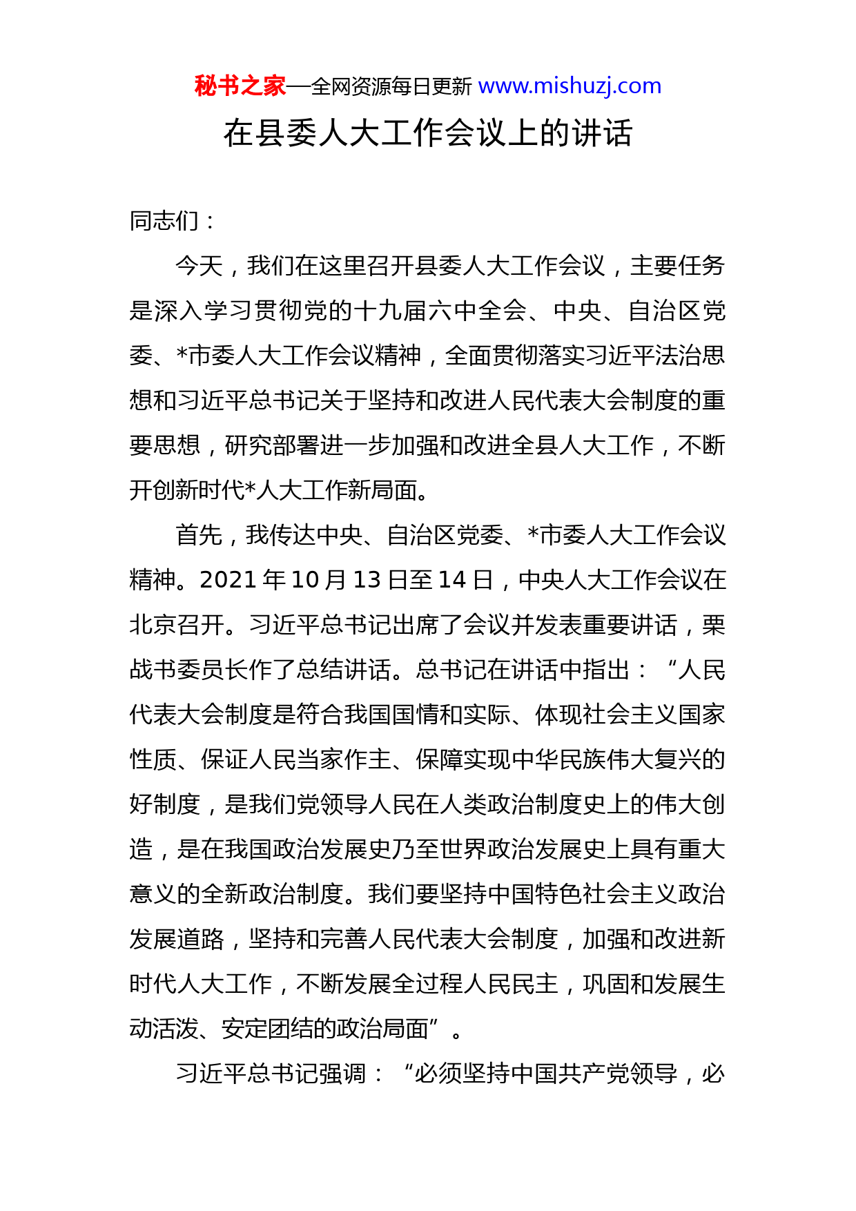 秘书之家—全网资源每日更新www.mishuzj.com在县委人大工作会议上的讲话同志们:今天,我们在这里召开县委人大工作会议,主要任务是深入学习贯彻党的十九届六中全会、中央、自治区党委、市委人大工作会议精神,全面贯彻落实习近平法治思想和习近平总书记关于坚持和改进人民代表大会制度的重要思想,研究部署进一步加强和改进全县人大工作,不断开创新时代人大工作新局面。首先,我传达中央、自治区党委、市委人大工作会议精神。2021年10月13日至14日,中央人大工作会议在北京召开。习近平总书记出席了会议并发表重要讲话,栗战书委员长作了总结讲话。总书记在讲话中指出:“人民代表大会制度是符合我国国情和实际、体现社会主义国家性质、保证人民当家作主、保障实现中华民族伟大复兴的好制度,是我们党领导人民在人类政治制度史上的伟大创造,是在我国政治发展史乃至世界政治发展史上具有重大意义的全新政治制度。我们要坚持中国特色社会主义政治发展道路,坚持和完善人民代表大会制度,加强和改进新时代人大工作,不断发展全过程人民民主,巩固和发展生动活泼、安定团结的政治局面”。习近平总书记强调:“必须坚持中国共产党领导,必秘书之家—全网资源每日更新www.mishuzj.com须坚持用制度体系保障人民当家作主,必须坚持全面依法治国,必须坚持民主集中制,必须坚持中国特色社会主义政治发展道路,必须坚持推进国家治理体系和治理能力现代化。毫不动摇坚持、与时俱进完善人民代表大会制度,加强和改进新时代人大工作”。栗战书委员长强调:“要全面、认真贯彻落实习近平总书记重要讲话精神,旗帜鲜明、坚定不移贯彻落实坚持党的领导这一最高政治原则,确保人大各项工作都在党的领导下进行;保持政治上的清醒和坚定,始终坚持中国特色社会主义政治发展道路这一根本方向;高举人民民主的旗帜,发挥好人民代表大会制度作为实现我国全过程人民民主的重要制度载体作用;围绕党和国家工作大局开展人大工作,切实做到党和国家工作重心在哪里,人大工作就跟进到哪里,力量就汇聚到哪里,作用就发挥到哪里;切实做好人大代表工作,使发挥各级人大代表作用成为人民当家作主的重要体现。要着力推动人大工作高质量发展,让人民代表大会制度优势更好转化为国家治理效能。要全面加强人大自身建设,增强‘四个意识’、坚定‘四个自信’、做到‘两个维护’,努力打造让党中央放心、人民群众满意的政治机关、国家权力机关、工作机关、代表机关”。2021年12月15日,自治区党委人大工作会议在南秘书之家—全网资源每日更新www.mishuzj.com宁召开,自治区党委书记出席会议并讲话,强调:“要坚持以习近平新时代中国特色社会主义思想为指导,深入学习贯彻十九大和十九届历次全会精神,全面贯彻落实习近平总书记在中央人大工作会议上的重要讲话精神和会议部署要求,不断丰富和发展人民代表大会制度的广西实践,进一步加强和改进新时代广西人大工作,为凝心聚力建设新时代中国特色社会主义壮美广西作出新的更大贡献”。2022年3月18日,市召开市委人大工作会议,市委书记出席会议并讲话。他指出,全市上下要始终坚持用习近平新时代中国特色社会主义思想统揽和指导人大工作,深刻理解把握党的十九届六中全会的重大意义、中央人大工作会议的精神实质和自治区党委人大工作会议的部署要求,不断增强对坚持和完善人民代表大会制度的历史自信、制度自信和政治定力,把党百年奋斗积累的宝贵历史经验运用到新时代人大工作中,紧扣全市发展大局谋划和推进人大工作,推动人民代表大会制度在更好落细落实、完善发展。要始终坚持党的全面领导这一最高政治原则,持续强化党的创新理论武装,深刻领悟“两个确立”的决定性意义,认真践行“三个善于”,积极建设“四个机关”,把坚持“两个确立”、做到“两个维护”贯穿人大工作各方面全过程,坚定不移走党领导的人民广泛参与和享有的民主政治发展道路,确保人民代表大会制度的实践秘书之家—全网资源每日更新www.mishuzj.com始终沿着正确政治方向前进,确保党中央决策部署到哪里,人大工作就跟进到哪里,人大职能就发挥到哪里。书记强调,进入“十四五”,加快推动高质量发展,迫切需要发挥好人民代表大会制度的优势作用,把市委的决策部署转化为全市人民的共同意志和统一行动。要在学习贯彻实施宪法上持续发力,完善学习宣传和贯彻实施宪法的工作机制,深入推进法治建设。要在提高立法质量上聚焦发力,深入推进科学立法、民主立法、依法立法,使所立每一项法规都符合宪法精神、反映人民意愿、得到人民拥护。要在实施正确、有效、依法监督上精准发力,以小切口监督推动解决制约经济社会发展的突出矛盾和问题,更好发挥人大监督在党和国家监督体系中的重要作用。要在依法做好决定和任免工作上协同发力,抓好重大事项决定和人事任免,通过法定形式反映党委决策意图和人民意志。要在充分发挥人大代表作用上创新发力,加强和人大代表、人民群众的联系,更好地接地气、察民情、聚民智、惠民生。同志们,近年来,县人大及其常委会始终坚持正确的政治方向,贯彻落实好县委的各项决策部署,认真履行宪法和法律赋予的监督权、重大事项决定权和选举任