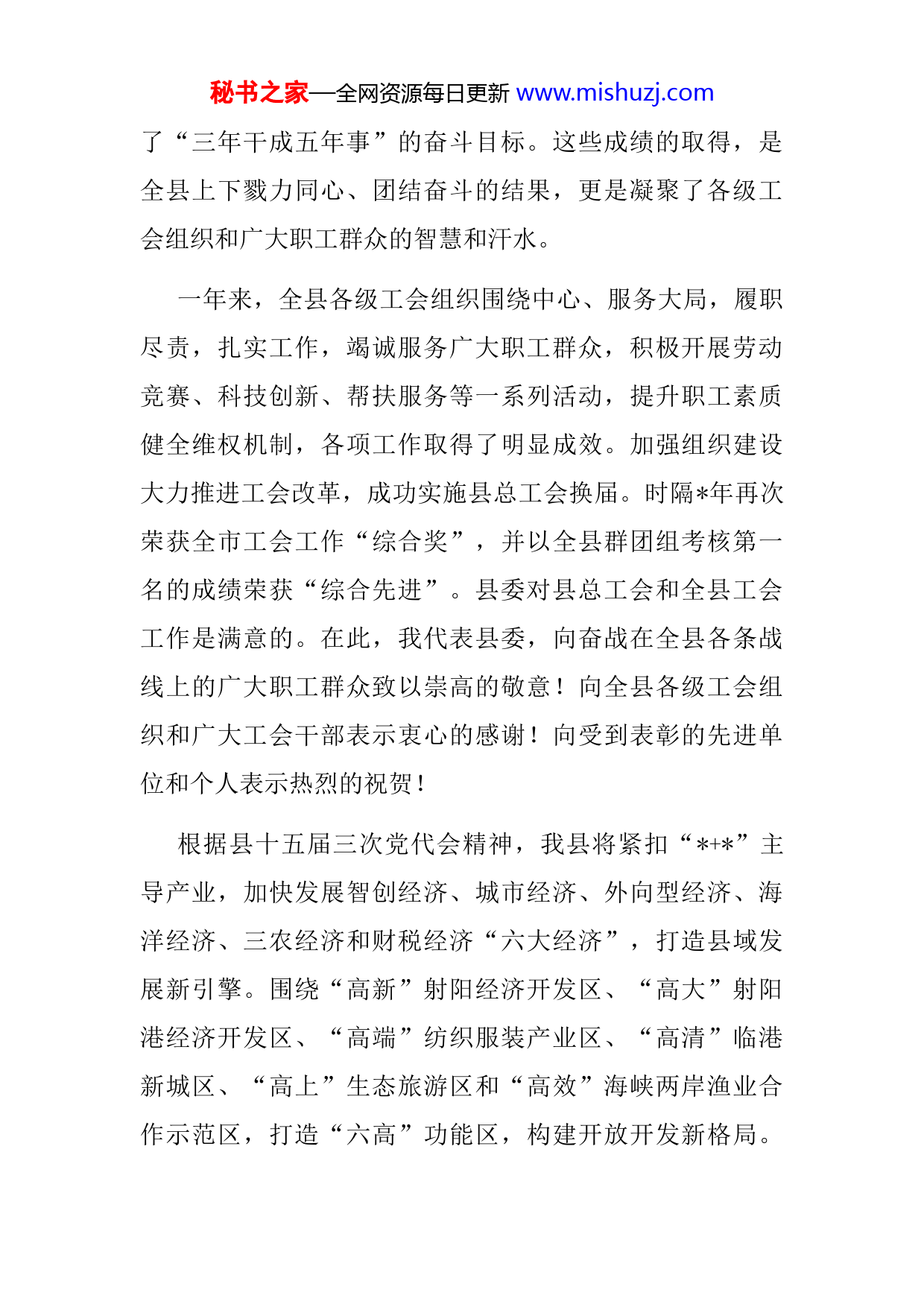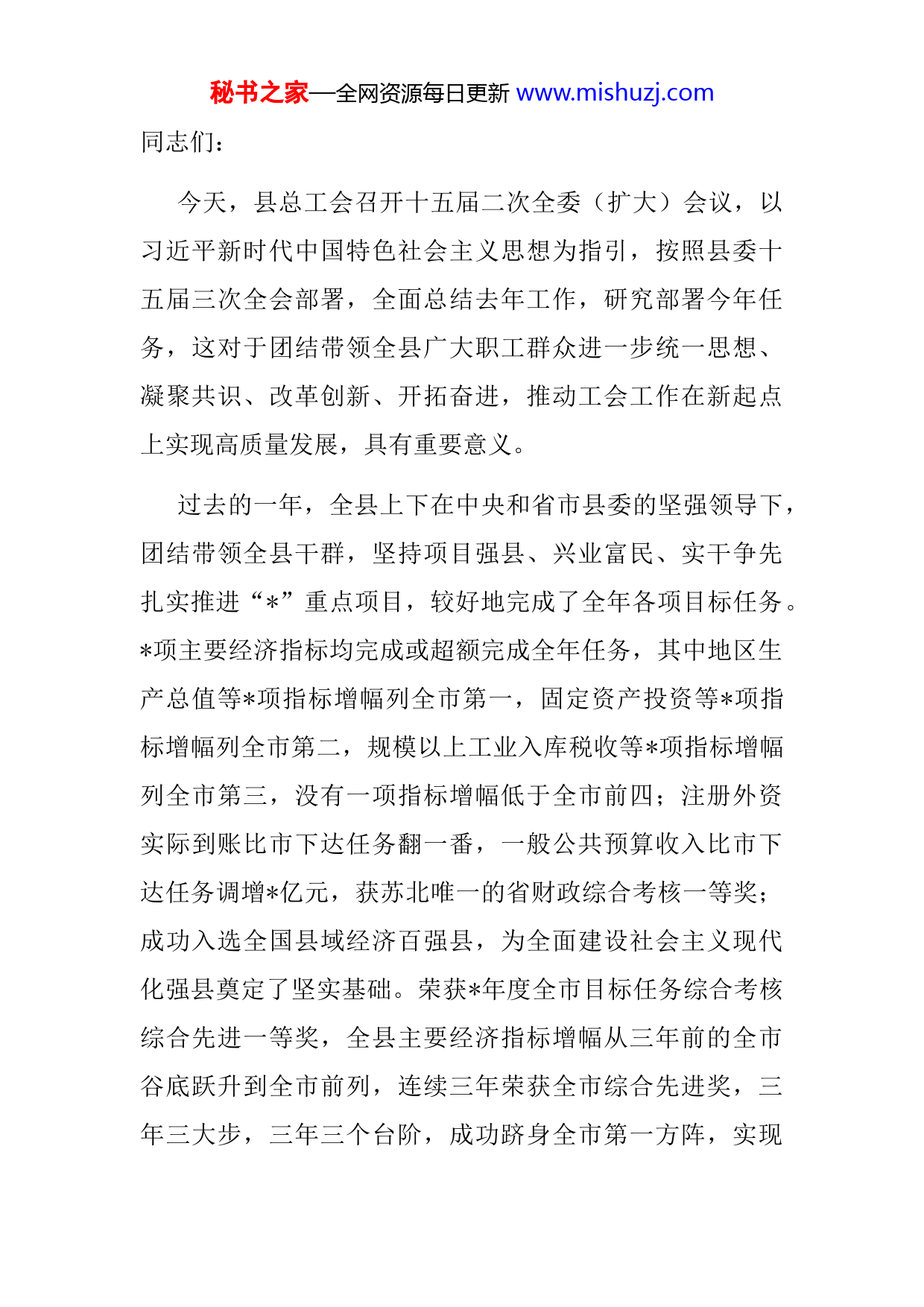 秘书之家—全网资源每日更新www.mishuzj.com同志们:今天,县总工会召开十五届二次全委(扩大)会议,以习近平新时代中国特色社会主义思想为指引,按照县委十五届三次全会部署,全面总结去年工作,研究部署今年任务,这对于团结带领全县广大职工群众进一步统一思想、凝聚共识、改革创新、开拓奋进,推动工会工作在新起点上实现高质量发展,具有重要意义。过去的一年,全县上下在中央和省市县委的坚强领导下,团结带领全县干群,坚持项目强县、兴业富民、实干争先扎实推进“”重点项目,较好地完成了全年各项目标任务。项主要经济指标均完成或超额完成全年任务,其中地区生产总值等项指标增幅列全市第一,固定资产投资等项指标增幅列全市第二,规模以上工业入库税收等项指标增幅列全市第三,没有一项指标增幅低于全市前四;注册外资实际到账比市下达任务翻一番,一般公共预算收入比市下达任务调增亿元,获苏北唯一的省财政综合考核一等奖;成功入选全国县域经济百强县,为全面建设社会主义现代化强县奠定了坚实基础。荣获年度全市目标任务综合考核综合先进一等奖,全县主要经济指标增幅从三年前的全市谷底跃升到全市前列,连续三年荣获全市综合先进奖,三年三大步,三年三个台阶,成功跻身全市第一方阵,实现秘书之家—全网资源每日更新www.mishuzj.com了“三年干成五年事”的奋斗目标。这些成绩的取得,是全县上下戮力同心、团结奋斗的结果,更是凝聚了各级工会组织和广大职工群众的智慧和汗水。一年来,全县各级工会组织围绕中心、服务大局,履职尽责,扎实工作,竭诚服务广大职工群众,积极开展劳动竞赛、科技创新、帮扶服务等一系列活动,提升职工素质健全维权机制,各项工作取得了明显成效。加强组织建设大力推进工会改革,成功实施县总工会换届。时隔年再次荣获全市工会工作“综合奖”,并以全县群团组考核第一名的成绩荣获“综合先进”。县委对县总工会和全县工会工作是满意的。在此,我代表县委,向奋战在全县各条战线上的广大职工群众致以崇高的敬意!向全县各级工会组织和广大工会干部表示衷心的感谢!向受到表彰的先进单位和个人表示热烈的祝贺!根据县十五届三次党代会精神,我县将紧扣“+”主导产业,加快发展智创经济、城市经济、外向型经济、海洋经济、三农经济和财税经济“六大经济”,打造县域发展新引擎。围绕“高新”射阳经济开发区、“高大”射阳港经济开发区、“高端”纺织服装产业区、“高清”临港新城区、“高上”生态旅游区和“高效”海峡两岸渔业合作示范区,打造“六高”功能区,构建开放开发新格局。秘书之家—全网资源每日更新www.mishuzj.com着力营造优良的交通环境、法治环境、诚信环境、政务环境、人文环境和生态环境“六优”营商环境,营造展现和谐有序新形象。深化五项改革,聚焦重点领域和关键环节深化农业农村改革、国资国企改革、行政审批制度改革、投融资改革和园区体制机制改革,增强经济发展新动能,推动改革全面提速、全面发力。稳步提升收入质量,全面提升教育质量,加快提升卫生质量,不断提升文化质量,持续提升生活质量等五个方面民生质量,满足人民群众新期待,努力让发展更有温度、幸福更有质感。建设五好特色镇村,深入实施乡村振兴战略,着力做特“一镇两园”加快建设“美丽乡村”,全面提升基层治理水平,大力推进乡风文明建设,焕发强村富民新气象。希望全县各级工会组织主动融入中心,担当作为、开拓进取,不断开创工会工作新局面。借此机会,我就做好今年工会工作,提四点要求:一、敢于担当,直面挑战,切实担负起团结引导广大职工群众听党话、跟党走的政治任务我国工人阶级、工会组织成长发展历程中最鲜明的特点、最优良的传统就是,始终紧跟党的步伐、听从党的指挥、走在时代前列。对工会组织而言,政治建设是根本性建设决定工会工作的方向和效果,必须始终把“旗帜鲜明讲政秘书之家—全网资源每日更新www.mishuzj.com治”贯穿工会工作全过程各方面。要带头履行政治责任。要教育引导广大职工自觉接受党的领导,牢牢把握工人运动时代主题,团结动员广大职工发挥主力军作用,汇聚起团结奋斗的磅礴力量,在改革发展的时代大潮中展现新作为。要全面落实从严治党。贯彻落实新时代党的建设总要求,一个根本原则就是“坚持和加强党的全面领导”,这个“全面”体现在各项工作的全方位、全领域、全过程之中。要始终把抓好工会组织党建作为第一责任、最大政绩不断提高把方向、谋大局、促改革的能力和定力,不折不扣地推动中央和省市县委各项决策部署在工会系统落地生根。二、立足本职,提升素质,努力以新思想新理念引领广大职工高水平高质量发展实现奋斗目标,开创美好未来,必须依靠辛勤劳动、诚实劳动、创造性劳动,而蕴含其中的精神的支撑力量、榜样的示范力量,又是无形的、巨大的。各级工会组织要立足射阳发展新的历史阶段,大力弘扬“劳模精神、劳动精神、工匠精神”。要着力打造创新型职工队伍。要围绕构建现代产业体系、振兴实体经济等,广泛开展“践行新理念、建功‘十四五’”劳动和技能竞赛,深化建功立业活动,激励广大职工焕发创新潜能、迸发创造热情。深入开秘书之家—全网资源每日更新www.mishuzj