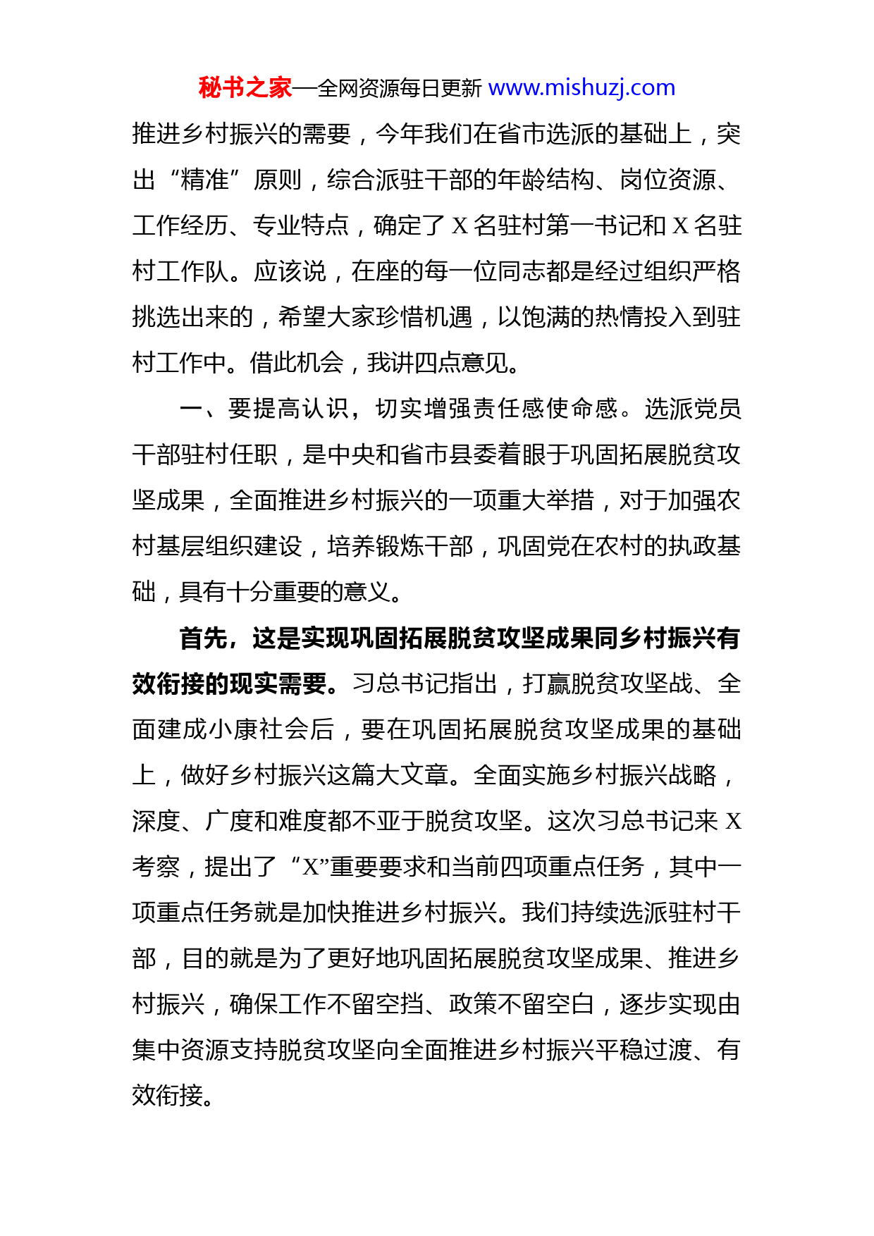 秘书之家—全网资源每日更新www.mishuzj.com在县级选派党员干部驻村任职动员会上的讲话同志们:经县委同意,今天我们在这里召开第六批选派党员干部驻村工作动员会。主要任务是学习贯彻习近平总书记在庆祝中国共产党成立100周年大会上的重要讲话精神和习近平总书记来X考察重要讲话精神,根据省、市第六批选派党员干部驻村工作会议部署要求,对第六批党员干部驻村工作进行动员部署。选派党员干部驻村任职,是习近平总书记在福建工作时亲自倡导、亲自推动的一项非常重要的工作。今年中央一号文件明确提出,要坚持和完善向重点乡村选派驻村第一书记和工作队制度。5月1日,中办还专门印发了《关于向重点乡村持续选派驻村第一书记和工作队的意见》,这是对选派党员干部驻村经验成果的充分肯定,同时也为我们扎实推进驻村工作提供了遵循和指导。自2004年选派第一批驻村干部以来,全县X名机关党员干部奔赴乡村一线,打出了一场又一场的胜仗,解决了一大批热点难点问题,兴办了一大批好事实事,在决战决胜脱贫攻坚、全面建成小康社会中交出了满意的答卷,得到了广大党员群众的肯定。根据巩固拓展脱贫攻坚成果和秘书之家—全网资源每日更新www.mishuzj.com推进乡村振兴的需要,今年我们在省市选派的基础上,突出“精准”原则,综合派驻干部的年龄结构、岗位资源、工作经历、专业特点,确定了X名驻村第一书记和X名驻村工作队。应该说,在座的每一位同志都是经过组织严格挑选出来的,希望大家珍惜机遇,以饱满的热情投入到驻村工作中。借此机会,我讲四点意见。一、要提高认识,切实增强责任感使命感。选派党员干部驻村任职,是中央和省市县委着眼于巩固拓展脱贫攻坚成果,全面推进乡村振兴的一项重大举措,对于加强农村基层组织建设,培养锻炼干部,巩固党在农村的执政基础,具有十分重要的意义。首先,这是实现巩固拓展脱贫攻坚成果同乡村振兴有效衔接的现实需要。习总书记指出,打赢脱贫攻坚战、全面建成小康社会后,要在巩固拓展脱贫攻坚成果的基础上,做好乡村振兴这篇大文章。全面实施乡村振兴战略,深度、广度和难度都不亚于脱贫攻坚。这次习总书记来X考察,提出了“X”重要要求和当前四项重点任务,其中一项重点任务就是加快推进乡村振兴。我们持续选派驻村干部,目的就是为了更好地巩固拓展脱贫攻坚成果、推进乡村振兴,确保工作不留空挡、政策不留空白,逐步实现由集中资源支持脱贫攻坚向全面推进乡村振兴平稳过渡、有效衔接。秘书之家—全网资源每日更新www.mishuzj.com其次,这是加强农村基层组织建设、巩固党在农村执政基础的有力举措。习总书记指出,农村工作千头万绪,抓好农村基层党组织建设是关键。总的看,我县农村基层党组织是坚强有力的,在推进农村改革发展稳定特别是决战决胜脱贫攻坚上发挥了战斗堡垒作用。但也要清醒看到,有的村软弱涣散,战斗力不强;有的村“两委”班子整体素质不够高,带动群众增收致富能力还不够强;有的村党组织领导基层治理的制度机制不健全等情况。把大家派驻到村里,目的就是要发挥大家作用,把基层党组织建设好、建设强,努力带出一个好的村“两委”班子,带出一支好的党员干部队伍,不断提升村党组织的创造力、凝聚力和战斗力。第三,这是培养锻炼干部、建设高素质专业化干部队伍的有效途径。习总书记强调,要选派一批优秀干部到乡村振兴一线岗位,把乡村振兴作为培养锻炼的广阔舞台。机关干部政策理论水平、专业素养都比较高,思想活跃,富有进取精神,这是大家的优势。但也有一部分同志没有基层工作经验,缺乏艰苦条件和复杂环境的历练,解决实际问题的能力还不够强。选派干部驻村任职,有利于更加深入了解农村的实际情况,加强与群众的感情,练好密切联系群众的基本功;有利于加强党性锻炼,磨练意志,在基层经风雨、见世面、壮筋骨、长才干。秘书之家—全网资源每日更新www.mishuzj.com二、要明确任务,用心用情做好驻村工作。农村工作纷繁复杂,面临着诸多困难和挑战,大家要发扬好驻村干部真蹲实驻、真驻实干的优良作风,紧扣驻村工作“四项重点任务”,积极履职尽责、主动担当作为。第一,要在加强基层组织建设上下功夫。乡村振兴各项政策,最终要靠农村基层组织来落实。大家到村里任职,首要的任务就是抓党建,只有把党组织建强起来、把党员调动起来,各项工作才能有序推进。一要稳妥推进村级组织换届。这次村级组织换届正值巩固脱贫攻坚成果与实施乡村振兴的有机衔接期、村“两委”班子任期由3年变5年的调整期,目前,省上初步明确8月份启动换届工作,明年1月份基本结束。大家到岗就位后,要配合乡镇党委做好选情分析研判,对可能影响换届的不稳定因素及早作出处置,确保在换届前完成软弱涣散党组织和重难点整顿。要积极稳妥推进“一肩挑”,注重优化班子结构,对暂无合适人选或者人选不优的,重点从退役军人、返乡大学生、离退休干部等后备力量中培养。要尽快熟悉掌握换届有关政策,确保换届程序合规、环节不简、步骤不乱。换届后,要协助县乡党委做好新一届村“两委”干部的培训,提高他们的综合素质和履职能力,引导他们迅速将精力转移到推动乡村全面振兴上来。另外,这里特别提醒一下,驻村干部原则上不参加换