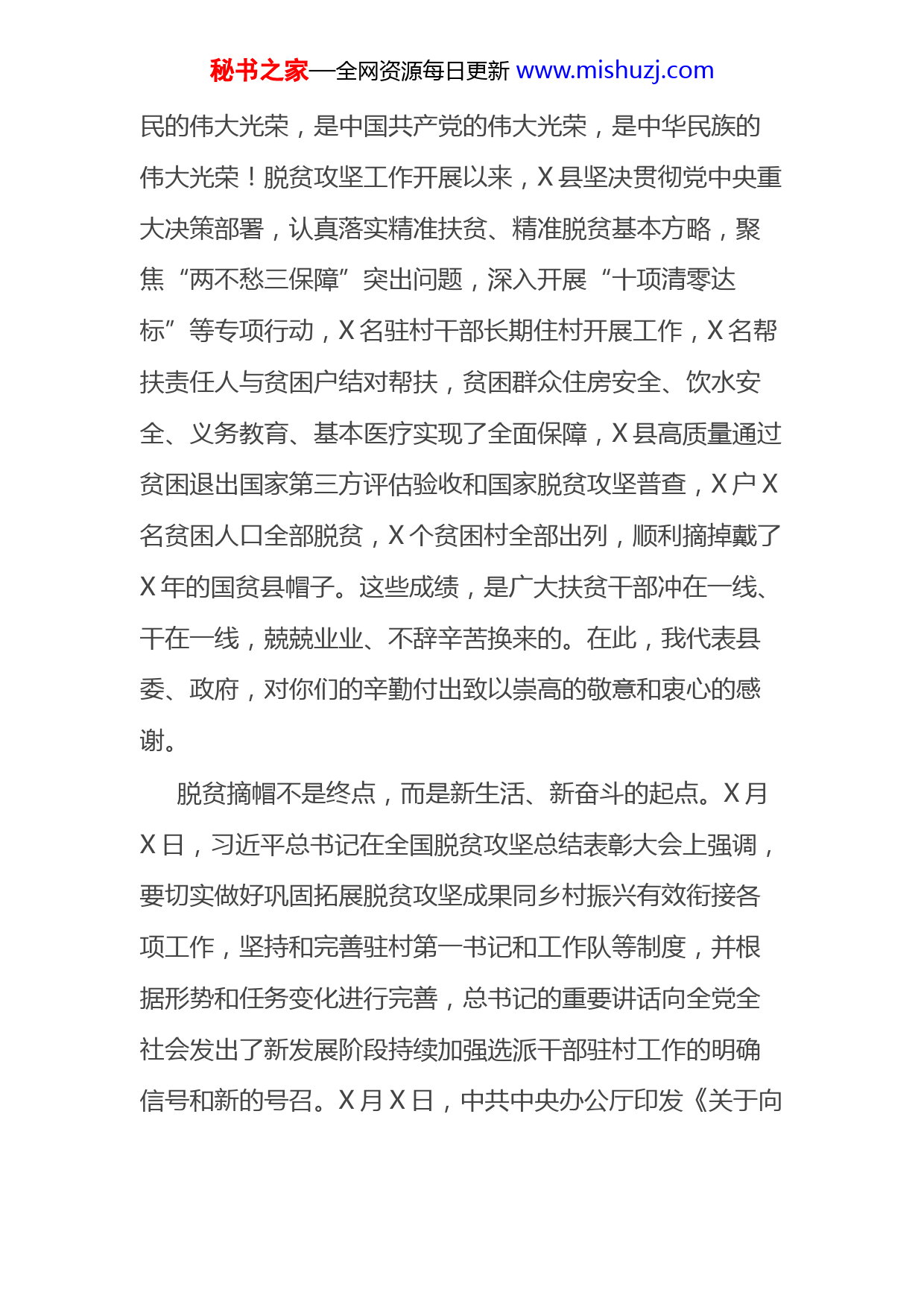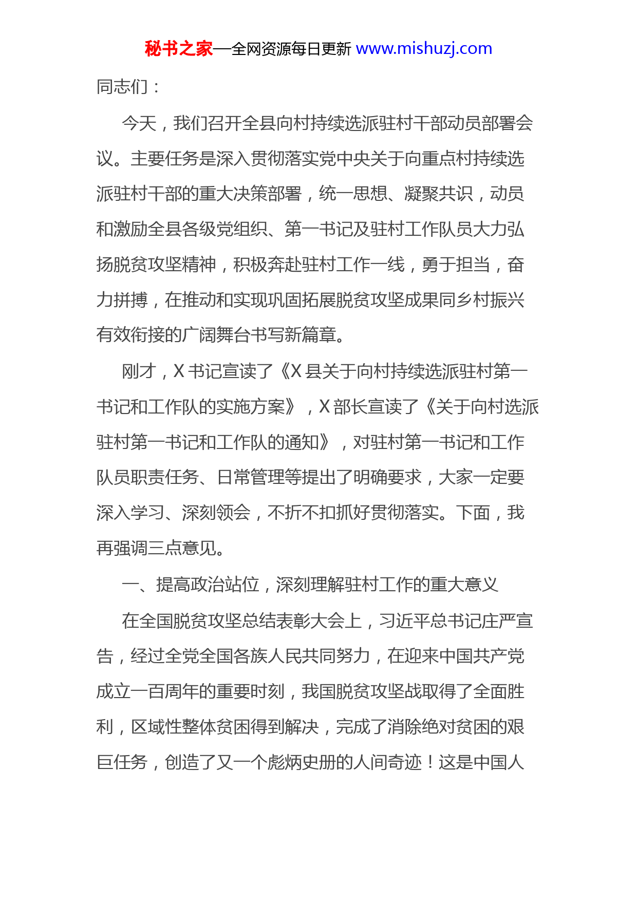 秘书之家—全网资源每日更新www.mishuzj.com同志们:今天,我们召开全县向村持续选派驻村干部动员部署会议。主要任务是深入贯彻落实党中央关于向重点村持续选派驻村干部的重大决策部署,统一思想、凝聚共识,动员和激励全县各级党组织、第一书记及驻村工作队员大力弘扬脱贫攻坚精神,积极奔赴驻村工作一线,勇于担当,奋力拼搏,在推动和实现巩固拓展脱贫攻坚成果同乡村振兴有效衔接的广阔舞台书写新篇章。刚才,X书记宣读了《X县关于向村持续选派驻村第一书记和工作队的实施方案》,X部长宣读了《关于向村选派驻村第一书记和工作队的通知》,对驻村第一书记和工作队员职责任务、日常管理等提出了明确要求,大家一定要深入学习、深刻领会,不折不扣抓好贯彻落实。下面,我再强调三点意见。一、提高政治站位,深刻理解驻村工作的重大意义在全国脱贫攻坚总结表彰大会上,习近平总书记庄严宣告,经过全党全国各族人民共同努力,在迎来中国共产党成立一百周年的重要时刻,我国脱贫攻坚战取得了全面胜利,区域性整体贫困得到解决,完成了消除绝对贫困的艰巨任务,创造了又一个彪炳史册的人间奇迹!这是中国人秘书之家—全网资源每日更新www.mishuzj.com民的伟大光荣,是中国共产党的伟大光荣,是中华民族的伟大光荣!脱贫攻坚工作开展以来,X县坚决贯彻党中央重大决策部署,认真落实精准扶贫、精准脱贫基本方略,聚焦“两不愁三保障”突出问题,深入开展“十项清零达标”等专项行动,X名驻村干部长期住村开展工作,X名帮扶责任人与贫困户结对帮扶,贫困群众住房安全、饮水安全、义务教育、基本医疗实现了全面保障,X县高质量通过贫困退出国家第三方评估验收和国家脱贫攻坚普查,X户X名贫困人口全部脱贫,X个贫困村全部出列,顺利摘掉戴了X年的国贫县帽子。这些成绩,是广大扶贫干部冲在一线、干在一线,兢兢业业、不辞辛苦换来的。在此,我代表县委、政府,对你们的辛勤付出致以崇高的敬意和衷心的感谢。脱贫摘帽不是终点,而是新生活、新奋斗的起点。X月X日,习近平总书记在全国脱贫攻坚总结表彰大会上强调,要切实做好巩固拓展脱贫攻坚成果同乡村振兴有效衔接各项工作,坚持和完善驻村第一书记和工作队等制度,并根据形势和任务变化进行完善,总书记的重要讲话向全党全社会发出了新发展阶段持续加强选派干部驻村工作的明确信号和新的号召。X月X日,中共中央办公厅印发《关于向秘书之家—全网资源每日更新www.mishuzj.com重点乡村持续选派驻村第一书记和工作队的意见》,对总结运用打赢脱贫攻坚战选派驻村第一书记和工作队的重要经验,巩固拓展脱贫攻坚成果、全面推进乡村振兴,向重点乡村持续选派驻村第一书记和工作队提出明确意见、作出全面部署。大家要深刻认识新形势新任务对选派干部驻村工作提出的新要求,切实把思想和行动统一到党中央的决策部署上来。全面实施乡村振兴战略的深度、广度、难度都不低于脱贫攻坚,不是轻轻松松就能完成的。选派第一书记和工作队是打赢脱贫攻坚战的重要经验,更是推进乡村振兴的一支重要力量。一方面,向重点村持续选派驻村第一书记和工作队,有助于推动资源下沉、工作下沉、干部下沉;有助于保持发展思路和工作的连续性,实现产业可持续发展和农牧民可持续增收的连贯性,进而推进巩固拓展脱贫攻坚成果与乡村振兴有效衔接。另一方面,选派第一书记和工作队,是推动人往基层走、劲往基层使的最直接、最有效办法,有助于转变工作作风,整合城乡资源抓基层打基础;有助于改善村基层党组织人员素质能力结构,优化村“两委”班子特别是带头人队伍,增强班子整体功能;有助于加强农村牧区治理人才队伍建设,充实基层治理力量,秘书之家—全网资源每日更新www.mishuzj.com提高农村牧区社会治理能力,进而夯实筑牢基层党组织战斗堡垒。在向第二个百年奋斗目标迈进的历史关口,巩固和拓展脱贫攻坚成果,全面推进乡村振兴,加快农村牧区现代化,是需要全党高度重视的关系大局的重大问题。第一书记和工作队员作为基层一线的中坚力量,责任重大、使命光荣。县委、政府在保持原有驻村力量稳定的基础上,综合考量全县广大干部个人意愿、能力、经历等多方面因素,经过多次研究讨论,最终敲定了X县持续选派驻村第一书记和工作队员名单,实现了最大限度的优化和补强,把“最能打硬仗的人”选派到了乡村振兴一线。作出这样的决定,饱含着县委、政府对各位的信任与肯定,饱含着广大农村牧区群众对各位的殷切期望,希望各位拿出决战决胜脱贫攻坚的劲头,带着感情、沉下身子,扎根基层、走进群众,冲锋在前、担当作为,在巩固拓展脱贫攻坚成果与乡村振兴有效衔接各项工作中再创佳绩。二、坚定必胜信心,全力做好巩固脱贫攻坚成果、推动乡村振兴各项重点工作在座的第一书记和工作队员是由县委、政府及各部门单位精挑细选的能力素质都十分突出的优秀干部。但随着秘书之家—全网资源每日更新www.mishuzj.com“三农三牧”工作重心由脱贫攻坚转向乡村振兴,第一书记和工作队员的工作职责、工作任务和需要掌握的政策、知识也相应发生了改变,对大家来说是一个不小的挑战。希望大家珍惜这次机会,通过乡村振兴这一广阔舞台,进一步锤炼“政治过硬、本领过硬、作风