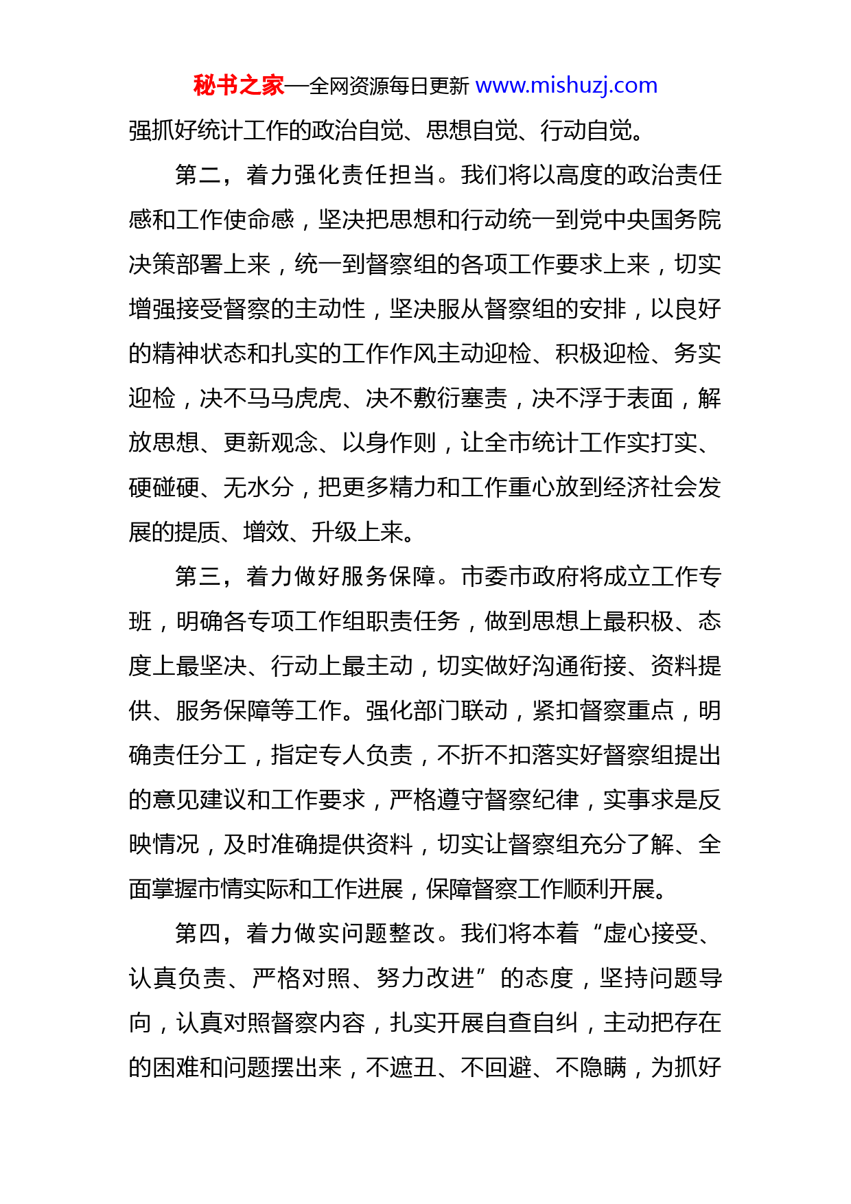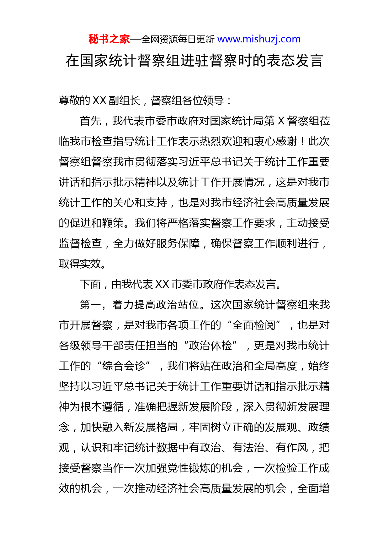 秘书之家—全网资源每日更新www.mishuzj.com在国家统计督察组进驻督察时的表态发言尊敬的XX副组长,督察组各位领导:首先,我代表市委市政府对国家统计局第X督察组莅临我市检查指导统计工作表示热烈欢迎和衷心感谢!此次督察组督察我市贯彻落实习近平总书记关于统计工作重要讲话和指示批示精神以及统计工作开展情况,这是对我市统计工作的关心和支持,也是对我市经济社会高质量发展的促进和鞭策。我们将严格落实督察工作要求,主动接受监督检查,全力做好服务保障,确保督察工作顺利进行,取得实效。下面,由我代表XX市委市政府作表态发言。第一,着力提高政治站位。这次国家统计督察组来我市开展督察,是对我市各项工作的“全面检阅”,也是对各级领导干部责任担当的“政治体检”,更是对我市统计工作的“综合会诊”,我们将站在政治和全局高度,始终坚持以习近平总书记关于统计工作重要讲话和指示批示精神为根本遵循,准确把握新发展阶段,深入贯彻新发展理念,加快融入新发展格局,牢固树立正确的发展观、政绩观,认识和牢记统计数据中有政治、有法治、有作风,把接受督察当作一次加强党性锻炼的机会,一次检验工作成效的机会,一次推动经济社会高质量发展的机会,全面增秘书之家—全网资源每日更新www.mishuzj.com强抓好统计工作的政治自觉、思想自觉、行动自觉。第二,着力强化责任担当。我们将以高度的政治责任感和工作使命感,坚决把思想和行动统一到党中央国务院决策部署上来,统一到督察组的各项工作要求上来,切实增强接受督察的主动性,坚决服从督察组的安排,以良好的精神状态和扎实的工作作风主动迎检、积极迎检、务实迎检,决不马马虎虎、决不敷衍塞责,决不浮于表面,解放思想、更新观念、以身作则,让全市统计工作实打实、硬碰硬、无水分,把更多精力和工作重心放到经济社会发展的提质、增效、升级上来。第三,着力做好服务保障。市委市政府将成立工作专班,明确各专项工作组职责任务,做到思想上最积极、态度上最坚决、行动上最主动,切实做好沟通衔接、资料提供、服务保障等工作。强化部门联动,紧扣督察重点,明确责任分工,指定专人负责,不折不扣落实好督察组提出的意见建议和工作要求,严格遵守督察纪律,实事求是反映情况,及时准确提供资料,切实让督察组充分了解、全面掌握市情实际和工作进展,保障督察工作顺利开展。第四,着力做实问题整改。我们将本着“虚心接受、认真负责、严格对照、努力改进”的态度,坚持问题导向,认真对照督察内容,扎实开展自查自纠,主动把存在的困难和问题摆出来,不遮丑、不回避、不隐瞒,为抓好秘书之家—全网资源每日更新www.mishuzj.com问题整改打好前站、做实根本。对督察组点出的问题、提出的建议,我们将主动认领、照单全收、迅速行动,压实整改责任,建立工作台账,制定工作方案,明确整改目标,强化整改举措,把问题整改转化为推动工作的强大动力、转化为解决问题的有效对策、转化为助力发展的实际行动。同时,我们将进一步深化统计改革创新,切实把统计数据搞准、搞实、搞全,坚持依法、规范、科学、如实统计,努力提高统计数据的真实性、准确性,切实提高统计公信力。第五,着力抓好巩固提升。我们将以这次督察为契机,进一步强化统计法律法规的学习贯彻,加强统计工作职业道德教育,提高统计人员专业技术水平,使每一位领导干部和统计工作人员熟悉业务、掌握本领、提升能力,严格规范自己的统计行为,严守“红线、底线”,做依法统计的排头兵和倡导者,追求实实在在的投入、实实在在的增长、实实在在的发展。深刻剖析产生问题的深层次原因,围绕薄弱环节和不足,举一反三,强化建章立制,着力形成靠制度解决问题、规范程序和推动工作的长效机制,对伪造、篡改、编造和数据失察等行为进行严肃追责问责,用严明的制度、严格的执行、严密的监督,维护制度的严肃性和权威性,确保政治生态海晏河清,社会生态清清爽爽。秘书之家—全网资源每日更新www.mishuzj.com最后,祝国家统计督察组各位领导在XX工作期间身体健康,工作顺利!