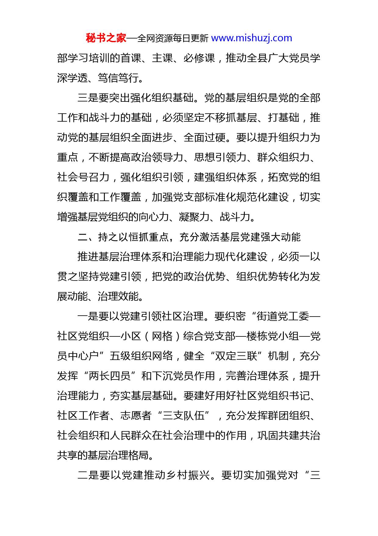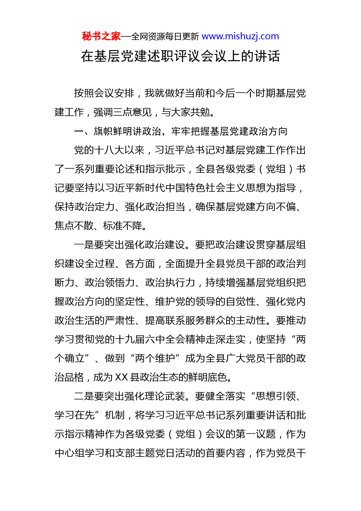 秘书之家—全网资源每日更新www.mishuzj.com在基层党建述职评议会议上的讲话按照会议安排,我就做好当前和今后一个时期基层党建工作,强调三点意见,与大家共勉。一、旗帜鲜明讲政治,牢牢把握基层党建政治方向党的十八大以来,习近平总书记对基层党建工作作出了一系列重要论述和指示批示,全县各级党委(党组)书记要坚持以习近平新时代中国特色社会主义思想为指导,保持政治定力、强化政治担当,确保基层党建方向不偏、焦点不散、标准不降。一是要突出强化政治建设。要把政治建设贯穿基层组织建设全过程、各方面,全面提升全县党员干部的政治判断力、政治领悟力、政治执行力,持续增强基层党组织把握政治方向的坚定性、维护党的领导的自觉性、强化党内政治生活的严肃性、提高联系服务群众的主动性。要推动学习贯彻党的十九届六中全会精神走深走实,使坚持“两个确立”、做到“两个维护”成为全县广大党员干部的政治品格,成为XX县政治生态的鲜明底色。二是要突出强化理论武装。要健全落实“思想引领、学习在先”机制,将学习习近平总书记系列重要讲话和批示指示精神作为各级党委(党组)会议的第一议题,作为中心组学习和支部主题党日活动的首要内容,作为党员干秘书之家—全网资源每日更新www.mishuzj.com部学习培训的首课、主课、必修课,推动全县广大党员学深学透、笃信笃行。三是要突出强化组织基础。党的基层组织是党的全部工作和战斗力的基础,必须坚定不移抓基层、打基础,推动党的基层组织全面进步、全面过硬。要以提升组织力为重点,不断提高政治领导力、思想引领力、群众组织力、社会号召力,强化组织引领,建强组织体系,拓宽党的组织覆盖和工作覆盖,加强党支部标准化规范化建设,切实增强基层党组织的向心力、凝聚力、战斗力。二、持之以恒抓重点,充分激活基层党建强大动能推进基层治理体系和治理能力现代化建设,必须一以贯之坚持党建引领,把党的政治优势、组织优势转化为发展动能、治理效能。一是要以党建引领社区治理。要织密“街道党工委—社区党组织—小区(网格)综合党支部—楼栋党小组—党员中心户”五级组织网络,健全“双定三联”机制,充分发挥“两长四员”和下沉党员作用,完善治理体系,提升治理能力,夯实基层基础。要建好用好社区党组织书记、社区工作者、志愿者“三支队伍”,充分发挥群团组织、社会组织和人民群众在社会治理中的作用,巩固共建共治共享的基层治理格局。二是要以党建推动乡村振兴。要切实加强党对“三秘书之家—全网资源每日更新www.mishuzj.com农”工作的全面领导,强化县、乡、村三级书记抓乡村振兴的工作机制,着力健全上下贯通、精准施策、一抓到底的乡村振兴工作体系,扎实推进巩固拓展脱贫攻坚成果同乡村振兴有效衔接。要充分发挥基层党组织的战斗堡垒作用,优化做实指挥调度体系,压紧压实工作组的行业责任,推动资源下沉,筑牢要素保障。要加快建设政治过硬、本领过硬、作风过硬的干部队伍,继续选优派强优秀干部扎根一线、扎根农村,在乡村振兴的伟大实践中建功立业。三是要以党建促进全域提升。在机关,要重点围绕当好“三个表率”,持续抓好“三进三促”,推动党建工作和业务工作深度融合。在学校,要把党的领导贯穿办学治校、教书育人全过程,落实好党组织领导的校长负责制,加强课堂、论坛管理,牢牢守住学校意识形态阵地。在医院,要落实好党组织领导的院长负责制,以党建创新推动医院转型。在国企,要健全党对国有企业领导的各项制度,把党的领导融入公司治理,开展党员攻关、“揭榜挂帅”,凝心聚力、攻坚克难。在非公,要通过探索党建引领新业态、新就业群体服务模式,让更多年轻党员找到“家的归属”,让更多年轻群众感受党的温暖。三、重责上肩抓落实,切实提升基层党建工作质效2022年,是党的二十大召开之年,各级党委(党组)秘书之家—全网资源每日更新www.mishuzj.com书记要牢固树立“抓好党建是本职、抓不好党建是失职、不抓党建是渎职”的理念,真管真严、敢管敢严、长管长严,推动全面从严治党向纵深发展。一是要压实工作责任。各级党委(党组)书记要始终牢记党的书记“第一身份”、管党治党“第一职责”、抓好党建“第一政绩”,知责于心、担责于身、履责于行。要健全党委(党组)书记抓基层党建工作公开承诺、领办项目、工作联系点“三个一”工作制度,一级抓一级、层层抓落实。党委(党组)其他班子成员要按照“一岗双责”要求,抓好分管领域党建工作,把党的建设融入工作日常,做到抓党建与抓业务相促进、相统一。二是要坚持示范引领。各级党委(党组)书记要扛牢基层党建政治责任,坚持以上率下、躬身示范、狠抓落实,对基层党建工作亲自部署、亲自协调、亲自督办,做到重要政策书记带头学、重大项目书记带头抓、重点工作书记带头推。要做到逢会必讲党建、座谈必问党建、调研必看党建,深入基层一线,了解实际情况,发现问题,破解难题。三是要切实改进作风。要大力弘扬“严、高、实”的工作作风,谋定而后动、谋定而快动,将党建工作项目化、工程化、清单化,抓一件成一件,成一件带一片,坚决防止“会上党建”“纸上党建”“墙上党建”。要切实秘书之家—全网资源每日更新www.m