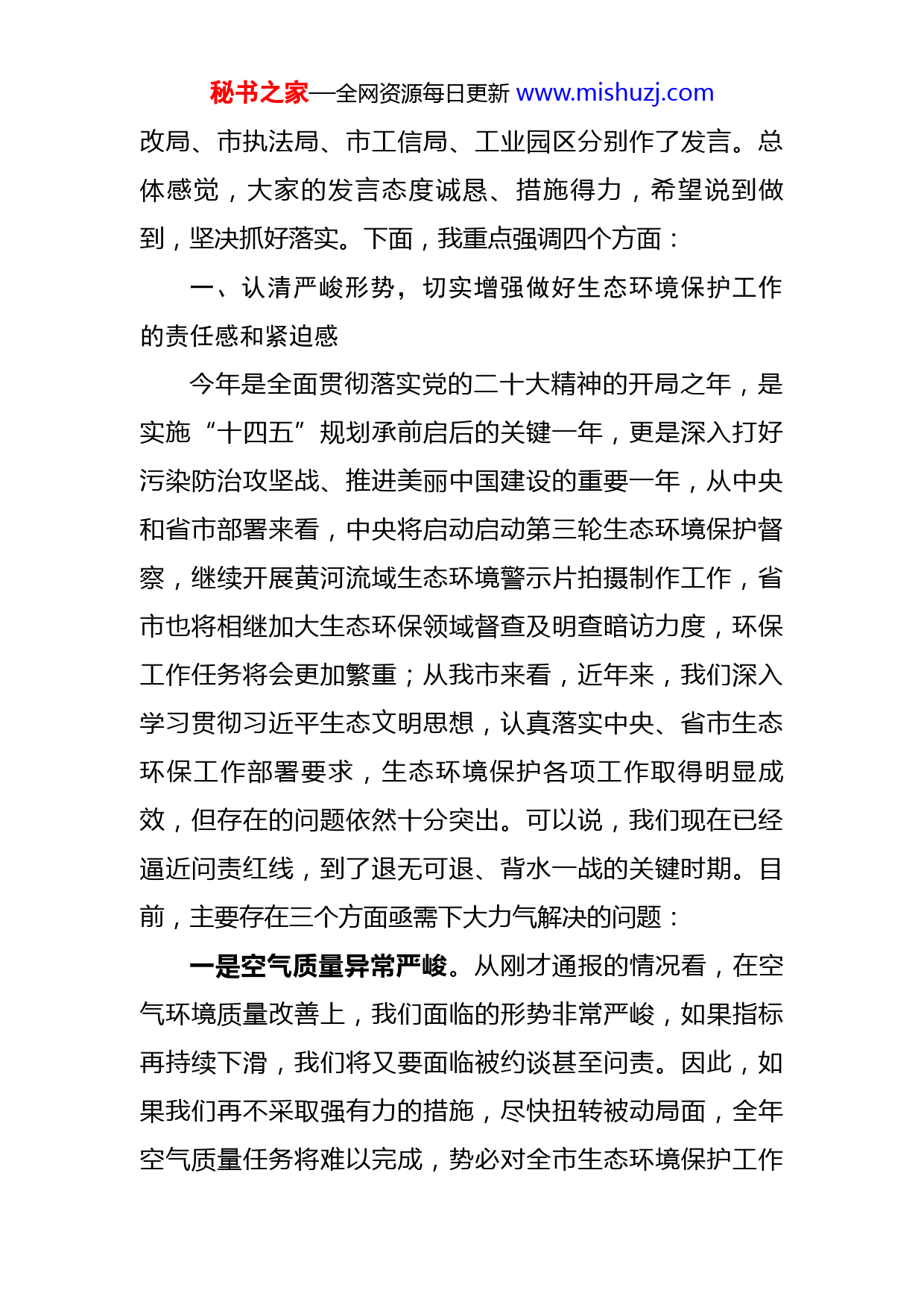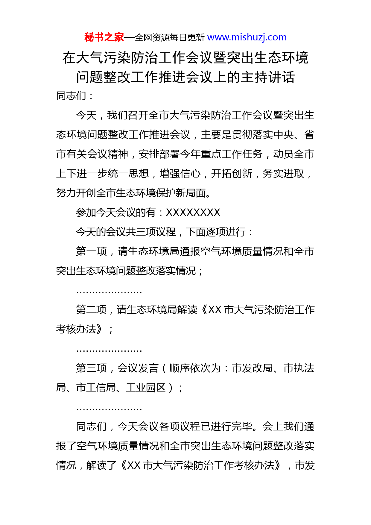秘书之家—全网资源每日更新www.mishuzj.com在大气污染防治工作会议暨突出生态环境问题整改工作推进会议上的主持讲话同志们:今天,我们召开全市大气污染防治工作会议暨突出生态环境问题整改工作推进会议,主要是贯彻落实中央、省市有关会议精神,安排部署今年重点工作任务,动员全市上下进一步统一思想,增强信心,开拓创新,务实进取,努力开创全市生态环境保护新局面。参加今天会议的有:XXXXXXXX今天的会议共三项议程,下面逐项进行:第一项,请生态环境局通报空气环境质量情况和全市突出生态环境问题整改落实情况;.....................第二项,请生态环境局解读《XX市大气污染防治工作考核办法》;.....................第三项,会议发言(顺序依次为:市发改局、市执法局、市工信局、工业园区);.....................同志们,今天会议各项议程已进行完毕。会上我们通报了空气环境质量情况和全市突出生态环境问题整改落实情况,解读了《XX市大气污染防治工作考核办法》,市发秘书之家—全网资源每日更新www.mishuzj.com改局、市执法局、市工信局、工业园区分别作了发言。总体感觉,大家的发言态度诚恳、措施得力,希望说到做到,坚决抓好落实。下面,我重点强调四个方面:一、认清严峻形势,切实增强做好生态环境保护工作的责任感和紧迫感今年是全面贯彻落实党的二十大精神的开局之年,是实施“十四五”规划承前启后的关键一年,更是深入打好污染防治攻坚战、推进美丽中国建设的重要一年,从中央和省市部署来看,中央将启动启动第三轮生态环境保护督察,继续开展黄河流域生态环境警示片拍摄制作工作,省市也将相继加大生态环保领域督查及明查暗访力度,环保工作任务将会更加繁重;从我市来看,近年来,我们深入学习贯彻习近平生态文明思想,认真落实中央、省市生态环保工作部署要求,生态环境保护各项工作取得明显成效,但存在的问题依然十分突出。可以说,我们现在已经逼近问责红线,到了退无可退、背水一战的关键时期。目前,主要存在三个方面亟需下大力气解决的问题:一是空气质量异常严峻。从刚才通报的情况看,在空气环境质量改善上,我们面临的形势非常严峻,如果指标再持续下滑,我们将又要面临被约谈甚至问责。因此,如果我们再不采取强有力的措施,尽快扭转被动局面,全年空气质量任务将难以完成,势必对全市生态环境保护工作秘书之家—全网资源每日更新www.mishuzj.com和经济社会发展大局造成严重影响和巨大压力。二是环保问题特别突出。去年以来,市委、市政府为扭转空气质量持续下滑的不利局面,集中调度,密集部署,提出了一系列有针对性的措施办法,但从目前的防治成效来看,结果并不理想。这固然有高温天气偏多,降雨量较少等客观因素的影响,但最主要还是部门监管责任落实不严,企业主体责任履行不力,防治措施不够精细。除了大气,其他方面的问题也不容忽视,水环境问题整治不彻底、环保督察反馈问题整改缓慢、生态环保类项目谋划不到位等等,一些问题长期存在,多次被省、市通报。三是整治任务非常艰巨。生态环境保护事关发展和民生,体现的是政治站位和责任担当,既要速战速决打赢空气质量改善翻身仗,也要久久为功打好污染防治持久仗。全市上下必须全力以赴、速战速决,尽快扭转被动局面,坚持不懈下狠手、出重拳推进大气污染治理,广大人民群众对良好生态环境的满意度不断提升。二、坚持狠抓严管,迅速改善空气环境质量大气污染防治工作是一项民生工程、民心工程,主城区更是全市大气污染防治的主战场,环境空气质量的好坏,直接影响市上在全省的排名,各单位要始终坚守大气环境质量“只能更好、不能变坏”的刚性底线,坚决打赢大气质量改善“翻身仗”。秘书之家—全网资源每日更新www.mishuzj.com一要狠抓扬尘管控。据调查分析,以建筑工地和道路为主要衍生地的扬尘污染对PM2.5的比重达到XX%。因此,抓好扬尘管控是根治大气污染的重中之重。住建局要督促等城区建筑工地严格落实“六个百分之百”、“三个必须”管控措施,裸露待建土地全部用抑尘网苫盖,施工区域设置严密围挡,只保留一个进出口,进场道路全部硬化、砂化。要将扬尘治理不良信息纳入建筑市场信用管理体系,实行“黑名单”管理。执法局要针对夜间空气质量监测数据异常问题,加大城区主干街路洒扫频次,延长洒扫时间,要继续做好渣土运输车辆管理,督促落实密闭运输,施工场地及周边运输道路落实好湿法清扫、洒水降尘等措施。同时,要加大广场、莲花湖公园人行道及周边路段湿法清扫力度,适当削减监测点周边柳树高度,防止扬尘和生物质对监测数据造成影响。交通局要督促重大项目施工单位,严格落实洒水降尘、雾炮喷淋等防尘措施。生态环境局要督促企业落实好车辆清洗和苫盖措施,严禁超限超载和载物抛洒。二要狠抓散煤治理。生态环境局近期要组织对市域内燃煤锅炉开展一次大排查,全面摸清底数。督促已完成燃煤锅炉达标治理的企事业单位正常运行治污设施,严查锅炉烟气超标排放行为。对还未安装治污设施的燃煤锅炉,要督促责任单位尽快配套安装,确保锅炉烟气稳定达标排秘书之家—全网资源每日更新www.mishuzj.com放。市场监管局要扎实落实好每季度一次的煤质抽检工作,将结果及时报市环委办备案。工信、市场监