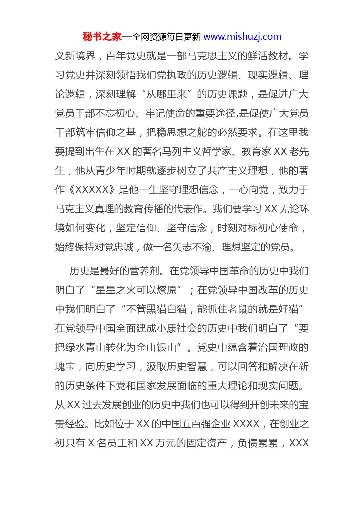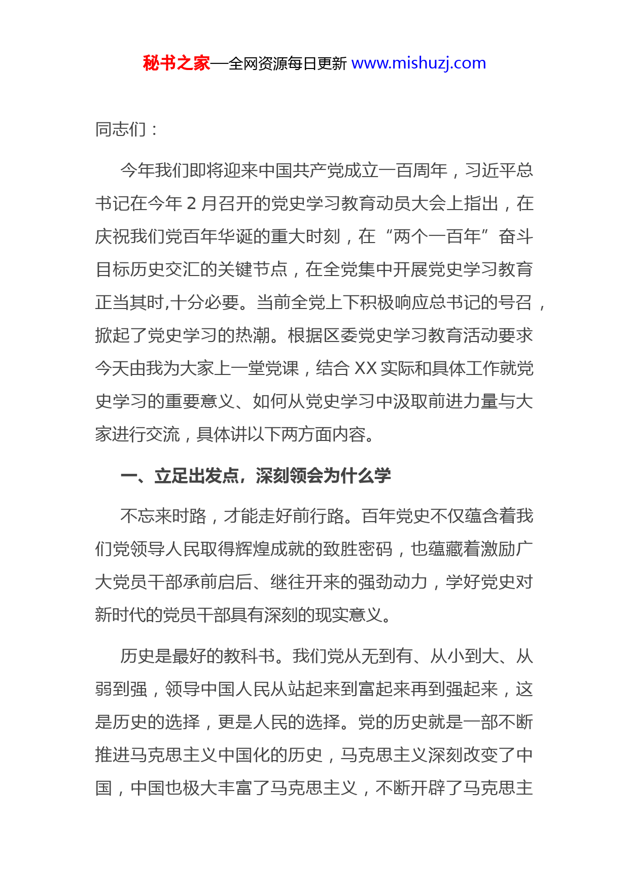 秘书之家—全网资源每日更新www.mishuzj.com同志们:今年我们即将迎来中国共产党成立一百周年,习近平总书记在今年2月召开的党史学习教育动员大会上指出,在庆祝我们党百年华诞的重大时刻,在“两个一百年”奋斗目标历史交汇的关键节点,在全党集中开展党史学习教育正当其时,十分必要。当前全党上下积极响应总书记的号召,掀起了党史学习的热潮。根据区委党史学习教育活动要求今天由我为大家上一堂党课,结合XX实际和具体工作就党史学习的重要意义、如何从党史学习中汲取前进力量与大家进行交流,具体讲以下两方面内容。一、立足出发点,深刻领会为什么学不忘来时路,才能走好前行路。百年党史不仅蕴含着我们党领导人民取得辉煌成就的致胜密码,也蕴藏着激励广大党员干部承前启后、继往开来的强劲动力,学好党史对新时代的党员干部具有深刻的现实意义。历史是最好的教科书。我们党从无到有、从小到大、从弱到强,领导中国人民从站起来到富起来再到强起来,这是历史的选择,更是人民的选择。党的历史就是一部不断推进马克思主义中国化的历史,马克思主义深刻改变了中国,中国也极大丰富了马克思主义,不断开辟了马克思主秘书之家—全网资源每日更新www.mishuzj.com义新境界,百年党史就是一部马克思主义的鲜活教材。学习党史并深刻领悟我们党执政的历史逻辑、现实逻辑、理论逻辑,深刻理解“从哪里来”的历史课题,是促进广大党员干部不忘初心、牢记使命的重要途径,是促使广大党员干部筑牢信仰之基,把稳思想之舵的必然要求。在这里我要提到出生在XX的著名马列主义哲学家、教育家XX老先生,他从青少年时期就逐步树立了共产主义理想,他的著作《XXXXX》是他一生坚守理想信念,一心向党,致力于马克主义真理的教育传播的代表作。我们要学习XX无论环境如何变化,坚定信仰、坚守信念,时刻对标初心使命,始终保持对党忠诚,做一名矢志不渝、理想坚定的党员。历史是最好的营养剂。在党领导中国革命的历史中我们明白了“星星之火可以燎原”;在党领导中国改革的历史中我们明白了“不管黑猫白猫,能抓住老鼠的就是好猫”在党领导中国全面建成小康社会的历史中我们明白了“要把绿水青山转化为金山银山”。党史中蕴含着治国理政的瑰宝,向历史学习,汲取历史智慧,可以回答和解决在新的历史条件下党和国家发展面临的重大理论和现实问题。从XX过去发展创业的历史中我们也可以得到开创未来的宝贵经验。比如位于XX的中国五百强企业XXXX,在创业之初只有X名员工和XX万元的固定资产,负债累累,XXX秘书之家—全网资源每日更新www.mishuzj.com同志发挥党员先锋作用,和创业团队一起开展深入的市场调研,主动改革转型,勇于攻坚克难,加强科技创新,带领XXXX发展为全球领先的XXXX制造基地,回望来时的路,我们有许多经验思路可以回顾、总结、分析,这些都是指导我们面向未来创造新成绩的法宝。历史是最好的清醒剂。汲取我们党和国家的历史经验,正确了解党和国家历史上的重大事件和重要人物,能够使党员干部正确认识党情、国情。在我党夺取全国胜利的前夕,毛主席曾在西柏坡党的七届二中全会上提出“两个务必”:务必使同志们继续地保持谦虚、谨慎、不骄、不躁的作风,务必使同志们继续地保持艰苦奋斗的作风。2013年7月,习近平总书记也在西柏坡发表重要讲话,再次强调“两个务必”。正因为我们党始终牢记“两个务必”,从根本上杜绝固步自封、贪图享乐的不良思想,才跳出了“其兴也勃焉、其亡也忽焉”的历史周期律。在现实中,少数党员干部虽“一路向前”,却没有守护好这个“清白”的初衷,丢掉了信仰,被路边的风景诱惑,禁不住糖衣炮弹的进攻,在政治上变质,背离了初心,最终偏离了人生航线,教训深刻、令人深思。历史不仅提供经验,还提供教训,警醒我们要居安思危,保持头脑清醒,使我们不再重犯历史上曾经犯过的同类错误。秘书之家—全网资源每日更新www.mishuzj.com二、明确落脚点,着力推动学出成效学习历史是为了更好走向未来,我们要紧紧围绕“学党史、悟思想、办实事、开新局”的要求,做到习近平总书记提出的“学史明理、学史增信、学史崇德、学史力行”推动学习成效转化为提升工作水平、促进个人成长的强大动力。在学史中打好为民服务“组合拳”。中央党史学习教育领导小组印发通知就开展“我为群众办实事”实践活动作出安排部署,就是要号召党员干部强化宗旨意识、为民情怀,当好群众勤务员。村党支部作为基层最前沿,群众身边人,要切实发挥出基层党组织战斗堡垒作用、党员先锋模范作用,在“访民情、听民意、解民忧”中不断提升为群众服务的水平。要在“用情”上下功夫。懂得换位思考,充分理解群众所处的场合、心境、站位,在群众面前不摆架子,不讲套话、官话,而要讲群众听得懂的话、暖心的话,维系好干部群众之间的“鱼水之情”,让群众感受身边的温暖。要在“用心”上做文章。聚焦群众“急难愁盼”问题,多从细微处着眼,解决好民生关键小事,做到联系群众周密、服务群众周到;宣传引导群众时要开展耐心细致的思想工作,及时回应群众关切,有效纾解群众情绪,引导群众心往一处想、劲往一处使。要在“用力”上秘书之家—全网资源每日更新www.mishuzj.com求实效。群众