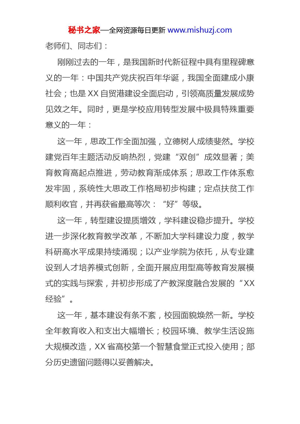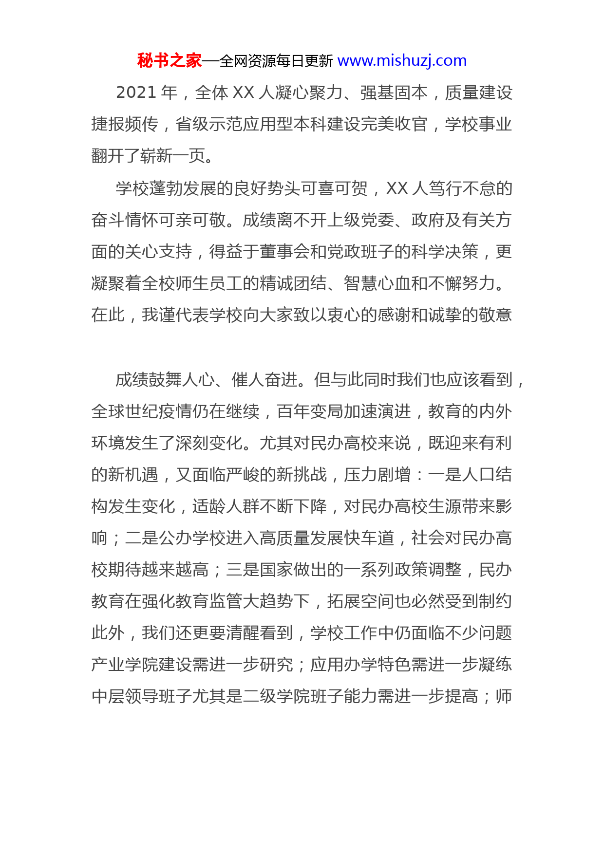 秘书之家—全网资源每日更新www.mishuzj.com老师们、同志们:刚刚过去的一年,是我国新时代新征程中具有里程碑意义的一年:中国共产党庆祝百年华诞,我国全面建成小康社会;也是XX自贸港建设全面启动,引领高质量发展成势见效之年。同时,更是学校应用转型发展中极具特殊重要意义的一年:这一年,思政工作全面加强,立德树人成绩斐然。学校建党百年主题活动反响热烈,党建“双创”成效显著;美育教育高起点推进,劳动教育渐成体系;思政工作体系愈发牢固,系统性大思政工作格局初步构建;定点扶贫工作顺利收官,并再获省最高等次:“好”等级。这一年,转型建设提质增效,学科建设稳步提升。学校进一步深化教育教学改革,不断加大学科建设力度,教学科研高水平成果持续涌现;以产业学院为依托,从专业建设到人才培养模式创新,全面开展应用型高等教育发展模式的实践与探索,并初步形成了产教深度融合发展的“XX经验”。这一年,基本建设有条不紊,校园面貌焕然一新。学校全年教育收入和支出大幅增长;校园环境、教学生活设施大规模改造,XX省高校第一个智慧食堂正式投入使用;部分历史遗留问题得以妥善解决。秘书之家—全网资源每日更新www.mishuzj.com2021年,全体XX人凝心聚力、强基固本,质量建设捷报频传,省级示范应用型本科建设完美收官,学校事业翻开了崭新一页。学校蓬勃发展的良好势头可喜可贺,XX人笃行不怠的奋斗情怀可亲可敬。成绩离不开上级党委、政府及有关方面的关心支持,得益于董事会和党政班子的科学决策,更凝聚着全校师生员工的精诚团结、智慧心血和不懈努力。在此,我谨代表学校向大家致以衷心的感谢和诚挚的敬意成绩鼓舞人心、催人奋进。但与此同时我们也应该看到,全球世纪疫情仍在继续,百年变局加速演进,教育的内外环境发生了深刻变化。尤其对民办高校来说,既迎来有利的新机遇,又面临严峻的新挑战,压力剧增:一是人口结构发生变化,适龄人群不断下降,对民办高校生源带来影响;二是公办学校进入高质量发展快车道,社会对民办高校期待越来越高;三是国家做出的一系列政策调整,民办教育在强化教育监管大趋势下,拓展空间也必然受到制约此外,我们还更要清醒看到,学校工作中仍面临不少问题产业学院建设需进一步研究;应用办学特色需进一步凝练中层领导班子尤其是二级学院班子能力需进一步提高;师秘书之家—全网资源每日更新www.mishuzj.com德师风建设需进一步加强;校园规划报建办证等手续需进一步加快等等。以上种种挑战和问题,警示我们要增强忧患意识,始终居安思危,不容半点松懈与自满;促使我们要保持头脑清醒,深入分析思考,始终坚持跳出教育看教育,立足全局谋教育、放眼长远办教育;激励我们更要发扬XX精神,敢为人先,追求卓越,扎实努力,补齐短板,做实特色,提高质量;唯有如此,学校才能获得更广阔的发展空间。接下来,受XXX董事长的委托,我代表学校做2022年工作报告。今年学校工作的总体目标要求是:以XXX新时代中国特色社会主义思想为指引,以2022年全国和XX省教育工作会议精神和工作要点为指导,全面贯彻落实党和国家的教育方针,在学校董事会领导下,在中教集团支持和指导下,着力改革创新,聚力攻坚克难,全面完成审核评估自评自建,迎接专家预评估;全面夯实硕点建设坚实基础,取得培育新进展;全面推进校园规划办证收尾,启动学校选型申报。2022年,学校将坚持立德树人,培育创新特色,以高质量发展谱写跨越赶超新篇章,以优异成绩迎接党的二十大和省第八次党代会胜利召开!秘书之家—全网资源每日更新www.mishuzj.com总之,2022年是学校审核评估自评自建收官之年;是硕点筹建实质推进攻坚之年;是“选营选非”分类登记落地之年。全年学校工作重点概括为“五个加强”。一、加强党建思政,为推动学校高质量发展聚势赋能学校依照中组部《民办学校党建工作重点任务》,要科学谋划,主动创新,形成党建思政工作的“XX风格与范例”,着力做到“五个提升”。(一)提升党建工作质量压实责任,增强基层党组织政治功能。持续巩固拓展党史学习教育成果,建立常态化制度机制;落实党委班子联系基层党组织工作制度;抓好党校师资库建设,形成针对性的党员培训课程体系;重视高知群体党员发展,全年计划培训入党积极分子XXX人,发展党员XXX人;充分发挥党组织在机关部门、二级学院和关联单位的政治核心作用深度融合,促进党建与学校发展相互促进。实行党建与中心工作“同部署、同考核”的工作机制;推动学校党建与政府、社区、学校共建联建;做好定点扶贫与乡村振兴有效衔接,发挥专业优势,挖掘特色项目;发挥民主党派人才优势;强化纪检监察和信访工作力度。秘书之家—全网资源每日更新www.mishuzj.com拓展内涵,推进示范创建质量创优。高质量推进党建“双创”培育和建设工作,创建“意识形态、师德师风、素质教育、课程思政”等党建思政专项研究工作室;重点研究校企合作背景下的思政工作新路径、民办高校生源结构参差不齐的学生素质教育培养新方法、课程思政全覆盖的思政工作新载体等3个专题,形成经验和特色。(二)提升宣传工作影响突出宣传主线。全力做好迎接党的二十大胜利召开和学习宣传贯彻,开展师生迎接、学习、宣传党的二十大专项行动,汇聚形成全校师生喜迎党的二十大浓厚