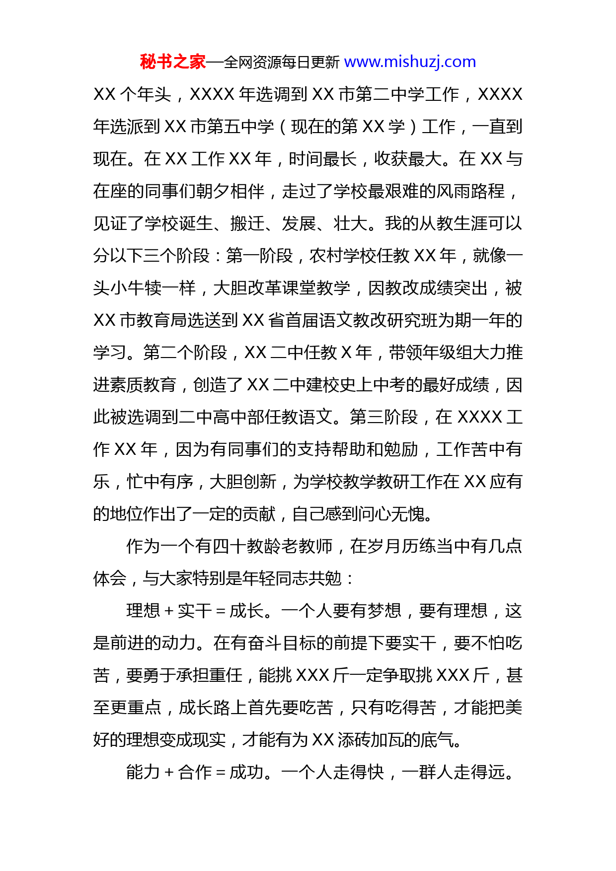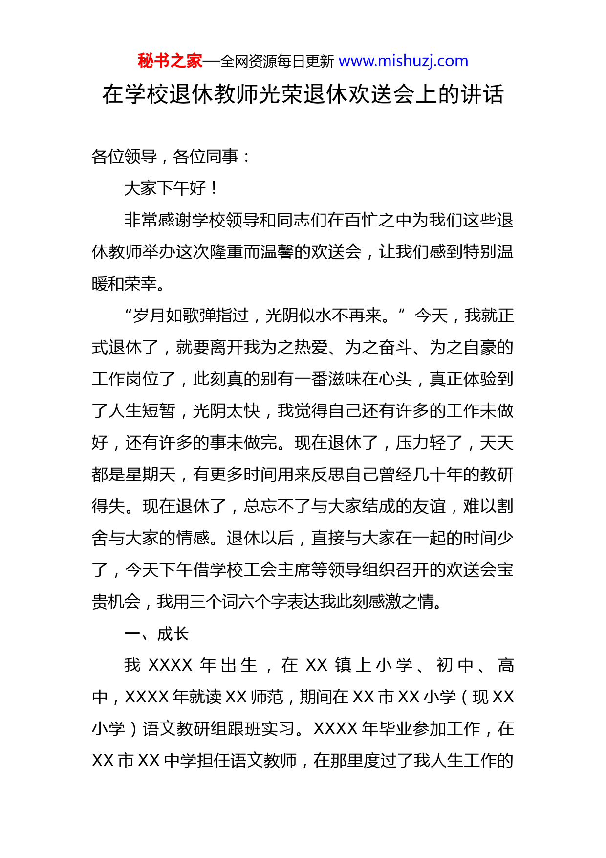 秘书之家—全网资源每日更新www.mishuzj.com在学校退休教师光荣退休欢送会上的讲话各位领导,各位同事:大家下午好!非常感谢学校领导和同志们在百忙之中为我们这些退休教师举办这次隆重而温馨的欢送会,让我们感到特别温暖和荣幸。“岁月如歌弹指过,光阴似水不再来。”今天,我就正式退休了,就要离开我为之热爱、为之奋斗、为之自豪的工作岗位了,此刻真的别有一番滋味在心头,真正体验到了人生短暂,光阴太快,我觉得自己还有许多的工作未做好,还有许多的事未做完。现在退休了,压力轻了,天天都是星期天,有更多时间用来反思自己曾经几十年的教研得失。现在退休了,总忘不了与大家结成的友谊,难以割舍与大家的情感。退休以后,直接与大家在一起的时间少了,今天下午借学校工会主席等领导组织召开的欢送会宝贵机会,我用三个词六个字表达我此刻感激之情。一、成长我XXXX年出生,在XX镇上小学、初中、高中,XXXX年就读XX师范,期间在XX市XX小学(现XX小学)语文教研组跟班实习。XXXX年毕业参加工作,在XX市XX中学担任语文教师,在那里度过了我人生工作的秘书之家—全网资源每日更新www.mishuzj.comXX个年头,XXXX年选调到XX市第二中学工作,XXXX年选派到XX市第五中学(现在的第XX学)工作,一直到现在。在XX工作XX年,时间最长,收获最大。在XX与在座的同事们朝夕相伴,走过了学校最艰难的风雨路程,见证了学校诞生、搬迁、发展、壮大。我的从教生涯可以分以下三个阶段:第一阶段,农村学校任教XX年,就像一头小牛犊一样,大胆改革课堂教学,因教改成绩突出,被XX市教育局选送到XX省首届语文教改研究班为期一年的学习。第二个阶段,XX二中任教X年,带领年级组大力推进素质教育,创造了XX二中建校史上中考的最好成绩,因此被选调到二中高中部任教语文。第三阶段,在XXXX工作XX年,因为有同事们的支持帮助和勉励,工作苦中有乐,忙中有序,大胆创新,为学校教学教研工作在XX应有的地位作出了一定的贡献,自己感到问心无愧。作为一个有四十教龄老教师,在岁月历练当中有几点体会,与大家特别是年轻同志共勉:理想+实干=成长。一个人要有梦想,要有理想,这是前进的动力。在有奋斗目标的前提下要实干,要不怕吃苦,要勇于承担重任,能挑XXX斤一定争取挑XXX斤,甚至更重点,成长路上首先要吃苦,只有吃得苦,才能把美好的理想变成现实,才能有为XX添砖加瓦的底气。能力+合作=成功。一个人走得快,一群人走得远。秘书之家—全网资源每日更新www.mishuzj.com无论是班级科任老师、备课组成员,大家都要心往一处想,劲往一处使,委屈小我,成就大我。"二人同心,其利断金"就是这个道理。老师都是有能力的人,希望大家通力合作,在XX成功的路上奋力前行。课堂+课题=成才。很多老师课堂效果好,学生成绩考得好,但学科带头人总难评上,主要是不善于教学研究,不做课题。希望大家重视课题研究,从课堂小课题研究入手,只有这样不断总结反思,才能做出更有价值的课题,才能成为名师,为XX增光添彩。二、感谢我们生逢其时,首先感谢这个伟大的时代为我们提供了施展个人才华实现个人理想抱负的舞台,让我们退休后衣食无忧,我们非常感激,非常幸福,一定做到端起碗吃肉,放下筷子感恩。其次感谢XX,因为有XX,我们才成为同事,甚至成为情同手足的兄弟姐妹。因为有XX,我才有和大家在一起为了共同的目标奋斗的机会。再次感谢在座的每一位同事,感谢帮助过我的所有人。尤其是XX书记,在我热爱的教研工作中对我的关心、照顾。这些关心让我时刻铭记在心,珍藏一世,它将作为我退休后的精神食粮,慢慢品尝。三、祝福秘书之家—全网资源每日更新www.mishuzj.com自XXXX年到XX(现在XX)工作以来,这个温暖的集体,让我收获了课堂的快乐,度过了幸福的时光,成就了名师的梦想,我将永远铭记在心。真心的希望我们XX在XX校长带领下越来越好,越办越强。尽管我现在已经退休了,但XX是我的娘家,我永远关注我们XX,牵挂我们XX,衷心祝愿我们XX人年年都身体健康、月月都工作顺利、天天都幸福安康、时时都开心快乐!最后,再次感谢学校领导和同事为我们这些退休教师举办这次隆重而温馨的欢送会!
