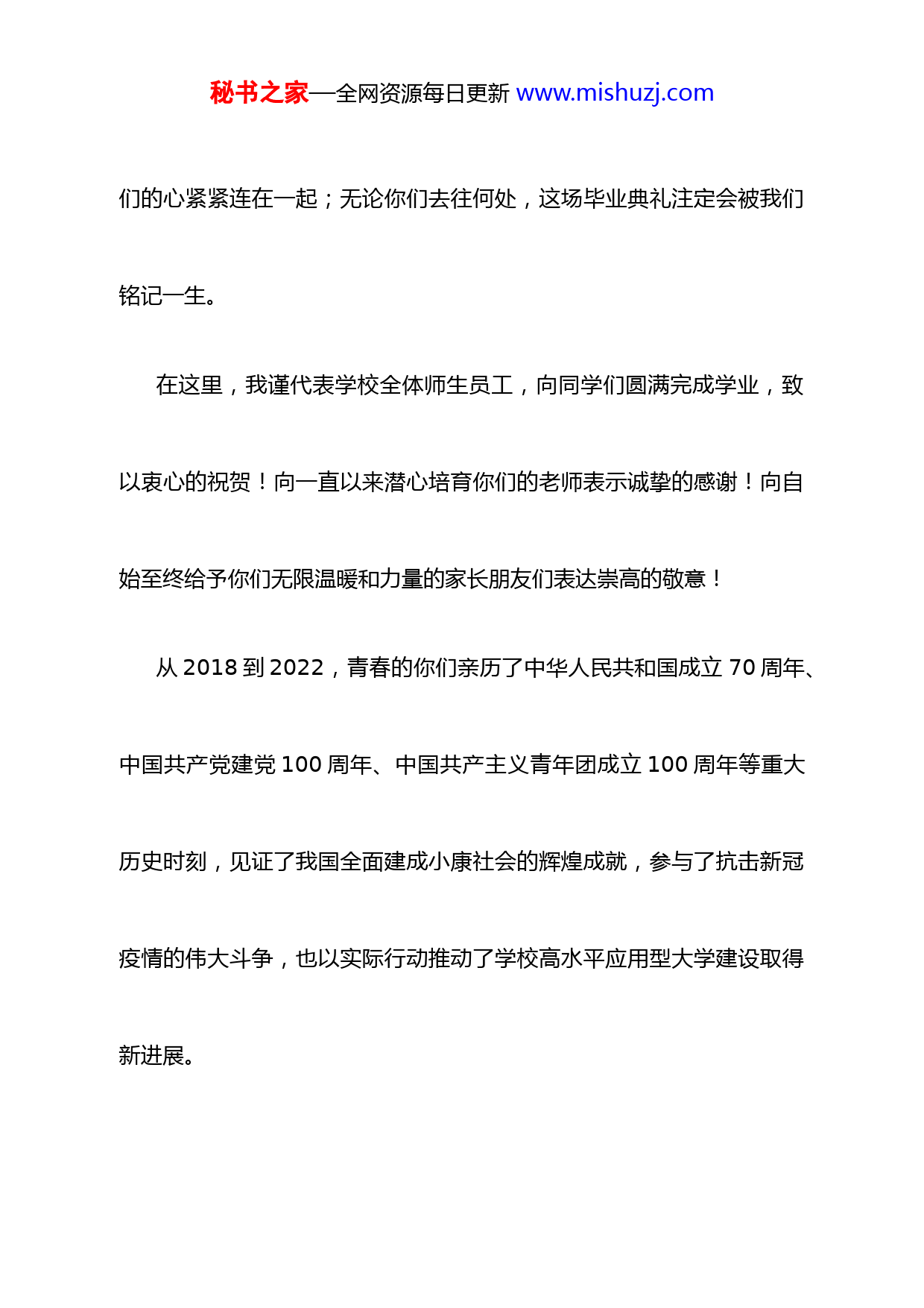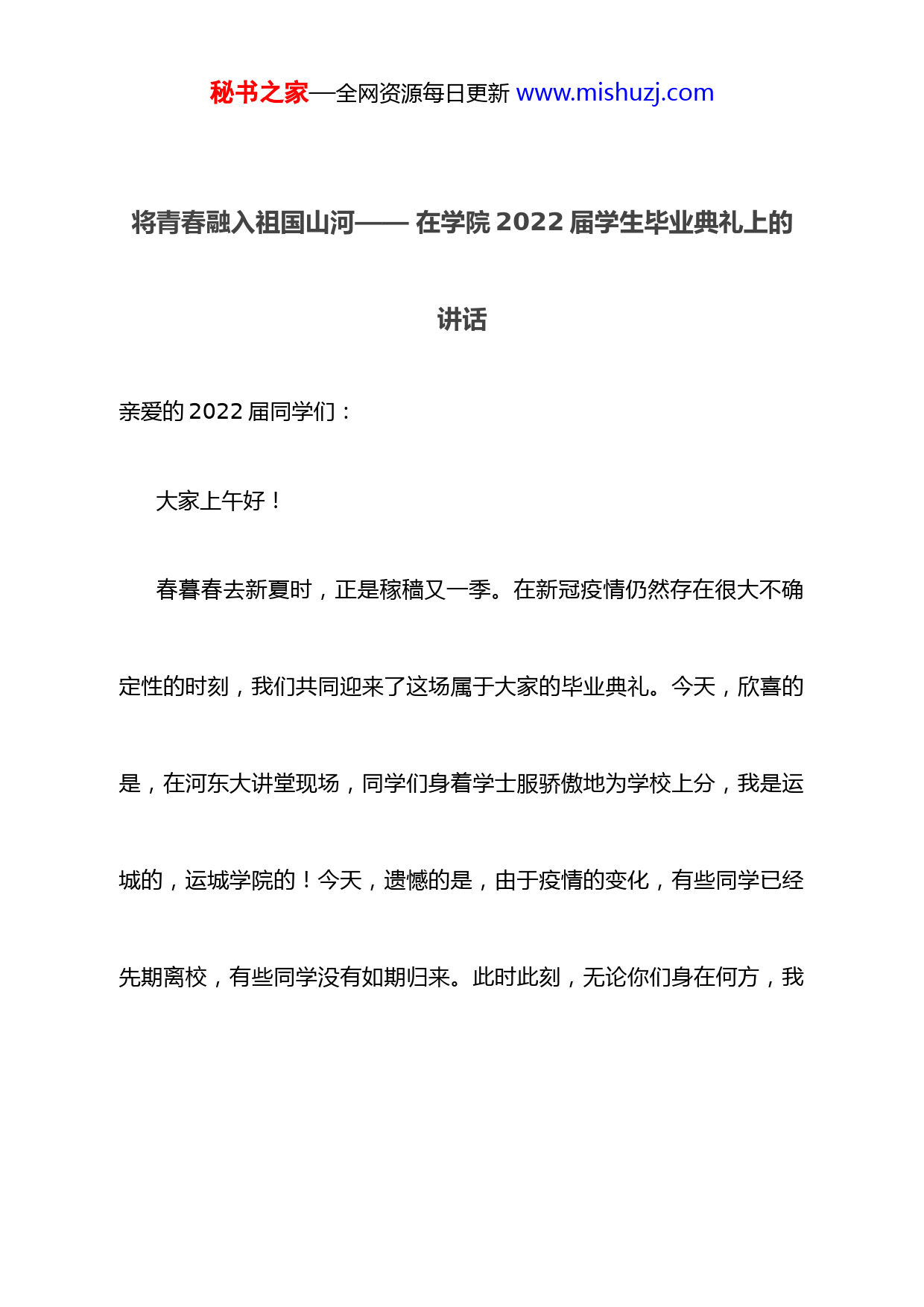 秘书之家—全网资源每日更新www.mishuzj.com将青春融入祖国山河——在学院2022届学生毕业典礼上的讲话亲爱的2022届同学们:大家上午好!春暮春去新夏时,正是稼穑又一季。在新冠疫情仍然存在很大不确定性的时刻,我们共同迎来了这场属于大家的毕业典礼。今天,欣喜的是,在河东大讲堂现场,同学们身着学士服骄傲地为学校上分,我是运城的,运城学院的!今天,遗憾的是,由于疫情的变化,有些同学已经先期离校,有些同学没有如期归来。此时此刻,无论你们身在何方,我秘书之家—全网资源每日更新www.mishuzj.com们的心紧紧连在一起;无论你们去往何处,这场毕业典礼注定会被我们铭记一生。在这里,我谨代表学校全体师生员工,向同学们圆满完成学业,致以衷心的祝贺!向一直以来潜心培育你们的老师表示诚挚的感谢!向自始至终给予你们无限温暖和力量的家长朋友们表达崇高的敬意!从2018到2022,青春的你们亲历了中华人民共和国成立70周年、中国共产党建党100周年、中国共产主义青年团成立100周年等重大历史时刻,见证了我国全面建成小康社会的辉煌成就,参与了抗击新冠疫情的伟大斗争,也以实际行动推动了学校高水平应用型大学建设取得新进展。秘书之家—全网资源每日更新www.mishuzj.com从2018到2022,当每个清晨的第一缕阳光唤醒了子夏的书简,勤奋的你们用朗朗的书声充盈了王通的墨香,勇敢的你们用奔跑的汗水浸润了健吾的赛场,坚定的你们用扎实的数据拓展了知识的界疆。你们,在校园独特的时间节奏中,习得知识,迎风成长;你们,在校园恒常的空间序列里,求真至善,执着远望。青年的命运,从来都与时代紧密相连。我们都处在一个快速迭变的世界之中。新冠疫情让我们多了一份回归常态的盼望。我们习惯了人与病例数字的互换,习惯了生活在红绿黄码之间流变。2022年以来,疫情几度逼近身边。校园内外,守望相助,所有运城学院人共同参与了防秘书之家—全网资源每日更新www.mishuzj.com疫校园保卫战,成就了学院抗疫的主题叙事,守护了属于学院人的“人间四月天”。同学们用自己的实际行动践行“立德有为”的校训,证明了“新时代的中国青年是好样的,是堪当大任的”。大家克服了校内封闭、双线上课、居家学习的各种困难和挑战,顺利完成了学业,收获了新的成长。在封校期间,中文系同学带领大家吟诵经典,行走春天,在每一个学习日常凝心炼性,从容安然;音乐系同学带领他们的乐队敲响了《生活因你而火热》的鼓点;体育系健美操专修的同学将《本草纲目》跳到了美丽的校园;更多的同学走进线上讲座论坛,领受学界大咖智慧的风采;分散在各地的同学,以志愿服务等多种方式成为很温暖可信赖的“大秘书之家—全网资源每日更新www.mishuzj.com白”。像这样的温暖和感动还有很多,它们共同构成了校园别样的春天。在这个春天,你们给予学校的理解与信任,你们表白师生的爱意与友善,你们回馈时代的叩问与挑战,都彰显了青春明亮而坚定的力量。疫情加速了大学的变革进程,战争给世界带来了更多的不确定性,“云端”正在深刻重塑社会文化及教育形态。在解决人类面临的共同难题中,大学将肩负起更大的责任。中国古人说:“万物得其本者生,百事得其道者成。”无论时代如何变迁,大学人才培养的使命没有变,人类对人文与科学精神的崇尚没有变,青年服务国家和社会的责任与担当没有变。秘书之家—全网资源每日更新www.mishuzj.com每个人都是时代的主角,每个人的青春都应该是与时代的双向奔赴。正如鲁迅先生所说,“无数的人们、无尽的远方,都和我有关”。然而,没有哪一代人的青春是容易的,一代人有一代人的使命,一代人有一代人的担当,我们必定要成长。因此,在离别之际,我想为你们送上几句嘱咐,盼望着大家在青春的赛道上奋力奔跑,争取跑出自己的最好成绩:首先,青春是行动力,做用脚步去丈量大地的实干青年没有比脚更长的路,没有比人更高的山。应对世界动荡的方法就是,用具体的方式,爱具体的人和事。同学们,愿你们充满笃定和认真的激情,对自己的事情全身心地投入,很多时候,这也许比理性、冷静的分析,更加弥足珍贵。秘书之家—全网资源每日更新www.mishuzj.com作为校长,我也经常问自己:“给刚刚毕业的大学生什么建议?”《新时代的中国青年》白皮书这样告诉大家,“把基层作为最好的课堂,把实践作为最好的老师,在磨砺中长才干、壮筋骨。”最初的几年,大多数同学为了谋生,不得不暂时做一些枯燥、乏味、自己不感兴趣的事情,这也可能会陷入情绪负面循环的怪圈。这时候,请大家鼓足勇气,用行动打破它!那么,什么是“行动力”?行动力是沉浸。希望大家专注于自己正在做的事情上,忠实地观察和记录内心的情绪、感受和反馈,在尝试的过程中,记住去感受、体验和热爱,找到属于自己的“甜蜜点”。这会是你“重生”的开始。秘书之家—全网资源每日更新www.mishuzj.com行动力是延展。希望大家调动自己的眼睛、手臂和大脑,去接触更多的可能性,打开更广阔的世界。从“日常生活的陌生化”开始,真正地去感受生活本身,像囤点鸡蛋、牛奶和蔬菜一样,去囤积能为自己提供精力和乐趣的“生活储备”,永远为自己保留15%可能性的拓展清单。行动力还是融入。希望大家主动跟更多更好的人建立良好的社会联系。在力所能及的范围内,让彼此