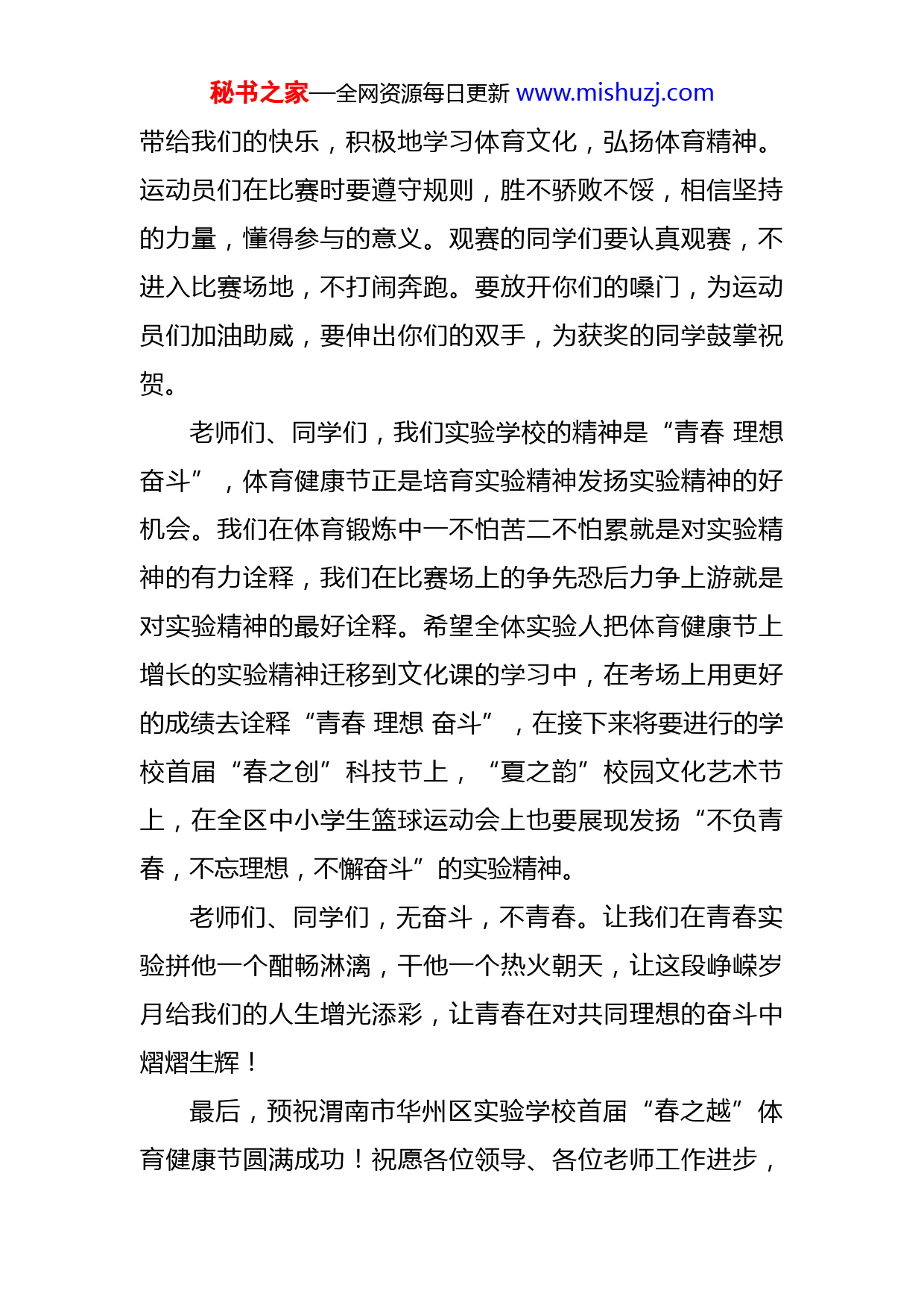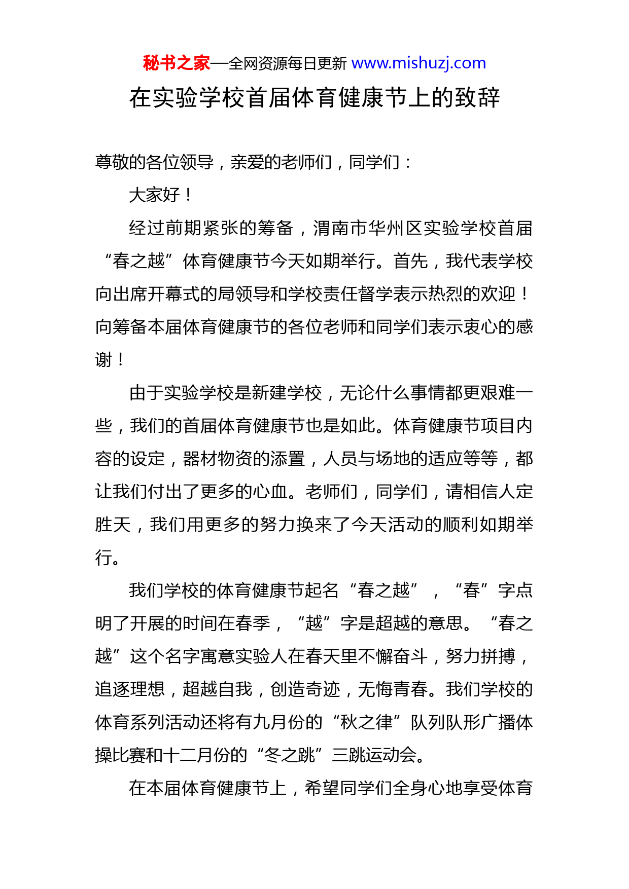 秘书之家—全网资源每日更新www.mishuzj.com在实验学校首届体育健康节上的致辞尊敬的各位领导,亲爱的老师们,同学们:大家好!经过前期紧张的筹备,渭南市华州区实验学校首届“春之越”体育健康节今天如期举行。首先,我代表学校向出席开幕式的局领导和学校责任督学表示热烈的欢迎!向筹备本届体育健康节的各位老师和同学们表示衷心的感谢!由于实验学校是新建学校,无论什么事情都更艰难一些,我们的首届体育健康节也是如此。体育健康节项目内容的设定,器材物资的添置,人员与场地的适应等等,都让我们付出了更多的心血。老师们,同学们,请相信人定胜天,我们用更多的努力换来了今天活动的顺利如期举行。我们学校的体育健康节起名“春之越”,“春”字点明了开展的时间在春季,“越”字是超越的意思。“春之越”这个名字寓意实验人在春天里不懈奋斗,努力拼搏,追逐理想,超越自我,创造奇迹,无悔青春。我们学校的体育系列活动还将有九月份的“秋之律”队列队形广播体操比赛和十二月份的“冬之跳”三跳运动会。在本届体育健康节上,希望同学们全身心地享受体育秘书之家—全网资源每日更新www.mishuzj.com带给我们的快乐,积极地学习体育文化,弘扬体育精神。运动员们在比赛时要遵守规则,胜不骄败不馁,相信坚持的力量,懂得参与的意义。观赛的同学们要认真观赛,不进入比赛场地,不打闹奔跑。要放开你们的嗓门,为运动员们加油助威,要伸出你们的双手,为获奖的同学鼓掌祝贺。老师们、同学们,我们实验学校的精神是“青春理想奋斗”,体育健康节正是培育实验精神发扬实验精神的好机会。我们在体育锻炼中一不怕苦二不怕累就是对实验精神的有力诠释,我们在比赛场上的争先恐后力争上游就是对实验精神的最好诠释。希望全体实验人把体育健康节上增长的实验精神迁移到文化课的学习中,在考场上用更好的成绩去诠释“青春理想奋斗”,在接下来将要进行的学校首届“春之创”科技节上,“夏之韵”校园文化艺术节上,在全区中小学生篮球运动会上也要展现发扬“不负青春,不忘理想,不懈奋斗”的实验精神。老师们、同学们,无奋斗,不青春。让我们在青春实验拼他一个酣畅淋漓,干他一个热火朝天,让这段峥嵘岁月给我们的人生增光添彩,让青春在对共同理想的奋斗中熠熠生辉!最后,预祝渭南市华州区实验学校首届“春之越”体育健康节圆满成功!祝愿各位领导、各位老师工作进步,秘书之家—全网资源每日更新www.mishuzj.com幸福安康!祝愿同学们健康快乐,学习进步!祝愿我们的青春实验蒸蒸日上,灿烂辉煌!我的讲话完毕,谢谢大家!