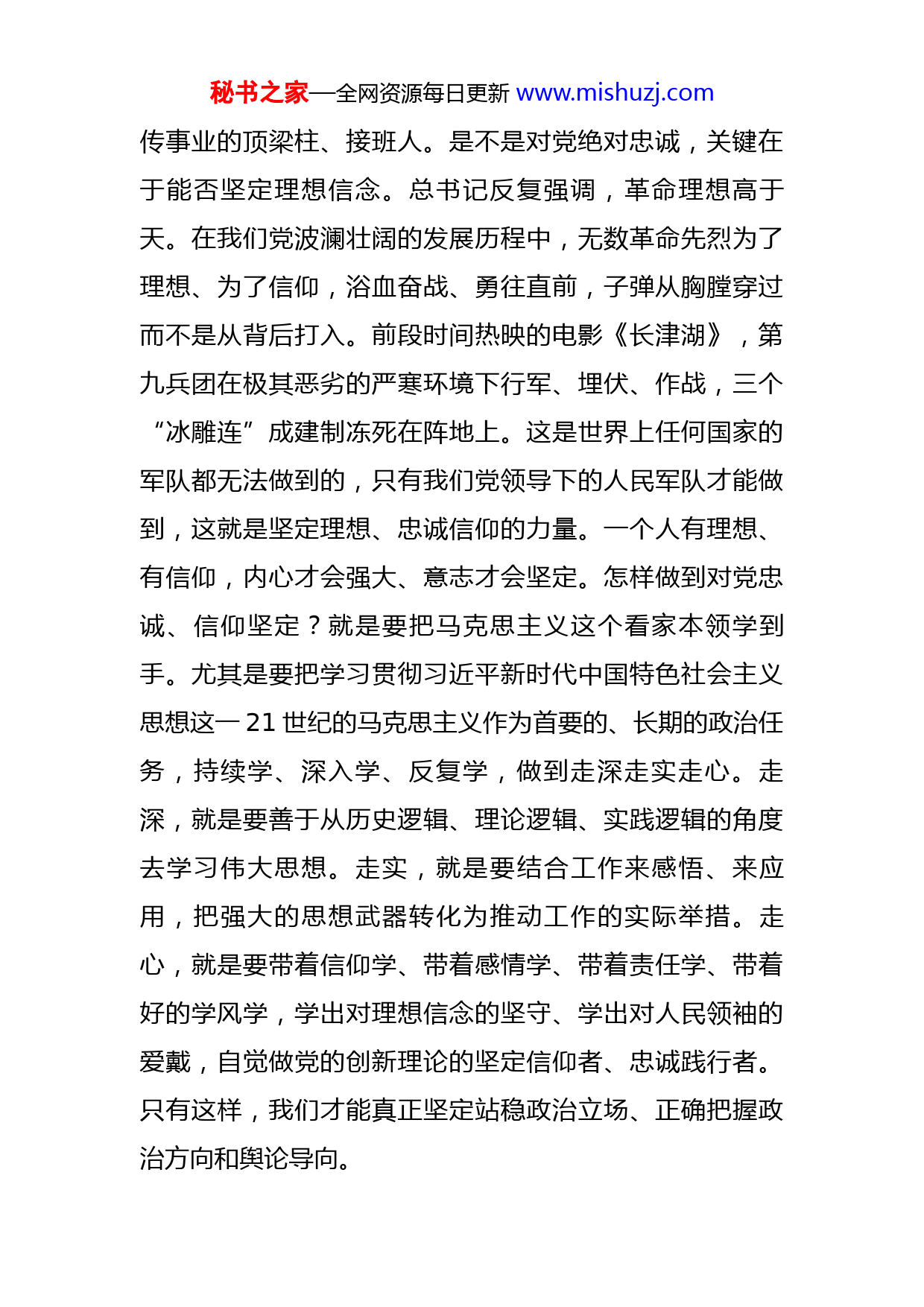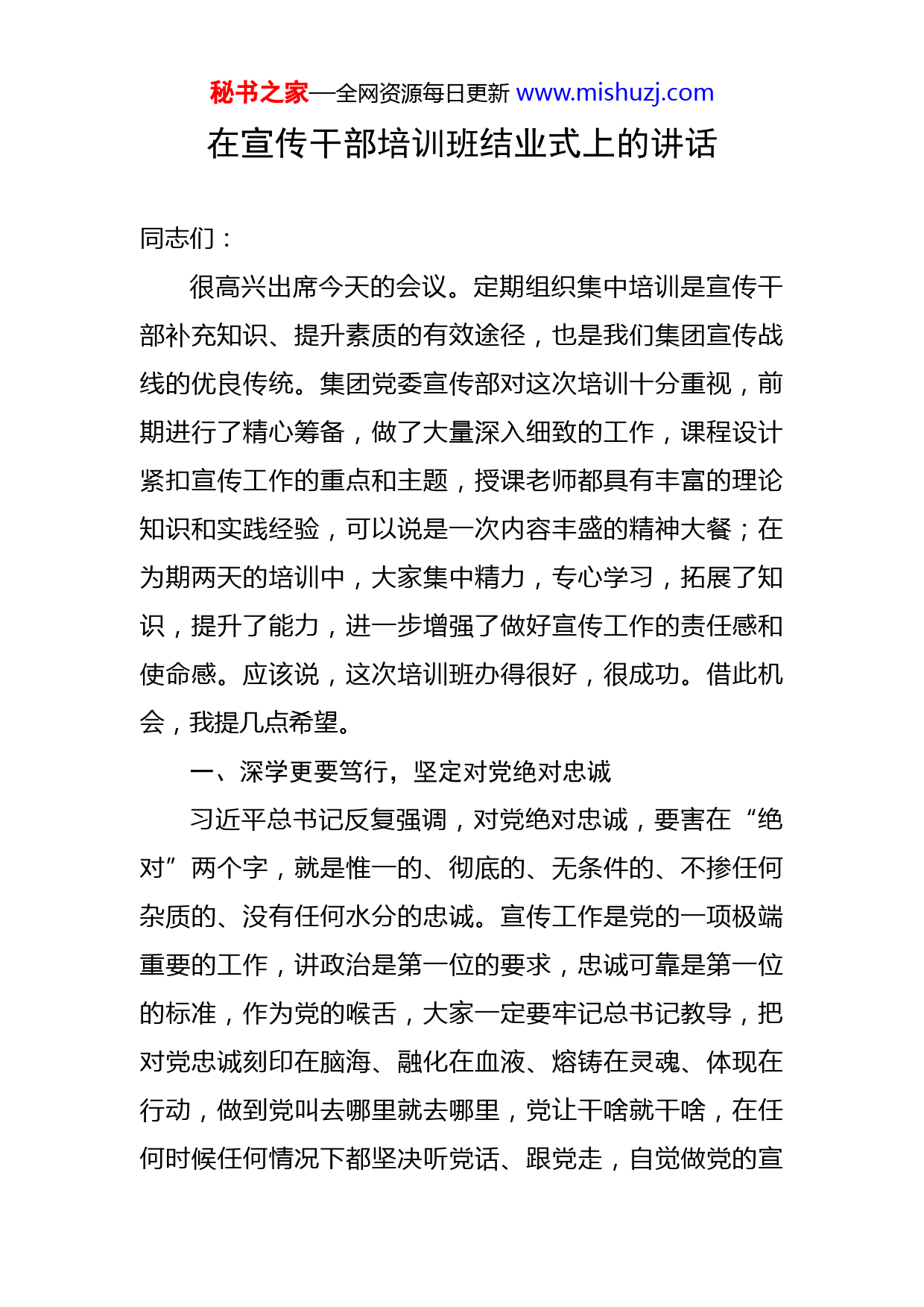 秘书之家—全网资源每日更新www.mishuzj.com在宣传干部培训班结业式上的讲话同志们:很高兴出席今天的会议。定期组织集中培训是宣传干部补充知识、提升素质的有效途径,也是我们集团宣传战线的优良传统。集团党委宣传部对这次培训十分重视,前期进行了精心筹备,做了大量深入细致的工作,课程设计紧扣宣传工作的重点和主题,授课老师都具有丰富的理论知识和实践经验,可以说是一次内容丰盛的精神大餐;在为期两天的培训中,大家集中精力,专心学习,拓展了知识,提升了能力,进一步增强了做好宣传工作的责任感和使命感。应该说,这次培训班办得很好,很成功。借此机会,我提几点希望。一、深学更要笃行,坚定对党绝对忠诚习近平总书记反复强调,对党绝对忠诚,要害在“绝对”两个字,就是惟一的、彻底的、无条件的、不掺任何杂质的、没有任何水分的忠诚。宣传工作是党的一项极端重要的工作,讲政治是第一位的要求,忠诚可靠是第一位的标准,作为党的喉舌,大家一定要牢记总书记教导,把对党忠诚刻印在脑海、融化在血液、熔铸在灵魂、体现在行动,做到党叫去哪里就去哪里,党让干啥就干啥,在任何时候任何情况下都坚决听党话、跟党走,自觉做党的宣秘书之家—全网资源每日更新www.mishuzj.com传事业的顶梁柱、接班人。是不是对党绝对忠诚,关键在于能否坚定理想信念。总书记反复强调,革命理想高于天。在我们党波澜壮阔的发展历程中,无数革命先烈为了理想、为了信仰,浴血奋战、勇往直前,子弹从胸膛穿过而不是从背后打入。前段时间热映的电影《长津湖》,第九兵团在极其恶劣的严寒环境下行军、埋伏、作战,三个“冰雕连”成建制冻死在阵地上。这是世界上任何国家的军队都无法做到的,只有我们党领导下的人民军队才能做到,这就是坚定理想、忠诚信仰的力量。一个人有理想、有信仰,内心才会强大、意志才会坚定。怎样做到对党忠诚、信仰坚定?就是要把马克思主义这个看家本领学到手。尤其是要把学习贯彻习近平新时代中国特色社会主义思想这一21世纪的马克思主义作为首要的、长期的政治任务,持续学、深入学、反复学,做到走深走实走心。走深,就是要善于从历史逻辑、理论逻辑、实践逻辑的角度去学习伟大思想。走实,就是要结合工作来感悟、来应用,把强大的思想武器转化为推动工作的实际举措。走心,就是要带着信仰学、带着感情学、带着责任学、带着好的学风学,学出对理想信念的坚守、学出对人民领袖的爱戴,自觉做党的创新理论的坚定信仰者、忠诚践行者。只有这样,我们才能真正坚定站稳政治立场、正确把握政治方向和舆论导向。秘书之家—全网资源每日更新www.mishuzj.com对党绝对忠诚不能只停留在口头上,而要落实到行动的方方面面,始终做到树牢“四个意识”、坚定“四个自信”、做到“两个维护”。尤其是对于损害党的形象和执政基础的奇谈怪论,宣传干部决不能当“隐形人”“甩手掌柜”,不能听之任之“不出头”,高高挂起作“壁上观”,随声附和成“墙头草”。正如马克思所批评的,沉默就是认同、附和就是支持。宣传队伍决不允许东食西宿的人,宣传事业也决不允许脚踩两只船。在重要问题、重大事件上,我们宣传干部必须端正态度、亮明立场,旗帜鲜明坚持真理,立场坚定批驳谬误。作为企业宣传干部,对党绝对忠诚要落脚在与集团党委保持高度一致上,做到思考问题与集团党委在同一基点上、贯彻执行与集团党委在同一直线上、思想意志与集团党委在同一声调上,坚决贯彻集团党委的决策部署、矢志不移为集团高质量发展贡献力量。二、能干更要会干,锻造过硬素质本领俗话说,绳短不能汲深井,浅水难以负大舟。宣传思想工作是专业性很强的工作,光凭一股子闯劲和满腔热情,没有高素质、好把式、真功夫是干不好的。习近平总书记多次强调,宣传干部要加强学习、加强实践,真正成为让人信服的行家里手。今天在座的都是集团宣传战线的骨干力量,也是集团宣传工作在基层单位的主要落实者、秘书之家—全网资源每日更新www.mishuzj.com推动者,更需要持续提升能力素质。一是提升观大局、看大势的能力。近期我读党史,有一个细节令人深思。红军长征过草地时,伙夫同志一起床,不问今天有没有米煮饭,却先问向南走还是向北走。炊事员的本职是做饭,有米没米非常关键,但这个故事的涵义却非常明确:在红军队伍里,即便是一名炊事员,也懂得方向问题比吃什么更重要。否则,失去方向,比有米没米严重得多。就好比,盲人骑瞎马,夜半临深池,十分危险。作为宣传干部,如果只顾低头拉车、不抬头看路,一旦偏了方向,就会犯颠覆性错误。有一句话叫“身在兵位,胸为帅谋”,作为宣传干部,站位要高、视野要宽,要善于从全局上牢牢把握事业发展的大方向、大原则、大战略,多打大算盘、算大账,对国之大者、企之要者心中有数,把眼界扩展到更大范围、更高层次,把工作放到大局中去思考、定位,脑子里多装一些全局性的问题,经常想一想全局性要求,这样才能拿出大主意、好主意,才能有大担当、有大作为,才能做到既为一域争光、更为全局添彩。二是提升筑同心、聚合力的能力。统一思想、凝聚力量是宣传工作的中心环节,也是我们工作的目标所在。具体到集团,实现建成世界一流企业的目标,没有广大干