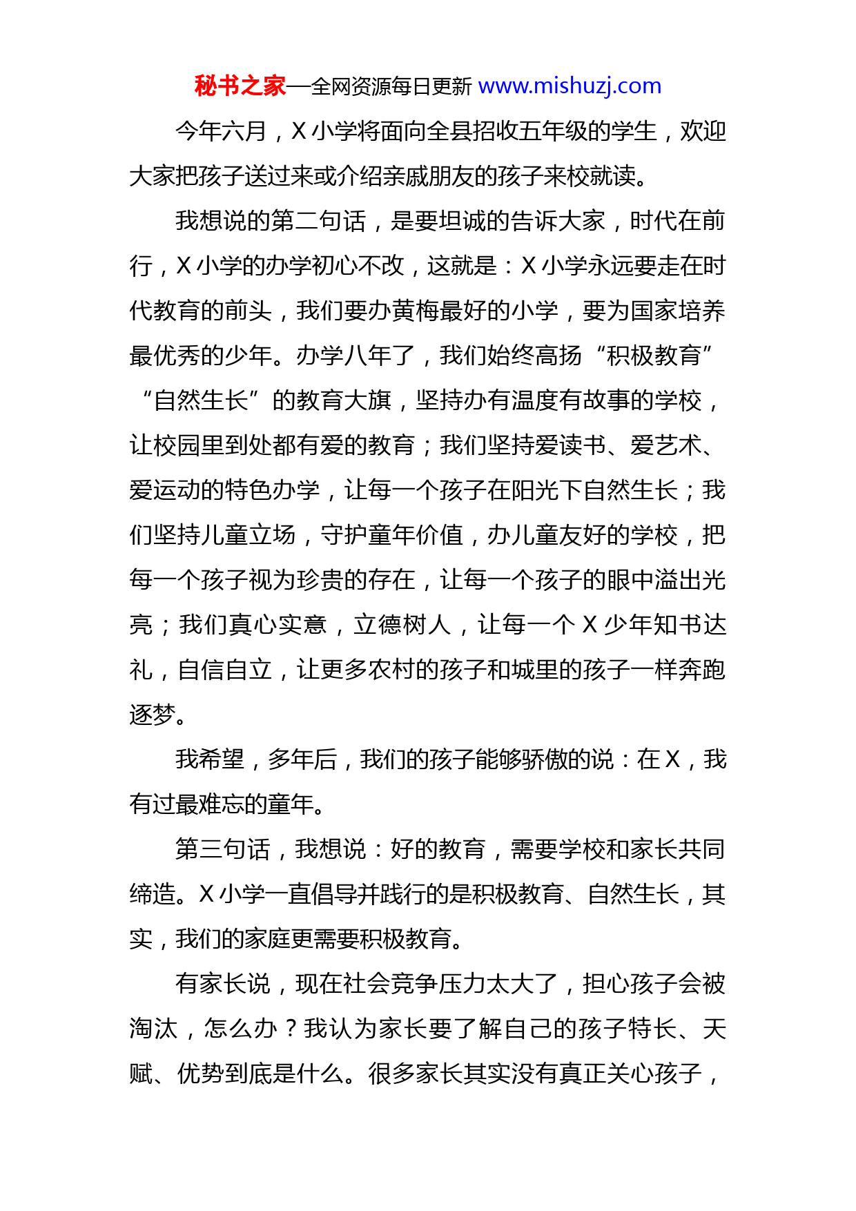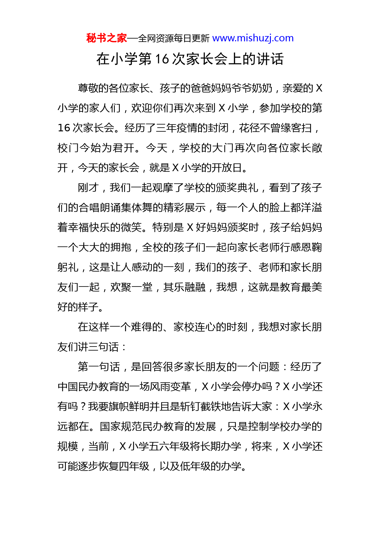 秘书之家—全网资源每日更新www.mishuzj.com在小学第16次家长会上的讲话尊敬的各位家长、孩子的爸爸妈妈爷爷奶奶,亲爱的X小学的家人们,欢迎你们再次来到X小学,参加学校的第16次家长会。经历了三年疫情的封闭,花径不曾缘客扫,校门今始为君开。今天,学校的大门再次向各位家长敞开,今天的家长会,就是X小学的开放日。刚才,我们一起观摩了学校的颁奖典礼,看到了孩子们的合唱朗诵集体舞的精彩展示,每一个人的脸上都洋溢着幸福快乐的微笑。特别是X好妈妈颁奖时,孩子给妈妈一个大大的拥抱,全校的孩子们一起向家长老师行感恩鞠躬礼,这是让人感动的一刻,我们的孩子、老师和家长朋友们一起,欢聚一堂,其乐融融,我想,这就是教育最美好的样子。在这样一个难得的、家校连心的时刻,我想对家长朋友们讲三句话:第一句话,是回答很多家长朋友的一个问题:经历了中国民办教育的一场风雨变革,X小学会停办吗?X小学还有吗?我要旗帜鲜明并且是斩钉截铁地告诉大家:X小学永远都在。国家规范民办教育的发展,只是控制学校办学的规模,当前,X小学五六年级将长期办学,将来,X小学还可能逐步恢复四年级,以及低年级的办学。秘书之家—全网资源每日更新www.mishuzj.com今年六月,X小学将面向全县招收五年级的学生,欢迎大家把孩子送过来或介绍亲戚朋友的孩子来校就读。我想说的第二句话,是要坦诚的告诉大家,时代在前行,X小学的办学初心不改,这就是:X小学永远要走在时代教育的前头,我们要办黄梅最好的小学,要为国家培养最优秀的少年。办学八年了,我们始终高扬“积极教育”“自然生长”的教育大旗,坚持办有温度有故事的学校,让校园里到处都有爱的教育;我们坚持爱读书、爱艺术、爱运动的特色办学,让每一个孩子在阳光下自然生长;我们坚持儿童立场,守护童年价值,办儿童友好的学校,把每一个孩子视为珍贵的存在,让每一个孩子的眼中溢出光亮;我们真心实意,立德树人,让每一个X少年知书达礼,自信自立,让更多农村的孩子和城里的孩子一样奔跑逐梦。我希望,多年后,我们的孩子能够骄傲的说:在X,我有过最难忘的童年。第三句话,我想说:好的教育,需要学校和家长共同缔造。X小学一直倡导并践行的是积极教育、自然生长,其实,我们的家庭更需要积极教育。有家长说,现在社会竞争压力太大了,担心孩子会被淘汰,怎么办?我认为家长要了解自己的孩子特长、天赋、优势到底是什么。很多家长其实没有真正关心孩子,秘书之家—全网资源每日更新www.mishuzj.com而是只关心学校的标准是什么。如果你的孩子,并不是一个上名校读博士的材料,但你却希望他读博士,仅仅是因为他成绩好,老师同学都说好,那你其实就是对不起孩子,而且会伤害孩子。如果你的孩子,他的特长是做技术工作,那么这个工作本身就有意义和价值。我还有一个重要的提醒,就是我们在关注孩子的身体健康和学业发展的同时,还要培养孩子接受挫折的心态。成长过程中那种耐磨、耐抗、耐挫折的能力,对孩子特别重要。很多人即使做得很成功,但一受打击立马崩溃,所有的成功都成为泡影。所以这种耐磨、耐抗、耐挫折的能力培养也是非常重要的。为什么很多国家会提倡孩子参加竞技体育比赛,他们不是为了奖牌,而是为了磨练孩子的心态。因为比赛有赢有输,我们不可能总是赢,有的时候还要学会输。“输”会让孩子产生一种心理的保护机制,将来在人生中间,遇到挫折、打击、失落的时候能够熬得过来、挺得过去,而且挫折之后还能不断成长。以上这些正是家庭积极教育所表达的主张,在当下社会很有意义。我希望X的家长都能做积极的家长,因为X小学是一所积极的学校,老师积极,家长积极,我们就能培养出幸福的孩子。我相信,好的教育,在于学校和家庭的共同缔造,家校连心,家校联盟,我们的教育就会更加美好!秘书之家—全网资源每日更新www.mishuzj.com亲爱的家长朋友们,记得八年前,X小学开办第一天的家长会上,我向家长们承诺过一句话,今天,我作为校长把这句话再次向家长表白,并作为我今天讲话的结束语——你把家庭的希望和未来托付给我们,我们将用真心和责任来回报家长。谢谢大家!