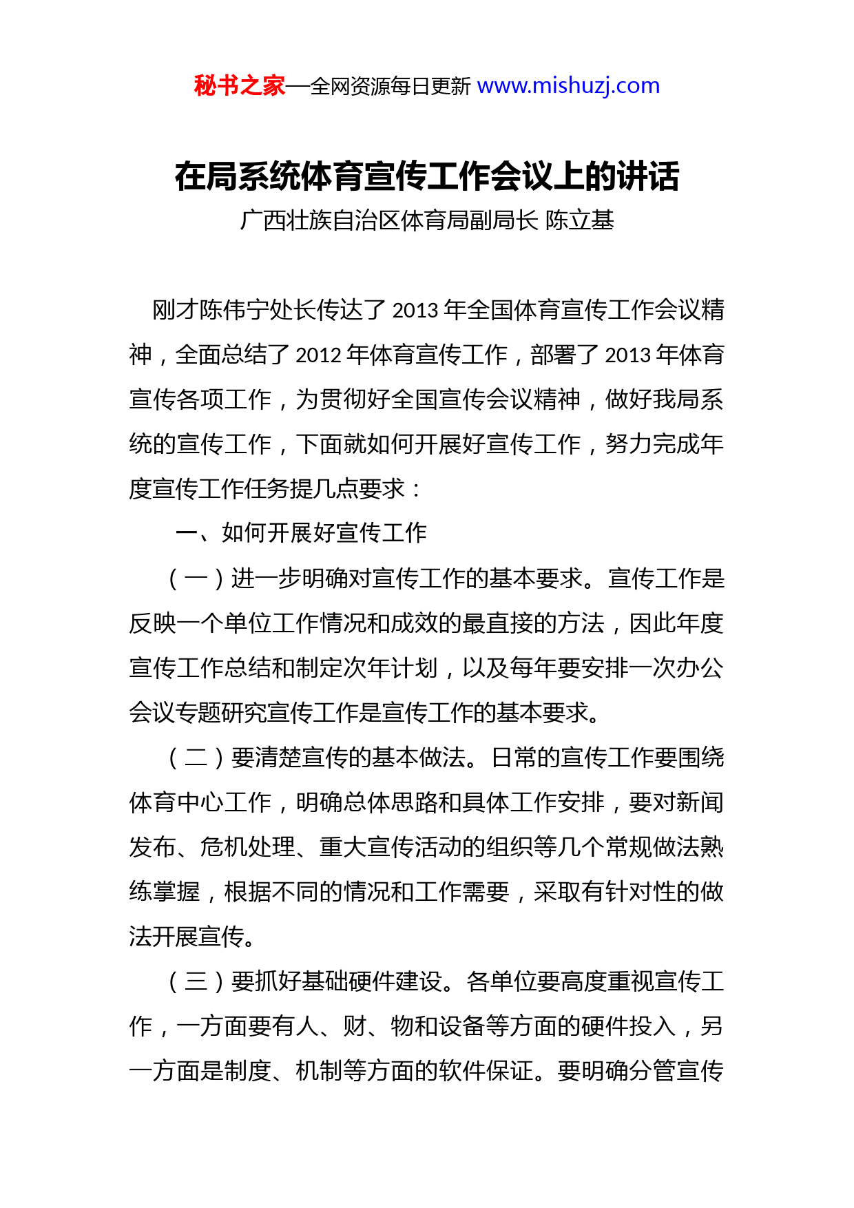 秘书之家—全网资源每日更新www.mishuzj.com在局系统体育宣传工作会议上的讲话广西壮族自治区体育局副局长陈立基刚才陈伟宁处长传达了2013年全国体育宣传工作会议精神,全面总结了2012年体育宣传工作,部署了2013年体育宣传各项工作,为贯彻好全国宣传会议精神,做好我局系统的宣传工作,下面就如何开展好宣传工作,努力完成年度宣传工作任务提几点要求:一、如何开展好宣传工作(一)进一步明确对宣传工作的基本要求。宣传工作是反映一个单位工作情况和成效的最直接的方法,因此年度宣传工作总结和制定次年计划,以及每年要安排一次办公会议专题研究宣传工作是宣传工作的基本要求。(二)要清楚宣传的基本做法。日常的宣传工作要围绕体育中心工作,明确总体思路和具体工作安排,要对新闻发布、危机处理、重大宣传活动的组织等几个常规做法熟练掌握,根据不同的情况和工作需要,采取有针对性的做法开展宣传。(三)要抓好基础硬件建设。各单位要高度重视宣传工作,一方面要有人、财、物和设备等方面的硬件投入,另一方面是制度、机制等方面的软件保证。要明确分管宣传秘书之家—全网资源每日更新www.mishuzj.com有关人员,落实相关基础配置,把宣传工作落到实处。(四)加强宣传协调,形成宣传大格局。宣传工作不单是宣传部门的事情,需各单位各部门协调与配合,分头负责,形成合力。(五)要掌握宣传的基本方法。要做好宣传工作的策划,掌握应对社会舆论的本领,引导舆论导向,要注意突出宣传重点和节奏,达到最佳效果。(六)明确宣传工作任务。宣传必须围绕本单位中心工作,结合工作特点和发展需要,找准定位,才能有针对性开展工作,才能对工作起到很好的推进作用。二、工作要求:(一)要深入学习宣传贯彻党的十八大精神,按照中央和自治区的统一部署,充分展现体育事业凝聚人心、鼓舞士气的积极作用,营造体育积极健康的正面形象。(二)继续做好全民健身宣传。推动全民健身事业大发展是体育部门落实十八大精神的具体体现之一,要开展各种形式的宣传活动,宣传各地贯彻落实《全民健身条件》和《全民健身计划》的情况,反映群众身边场地设施建设、健身科学指导、全民健身活动的开展情况。要继续深化全民健身报道主题,丰富报道题材和形式,创新报道手法,尝试使用新媒体,提高全民健身报道的传播力和影响力。秘书之家—全网资源每日更新www.mishuzj.com(三)积极做好第十二届全运会的新闻宣传工作。全运会宣传工作开展好与不好,直接关系到全运会的成败,我们一定要做好代表团参赛的新闻宣传工作,按照总局的要求各代表团要落实新闻发言人和新闻联络员,紧密联系新闻单位,及时了解各种报道动态,妥善处理采访事宜。同时各参赛队伍要做好突发事件的应急预案,要认真分析舆情找准舆论的关注点、社会心理的倾向性以及我们工作中客观存在的问题,采取适当的态度应对外部舆论。一旦发生突发事件,要及时报告,谨慎应对。(四)要创新手段,丰富形式,充分展现体育的文化内涵国家体育总局下发了加强体育文化建设的意见,希望各单位认真按照要求组织落实,我们要不断挖掘和整理体育文化内涵,提升体育软实力,丰富广西体育精神内涵,为建设体育强区奠定坚实的基础。(五)要组织好年度体育赛事的日常报道。要切实做好年度各项赛事的宣传报道工作,要将相关赛事的宣传与推广摆上重要位置予以考虑,明确宣传报道重点,规范赛事的媒体服务标准,提高组织办赛水平。(六)要继续做好相关人员使用微博客等自媒体的教育管理工作。我局于去年12月7日制定下发了《广西壮族自治区体育局系统微博客管理办法》,2013年1月1日起施行。各单位要按照《管理办法》要求。加强对相关人员、特别秘书之家—全网资源每日更新www.mishuzj.com是各运动队运动员、教练员和工作人员的教育和引导,避免因发布不当造成的不良后果。同志们,体育宣传工作艰巨而光荣,我们要充分认识体育宣传的重要性,大家一定要提高做好宣传工作自觉性和工作本领,脚踏实地,务实创新,为建设体育强区作出应有的贡献。