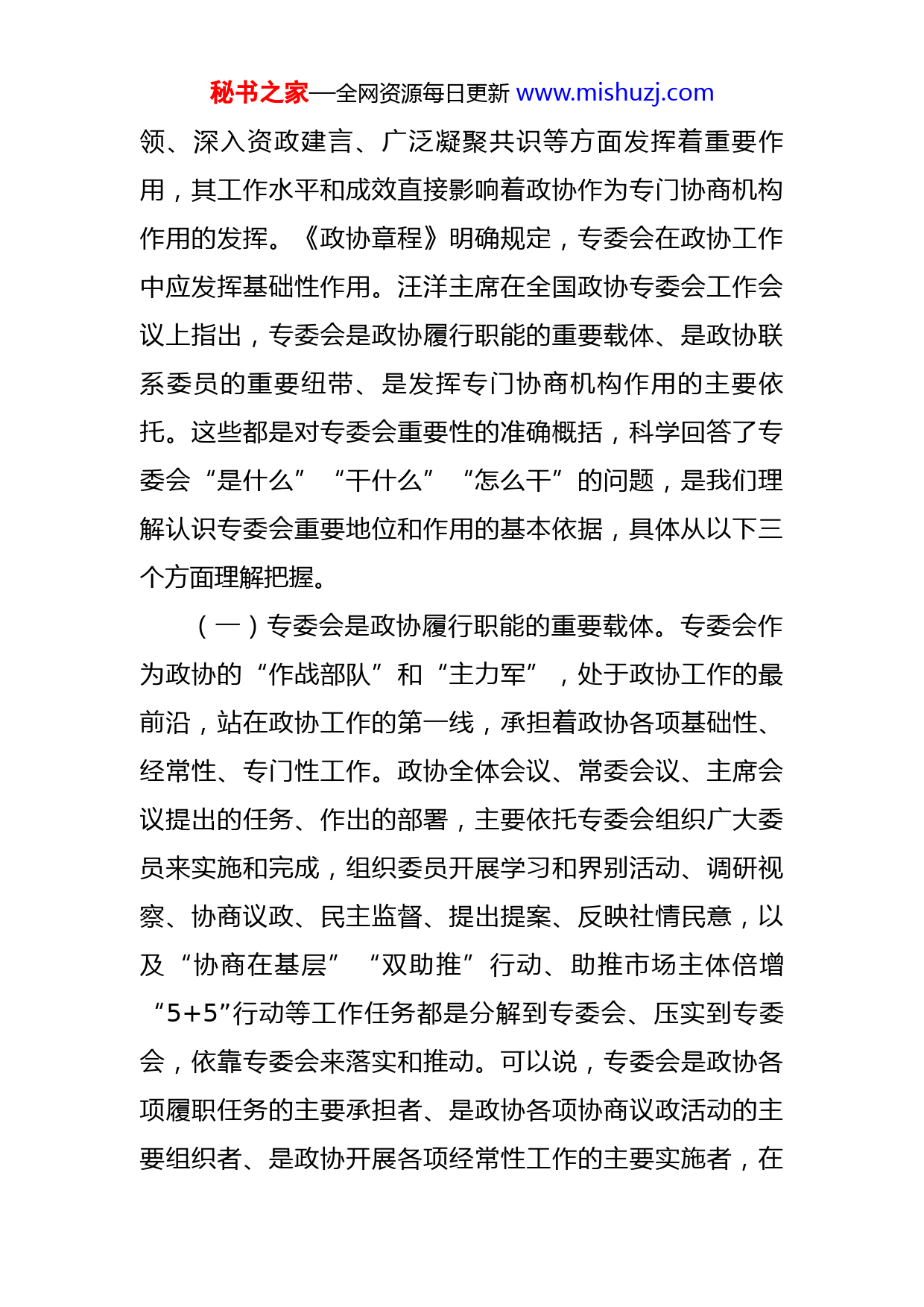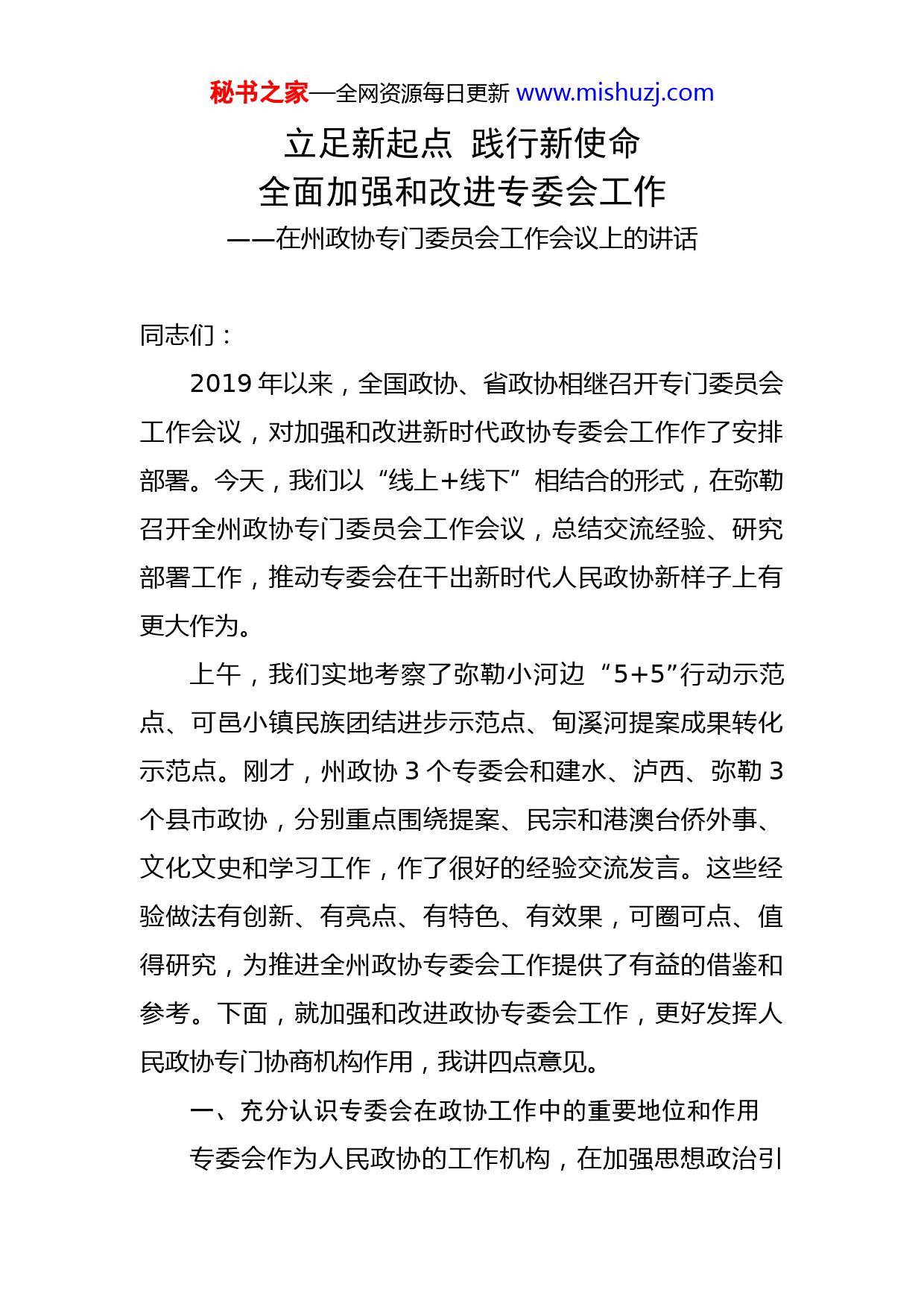 秘书之家—全网资源每日更新www.mishuzj.com立足新起点践行新使命全面加强和改进专委会工作——在州政协专门委员会工作会议上的讲话同志们:2019年以来,全国政协、省政协相继召开专门委员会工作会议,对加强和改进新时代政协专委会工作作了安排部署。今天,我们以“线上+线下”相结合的形式,在弥勒召开全州政协专门委员会工作会议,总结交流经验、研究部署工作,推动专委会在干出新时代人民政协新样子上有更大作为。上午,我们实地考察了弥勒小河边“5+5”行动示范点、可邑小镇民族团结进步示范点、甸溪河提案成果转化示范点。刚才,州政协3个专委会和建水、泸西、弥勒3个县市政协,分别重点围绕提案、民宗和港澳台侨外事、文化文史和学习工作,作了很好的经验交流发言。这些经验做法有创新、有亮点、有特色、有效果,可圈可点、值得研究,为推进全州政协专委会工作提供了有益的借鉴和参考。下面,就加强和改进政协专委会工作,更好发挥人民政协专门协商机构作用,我讲四点意见。一、充分认识专委会在政协工作中的重要地位和作用专委会作为人民政协的工作机构,在加强思想政治引秘书之家—全网资源每日更新www.mishuzj.com领、深入资政建言、广泛凝聚共识等方面发挥着重要作用,其工作水平和成效直接影响着政协作为专门协商机构作用的发挥。《政协章程》明确规定,专委会在政协工作中应发挥基础性作用。汪洋主席在全国政协专委会工作会议上指出,专委会是政协履行职能的重要载体、是政协联系委员的重要纽带、是发挥专门协商机构作用的主要依托。这些都是对专委会重要性的准确概括,科学回答了专委会“是什么”“干什么”“怎么干”的问题,是我们理解认识专委会重要地位和作用的基本依据,具体从以下三个方面理解把握。(一)专委会是政协履行职能的重要载体。专委会作为政协的“作战部队”和“主力军”,处于政协工作的最前沿,站在政协工作的第一线,承担着政协各项基础性、经常性、专门性工作。政协全体会议、常委会议、主席会议提出的任务、作出的部署,主要依托专委会组织广大委员来实施和完成,组织委员开展学习和界别活动、调研视察、协商议政、民主监督、提出提案、反映社情民意,以及“协商在基层”“双助推”行动、助推市场主体倍增“5+5”行动等工作任务都是分解到专委会、压实到专委会,依靠专委会来落实和推动。可以说,专委会是政协各项履职任务的主要承担者、是政协各项协商议政活动的主要组织者、是政协开展各项经常性工作的主要实施者,在秘书之家—全网资源每日更新www.mishuzj.com政协履职中有着举足轻重的地位。(二)专委会是联系委员的重要纽带。“全员入委”以来,专委会不仅由委员组成,还分别联系着不同界别的委员。离委员最近的是专委会,与委员的联系最直接、最紧密的是专委会,对委员的基本情况和专业专长最了解、最熟悉还是专委会,专委会成为了党委、政府、政协与委员及界别群众之间沟通联系的重要桥梁和纽带,担负着把委员引导好、组织好、动员好的重要职责,担负着凝聚委员共识、组织委员建言资政的重要任务。今年以来,我们以“双优品牌”创建为抓手,深入开展联系服务委员和界别群众工作,引领州县(市)两级3028名委员与9084名界别群众建立联系机制,建立委员工作室45个,更加强化了专委会作为委员知情民政、参政议政、凝聚共识重要平台和渠道的作用。(三)专委会是发挥专门协商机构作用的主要依托。人民政协是专门协商机构,而专委会作为“专门中的专门,机构中的机构”,是政协开展协商活动的责任主体,是政协协商专业能力和水平的关键因素。从全会协商、专题议政性常委会协商、主席会议协商,到双月协商、对口协商、界别协商、提案办理协商、远程协商等,都是由专委会具体组织、承办和实施。2018年以来,州政协共开展重点协商活动48次,全部由专委会直接承办,向州委州政秘书之家—全网资源每日更新www.mishuzj.com府报送调研视察视察报告、协商意见54件,其中专委会完成的有52件、占96%。这些数据充分说明,政协专门协商机构作用的发挥,很大程度取决于专委会的工作及其成效,只有把专委会工作能力水平提升了、特色优势彰显了、质量标准提高了,才能充分发挥出来。二、充分肯定专委会为全州政协事业发展做出的重要贡献州政协成立60多年来,专委会经历了从无到有,不断调整、规范、完善的过程。一届政协未建立常设办事机构,二届政协设两委一处(文史资料委员会、学习委员会、秘书处),五届政协设9个工作组、4个委员会,六届政协改工作组为专委会,改变委组并存局面,设五委一室(办公室和经济科技、提案、学习文史、联络、教文卫体5个专委会)。2000年以来,随着国家治理体系的变革发展和工作需要,全州政协系统内设机构设置及职能不断调整优化,州政协经历4次调整后设为“八委两室”,13县市政协设为“七委一室”,与省政协“九委一厅一室”的设置基本对应。州、县市政协专委会自成立以来,积极适应州委、州政府中心任务的需要,顺应政协事业发展的规律,组织结构不断健全、职能任务不断拓展、履职方式不断规范、制度建设不断健全,在推进全州政协事业创新发展中,作出秘书之家—全网资源每日更新www.mishuzj.com了重要贡献