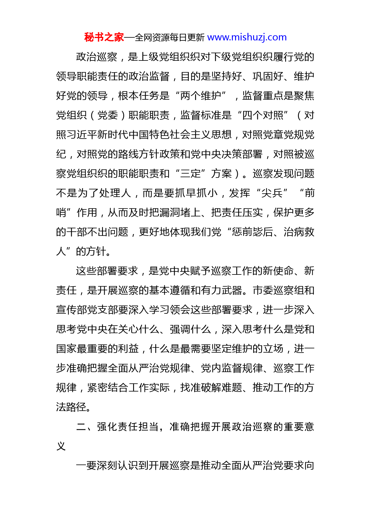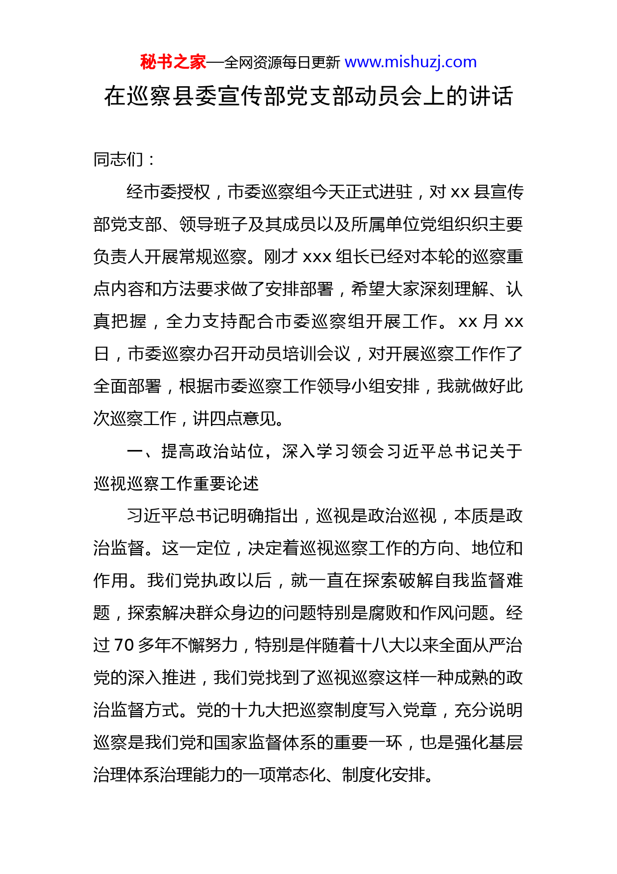 秘书之家—全网资源每日更新www.mishuzj.com在巡察县委宣传部党支部动员会上的讲话同志们:经市委授权,市委巡察组今天正式进驻,对xx县宣传部党支部、领导班子及其成员以及所属单位党组织织主要负责人开展常规巡察。刚才xxx组长已经对本轮的巡察重点内容和方法要求做了安排部署,希望大家深刻理解、认真把握,全力支持配合市委巡察组开展工作。xx月xx日,市委巡察办召开动员培训会议,对开展巡察工作作了全面部署,根据市委巡察工作领导小组安排,我就做好此次巡察工作,讲四点意见。一、提高政治站位,深入学习领会习近平总书记关于巡视巡察工作重要论述习近平总书记明确指出,巡视是政治巡视,本质是政治监督。这一定位,决定着巡视巡察工作的方向、地位和作用。我们党执政以后,就一直在探索破解自我监督难题,探索解决群众身边的问题特别是腐败和作风问题。经过70多年不懈努力,特别是伴随着十八大以来全面从严治党的深入推进,我们党找到了巡视巡察这样一种成熟的政治监督方式。党的十九大把巡察制度写入党章,充分说明巡察是我们党和国家监督体系的重要一环,也是强化基层治理体系治理能力的一项常态化、制度化安排。秘书之家—全网资源每日更新www.mishuzj.com政治巡察,是上级党组织织对下级党组织织履行党的领导职能责任的政治监督,目的是坚持好、巩固好、维护好党的领导,根本任务是“两个维护”,监督重点是聚焦党组织(党委)职能职责,监督标准是“四个对照”(对照习近平新时代中国特色社会主义思想,对照党章党规党纪,对照党的路线方针政策和党中央决策部署,对照被巡察党组织织的职能职责和“三定”方案)。巡察发现问题不是为了处理人,而是要抓早抓小,发挥“尖兵”“前哨”作用,从而及时把漏洞堵上、把责任压实,保护更多的干部不出问题,更好地体现我们党“惩前毖后、治病救人”的方针。这些部署要求,是党中央赋予巡察工作的新使命、新责任,是开展巡察的基本遵循和有力武器。市委巡察组和宣传部党支部要深入学习领会这些部署要求,进一步深入思考党中央在关心什么、强调什么,深入思考什么是党和国家最重要的利益,什么是最需要坚定维护的立场,进一步准确把握全面从严治党规律、党内监督规律、巡察工作规律,紧密结合工作实际,找准破解难题、推动工作的方法路径。二、强化责任担当,准确把握开展政治巡察的重要意义一要深刻认识到开展巡察是推动全面从严治党要求向秘书之家—全网资源每日更新www.mishuzj.com基层延伸的必要之举。“严”是新时代管党治党的鲜明特征。市委授权开展巡察,是推进全面从严治党向基层延伸的具体实践,也是高质量推动市委巡察全覆盖的重要举措。本次对6个县职能部门党组织进行巡察是经市委巡察工作领导小组研究并报市委批准的,这既是对6个党组织加强党的领导、党的建设、全面从严治党以及党风廉政建设和反腐败工作的政治体检和有力促进,也是推进全面从严治党向基层延伸的重要抓手。为此,我们要切实把思想和行动统一到习近平总书记关于巡视巡察重要论述上来,统一到省委和市委工作要求上来,充分认识开展巡察的重大意义和重要作用,增强责任感使命感,充分发挥巡视巡察的优势,精准发现问题、推动解决问题。二要深刻认识到开展巡察是督促被巡察党组织履行职能职责的必要之举。学习宣传贯彻会议精神特别是习近平总书记重要讲话精神,是当前和今后一个时期一项重大政治任务。同时,今年是“十四五”规划关键之年,同时又面临着新冠肺炎疫情影响这道“加试题”,这是当前的大局、大事、大考。因此,巡察组要把被巡察单位学习宣传落实疫情防控、高质量发展等各项工作作为巡察重点,注重查找党组织织、党员干部与新时代新形势新要求不相适应的短板弱项,着力推动解决不会为、不善为、不作为、乱作为等突出问题,督促跟进党中央部署要求、跟上时代秘书之家—全网资源每日更新www.mishuzj.com前进步伐、适应事业发展需要,更好履行职责使命,确保各项工作始终沿着习近平总书记指引的正确方向前进。三、自觉接受监督,全力配合巡察组开展工作一要主动做好配合。市委安排此次巡察,是对xx县宣传部和全体党员干部的一次“政治体检”、政治考验,是帮助同志们进一步找差距、补短板、促落实,体现了市委对广大宣传干部的政治关爱。希望同志们理解市委良苦用心,积极配合协助巡察组开展工作。巡察不仅是巡察机构一家的事,离不开被巡察党组织和广大党员干部群众的全力支持配合。xx县宣传部党支部要按照《中国共产党巡视工作条例》和《中国共产党纪律处分条例》的要求,畅通巡察组同各个层面干部群众接触、接访、沟通的渠道,积极配合做好个别谈话、实地调研、档案查阅等工作,让巡察组充分了解和掌握本单位的真实情况。二要主动接受监督。《中国共产党巡视工作条例》规定,被巡察党组织织必须积极主动、客观公正、实事求是地向巡察组汇报工作;党员有义务向巡察组如实反映情况和问题。宣传部党支部及所辖各级党组织织和党员干部,要真正把巡察监督当作是关心、考验和爱护,决不能消极对待,置身于巡察监督之外。巡察期间,凡是对阻挠、干扰巡察工作或无正当理由拒不提供相关资料,以及设置障碍影响巡察