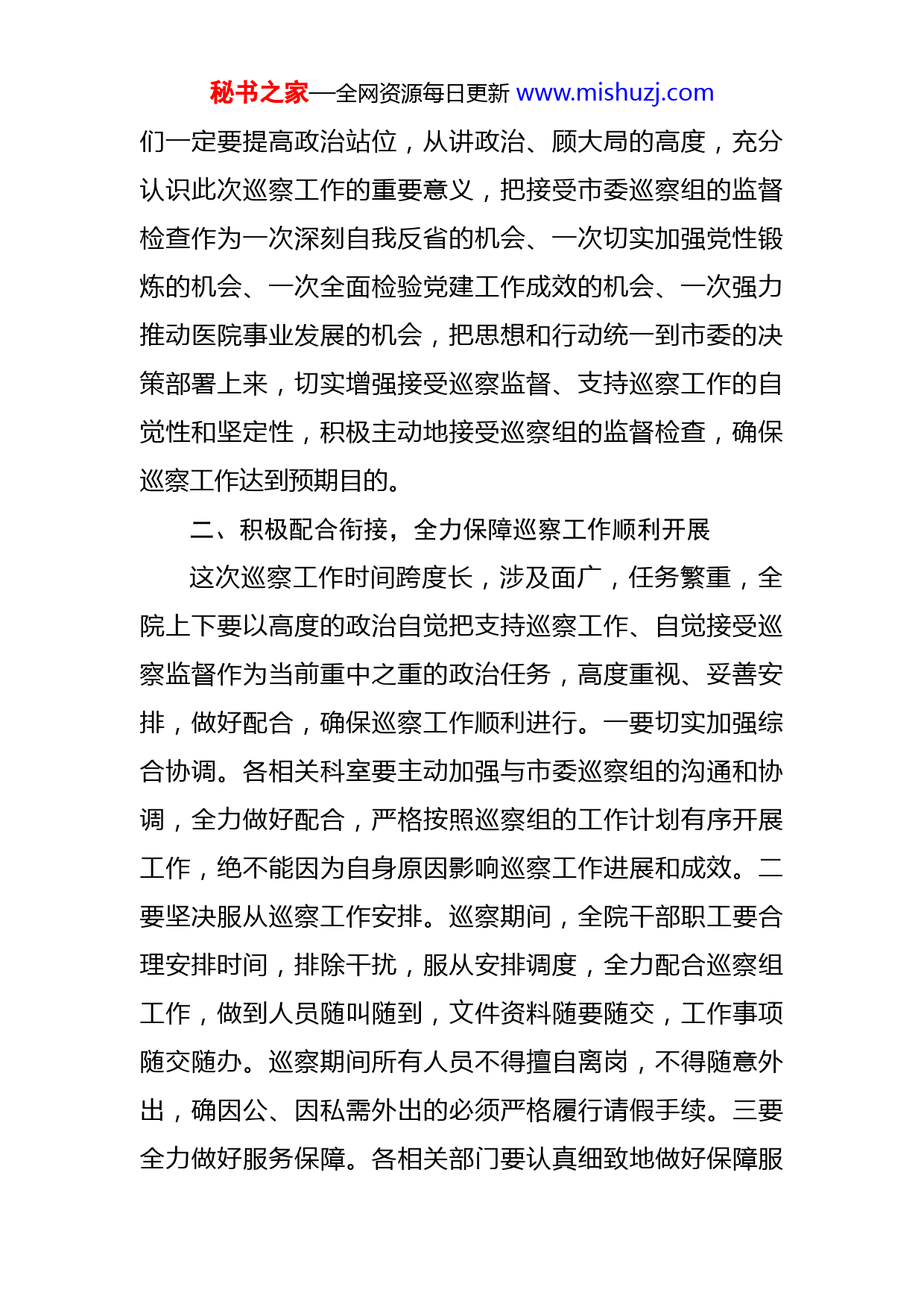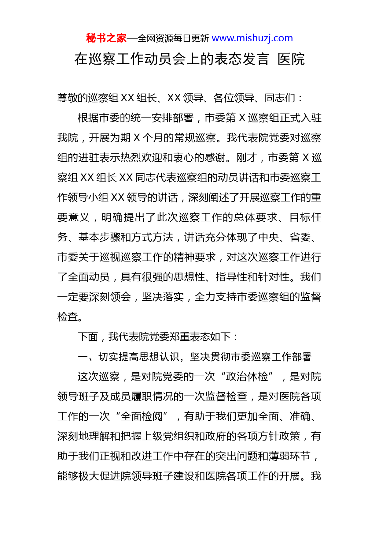 秘书之家—全网资源每日更新www.mishuzj.com在巡察工作动员会上的表态发言医院尊敬的巡察组XX组长、XX领导、各位领导、同志们:根据市委的统一安排部署,市委第X巡察组正式入驻我院,开展为期X个月的常规巡察。我代表院党委对巡察组的进驻表示热烈欢迎和衷心的感谢。刚才,市委第X巡察组XX组长XX同志代表巡察组的动员讲话和市委巡察工作领导小组XX领导的讲话,深刻阐述了开展巡察工作的重要意义,明确提出了此次巡察工作的总体要求、目标任务、基本步骤和方式方法,讲话充分体现了中央、省委、市委关于巡视巡察工作的精神要求,对这次巡察工作进行了全面动员,具有很强的思想性、指导性和针对性。我们一定要深刻领会,坚决落实,全力支持市委巡察组的监督检查。下面,我代表院党委郑重表态如下:一、切实提高思想认识,坚决贯彻市委巡察工作部署这次巡察,是对院党委的一次“政治体检”,是对院领导班子及成员履职情况的一次监督检查,是对医院各项工作的一次“全面检阅”,有助于我们更加全面、准确、深刻地理解和把握上级党组织和政府的各项方针政策,有助于我们正视和改进工作中存在的突出问题和薄弱环节,能够极大促进院领导班子建设和医院各项工作的开展。我秘书之家—全网资源每日更新www.mishuzj.com们一定要提高政治站位,从讲政治、顾大局的高度,充分认识此次巡察工作的重要意义,把接受市委巡察组的监督检查作为一次深刻自我反省的机会、一次切实加强党性锻炼的机会、一次全面检验党建工作成效的机会、一次强力推动医院事业发展的机会,把思想和行动统一到市委的决策部署上来,切实增强接受巡察监督、支持巡察工作的自觉性和坚定性,积极主动地接受巡察组的监督检查,确保巡察工作达到预期目的。二、积极配合衔接,全力保障巡察工作顺利开展这次巡察工作时间跨度长,涉及面广,任务繁重,全院上下要以高度的政治自觉把支持巡察工作、自觉接受巡察监督作为当前重中之重的政治任务,高度重视、妥善安排,做好配合,确保巡察工作顺利进行。一要切实加强综合协调。各相关科室要主动加强与市委巡察组的沟通和协调,全力做好配合,严格按照巡察组的工作计划有序开展工作,绝不能因为自身原因影响巡察工作进展和成效。二要坚决服从巡察工作安排。巡察期间,全院干部职工要合理安排时间,排除干扰,服从安排调度,全力配合巡察组工作,做到人员随叫随到,文件资料随要随交,工作事项随交随办。巡察期间所有人员不得擅自离岗,不得随意外出,确因公、因私需外出的必须严格履行请假手续。三要全力做好服务保障。各相关部门要认真细致地做好保障服秘书之家—全网资源每日更新www.mishuzj.com务工作,为巡察组高效开展工作提供最便利的条件和强有力的保障。三、勇于面对问题,自觉主动接受巡察监督检查刚才,XX组长在动员讲话中明确了此次巡察的重点内容,公布了巡察举报联系方式。我们要秉着有则改之、无则加勉的态度,虚心听取意见建议,真诚接受各方监督。巡察工作是一项政策性、纪律性很强的工作,医院全体党员干部要本着对党负责、对医院事业负责、对自己负责、对他人负责的态度,严格遵守巡察工作纪律,实事求是汇报工作、全面真实反映情况、客观公正评价干部,做到讲成绩不浮夸、讲问题不遮掩、提意见有依据,真正把接受巡察监督的过程变成寻找差距、改进工作的过程。我在这里也表个态,自己将认真履行全面从严治党第一责任人的职责,主动接受监督、自觉接受检查、坚决抓好整改,全力配合好巡察组的工作。同时,我们也衷心期待巡察组的领导和同志,在开展巡察工作中多提宝贵意见。四、注重成果转化,全力推动各项工作任务落实巡察组此次巡察,不仅是对我们的监督检查,更是对我们的指导帮助。我们要把接受巡察的过程转变为查找差距、健全机制、转变作风、改进工作的过程,努力做到巡察工作与业务工作两不误、两促进。一方面,要强化巡察整改落实。对巡察组指出的问题,诚恳接受、即知即改;秘书之家—全网资源每日更新www.mishuzj.com对巡察组提出的整改意见,主动认领、整改到位;对巡察组发现的违纪违规线索,逐一核查、深入彻查,做到边查边改、立行立改,确保整改任务条条有着落、事事有回音、件件有落实。另一方面,要注重成果转化,将巡察工作与院党委落实全面从严治党主体责任、加强党风廉政建设结合起来,与统筹协调疫情防控和日常诊疗等重点工作结合起来,进一步完善措施、压实责任、强化作为,确保顺利完成全年各项工作目标任务。同志们,做好这次巡察工作,是市委第X巡察组和医院的共同政治责任。我们一定要保持政治定力,珍惜和把握好这次巡察监督的重要机会,充分利用好开展巡察工作创造的良好政治环境,在巡察组的指导和帮助下,进一步理清发展思路,细化工作措施,健全工作制度,提升工作绩效,为全市人民的健康做出新的更大的贡献!