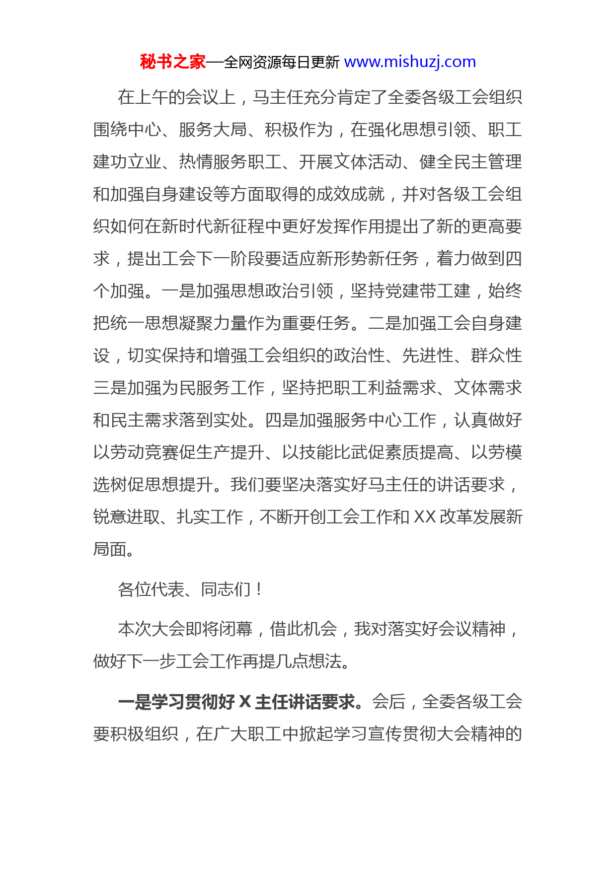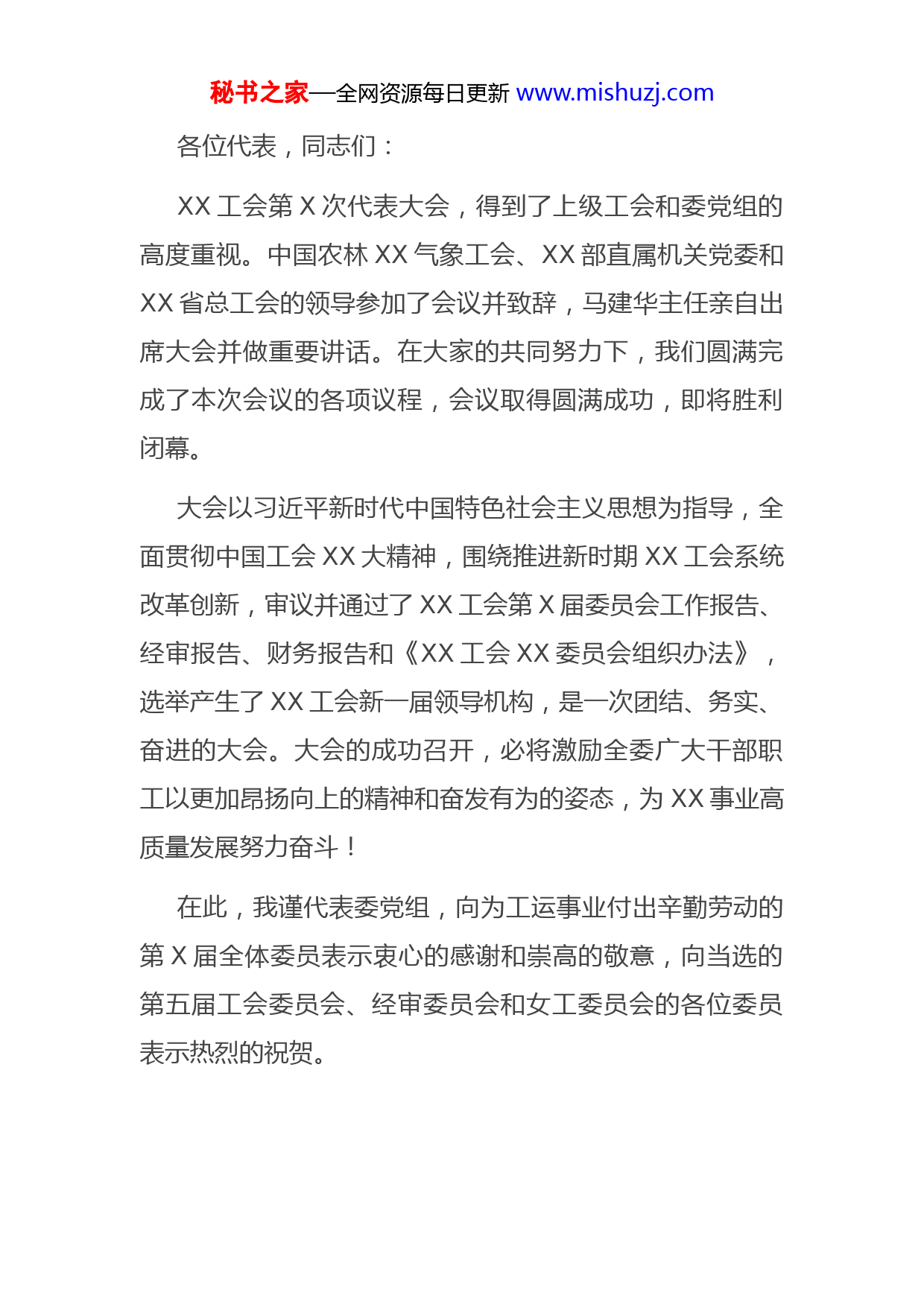 秘书之家—全网资源每日更新www.mishuzj.com各位代表,同志们:XX工会第X次代表大会,得到了上级工会和委党组的高度重视。中国农林XX气象工会、XX部直属机关党委和XX省总工会的领导参加了会议并致辞,马建华主任亲自出席大会并做重要讲话。在大家的共同努力下,我们圆满完成了本次会议的各项议程,会议取得圆满成功,即将胜利闭幕。大会以习近平新时代中国特色社会主义思想为指导,全面贯彻中国工会XX大精神,围绕推进新时期XX工会系统改革创新,审议并通过了XX工会第X届委员会工作报告、经审报告、财务报告和《XX工会XX委员会组织办法》,选举产生了XX工会新一届领导机构,是一次团结、务实、奋进的大会。大会的成功召开,必将激励全委广大干部职工以更加昂扬向上的精神和奋发有为的姿态,为XX事业高质量发展努力奋斗!在此,我谨代表委党组,向为工运事业付出辛勤劳动的第X届全体委员表示衷心的感谢和崇高的敬意,向当选的第五届工会委员会、经审委员会和女工委员会的各位委员表示热烈的祝贺。秘书之家—全网资源每日更新www.mishuzj.com在上午的会议上,马主任充分肯定了全委各级工会组织围绕中心、服务大局、积极作为,在强化思想引领、职工建功立业、热情服务职工、开展文体活动、健全民主管理和加强自身建设等方面取得的成效成就,并对各级工会组织如何在新时代新征程中更好发挥作用提出了新的更高要求,提出工会下一阶段要适应新形势新任务,着力做到四个加强。一是加强思想政治引领,坚持党建带工建,始终把统一思想凝聚力量作为重要任务。二是加强工会自身建设,切实保持和增强工会组织的政治性、先进性、群众性三是加强为民服务工作,坚持把职工利益需求、文体需求和民主需求落到实处。四是加强服务中心工作,认真做好以劳动竞赛促生产提升、以技能比武促素质提高、以劳模选树促思想提升。我们要坚决落实好马主任的讲话要求,锐意进取、扎实工作,不断开创工会工作和XX改革发展新局面。各位代表、同志们!本次大会即将闭幕,借此机会,我对落实好会议精神,做好下一步工会工作再提几点想法。一是学习贯彻好X主任讲话要求。会后,全委各级工会要积极组织,在广大职工中掀起学习宣传贯彻大会精神的秘书之家—全网资源每日更新www.mishuzj.com热潮,传达学习、贯彻落实马主任讲话要求,把委党组对工会工作的关心和支持传达到每位会员中。要落实好大会工作报告提出的未来五年各项工作任务,鼓足干劲、积极作为,把各项工作落到实处,真正想职工之所想,急职工之所急,切实当好知心人、贴心人、娘家人。二是新一届委员会要积极履职尽责。这次大会选举产生了工会X个委员会,进一步推进了工会组织建设,激发了工会组织活力。新一届委员会要充分发挥好领导机关的龙头作用,切实增强做好工作的责任感、使命感;要积极走访调研,倾听职工心声,解决职工难题;要严格执行各项制度,加强工会代表大会、联席会议、代表制和联合制等各项制度,确保工会组织作用的更好发挥;要严格自我要求,努力做一名合格的委员会委员。经审委员会要代表工会会员对工会各项经费的收支和财务管理进行好审查和监督,女工委员会要维护好女职工合法权益和特殊利益,保护女职工身心健康,努力做好女工工作。三是要进一步加强工会基层组织建设。各二级工会要健全组织,完善三委会,按时完成换届选举,加强工会工作能力建设,增强工会工作人员力量。要积极动员吸收所有职工建家入会,要深入研究聘用制、劳务派遣等人员的入会机制等,不断激发基层工会的组织活力。秘书之家—全网资源每日更新www.mishuzj.com四是围绕XX中心,进一步发挥好广大职工的主人翁作用。要加大思想引领,开展好“中国梦、劳动美”主题教育活动,利用好职工书屋、最美一线职工评选、文体宣教等平台,“润物细无声”,引导广大干部职工听党话、跟党走。要围绕XX主业,扎实开展劳动和技能竞赛,切实发挥劳动模范示范带动作用,激发广大职工创新潜能。要推动精准维权帮扶,唱好四季歌,及时有效回应广大职工多元诉求。要积极协调劳动关系,畅通源头参与渠道,完善民主协商机制,大力提升矛盾预警化解能力。要加强工会自身建设,打造政治过硬、业务过硬、素质一流的干部队伍,切实增强做好群众工作本领。各位代表、同志们,新时代要有新担当,新使命要有新作为。我们要始终不忘初心、牢记使命,以XX工会第X次代表大会的胜利召开为新的起点,以昂扬的斗志、崭新的姿态,锐意进取、勇于担当,共同谱写新时代XX工会系统繁荣发展新篇章!