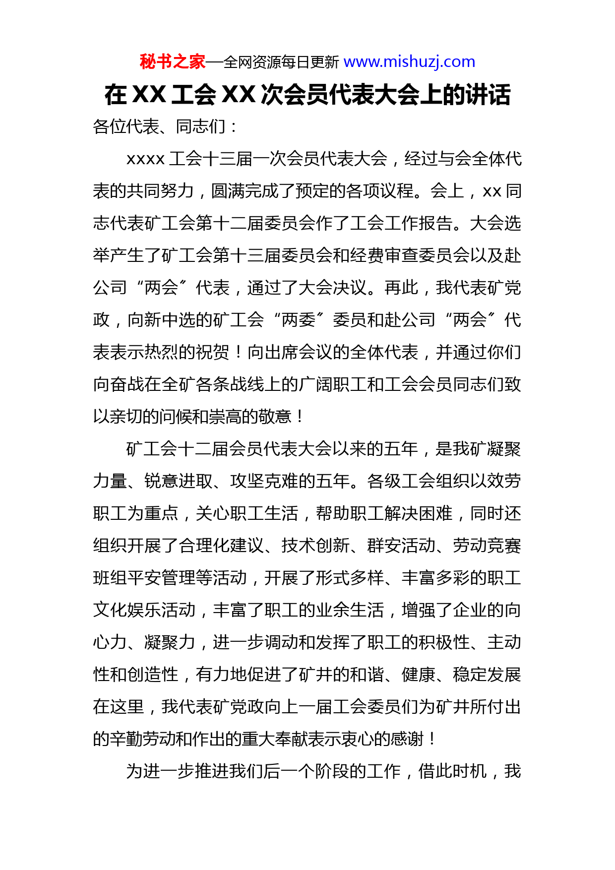 秘书之家—全网资源每日更新www.mishuzj.com在XX工会XX次会员代表大会上的讲话各位代表、同志们:xxxx工会十三届一次会员代表大会,经过与会全体代表的共同努力,圆满完成了预定的各项议程。会上,xx同志代表矿工会第十二届委员会作了工会工作报告。大会选举产生了矿工会第十三届委员会和经费审查委员会以及赴公司“两会〞代表,通过了大会决议。再此,我代表矿党政,向新中选的矿工会“两委〞委员和赴公司“两会〞代表表示热烈的祝贺!向出席会议的全体代表,并通过你们向奋战在全矿各条战线上的广阔职工和工会会员同志们致以亲切的问候和崇高的敬意!矿工会十二届会员代表大会以来的五年,是我矿凝聚力量、锐意进取、攻坚克难的五年。各级工会组织以效劳职工为重点,关心职工生活,帮助职工解决困难,同时还组织开展了合理化建议、技术创新、群安活动、劳动竞赛班组平安管理等活动,开展了形式多样、丰富多彩的职工文化娱乐活动,丰富了职工的业余生活,增强了企业的向心力、凝聚力,进一步调动和发挥了职工的积极性、主动性和创造性,有力地促进了矿井的和谐、健康、稳定发展在这里,我代表矿党政向上一届工会委员们为矿井所付出的辛勤劳动和作出的重大奉献表示衷心的感谢!为进一步推进我们后一个阶段的工作,借此时机,我秘书之家—全网资源每日更新www.mishuzj.com谈三点意见:1认真学习总书记考察讲话精神,开创矿区高质量发展新局面总书记在考察时强调要解放思想、改革创新、再接再厉谱写xx高质量发展新篇章。这对我们xx的各级党员领导干部都有着非常重要的现实意义和深远的历史意义,为我们下一阶段的工作指明了方向。全矿广阔党员干部要继续发挥模范表率作用,不断深化“党史学习教育〞,从党史、新中国史、改革开放史、社会主义发展史和矿史的历史经验中寻找破解问题的方法和途径。近期我们将组织“三线建设〞老兵、退休职工给大家进行“不忘初心使命、共谋企业发展〞专题报告会,切实把全矿干部职工的思想统一到为企业发展群策群力上来,盯紧目标,明确任务,形成共识,树立起坚决的发展信心,大力支持和参与矿井的建设与发展,积极投身各项工作。我们要辩证地分析困难和优势,进一步解放思想、改革创新、再接再厉,切实统筹抓好矿区平安生产经营党建各项工作,谱写矿井高质量发展新篇章。二、紧盯目标任务,全力做好后100天各项工作距离年底仅剩3个多月时间,平安根底要筑牢,生产经营要搞好,标准化矿井要验收,“四化〞建设要实施,各项任务目标都摆在我们面前。在座的各位都是我们的骨干力量,大家的作用有没有充分地发挥,直接关系到我们今年的任务能不能完成,矿井的发展有没有进步。这是对秘书之家—全网资源每日更新www.mishuzj.com大家的考验,我们不能退缩,唯有紧盯目标,实干巧干。一是必须筑牢平安防线。平安直接关系着矿井的生存和发展。后100天各单位要全力以赴抓根底、抓落实、抓标化、抓过程控制,确保矿井平安生产稳定大局。要转变观念,要站在讲政治的高度和企业发展的角度,牢固树立平安发展的理念,做好“一岗一清单〞全员平安生产责任制的落实,牢记平安事故教训,深刻认识平安工作的极端重要性以更高的政治站位、更严的工作要求、更实的干部作风,把平安工作抓实抓细抓到位。要“盯大抓小〞,要有序推进NOSA安健环综合管理体系构建,开展好“控风险、除隐患、保平安〞百日平安生产大行动和“百日平安活动〞两个活动,从严从细落实各项平安管理制度,坚决杜绝重大隐患的发生,这是矿井生存的根本问题;要抓实隐患的排查和治理,形成隐患治理闭环管理,同时要严肃追究各类事故、三违、隐患等相关单位及人员责任,杜绝工伤及严重的“三违〞,不断夯实平安根底。二是要不断提高效益。近期煤价屡创新高,我们必须抓住这一有利时机,全力组织好平安生产,合理安排劳动组织,加强科研攻关和新技术、新工艺推广应用,抓好全岩综掘机投入和智能化工作面建设,保证生产接续正常,同时管控好本钱和费用支出,把本钱控制在指标以内,抓好煤质管理、精煤洗选和运销工作,努力创造最大的经济效益。今年以来,在平秘书之家—全网资源每日更新www.mishuzj.com安稳定的大环境下,我矿生产任务组织得力,经营效益稳步提高,因此,在个别月份给全矿职工发放了福利奖金;农历八月十五,在公司发放各项中秋福利的同时,又拿出来近20万元为全矿职工发放寓意“平平安安、顺顺利利〞的苹果和酥梨。8月份我们还将发放平安效益奖励,让职工真正体会到平安效益带来的福利,体会到努力奋斗带来的幸福感。三是大力推进“四化〞建设。各部门要加快进度卡实节点,积极与公司相关部门沟通,争取技术、设备、资金支持。井下,我们要加快落实“一井一面〞顶层设计尽早将矿井生产调整到位;加紧实施矿井排矸系统改造工程、持续优化通风系统、瓦斯抽采系统优化工程,尽早实施矿井辅助运输系统改造工程。在地面,按照智能化矿井智慧化矿区建设要求,重新规划生产区地面建筑,建设新的智慧化综合办公楼,办公楼将集部区办公、应急救援、洗浴就餐为一体,全面提升整体矿井现代化程度,同时也将大大改善职工办公工作条件。四是全力推进党支部标准化建设。今年通过一年的努力我们