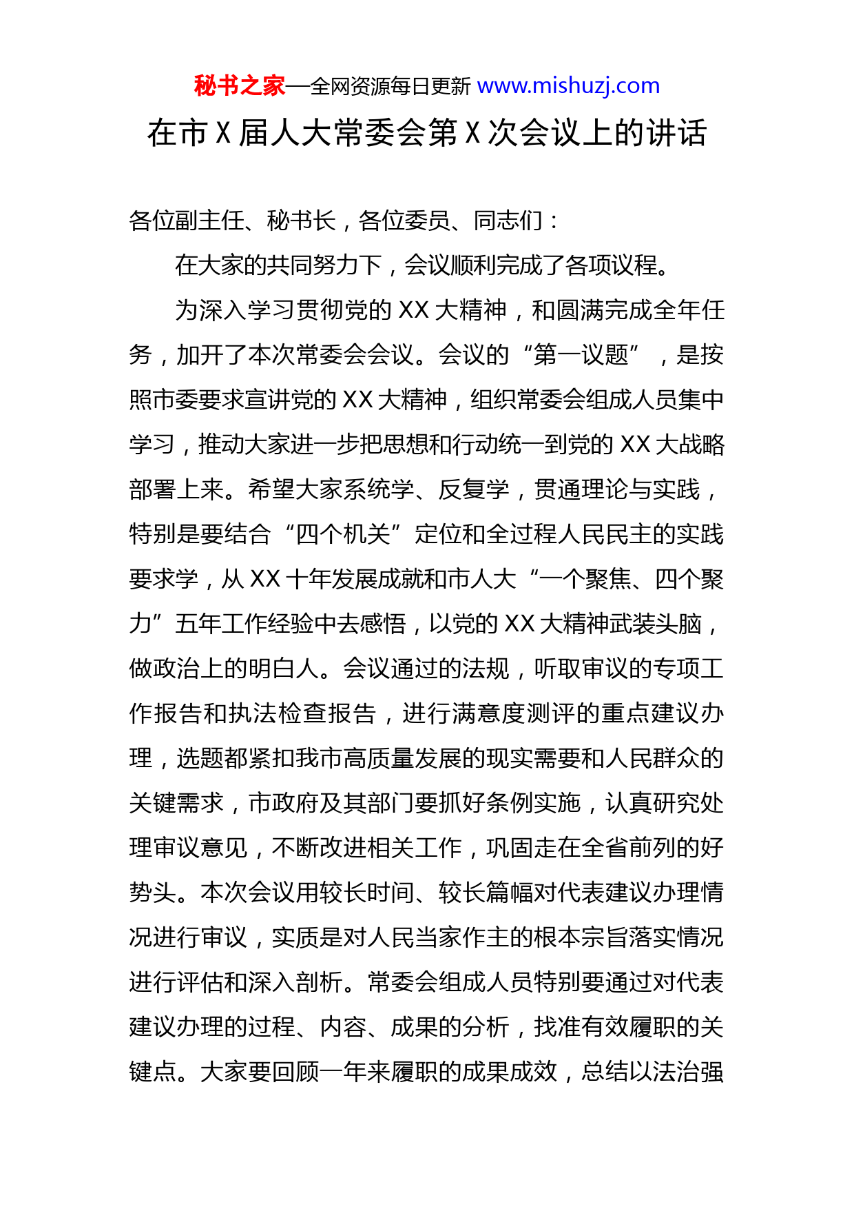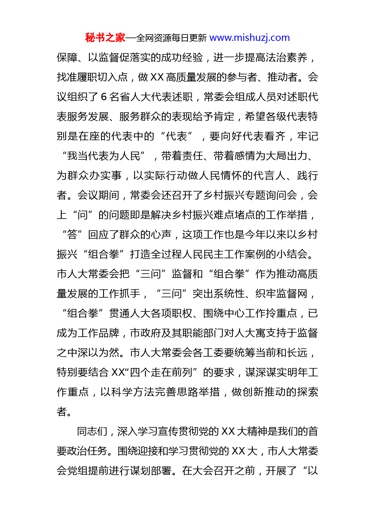 秘书之家—全网资源每日更新www.mishuzj.com在市X届人大常委会第X次会议上的讲话各位副主任、秘书长,各位委员、同志们:在大家的共同努力下,会议顺利完成了各项议程。为深入学习贯彻党的XX大精神,和圆满完成全年任务,加开了本次常委会会议。会议的“第一议题”,是按照市委要求宣讲党的XX大精神,组织常委会组成人员集中学习,推动大家进一步把思想和行动统一到党的XX大战略部署上来。希望大家系统学、反复学,贯通理论与实践,特别是要结合“四个机关”定位和全过程人民民主的实践要求学,从XX十年发展成就和市人大“一个聚焦、四个聚力”五年工作经验中去感悟,以党的XX大精神武装头脑,做政治上的明白人。会议通过的法规,听取审议的专项工作报告和执法检查报告,进行满意度测评的重点建议办理,选题都紧扣我市高质量发展的现实需要和人民群众的关键需求,市政府及其部门要抓好条例实施,认真研究处理审议意见,不断改进相关工作,巩固走在全省前列的好势头。本次会议用较长时间、较长篇幅对代表建议办理情况进行审议,实质是对人民当家作主的根本宗旨落实情况进行评估和深入剖析。常委会组成人员特别要通过对代表建议办理的过程、内容、成果的分析,找准有效履职的关键点。大家要回顾一年来履职的成果成效,总结以法治强秘书之家—全网资源每日更新www.mishuzj.com保障、以监督促落实的成功经验,进一步提高法治素养,找准履职切入点,做XX高质量发展的参与者、推动者。会议组织了6名省人大代表述职,常委会组成人员对述职代表服务发展、服务群众的表现给予肯定,希望各级代表特别是在座的代表中的“代表”,要向好代表看齐,牢记“我当代表为人民”,带着责任、带着感情为大局出力、为群众办实事,以实际行动做人民情怀的代言人、践行者。会议期间,常委会还召开了乡村振兴专题询问会,会上“问”的问题即是解决乡村振兴难点堵点的工作举措,“答”回应了群众的心声,这项工作也是今年以来以乡村振兴“组合拳”打造全过程人民民主工作案例的小结会。市人大常委会把“三问”监督和“组合拳”作为推动高质量发展的工作抓手,“三问”突出系统性、织牢监督网,“组合拳”贯通人大各项职权、围绕中心工作拎重点,已成为工作品牌,市政府及其职能部门对人大寓支持于监督之中深以为然。市人大常委会各工委要统筹当前和长远,特别要结合XX“四个走在前列”的要求,谋深谋实明年工作重点,以科学方法完善思路举措,做创新推动的探索者。同志们,深入学习宣传贯彻党的XX大精神是我们的首要政治任务。围绕迎接和学习贯彻党的XX大,市人大常委会党组提前进行谋划部署。在大会召开之前,开展了“以秘书之家—全网资源每日更新www.mishuzj.com什么样的状态、以什么样的成果迎接党的XX大”系列活动。大会召开后,第一时间制定落实方案,集中收听收看开幕式,多次召开中心组学习会议,2次开展常委会会议集中学习,各支部先学一步、全面学习研讨,成立党的XX大精神学习小组,驻会的常委会组成人员基本做到了每人一篇学习体会、每人一次研讨发言,持续浓厚了氛围,前期工作取得了初步成效,为学习宣传贯彻做好思想准备和工作准备。下一步,市人大常委会要坚持把学习宣传贯彻党的XX大精神作为头等大事引深做实。一是深入学习,对标“三个全面”要求,把学习党的XX大《决议》要求,与学习即将召开的市委七届四次全会精神结合起来,要坚定信仰主动学,结合“四个机关”建设反复学,结合全过程人民民主深入学,结合推动高质量发展贯通学,结合人大工作创新学,切实把学习成果转化为工作动力。二是统筹抓好年底各项工作,聚焦市委中心工作,立足人大工作职责,切实做到学以致用,特别是抓好市X届人大X次会议筹备、“聚民意,惠民生”人大代表建议办理会商推进会、“健全吸纳民意、汇集民智工作机制”现场推进会、开展党的XX大精神系列主题宣传宣讲等重点工作,确保今年工作圆满收官。三是强化作风建设,必须锲而不舍落实中央八项规定精神,推深做实“一改两为”,全面紧起来,清单化秘书之家—全网资源每日更新www.mishuzj.com抓落实。常委会组成人员要作表率,特别提醒一下,省人大关于代表每月一条建议工作,大家要带好头,与机关同志一道,以团结的状态、奋斗的实绩推动党的XX大精神在人大系统落地生根。