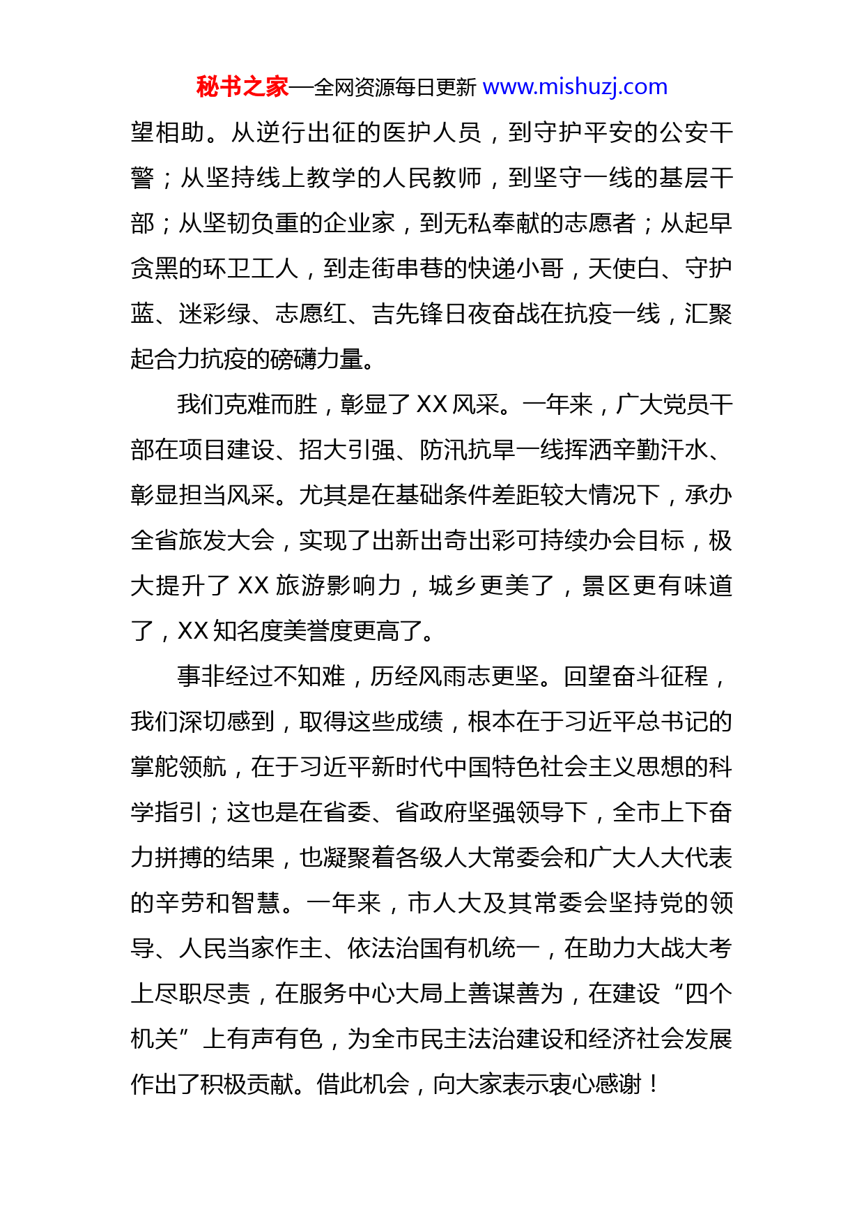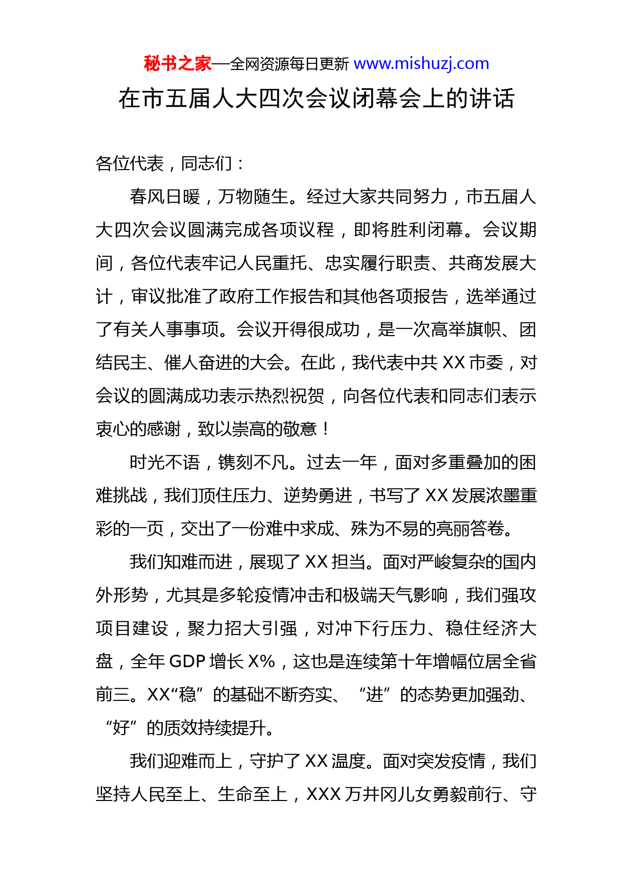 秘书之家—全网资源每日更新www.mishuzj.com在市五届人大四次会议闭幕会上的讲话各位代表,同志们:春风日暖,万物随生。经过大家共同努力,市五届人大四次会议圆满完成各项议程,即将胜利闭幕。会议期间,各位代表牢记人民重托、忠实履行职责、共商发展大计,审议批准了政府工作报告和其他各项报告,选举通过了有关人事事项。会议开得很成功,是一次高举旗帜、团结民主、催人奋进的大会。在此,我代表中共XX市委,对会议的圆满成功表示热烈祝贺,向各位代表和同志们表示衷心的感谢,致以崇高的敬意!时光不语,镌刻不凡。过去一年,面对多重叠加的困难挑战,我们顶住压力、逆势勇进,书写了XX发展浓墨重彩的一页,交出了一份难中求成、殊为不易的亮丽答卷。我们知难而进,展现了XX担当。面对严峻复杂的国内外形势,尤其是多轮疫情冲击和极端天气影响,我们强攻项目建设,聚力招大引强,对冲下行压力、稳住经济大盘,全年GDP增长X%,这也是连续第十年增幅位居全省前三。XX“稳”的基础不断夯实、“进”的态势更加强劲、“好”的质效持续提升。我们迎难而上,守护了XX温度。面对突发疫情,我们坚持人民至上、生命至上,XXX万井冈儿女勇毅前行、守秘书之家—全网资源每日更新www.mishuzj.com望相助。从逆行出征的医护人员,到守护平安的公安干警;从坚持线上教学的人民教师,到坚守一线的基层干部;从坚韧负重的企业家,到无私奉献的志愿者;从起早贪黑的环卫工人,到走街串巷的快递小哥,天使白、守护蓝、迷彩绿、志愿红、吉先锋日夜奋战在抗疫一线,汇聚起合力抗疫的磅礴力量。我们克难而胜,彰显了XX风采。一年来,广大党员干部在项目建设、招大引强、防汛抗旱一线挥洒辛勤汗水、彰显担当风采。尤其是在基础条件差距较大情况下,承办全省旅发大会,实现了出新出奇出彩可持续办会目标,极大提升了XX旅游影响力,城乡更美了,景区更有味道了,XX知名度美誉度更高了。事非经过不知难,历经风雨志更坚。回望奋斗征程,我们深切感到,取得这些成绩,根本在于习近平总书记的掌舵领航,在于习近平新时代中国特色社会主义思想的科学指引;这也是在省委、省政府坚强领导下,全市上下奋力拼搏的结果,也凝聚着各级人大常委会和广大人大代表的辛劳和智慧。一年来,市人大及其常委会坚持党的领导、人民当家作主、依法治国有机统一,在助力大战大考上尽职尽责,在服务中心大局上善谋善为,在建设“四个机关”上有声有色,为全市民主法治建设和经济社会发展作出了积极贡献。借此机会,向大家表示衷心感谢!秘书之家—全网资源每日更新www.mishuzj.com各位代表,同志们!党的二十大擘画了全面建成社会主义现代化强国、以中国式现代化全面推进中华民族伟大复兴的宏伟蓝图,明确了新时代新征程党和国家事业发展的中心任务。市委五届四次全会,紧扣“三区”建设目标,提出全面建设创新创业、宜居宜人、共富共享、文化文明现代化XX,这是中国式现代化的XX实践、XX路径、XX画卷。前景无限、未来可期。我们要挺膺担当、勇毅前行,靠团结凝聚力量、以实干践行使命,携手书写中国式现代化XX精彩华章。——书写XX华章是一次光荣远征,我们必须心中有方向、行动有力量。习近平总书记强调,心有所信,方能行远。奋进新征程,我们必须牢记旗帜就是方向、核心就是力量,把捍卫“两个确立”、做到“两个维护”作为最高政治原则和根本政治责任,任何时候都不改其心、不移其志、不毁其节。要筑牢政治忠诚。把旗帜鲜明讲政治贯穿履职尽责全过程,提高“政治三力”,始终在思想上政治上行动上同以习近平同志为核心的党中央保持高度一致。要提高政治自觉。坚持不懈用习近平新时代中国特色社会主义思想凝心铸魂,全面学习把握落实党的二十大精神,把“学思用”连成一线、“知信行”融为一体,以理论清醒把握历史主动,以思想力量昂扬奋进激情。要强化政治担当。胸怀“两个大局”、心系“国之大者”,想事有政秘书之家—全网资源每日更新www.mishuzj.com治站位、谋事有政治立场、干事有政治考量、成事有政治效果,推动习近平总书记重要讲话重要指示批示精神在XX落地生根、开花结果。——书写XX华章是一次发展登攀,我们必须聚焦高质量、打好主动仗。历史川流不息,发展永无止境。当前,XX正处于全面推进高质量发展的关键阶段,正如滚石上山、船到中流,愈进愈难、愈进愈险,但不进则退、非进不可。我们要锚定高质量发展首要任务,擂响出征鼓、奋勇再登攀。要营造敢为“大环境”。从稳预期、强信心入手,聚焦发展所需、市场关切,多谋政策、早出政策、善用政策,推动政策靠前发力、精准滴灌、直达快享,让“干在XX、闯在XX、投在XX”预期更稳、前景广阔。要跑出赶超“加速度”。全力拼招商、攻项目,打好招大引强大会战,坚持“双赛制”,推动大项目、好项目接二连三落地XX;全力强创新、壮产业,坚持传统产业改造升级和新兴产业培育壮大双向发力,让XX产业“体量”更大、“筋骨”更壮、“韧性”更足。要激活发展“新动能”。深化大改革引领大发展行动,用改革解难题、破梗阻、激活力,打造“吉事即办”数字政府升级版,让所有市场主体专心创业、放心投资、安心发展。——书写XX华章是一次共富之约,我们必须初心坚如磐、矢志惠民