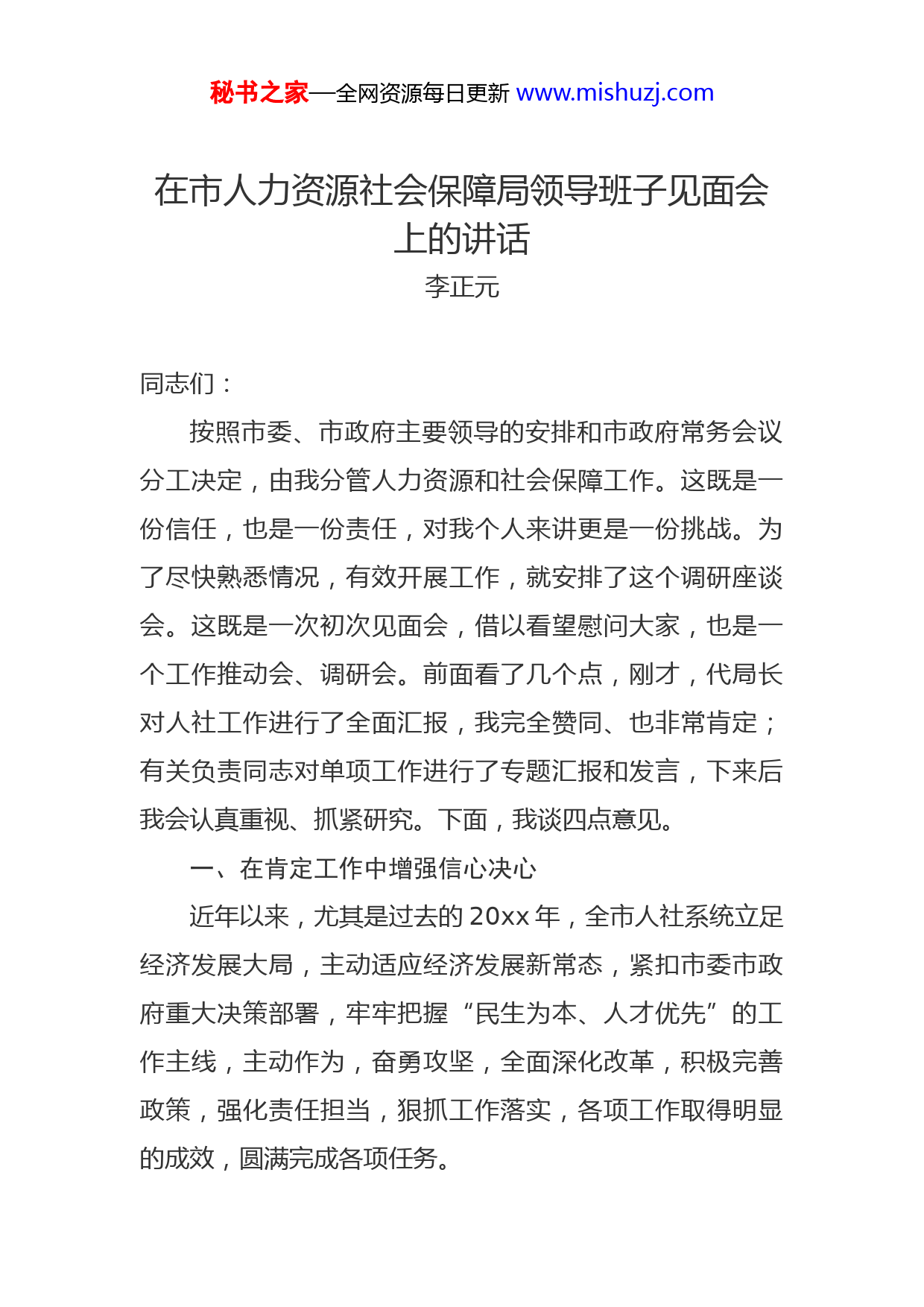 秘书之家—全网资源每日更新www.mishuzj.com在市人力资源社会保障局领导班子见面会上的讲话李正元同志们:按照市委、市政府主要领导的安排和市政府常务会议分工决定,由我分管人力资源和社会保障工作。这既是一份信任,也是一份责任,对我个人来讲更是一份挑战。为了尽快熟悉情况,有效开展工作,就安排了这个调研座谈会。这既是一次初次见面会,借以看望慰问大家,也是一个工作推动会、调研会。前面看了几个点,刚才,代局长对人社工作进行了全面汇报,我完全赞同、也非常肯定;有关负责同志对单项工作进行了专题汇报和发言,下来后我会认真重视、抓紧研究。下面,我谈四点意见。一、在肯定工作中增强信心决心近年以来,尤其是过去的20xx年,全市人社系统立足经济发展大局,主动适应经济发展新常态,紧扣市委市政府重大决策部署,牢牢把握“民生为本、人才优先”的工作主线,主动作为,奋勇攻坚,全面深化改革,积极完善政策,强化责任担当,狠抓工作落实,各项工作取得明显的成效,圆满完成各项任务。秘书之家—全网资源每日更新www.mishuzj.com一是稳步推进了就业创业工作。积极实施充分就业战略,大力推进高校毕业生就业创业、做好农民工工作、解决企业用工难等重点工作,全市城镇新增就业、失业人员再就业、就业困难对象再就业、高校毕业生创业就业等民生指标,保持良好的势头。去年全市城镇新增就业7.06万,城镇失业率控制在4.2%之内。今年1-4月全市城镇新增就业20458人,实现开门红。二是逐步完善了社会保障体系。出台了建立统一的南充市城乡居民社会养老保险实施办法及补充意见、全面开展城乡居民大病保险工作等举措,使社会保障工作实现了“六个更加”,即:扩面征缴更加广泛,统筹层次更加合理,医保服务更加智能,业务经办更加便民,数据管理更加规范,基金监督更加有力。三是全面优化了人事管理体系。建立了全市人事考试联席会议制度组织实施了公务员公开考录、公务员遴选工作,顺利实施全市中小学公开招聘、市属事业单位公招(考调)工作。积极推进“嘉陵江英才工程”,引进313名高端人才。开展各类职业技能培训7.5万人次,完成公立医院收入分配制度改革,接收安置军队转业干部81人,清理行政权力事项95项。四是有效维护了和谐劳动环境。通过加强劳动保障监察执法,制定全市最低工资标准、全市20xx年企业工资指秘书之家—全网资源每日更新www.mishuzj.com导线、推进集体合同制度攻坚计划等,为7000余名劳动者追讨工资7600多万元,查处未参保和未缴纳社会保险费49件、未签订合同82件、违反最低工资规定20件。五是全力推进了“两项攻坚战”。围绕市委、市政府“项目攻坚”“扶贫攻坚”两项攻坚任务,制定了《人社行动计划》。制定的《就业精准扶贫实施方案》,被人社厅转发,反响很好。过去的一年,在多重困难叠加、多项任务交织的情况下,全市人社系统能取得这些成绩,确实不易。这些成绩的取得,得益于市委、市政府的正确领导,是全市人社系统创新工作、优质服务、务实奋进的结果,充分说明了全市人社系统干部队伍是一支能干事、会干事、能成事的优秀队伍。二、在直面压力中突出工作重点人社工作事关民生和改革发展大局。当前,我市人社工作面临着就业创业、基金支付带来的压力,面临着企业军转干部、下岗志愿兵等群体维稳的压力,更面临着适应新常态改革创新、服务民生任务繁重的压力。对此,我们唯有坚持“五大发展理念”,紧扣“富民强市十大行动”以只争朝夕的干劲和决战决胜的勇气,以促进就业创业、完善社会保障、强化人才支撑、加大维权力度为重点,努力推动全市人社工作再上台阶。秘书之家—全网资源每日更新www.mishuzj.com第一,要围绕“保就业”的要求,稳定和扩大就业创业。李克强总理曾批示:就业是民生之本,就业稳则心定家宁、国安。我们要始终把就业放在民生工作的首位,大力实施就业优先战略,继续落实有利于促进就业的产业政策、投资政策、财政政策、税收政策、金融政策和城乡统筹等就业政策,全力实施贫困家庭就业促进工程。着力推动大众创业,抓好小额担保贷款扶持创业促进就业工作,扶持创业项目孵化。加大农村富余劳动力转移就业力度,积极引导农民工返乡创业。抓好高校毕业生就业创业,继续实施“大学生就业促进计划”。积极开展用工招聘活动努力激活人才市场,营造公平就业环境,促进人力资源优化配置。第二,要围绕“惠民生”的根本,完善和健全社保体系。社会保障是民生之本,决定人心向背和事业兴衰成败今年社会保障领域工作多、任务重、难度大,需要齐心协力攻坚破难。要完善社会保障制度。完善职工养老保险个人账户政策,推进企业年金制度管理。做好被征地农民社会保障工作,落实被征地农民社保资金预存款制度。完善城乡居民大病保险制度,加强与医疗救助等制度衔接,切实解决因病致贫返贫问题。大力实施工伤保险专项扩面“同舟计划”,提高工伤保险参保率。深入推进全民参保计划,将更多的人纳入社会保障。加强社会保险基金监管秘书之家—全网资源每日更新www.mishuzj.com健全监管制度,规范执法行为,确保基金安全。第三,要围绕“求突破”的效果,统筹和深化各项改革。一是要在城乡居民医保制度整合上求突破。国务院不久前发文,就
