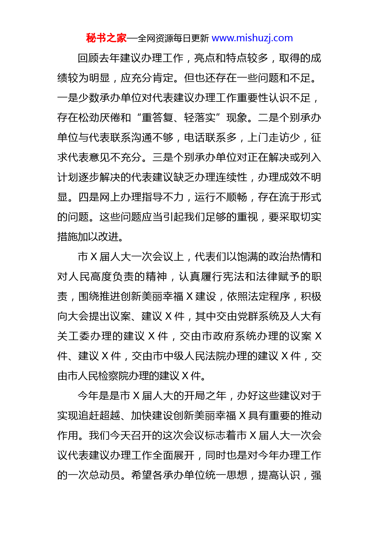 秘书之家—全网资源每日更新www.mishuzj.com在市人大代表建议交办暨表彰会上的讲话同志们:今天,我们在这里召开会议,对市X届人大一次会议期间代表提出的建议进行集中交办,目的是进一步加强领导,改进方法,总结经验,完善措施,努力做好今年代表建议办理工作。这次会议我们还对去年市X届人大X次会议代表提出的优秀议案、建议和办理工作先进单位、先进个人进行了表彰。我谨代表市人大常委会对受表彰的先进单位、先进个人表示热烈的祝贺!在去年召开的市X届人大X次会议上,共收到代表提出的议案建议X件,其中立议案X件,作为建议办理的X件。会后,交由市政府系统办理X件,市中级法院办理X件,市党群系统及人大有关工委办理X件,共涉及X个部门和单位。在市委、市人大、市政府的高度重视和各承办单位的共同努力下,X件代表建议已全部按期办结,并向代表作了答复。代表所提建议已经解决或基本解决的有X件,占X%;正在解决或列入计划逐步解决的有X件,占X%;因条件限制或其他原因待后解决的有X件,占X%。从办理的总体情况看,去年办理进度快于往年,办理落实率明显提高。在此我代表市人大常委会对各承办单位所付出的辛勤劳动表示衷心的感谢!秘书之家—全网资源每日更新www.mishuzj.com回顾去年建议办理工作,亮点和特点较多,取得的成绩较为明显,应充分肯定。但也还存在一些问题和不足。一是少数承办单位对代表建议办理工作重要性认识不足,存在松劲厌倦和“重答复、轻落实”现象。二是个别承办单位与代表联系沟通不够,电话联系多,上门走访少,征求代表意见不充分。三是个别承办单位对正在解决或列入计划逐步解决的代表建议缺乏办理连续性,办理成效不明显。四是网上办理指导不力,运行不顺畅,存在流于形式的问题。这些问题应当引起我们足够的重视,要采取切实措施加以改进。市X届人大一次会议上,代表们以饱满的政治热情和对人民高度负责的精神,认真履行宪法和法律赋予的职责,围绕推进创新美丽幸福X建设,依照法定程序,积极向大会提出议案、建议X件,其中交由党群系统及人大有关工委办理的建议X件,交由市政府系统办理的议案X件、建议X件,交由市中级人民法院办理的建议X件,交由市人民检察院办理的建议X件。今年是是市X届人大的开局之年,办好这些建议对于实现追赶超越、加快建设创新美丽幸福X具有重要的推动作用。我们今天召开的这次会议标志着市X届人大一次会议代表建议办理工作全面展开,同时也是对今年办理工作的一次总动员。希望各承办单位统一思想,提高认识,强秘书之家—全网资源每日更新www.mishuzj.com化措施,狠抓落实,努力推动代表建议办理工作再上新台阶。一是进一步提高认识。人大代表依照法律规定,提出对我市“一府两院”和有关部门工作的建议、批评和意见,是代表人民行使国家权力,参与管理国家事务、管理经济文化事业、管理社会事务的重要形式。认真办理代表建议,是有关机关、组织的法定职责。各承办单位认真研究办理代表提出的每一件建议并负责答复,是坚持人民代表大会制度、实现人民当家做主、自觉接受人民群众监督的具体体现。同时,办理好代表建议是了解社情民意的重要方式和渠道。大多数人大代表,对全市的总体情况和本县区、本行业的具体情况比较了解,绝大部分建议是代表在调查研究、了解民意、认真准备后提出的,较好地体现了社情民意。办好建议的过程,就是加强和促进社会和谐、推动经济发展的过程。我们一定要把办理代表建议作为有效推动工作的切入点,与改进部门单位工作有机结合起来,在加强建议办理中更好地推动各项事业向前发展。二是进一步加强领导。这次会上对代表建议都已明确了具体的承办单位,各承办单位接到代表建议后,要尽快做好登记,认真审阅内容,如果认为代表建议不属于本单位职权范围,必须在X天内退回交办单位,即市人民政府督查室,并说明退办理由。承办单位不得滞留、延误或者秘书之家—全网资源每日更新www.mishuzj.com自行转交代表建议。交办单位自收到退件之日起X日内另行确定承办单位。各承办单位要及时召开专门会议,认真研究分析代表建议的内容和要求,提出明确的办理意见,承办单位一把手要与代表见面,当面征求意见,明确领导责任和承办责任,落实具体办理建议的承办人员,保持相对固定的建议办理工作队伍。要研究制定办理工作方案,并认真组织实施。具体承办人员要以高度负责的态度,严肃认真,扎实细致地做好工作,不断提高办理工作质量,努力做到让代表满意,让群众满意。市委督查室、市人大人代委、市政府督查室要加强沟通,及时掌握建议办理情况,认真解决办理工作存在的问题,努力提高办理质量。三是进一步创新方法。具体讲,要抓好“三个环节”,即办理前,要主动找代表沟通,了解代表的具体要求;办理中,要随时与代表保持联系,通报办理过程和进度;办理后,要邀请代表实地察看,征求意见,及时反馈落实情况。对于需要由几个单位协办的代表建议,要注重协调配合,主办单位应提前主动与协办单位沟通会商,充分吸收协办单位意见,尽可能使建议办理措施更加完善,答复意见更加全面,落实更加有效。各协办单位要积极配合主办单位推动建议办理工作的扎实开展,增强建议办理工作的合力。各承办单位要把办理代表