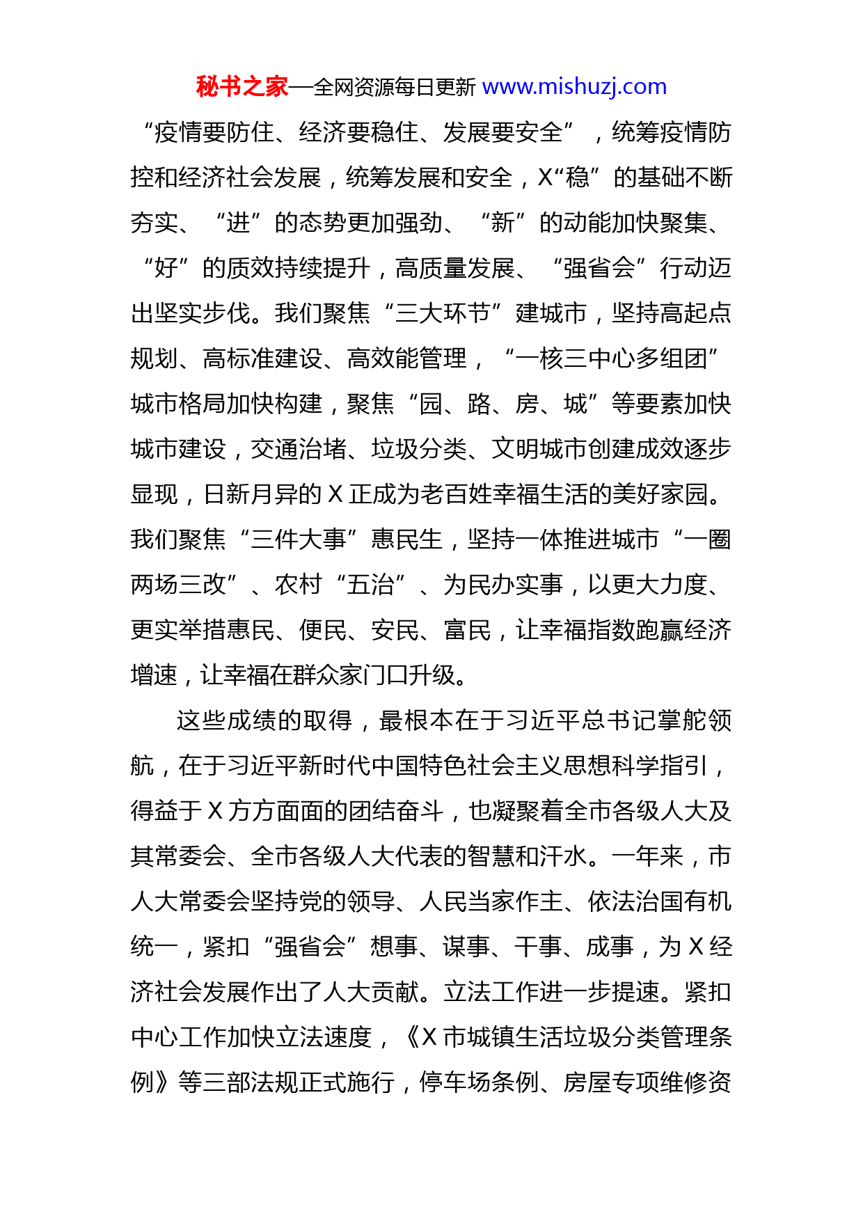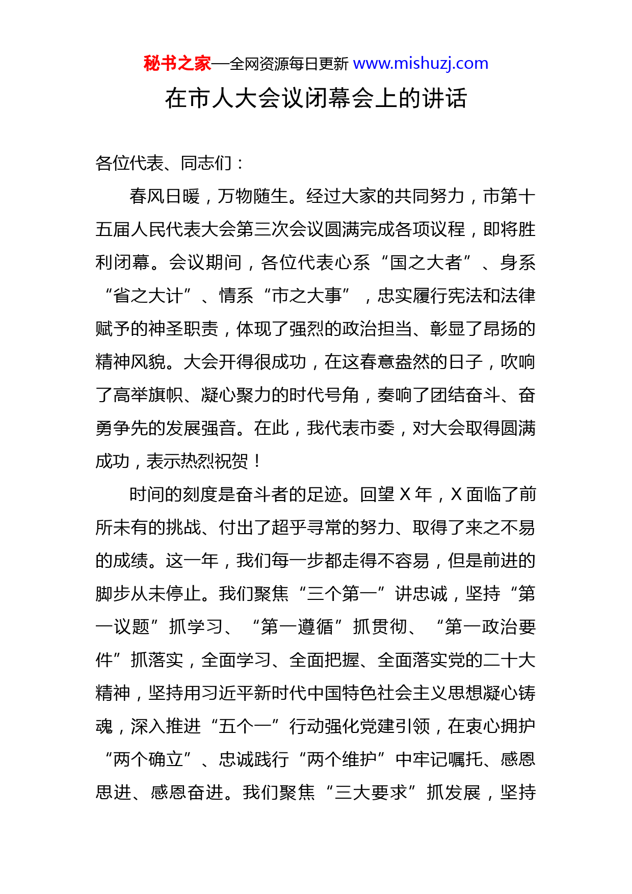 秘书之家—全网资源每日更新www.mishuzj.com在市人大会议闭幕会上的讲话各位代表、同志们:春风日暖,万物随生。经过大家的共同努力,市第十五届人民代表大会第三次会议圆满完成各项议程,即将胜利闭幕。会议期间,各位代表心系“国之大者”、身系“省之大计”、情系“市之大事”,忠实履行宪法和法律赋予的神圣职责,体现了强烈的政治担当、彰显了昂扬的精神风貌。大会开得很成功,在这春意盎然的日子,吹响了高举旗帜、凝心聚力的时代号角,奏响了团结奋斗、奋勇争先的发展强音。在此,我代表市委,对大会取得圆满成功,表示热烈祝贺!时间的刻度是奋斗者的足迹。回望X年,X面临了前所未有的挑战、付出了超乎寻常的努力、取得了来之不易的成绩。这一年,我们每一步都走得不容易,但是前进的脚步从未停止。我们聚焦“三个第一”讲忠诚,坚持“第一议题”抓学习、“第一遵循”抓贯彻、“第一政治要件”抓落实,全面学习、全面把握、全面落实党的二十大精神,坚持用习近平新时代中国特色社会主义思想凝心铸魂,深入推进“五个一”行动强化党建引领,在衷心拥护“两个确立”、忠诚践行“两个维护”中牢记嘱托、感恩思进、感恩奋进。我们聚焦“三大要求”抓发展,坚持秘书之家—全网资源每日更新www.mishuzj.com“疫情要防住、经济要稳住、发展要安全”,统筹疫情防控和经济社会发展,统筹发展和安全,X“稳”的基础不断夯实、“进”的态势更加强劲、“新”的动能加快聚集、“好”的质效持续提升,高质量发展、“强省会”行动迈出坚实步伐。我们聚焦“三大环节”建城市,坚持高起点规划、高标准建设、高效能管理,“一核三中心多组团”城市格局加快构建,聚焦“园、路、房、城”等要素加快城市建设,交通治堵、垃圾分类、文明城市创建成效逐步显现,日新月异的X正成为老百姓幸福生活的美好家园。我们聚焦“三件大事”惠民生,坚持一体推进城市“一圈两场三改”、农村“五治”、为民办实事,以更大力度、更实举措惠民、便民、安民、富民,让幸福指数跑赢经济增速,让幸福在群众家门口升级。这些成绩的取得,最根本在于习近平总书记掌舵领航,在于习近平新时代中国特色社会主义思想科学指引,得益于X方方面面的团结奋斗,也凝聚着全市各级人大及其常委会、全市各级人大代表的智慧和汗水。一年来,市人大常委会坚持党的领导、人民当家作主、依法治国有机统一,紧扣“强省会”想事、谋事、干事、成事,为X经济社会发展作出了人大贡献。立法工作进一步提速。紧扣中心工作加快立法速度,《X市城镇生活垃圾分类管理条例》等三部法规正式施行,停车场条例、房屋专项维修资秘书之家—全网资源每日更新www.mishuzj.com金管理条例、违法建设查处规定、X河保护规定等立法工作加快推进,为“强省会”提供了坚强的法治保障。监督工作进一步提效。综合运用多种方式开展监督,紧盯开发区预算审查、优化营商环境、“园区事园区办”等重点工作,紧盯就业促进、养老服务、交通治堵等民生实事,有力推动市委决策部署的落实和法律法规的实施。代表工作进一步提能。充分发挥人大代表主体作用,强化代表联络站建设,积极邀请代表参与建议办理,引导各级人大代表紧扣“强省会”认真履职,积极参与产业发展、疫情防控等重点工作,在围绕中心、服务大局中展现了代表风采、体现了人大担当。自身建设进一步提质。牢牢把握“四个机关”定位要求,强化党建引领,加强队伍建设,建好人大智库,激励干部敢干实干快干会干,不断提高依法履职能力,努力建设让党放心、让人民群众满意的模范机关。在此,我代表市委,向全市各级人大代表、人大常委会组成人员和人大机关工作人员,表示衷心的感谢!草木蔓发,春山可望。今年是全面贯彻落实党的二十大精神的开局之年,是推进“强省会”行动的关键之年。开局之年当有开局之势,关键之年当有关键之为。我们要始终牢记习近平总书记的殷殷嘱托,坚决贯彻落实省委、省政府决策部署,视使命如生命,视责任如泰山,以“青松挺且直”的志气、“有如扶桑初日升”的朝气、“再多秘书之家—全网资源每日更新www.mishuzj.com磨难也无惧”的锐气,凝聚人大力量、彰显人大作为、展现人大风采,努力交出无愧历史、不负韶华的时代答卷。这里,我提四点希望,就是要做到“四个度”,与大家共勉。第一,要有高度。唯有“会当临绝顶”,才会“一览众山小”,只有政治上高站位,工作上才能高定位。要始终牢记人大工作的第一属性是政治属性,铸牢政治忠诚、强化理论武装、树牢法治思维,确保人大工作始终沿着正确方向前进。一要有政治高度。“旗帜指引方向,核心领航未来。”党确立习近平同志党中央的核心、全党的核心地位,确立的是全党的“主心骨”、人民的“顶梁柱”。要始终把旗帜鲜明讲政治贯穿人大各项工作的全过程,把紧跟习近平总书记作为最大政治责任、最高政治原则、最起码的政治纪律,不断提高政治判断力、政治领悟力、政治执行力,做到想事有政治站位、谋事有政治立场、干事有政治考量、成事有政治效果。二要有理论高度。“行之力则知愈进,知之深则行愈达。”要自觉把习近平新时代中国特色社会主义思想作为抓工作、干事业、谋发展的制胜法宝,坚持用马克思