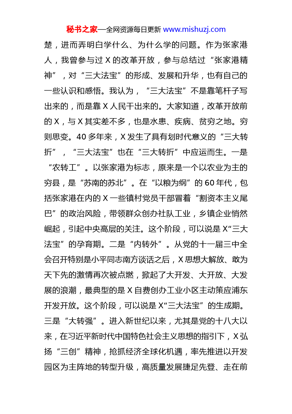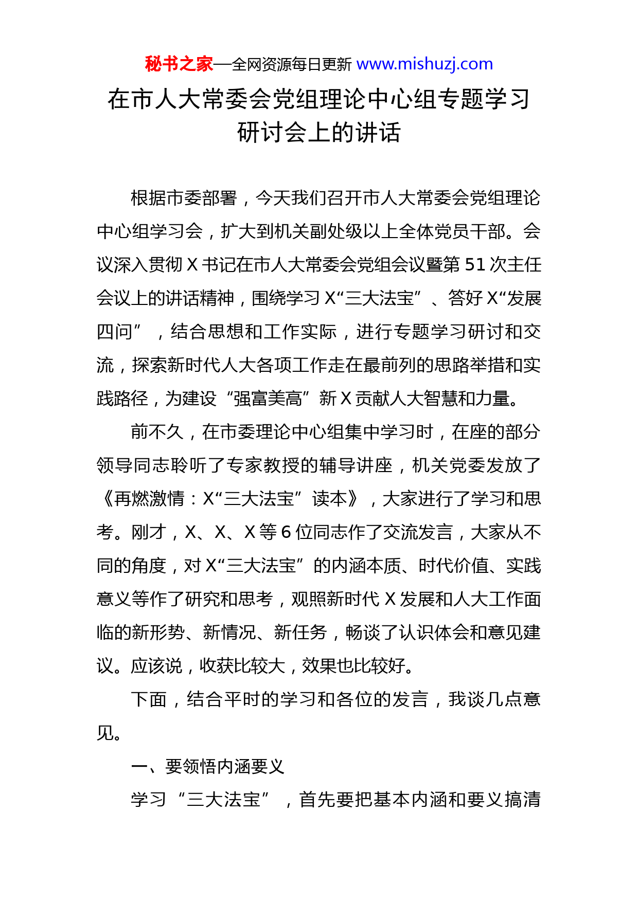 秘书之家—全网资源每日更新www.mishuzj.com在市人大常委会党组理论中心组专题学习研讨会上的讲话根据市委部署,今天我们召开市人大常委会党组理论中心组学习会,扩大到机关副处级以上全体党员干部。会议深入贯彻X书记在市人大常委会党组会议暨第51次主任会议上的讲话精神,围绕学习X“三大法宝”、答好X“发展四问”,结合思想和工作实际,进行专题学习研讨和交流,探索新时代人大各项工作走在最前列的思路举措和实践路径,为建设“强富美高”新X贡献人大智慧和力量。前不久,在市委理论中心组集中学习时,在座的部分领导同志聆听了专家教授的辅导讲座,机关党委发放了《再燃激情:X“三大法宝”读本》,大家进行了学习和思考。刚才,X、X、X等6位同志作了交流发言,大家从不同的角度,对X“三大法宝”的内涵本质、时代价值、实践意义等作了研究和思考,观照新时代X发展和人大工作面临的新形势、新情况、新任务,畅谈了认识体会和意见建议。应该说,收获比较大,效果也比较好。下面,结合平时的学习和各位的发言,我谈几点意见。一、要领悟内涵要义学习“三大法宝”,首先要把基本内涵和要义搞清秘书之家—全网资源每日更新www.mishuzj.com楚,进而弄明白学什么、为什么学的问题。作为张家港人,我曾参与过X的改革开放,参与总结过“张家港精神”,对“三大法宝”的形成、发展和升华,也有自己的一些认识和感悟。我认为,“三大法宝”不是靠笔杆子写出来的,而是靠X人民干出来的。大家知道,改革开放前的X,与X其实差不多,也是水患、疾病、贫穷之地。穷则思变。40多年来,X发生了具有划时代意义的“三大转折”,“三大法宝”也在“三大转折”中应运而生。一是“农转工”。以张家港为标志,原来是一个以农业为主的穷县,是“苏南的苏北”。在“以粮为纲”的60年代,包括张家港在内的X一些镇村党员干部冒着“割资本主义尾巴”的政治风险,带领群众创办社队工业,乡镇企业悄然崛起,引起中央高层的关注。这个阶段,可以说是X“三大法宝”的孕育期。二是“内转外”。从党的十一届三中全会召开特别是小平同志南方谈话之后,X思想大解放、敢为天下先的激情再次被点燃,掀起了大开发、大开放、大发展的浪潮,最典型的是X自费创办工业小区主动策应浦东开发开放。这个阶段,可以说是X“三大法宝”的生成期。三是“大转强”。进入新世纪以来,尤其是党的十八大以来,在习近平新时代中国特色社会主义思想的指引下,X弘扬“三创”精神,抢抓经济全球化机遇,率先推进以开发园区为主阵地的转型升级,高质量发展捷足先登、走在前秘书之家—全网资源每日更新www.mishuzj.com列。这个阶段,可以说是X“三大法宝”的拓展期。在波澜壮阔的改革开放进程中,X拼出的“张家港精神”、闯出的“X之路”、融出的“园区经验”,成为一个时代的高光标识、引领发展的内生动力,X也因此走在全国发展的前列。这得益于中国特色社会主义的好时代,得益于改革开放的好政策,更离不开以秦振华同志为代表的敢想敢拼敢闯敢干敢争的X优秀党员干部群体。他们总是以忧党爱民之心勇立时代潮头、把准时代脉搏、契合时代要求、紧跟时代步伐,总是“醒得比人家早”“睡得比人家晚”“干得比人家快”,因而创造出许多“不敢想”“不可能”的发展奇迹。而这背后,折射出的是初心如磐、敢于担当、实干争先的情怀与品格。这种党性基因,是“三大法宝”生生不息、历久弥新的核心源泉。今天,我们学习“三大法宝”,要历史的学、辩证的学、理性的学、动态的学。勿庸置疑,在总量、均量、能量上,我们一时还赶不上X。仅从GDP来看,40多年来,X学X越学差距越大,由当初几个亿拉大到现在的1万亿。那是不是就放弃学赶X呢?当然不是!应当看到,差距的拉大,固然有X“南不通”等方面的客观原因,但更多的还是主观因素。就是说,我们的隐形差距实际上是差在理念、能力、作风这个最大变量上。大家应该多从这些方面去对标找差、比学赶超,在正视差距中卧薪尝胆,在秘书之家—全网资源每日更新www.mishuzj.com奋力拼抢中迎头赶上,乃至弯道超越。小平同志曾说过:“没有一点闯的精神,没有一点冒的精神,没有一股子气呀、劲呀,就走不出一条好路,走不出一条新路,就干不出新的事业。”我认为,用这段话来诠释“三大法宝”,是最生动最贴切不过的,也是最值得我们学习和拥有的精神财富。二、要把握内在逻辑学习“三大法宝”,答好“发展四问”,必须搞清楚两者之间的关系。我想,如果“三大法宝”是一把“钥匙”的话,那么“发展四问”则是需要这把“钥匙”来解开的“锁”。答好“发展四问”,就是要有抢抓新机遇的敏锐与自觉,有跨越1万亿的胆识与自信,有拼抢大项目的执着与担当,有敢于争先锋的激情与豪迈。而面对“发展四问”,不少同志确实还没有准备好,有些束手无策、无动于衷甚至无所作为。因此,市委鲜明提出,面对新机遇、过万亿、大项目、争先锋,要重点对照X“上下一条心、拧成一股绳”的团结精神,检视我们在保持发展定力、咬定目标任务、凝心聚力加油干等方面的差距和不足;对照X“敢于争第一、勇于创唯一”的创造精神,检视我们在跳出苏中找对手、对标苏南争先进,突破瓶颈制约、提升营商环境、敢打头阵扛红旗等方面存在的差距和不