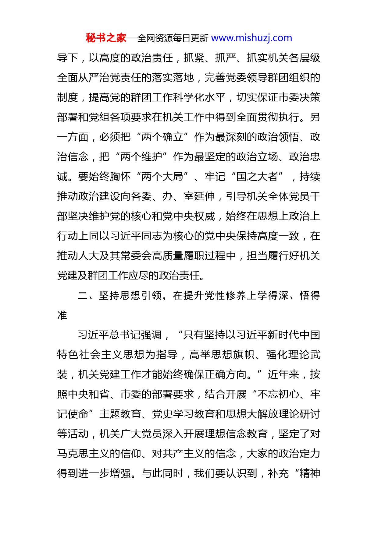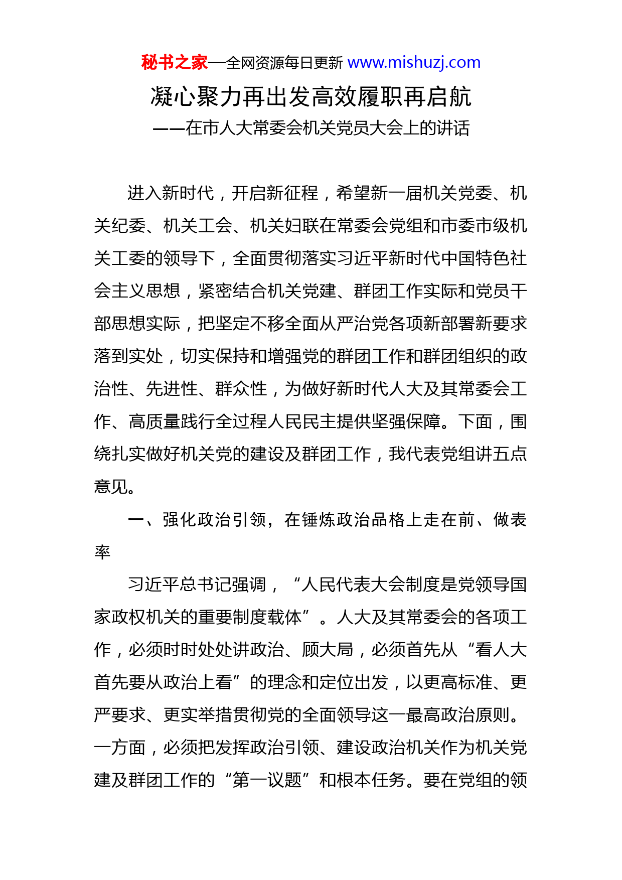 秘书之家—全网资源每日更新www.mishuzj.com凝心聚力再出发高效履职再启航——在市人大常委会机关党员大会上的讲话进入新时代,开启新征程,希望新一届机关党委、机关纪委、机关工会、机关妇联在常委会党组和市委市级机关工委的领导下,全面贯彻落实习近平新时代中国特色社会主义思想,紧密结合机关党建、群团工作实际和党员干部思想实际,把坚定不移全面从严治党各项新部署新要求落到实处,切实保持和增强党的群团工作和群团组织的政治性、先进性、群众性,为做好新时代人大及其常委会工作、高质量践行全过程人民民主提供坚强保障。下面,围绕扎实做好机关党的建设及群团工作,我代表党组讲五点意见。一、强化政治引领,在锤炼政治品格上走在前、做表率习近平总书记强调,“人民代表大会制度是党领导国家政权机关的重要制度载体”。人大及其常委会的各项工作,必须时时处处讲政治、顾大局,必须首先从“看人大首先要从政治上看”的理念和定位出发,以更高标准、更严要求、更实举措贯彻党的全面领导这一最高政治原则。一方面,必须把发挥政治引领、建设政治机关作为机关党建及群团工作的“第一议题”和根本任务。要在党组的领秘书之家—全网资源每日更新www.mishuzj.com导下,以高度的政治责任,抓紧、抓严、抓实机关各层级全面从严治党责任的落实落地,完善党委领导群团组织的制度,提高党的群团工作科学化水平,切实保证市委决策部署和党组各项要求在机关工作中得到全面贯彻执行。另一方面,必须把“两个确立”作为最深刻的政治领悟、政治信念,把“两个维护”作为最坚定的政治立场、政治忠诚。要始终胸怀“两个大局”、牢记“国之大者”,持续推动政治建设向各委、办、室延伸,引导机关全体党员干部坚决维护党的核心和党中央权威,始终在思想上政治上行动上同以习近平同志为核心的党中央保持高度一致,在推动人大及其常委会高质量履职过程中,担当履行好机关党建及群团工作应尽的政治责任。二、坚持思想引领,在提升党性修养上学得深、悟得准习近平总书记强调,“只有坚持以习近平新时代中国特色社会主义思想为指导,高举思想旗帜、强化理论武装,机关党建工作才能始终确保正确方向。”近年来,按照中央和省、市委的部署要求,结合开展“不忘初心、牢记使命”主题教育、党史学习教育和思想大解放理论研讨等活动,机关广大党员深入开展理想信念教育,坚定了对马克思主义的信仰、对共产主义的信念,大家的政治定力得到进一步增强。与此同时,我们要认识到,补充“精神秘书之家—全网资源每日更新www.mishuzj.com之钙”需要坚持不懈、久久为功,否则思想的“软骨病”就容易趁虚而入。因此,必须坚持固本培元,持之以恒弘扬伟大建党精神,抓好理想信念教育。一是必须从习近平新时代中国特色社会主义思想中汲取力量。要始终把深入学习贯彻习近平总书记重要思想,作为党员教育管理的“第一课题”,不断健全各项常态化学习机制、完善机关目标考核评估,推动机关党员干部切实增强应对复杂环境的政治鉴别力、面对错误思潮的理论斗争力、推动重点工作的思想保障力,真正做到理论上清醒、思想上明白、政治上过硬。要紧紧围绕迎接、宣传、贯彻党的二十大这条主线,总结过去理论学习的经验,不断丰富创新理论学习的形式和载体,推动理论学习取得实实在在的成效。二是必须从我们党走过的光辉历程中汲取力量。党的百年奋斗历程和伟大成就是我们坚定理想信念的基础。我们党从小到大、由弱到强,领导革命、建设和改革走向一个又一个的伟大胜利。铸就光辉历史的背后,离不开以伟大建党精神为代表的红色精神谱系的支撑,这是我们开展理想信念教育的生动教材。要充分运用红色资源,结合机关党委“党性提升”专题培训,以及各支部“主题党日”活动,教育引导党员干部上好“沉浸式党课”,从党百年奋斗中感悟信仰的力量。三是必须从中华优秀传统文化中汲取力量。中华优秀传统文化中有不少关于修身养德的精辟论秘书之家—全网资源每日更新www.mishuzj.com述,对我们修身做人、干事创业具有积极的教育引导作用。要从这方面深度挖掘,为党员强化理论学习、坚定理想信念创造必要条件、提供良好环境。同时,也希望机关党员结合推动党史学习教育常态化长效化具体要求,进一步增强学习的自觉性和主动性,在加强学习研讨、坚定理想信念方面取得新的进步。三、聚焦中心大局,在服务人大履职上勇担当、善作为习近平总书记强调,“只有围绕中心、建设队伍、服务群众,推动党建与业务深度融合,机关党建工作才能找准定位。”当前,X正处在抢抓机遇、破局起势,推动现代化新X建设开好局、起好步的关键时期。机关各级党组织必须找准党建与业务深度融合的突破口,强化党建对中心工作的有力支撑,强化党员干部“服务大局、为民履职”的宗旨意识,更好凝聚履职合力、激发履职活力、释放履职潜力,在服务高质量发展中展现人大作为。一是必须服务大局促发展。要坚持全市中心大局在哪里,人大工作就跟进到哪里,机关作用就发挥到哪里,按照中央和省委、市委决策部署,围绕“践行全过程人民民主、助力‘好地方’高质量发展”主题,切实担负起宪法法律赋予的各项职责。要围绕市