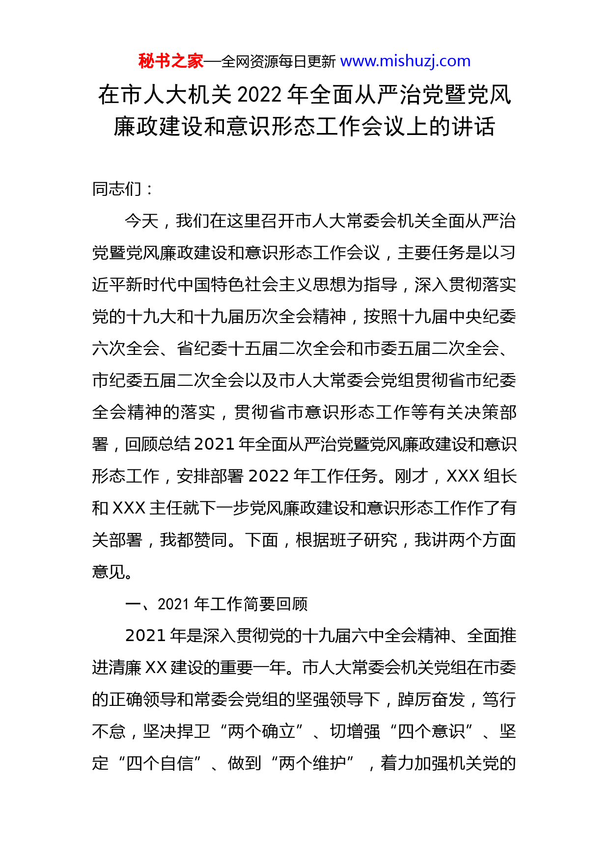 秘书之家—全网资源每日更新www.mishuzj.com在市人大机关2022年全面从严治党暨党风廉政建设和意识形态工作会议上的讲话同志们:今天,我们在这里召开市人大常委会机关全面从严治党暨党风廉政建设和意识形态工作会议,主要任务是以习近平新时代中国特色社会主义思想为指导,深入贯彻落实党的十九大和十九届历次全会精神,按照十九届中央纪委六次全会、省纪委十五届二次全会和市委五届二次全会、市纪委五届二次全会以及市人大常委会党组贯彻省市纪委全会精神的落实,贯彻省市意识形态工作等有关决策部署,回顾总结2021年全面从严治党暨党风廉政建设和意识形态工作,安排部署2022年工作任务。刚才,XXX组长和XXX主任就下一步党风廉政建设和意识形态工作作了有关部署,我都赞同。下面,根据班子研究,我讲两个方面意见。一、2021年工作简要回顾2021年是深入贯彻党的十九届六中全会精神、全面推进清廉XX建设的重要一年。市人大常委会机关党组在市委的正确领导和常委会党组的坚强领导下,踔厉奋发,笃行不怠,坚决捍卫“两个确立”、切增强“四个意识”、坚定“四个自信”、做到“两个维护”,着力加强机关党的秘书之家—全网资源每日更新www.mishuzj.com政治、思想、组织、制度、纪律和反腐倡廉建设,在砥砺“XX之干”中奋力推进全市高质量绿色发展履职尽责、担当作为。(一)始终把政治建设放在机关党建首位。一是做到坚定维护核心。深入组织学习习近平总书记最新讲话精神,学习贯彻《中共中央关于加强党的政治建设的意见》及省委若干措施,将落实“两个维护”作为最高的政治原则、最根本的政治要求,贯彻落实到人大机关工作全过程和各方面,落实到每名机关党员干部的岗位职责上。二是严格党内政治生活。认真组织学习《关于新形势下党内政治生活的若干准则》,严格执行民主集中制、双重组织生活制度等,着力提高党内政治生活质量,不断增强机关各级党组织的活力与战斗力。三是着力提高政治能力。要求领导干部自觉在政治合格、执行纪律合格、品德合格、发挥作用合格上当好表率,充分发挥“关键少数”的示范引领作用,引导全体机关党员干部切实提高贯彻中央和上级决策部署的政治能力。四是推动党史学习教育。始终围绕党史学习教育的根本任务,紧扣主题主线,严格落实“十六字”总要求,围绕“四句话”目标,坚持把学习教育、调查研究、检视问题、整改落实贯穿始终,保证学习教育深入开展并取得预期效果。(二)持之以恒改作风、正作风。一是大兴务实创新秘书之家—全网资源每日更新www.mishuzj.com之风。坚决做到市委和人大常委会党组要求到哪里、人大机关工作就跟进到哪里,全年完成常委会XX个“一府两院”工作报告审议、X部地方性法规审议、X项决议决定出台、XX个审议视察意见综合汇总等服务保障工作。协助完善常委会履职行权制度、制订专门委员会工作规则、修订代表议案处理办法等,出台《市人大机关整治形式主义减轻基层负担10条措施》。二是大兴调查研究之风。贯彻省委人大工作会议精神,就加强和规范街道人大工作、探索开发区(功能区)人大工作、提高地方立法质量等课题开展专题调研。聚焦生态提标、产业创新、交通先行、改革开路、开放合作、文化支撑、平安创建、民生改善、党建引领等9方面重点工作中的堵点难点,开展专项调研,提出针对性、可操作性较强的对策建议,在服务市委科学决策方面发挥了积极作用。三是大兴联系群众之风。深入开展“我为群众办实事”实践活动,充分发挥人大机关密切联系群众的优势,突出把握好“联系群众要更加紧密、作用发挥要更加显著”两个环节,邀请代表参与立法、视察调研、执法检查等活动,细化落实代表建议办理单位“一把手”责任制,推动代表建议办理、积极回应群众关切,把人大工作做到群众的心坎上。(三)不断锤炼人大干部队伍忠诚干净担当的良好品格。一是认真组织专项教育活动。加强法纪和警示教育,秘书之家—全网资源每日更新www.mishuzj.com组织党员集中学习十九届中纪委第五次全会精神,全省防范化解重大风险专题培训班精神,市纪委五届五次会议精神,宪法和《中国共产党纪律处分条例》,个人有关事项《两项法规》,违规违纪典型案件等,落实“三治三强比实干”作风建设、“警示教育月”等专项活动,持续推进机关内部控制建设,完善机关财务制度,规范会议、差旅、培训等工作,营造机关廉洁从政的良好氛围,让廉洁成为一种自觉行为。二是切实落实廉政责任。将党风廉政建设同机关日常工作同研究、同部署、同检查、同考核、同落实。召开2021年度机关全面从严治党暨党风廉政建设和意识形态工作会议,就市人大机关2021年全面从严治党、党风廉政建设和意识形态工作进行专题部署,签订2021年度党风廉政建设责任书,层层压实责任。将全面从严治党和党风廉政建设与本职工作紧密结合,把考核结果作为评先评优等工作考核的重要内容,作为衡量工作能力和工作实绩的重要依据,变软指标为硬指标。三是支持派驻纪检监察组工作。坚持派驻纪检监察组组长参加党组会议和列席秘书长办公会议制度。干部选拔任用都按要求及时征求纪检监察组的意见。支持纪检监察组对新提任或转岗任职干部开展廉政谈话,普遍开展干部