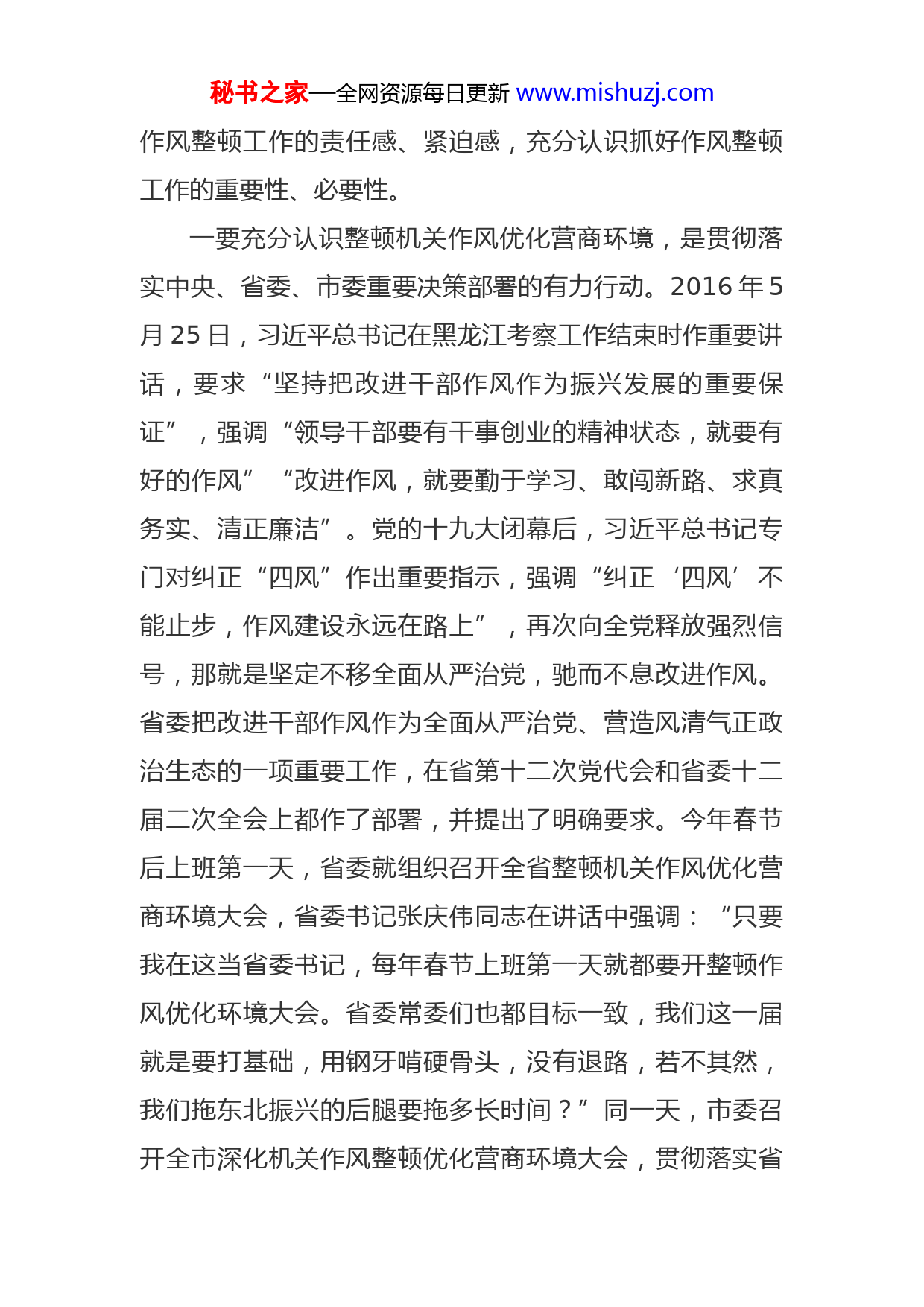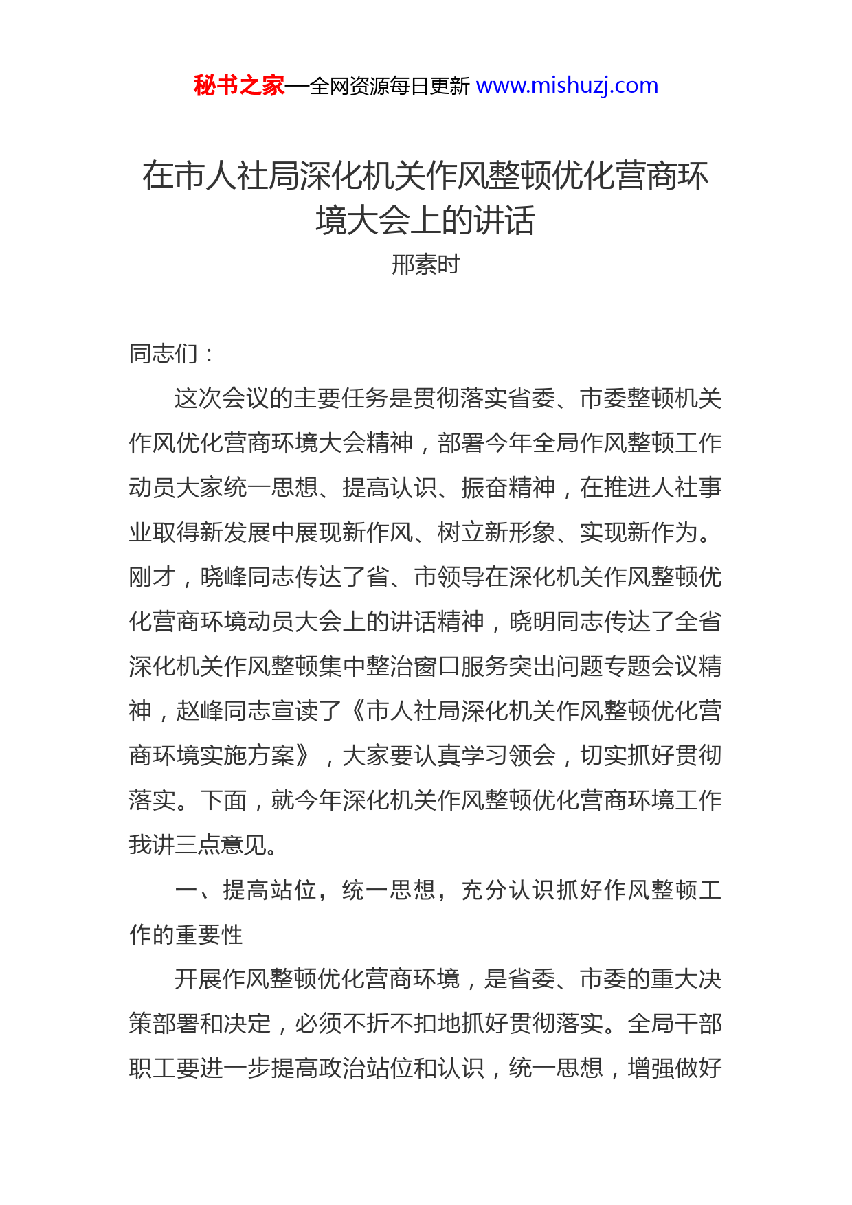 秘书之家—全网资源每日更新www.mishuzj.com在市人社局深化机关作风整顿优化营商环境大会上的讲话邢素时同志们:这次会议的主要任务是贯彻落实省委、市委整顿机关作风优化营商环境大会精神,部署今年全局作风整顿工作动员大家统一思想、提高认识、振奋精神,在推进人社事业取得新发展中展现新作风、树立新形象、实现新作为。刚才,晓峰同志传达了省、市领导在深化机关作风整顿优化营商环境动员大会上的讲话精神,晓明同志传达了全省深化机关作风整顿集中整治窗口服务突出问题专题会议精神,赵峰同志宣读了《市人社局深化机关作风整顿优化营商环境实施方案》,大家要认真学习领会,切实抓好贯彻落实。下面,就今年深化机关作风整顿优化营商环境工作我讲三点意见。一、提高站位,统一思想,充分认识抓好作风整顿工作的重要性开展作风整顿优化营商环境,是省委、市委的重大决策部署和决定,必须不折不扣地抓好贯彻落实。全局干部职工要进一步提高政治站位和认识,统一思想,增强做好秘书之家—全网资源每日更新www.mishuzj.com作风整顿工作的责任感、紧迫感,充分认识抓好作风整顿工作的重要性、必要性。一要充分认识整顿机关作风优化营商环境,是贯彻落实中央、省委、市委重要决策部署的有力行动。2016年5月25日,习近平总书记在黑龙江考察工作结束时作重要讲话,要求“坚持把改进干部作风作为振兴发展的重要保证”,强调“领导干部要有干事创业的精神状态,就要有好的作风”“改进作风,就要勤于学习、敢闯新路、求真务实、清正廉洁”。党的十九大闭幕后,习近平总书记专门对纠正“四风”作出重要指示,强调“纠正‘四风’不能止步,作风建设永远在路上”,再次向全党释放强烈信号,那就是坚定不移全面从严治党,驰而不息改进作风。省委把改进干部作风作为全面从严治党、营造风清气正政治生态的一项重要工作,在省第十二次党代会和省委十二届二次全会上都作了部署,并提出了明确要求。今年春节后上班第一天,省委就组织召开全省整顿机关作风优化营商环境大会,省委书记张庆伟同志在讲话中强调:“只要我在这当省委书记,每年春节上班第一天就都要开整顿作风优化环境大会。省委常委们也都目标一致,我们这一届就是要打基础,用钢牙啃硬骨头,没有退路,若不其然,我们拖东北振兴的后腿要拖多长时间?”同一天,市委召开全市深化机关作风整顿优化营商环境大会,贯彻落实省秘书之家—全网资源每日更新www.mishuzj.com作风整顿工作会议精神,市委书记孙珅同志对我市今年作风整顿工作进行了安排部署,提出了明确要求。3月28日,省委召开深化机关作风整顿集中整治窗口服务突出问题专题会议,省委副书记陈海波、副省长李海涛在讲话中,对窗口服务单位的作风整顿提出了明确要求。就我省我市情况看,作风整顿工作已经被提到了前所未有的高度。全局干部职工必须增强政治意识,必须从我做起、从自身做起与党中央、省委、市委的要求保持高度一致,以作风整顿为突破口,全面完成各项工作任务。二要充分认识整顿机关作风优化营商环境,是做好人社各项工作的根本保证。人社部门作为宏观经济调控的重要参与者、社会管理和市场监督的重要执行者、公共服务的重要提供者和社会公平正义的重要维护者,所有工作都与人和市场主体密切相关,每名工作人员都是环境,都肩负着服务群众、服务市场主体的义务,都承担着优化营商环境的责任。对群众来说,我们人社系统是一个代表党和政府为民谋福、保障民生的重要行业,也代表党和政府为民服务的形象。我们的工作直接和人民群众的幸福指数息息相关。如果我们的作风不实、风气不正,把党和组织赋予的权力用来谋取私利,出现了吃拿卡要、变相收费、刁难群众等不端行为,社会各界和群众的眼睛都盯着我们,都会在后面戳我们的脊梁骨,这样就会有损政府和人社部秘书之家—全网资源每日更新www.mishuzj.com门的公信力,我们在群众心中的公仆形象也将大打折扣。因此,在我们这样的民生服务部门,开展作风整顿优化营商环境非常有必要,只有作风务实、业务过硬,才是做好各项工作的根本保证。三要充分认识整顿机关作风优化营商环境,是建设高素质人社队伍的必然要求。十八大以来的五年,以习近平同志为核心的党中央积极践行以人民为中心的执政理念。党的十九大报告,通篇贯穿着以人民为中心的发展思想,报告200多次提到“人民”。习近平总书记强调:“人民群众是我们力量的源泉...要把人民拥护不拥护、赞成不赞成、高兴不高兴、答应不答应作为衡量一切工作的唯一标准”进入新时代,人社领域改革发展任务艰巨而繁重,实现人社事业高质量发展,践行以人民为中心的发展思想,迫切需要一支高素质专业化的干部队伍,更需要有过硬的作风作为保障。而与此相对应,人社干部队伍还存在着思想观念陈旧、改革创新意识不强、工作本领不过硬、法治思维和法治方式管理水平不高等作风问题。这些问题不解决,就难以承担时代赋予的责任,甚至影响营商环境。因此,全局干部职工进一步提高思想认识、强化责任担当、锤炼过硬作风,以整顿作风的新成效树立人社形象、优化营商环境、造福鹤城百姓。二、深查细剖,突出重点,找准作风方面存在的主要秘书之家—全网资源