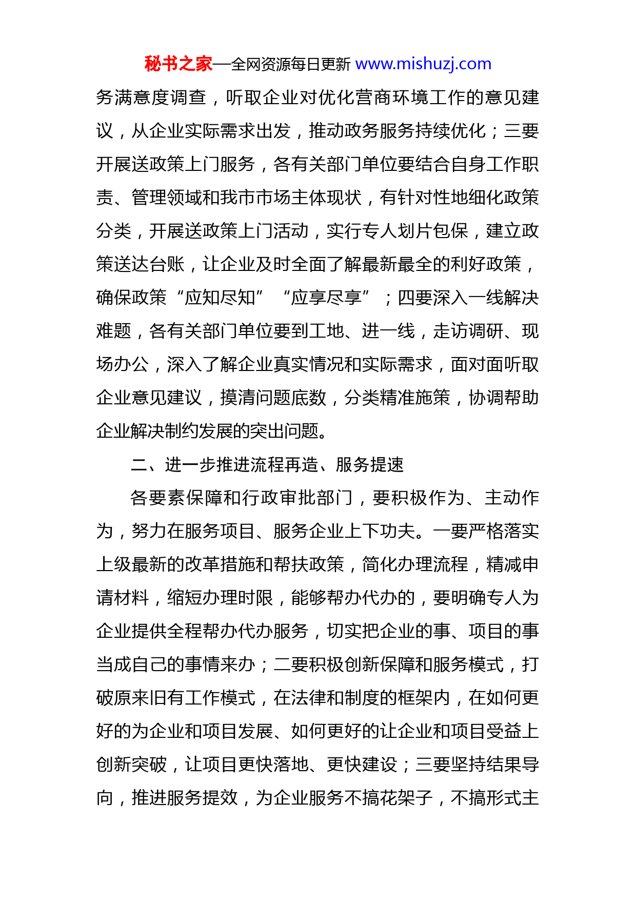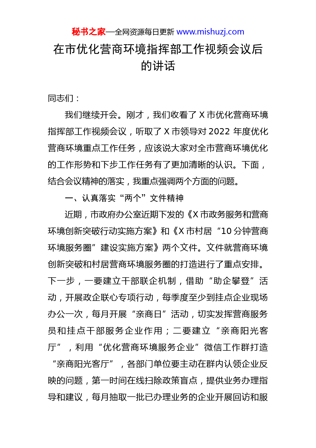 秘书之家—全网资源每日更新www.mishuzj.com在市优化营商环境指挥部工作视频会议后的讲话同志们:我们继续开会。刚才,我们收看了X市优化营商环境指挥部工作视频会议,听取了X市领导对2022年度优化营商环境重点工作任务,应该说大家对全市营商环境优化的工作形势和下步工作任务有了更加清晰的认识。下面,结合会议精神的落实,我重点强调两个方面的问题。一、认真落实“两个”文件精神近期,市政府办公室近期下发的《X市政务服务和营商环境创新突破行动实施方案》和《X市村居“10分钟营商环境服务圈”建设实施方案》两个文件。文件就营商环境创新突破和村居营商环境服务圈的打造进行了重点安排。下一步,一要建立干部联企机制,借助“助企攀登”活动,开展政企联心专项行动,每季度至少到挂点企业现场办公一次,每月开展“亲商日”活动,切实发挥营商服务员和挂点干部服务企业作用;二要建立“亲商阳光客厅”,利用“优化营商环境服务企业”微信工作群打造“亲商阳光客厅”,各部门单位要主动在群内认领企业反映的问题,第一时间在线扫除政策盲点,提供业务办理指导和建议,每月抽取一批已办理业务的企业开展回访和服秘书之家—全网资源每日更新www.mishuzj.com务满意度调查,听取企业对优化营商环境工作的意见建议,从企业实际需求出发,推动政务服务持续优化;三要开展送政策上门服务,各有关部门单位要结合自身工作职责、管理领域和我市市场主体现状,有针对性地细化政策分类,开展送政策上门活动,实行专人划片包保,建立政策送达台账,让企业及时全面了解最新最全的利好政策,确保政策“应知尽知”“应享尽享”;四要深入一线解决难题,各有关部门单位要到工地、进一线,走访调研、现场办公,深入了解企业真实情况和实际需求,面对面听取企业意见建议,摸清问题底数,分类精准施策,协调帮助企业解决制约发展的突出问题。二、进一步推进流程再造、服务提速各要素保障和行政审批部门,要积极作为、主动作为,努力在服务项目、服务企业上下功夫。一要严格落实上级最新的改革措施和帮扶政策,简化办理流程,精减申请材料,缩短办理时限,能够帮办代办的,要明确专人为企业提供全程帮办代办服务,切实把企业的事、项目的事当成自己的事情来办;二要积极创新保障和服务模式,打破原来旧有工作模式,在法律和制度的框架内,在如何更好的为企业和项目发展、如何更好的让企业和项目受益上创新突破,让项目更快落地、更快建设;三要坚持结果导向,推进服务提效,为企业服务不搞花架子,不搞形式主秘书之家—全网资源每日更新www.mishuzj.com义,要从企业实际需求出发,精准施策、用心服务,一切的努力是为“办成”“办好”,而不仅仅是“知道了”“了解了”。各镇街、各部门要牢牢把握“市场主体满意”和“营评提升”双导向,对标国内一流标准,积极主动改革创新,推动全市营商环境各指标、各领域工作实现追赶超越,以一流营商环境为制造强市提供有力支持。