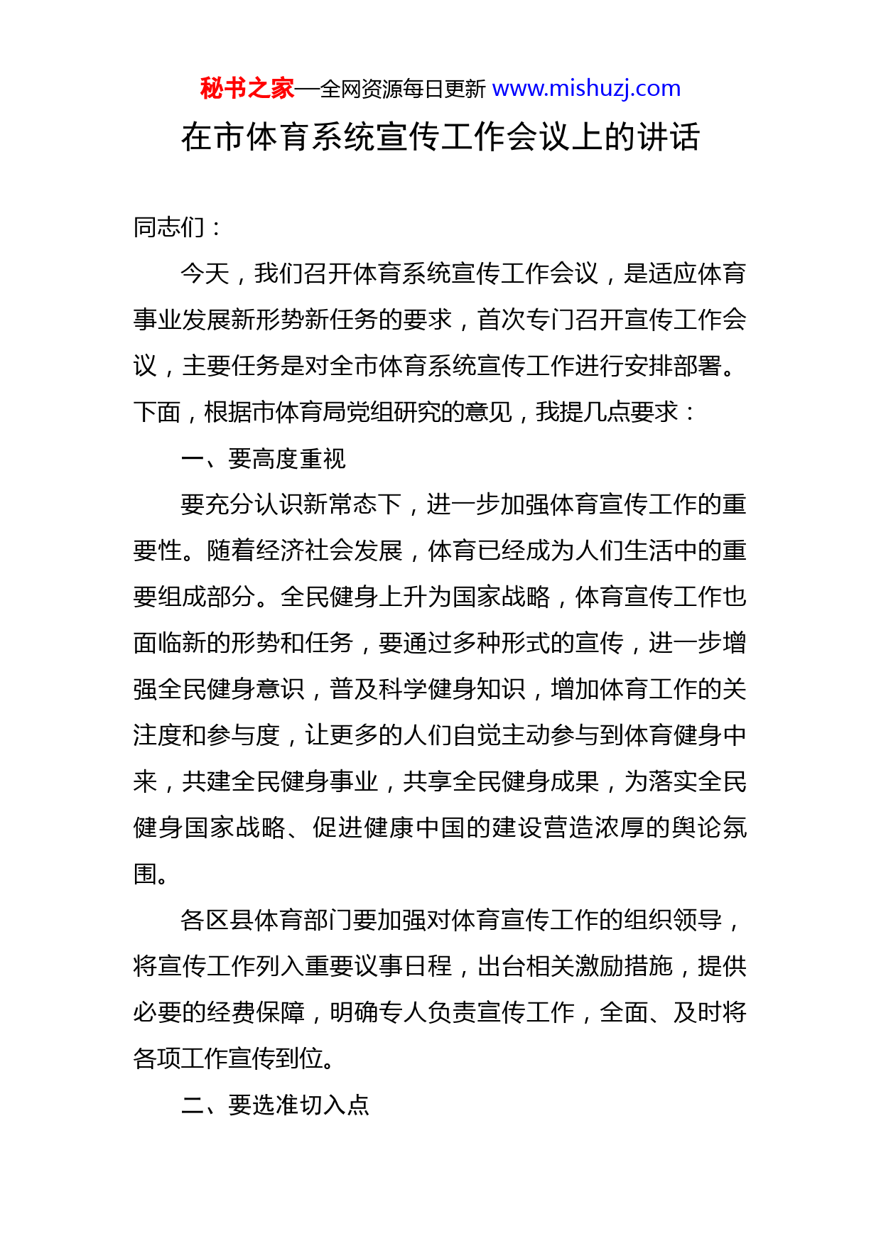 秘书之家—全网资源每日更新www.mishuzj.com在市体育系统宣传工作会议上的讲话同志们:今天,我们召开体育系统宣传工作会议,是适应体育事业发展新形势新任务的要求,首次专门召开宣传工作会议,主要任务是对全市体育系统宣传工作进行安排部署。下面,根据市体育局党组研究的意见,我提几点要求:一、要高度重视要充分认识新常态下,进一步加强体育宣传工作的重要性。随着经济社会发展,体育已经成为人们生活中的重要组成部分。全民健身上升为国家战略,体育宣传工作也面临新的形势和任务,要通过多种形式的宣传,进一步增强全民健身意识,普及科学健身知识,增加体育工作的关注度和参与度,让更多的人们自觉主动参与到体育健身中来,共建全民健身事业,共享全民健身成果,为落实全民健身国家战略、促进健康中国的建设营造浓厚的舆论氛围。各区县体育部门要加强对体育宣传工作的组织领导,将宣传工作列入重要议事日程,出台相关激励措施,提供必要的经费保障,明确专人负责宣传工作,全面、及时将各项工作宣传到位。二、要选准切入点秘书之家—全网资源每日更新www.mishuzj.com宣传工作一定要切实围绕全市、全县(区)的中心工作,围绕全年体育工作的目标任务,牢牢把握宣传工作的重点和方向,从社会关注的体育热点和广大群众的体育需求方面,找准体育宣传工作的切入点,有的放矢,提高宣传效果。要注重对基层基础工作的宣传,加强对身边的典型健身事例、优秀健身达人、先进体育人物、基层活动站点、基层社会体育指导员以及一线运动员、教练员、裁判员和体育工作者的宣传,用群众身边的事迹感染人、鼓舞人、激励人,让体育工作更加深入人心。三、要解决短板近年来,在大家的共同努力下,体育系统宣传工作取得了明显成效,宣传机制不断完善,宣传渠道不但拓展,宣传效果越来越好。但仍然存在一些问题:宣传工作计划性不强、宣传平台相对单一、宣传层次不高、宣传工作时紧时松、精品和亮点还不多、全员参与宣传工作的局面还没有真正形成等。这些问题,是我们工作中的短板和薄弱环节,要认真分析问题原因,有针对性地制定切实可行的改进措施,认认真真进行整改,不断突破体育宣传的短板,使宣传工作科学化、系统化、规范化,上下联动,形成整体效应。四、要提高素质秘书之家—全网资源每日更新www.mishuzj.com宣传工作是一项专业性很强的工作,体育系统干部职工特别是各位通讯员,要将素质建设作为做好宣传工作的基础性工程,积极主动加强对宣传工作业务知识的学习,平时要多读书、多看报、多思考,多学习别人的经验,认真钻研各类宣传新闻稿件的写作技巧,加强相互学习交流,不断提升自身素质和能力,为开展宣传工作奠定坚实的基础。要在学习和实践中,积极培养宣传工作的主动意识、责任意识、敏锐意识、时效意识和纪律意识。区县体育部门、机关各科室单位都要主动将宣传工作和业务工作放在同等重要的位置,发挥好通讯员的示范带动作用,强化责任担当,扎扎实实抓好工作落实。要做工作中的有心人,增强工作的敏锐性,善于捕捉各类宣传点。要重视宣传时效性,要第一时间对各项工作进行及时的宣传,失去了时效性,宣传效果就会大打折扣。要严格遵守宣传工作的纪律,无论是通讯员还是其他同志拟写的宣传稿件,都要坚持实事求是,涉及到相关数据和示例要认真核实,完善稿件审核制度,避免出现失误或者负面消息。抓宣传是提高文字写作能力、提高归纳总结能力和分析问题能力、提高自身综合素质的有效途径。抓好宣传,不仅是各位通讯员的本职工作,也是全体人员的共同职责。要发挥好每个人的积极性,集中全体人员的智慧,形秘书之家—全网资源每日更新www.mishuzj.com成宣传工作的强大合力。五、要持续发力宣传工作是一项贯穿全年的重点工作,我亲自担任宣传工作小组的组长,体现了党组对宣传工作的高度重视,也表明了宣传工作是一项常抓不懈的工作,必须深入持久地抓紧抓细抓实,形成常态。各区县体育部门、机关各科室单位要将宣传工作和业务工作一同部署、一同落实、一同检查,要做到宣传工作长计划、短安排,始终将体育宣传工作抓在手上,杜绝工作的随意性,避免出现时紧时松、可有可无的现象。要加强宣传工作创新,充分利用传统媒体和新兴媒体的各自优势,积极开发新的宣传平台,建立全媒体宣传的工作机制。要在宣传稿件常年不断线的基础上,力争出一批高质量的精品稿件,掀起体育宣传工作的新高潮。六、要落实制度宣传工作小组的日常事务性工作主要由群体科、办公室具体负责,科室之间要按照工作职责分工,加强协调配合,发挥好桥梁纽带作用,认真组织落实好宣传工作制度,定期组织召开宣传工作例会,定期研究提出阶段性工作计划,定期对全系统宣传工作进行信息通报,畅通宣传工作的信息报送和沟通交流渠道,统筹各项宣传工作的协调推进。各区县体育部门、各科室单位要按照相关制度和秘书之家—全网资源每日更新www.mishuzj.com职责要求,认真落实好任务分工,形成体育宣传工作齐抓共管的良好局面。